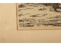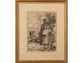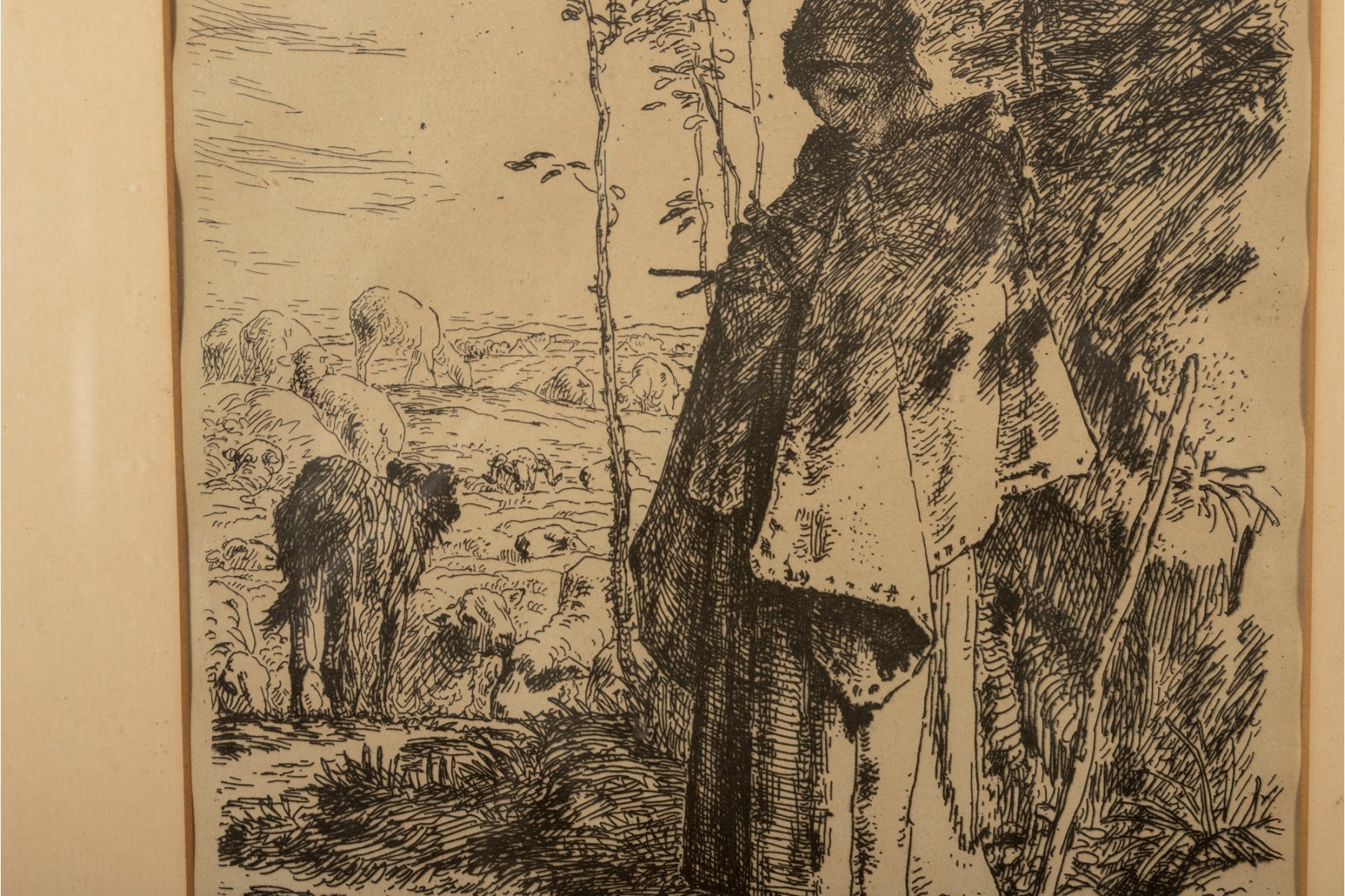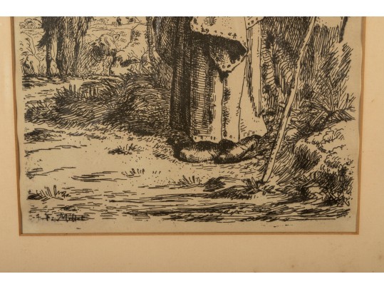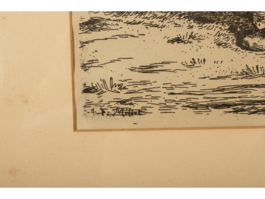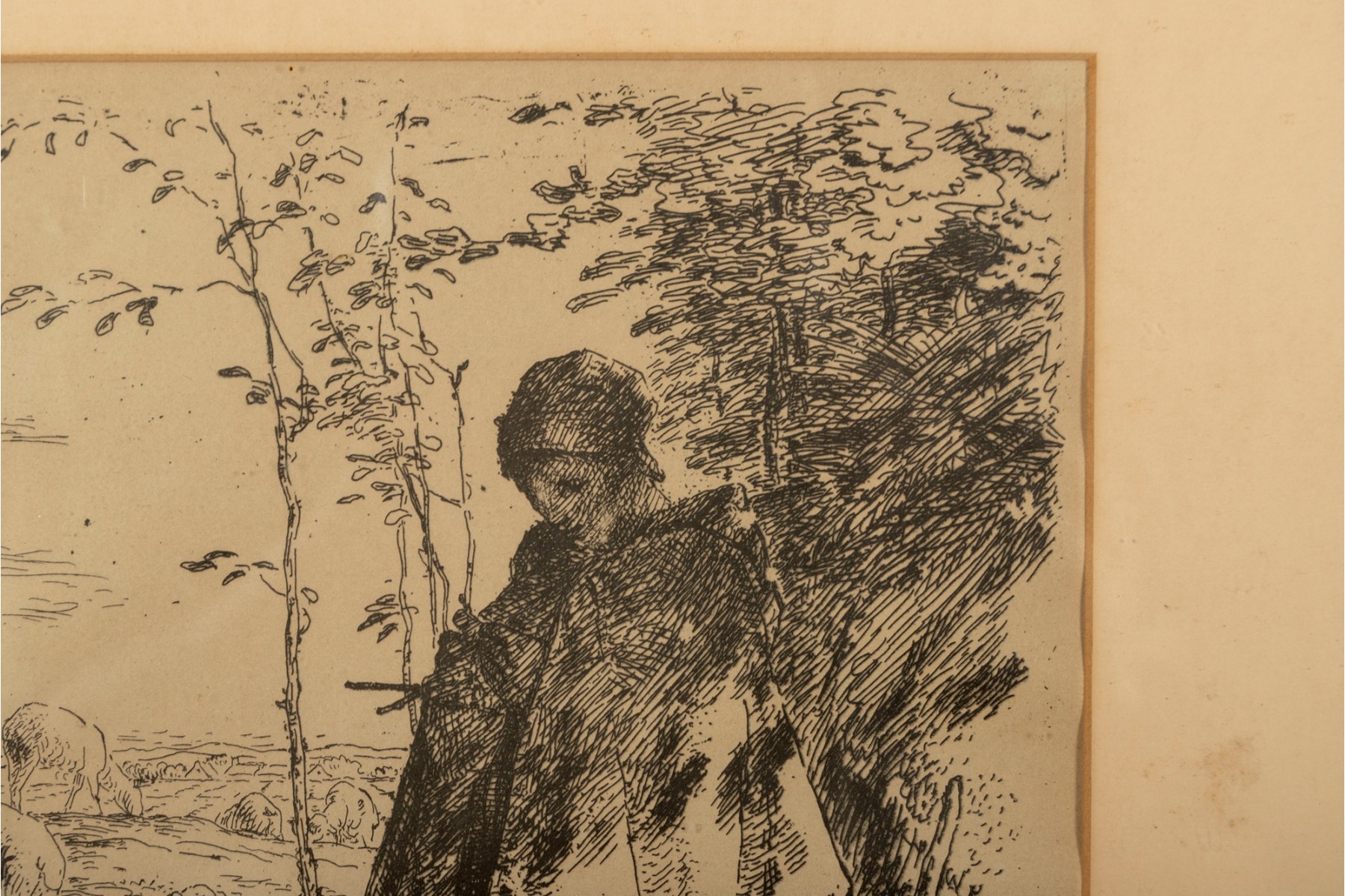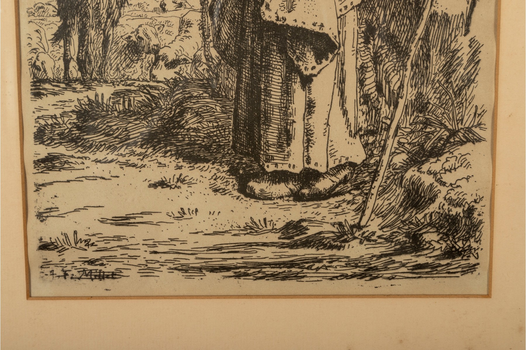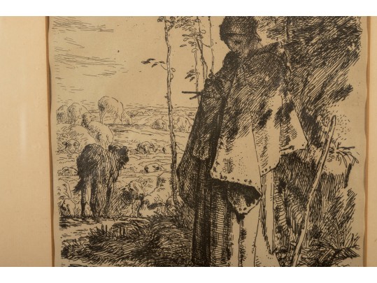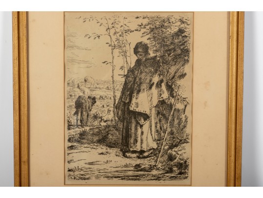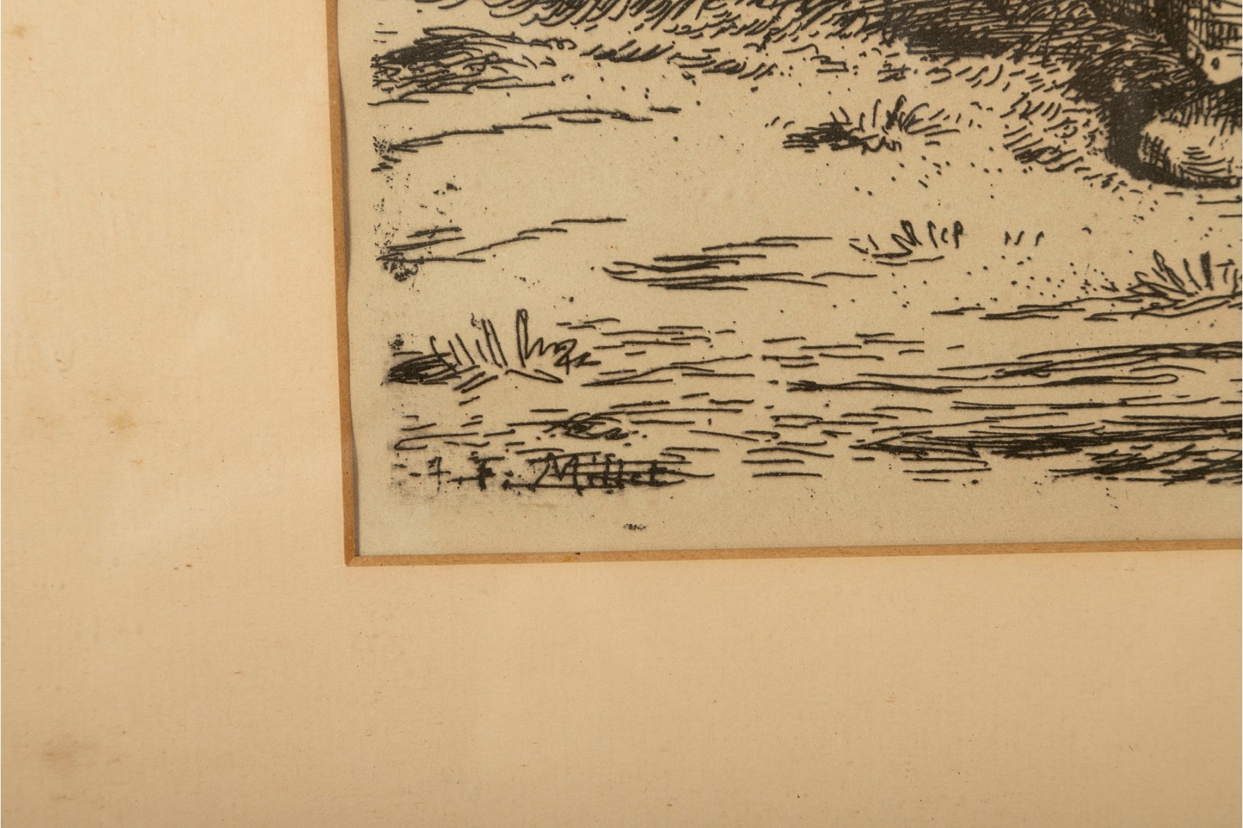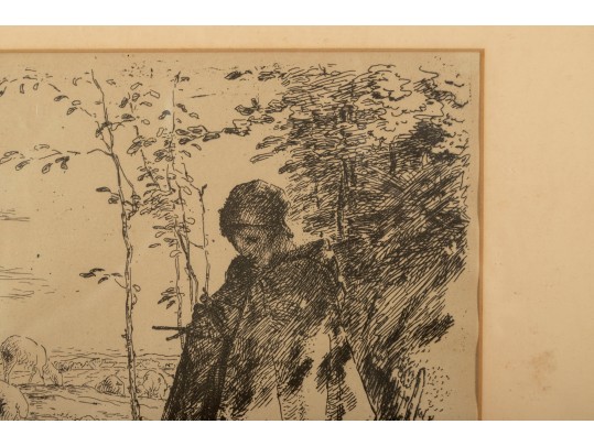 Jean-François Millet (French, 1814-1875) "Shepherdess Knitting" etching depicting a woman under the shade of a nearby rock knitting while a herd grazes in the background. Plate signature lower left. Displayed glazed and matted in a simple gilt frame.
