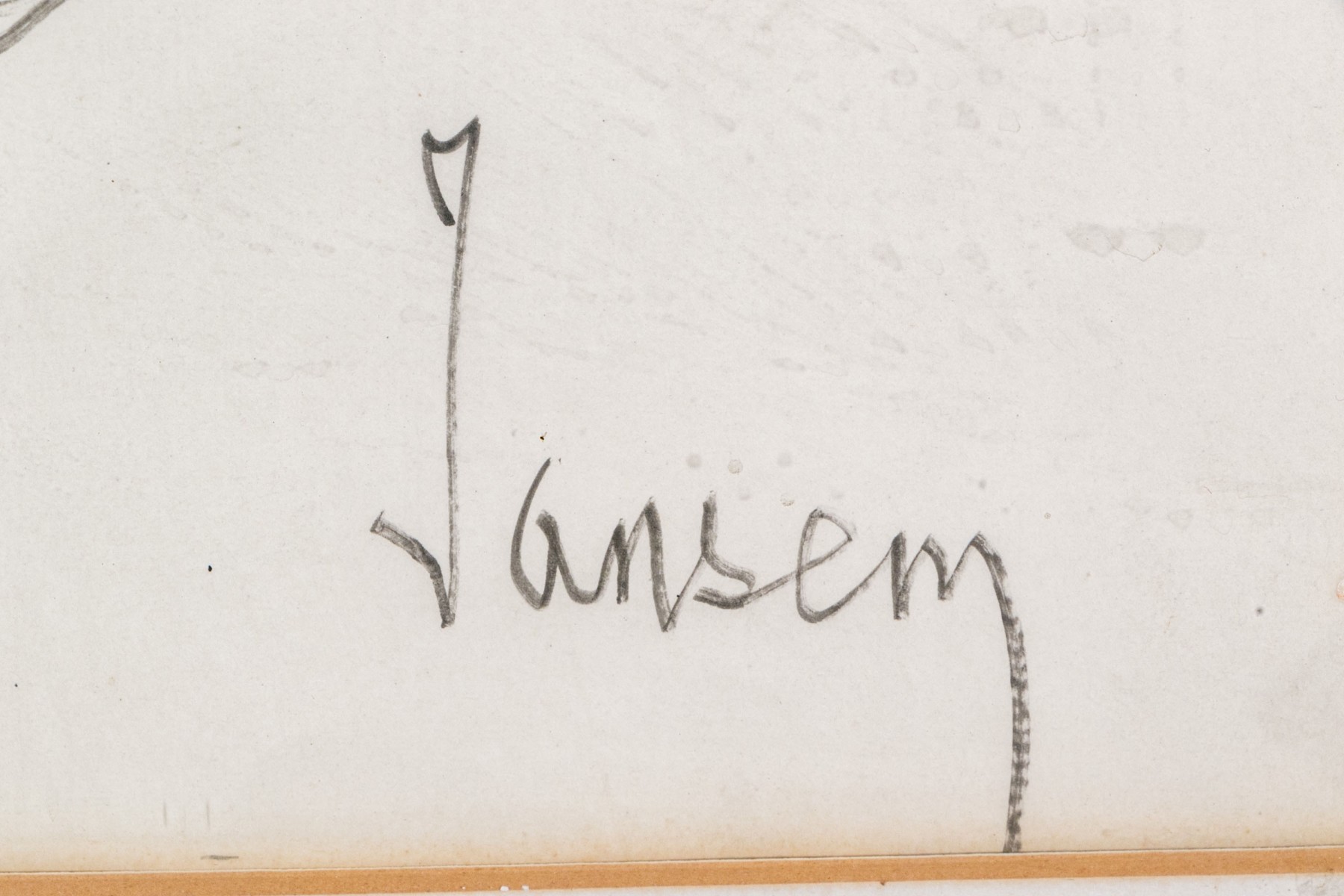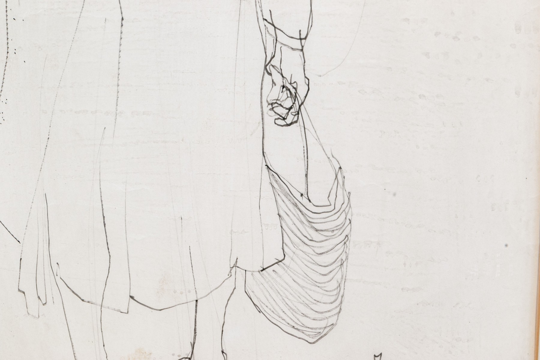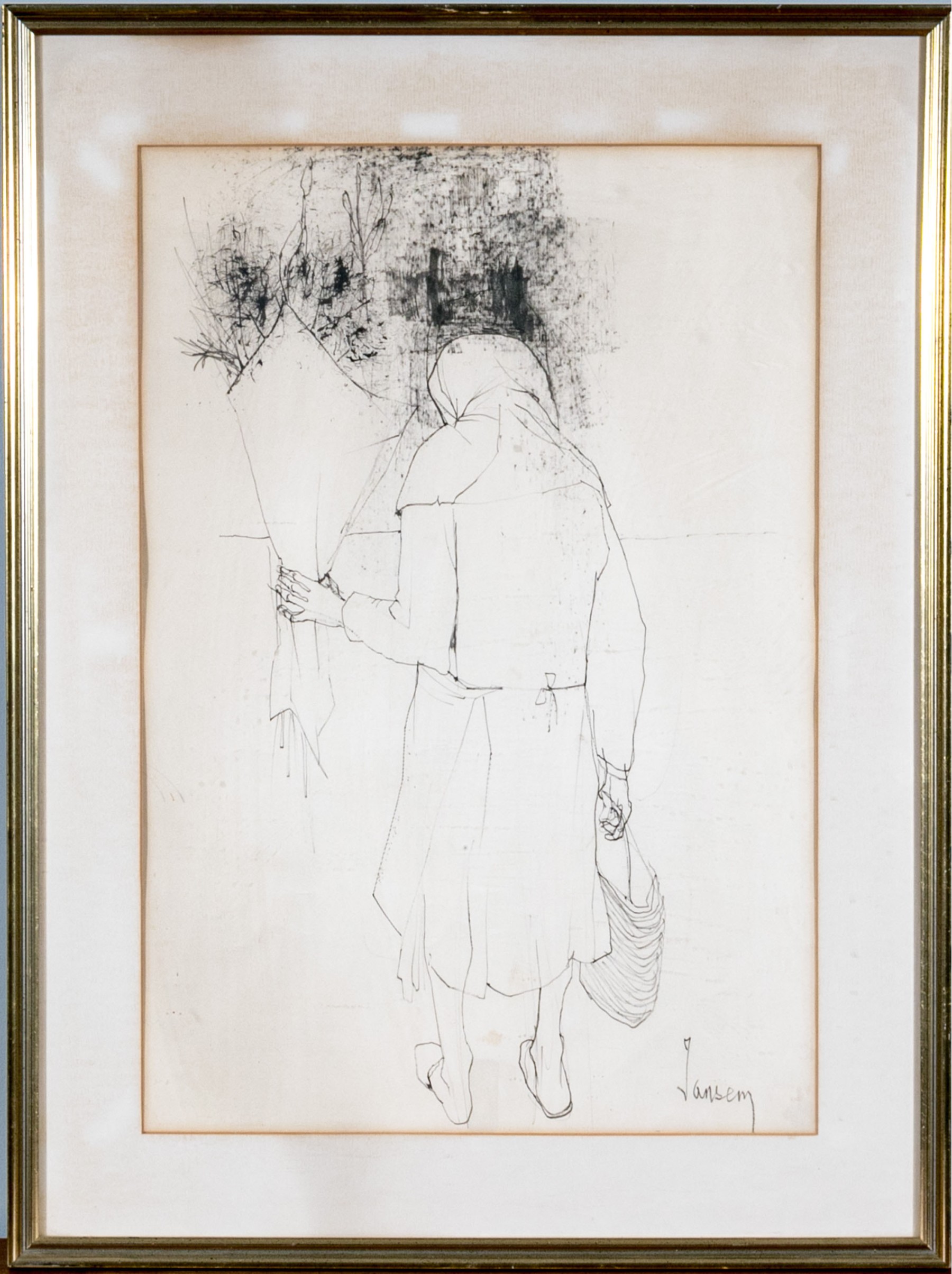 Jean Jansem (French, 1920-2013) ink on paper depicting a woman facing away from the viewer while holding a bouquet and basket. Beautifully rendered with wonderful linework and textural interest around the bouquet and figure's head. Signed lower right.
