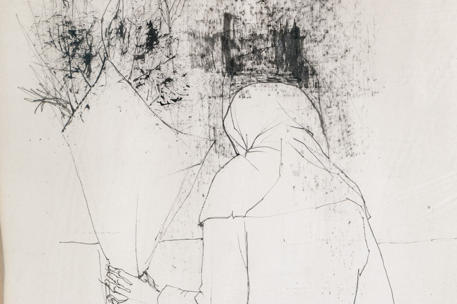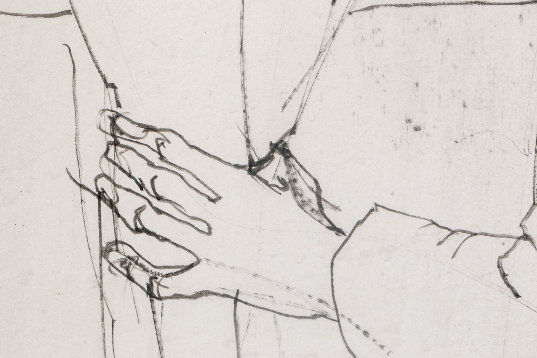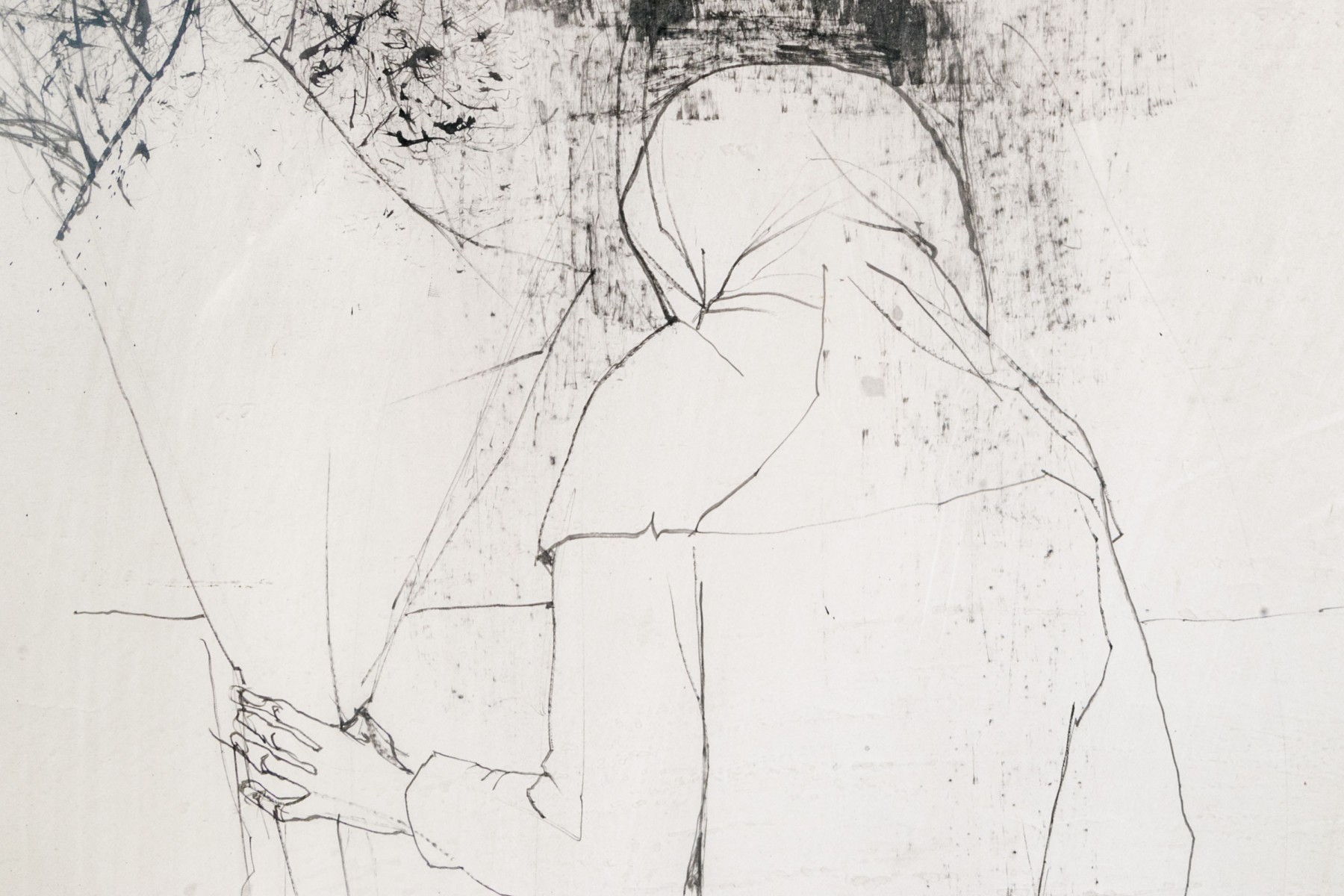 Jean Jansem (French, 1920-2013) ink on paper depicting a woman facing away from the viewer while holding a bouquet and basket. Beautifully rendered with wonderful linework and textural interest around the bouquet and figure's head. Signed lower right.