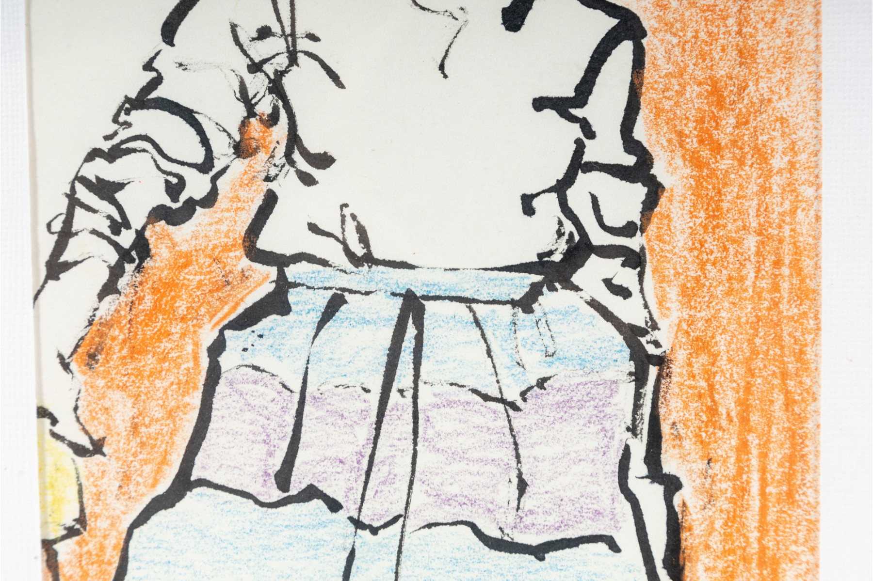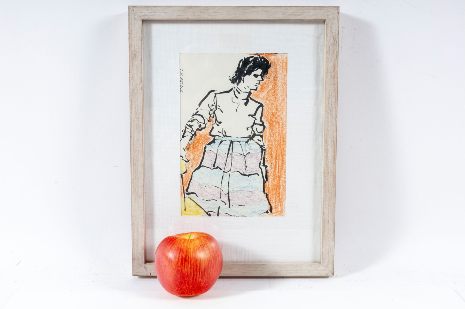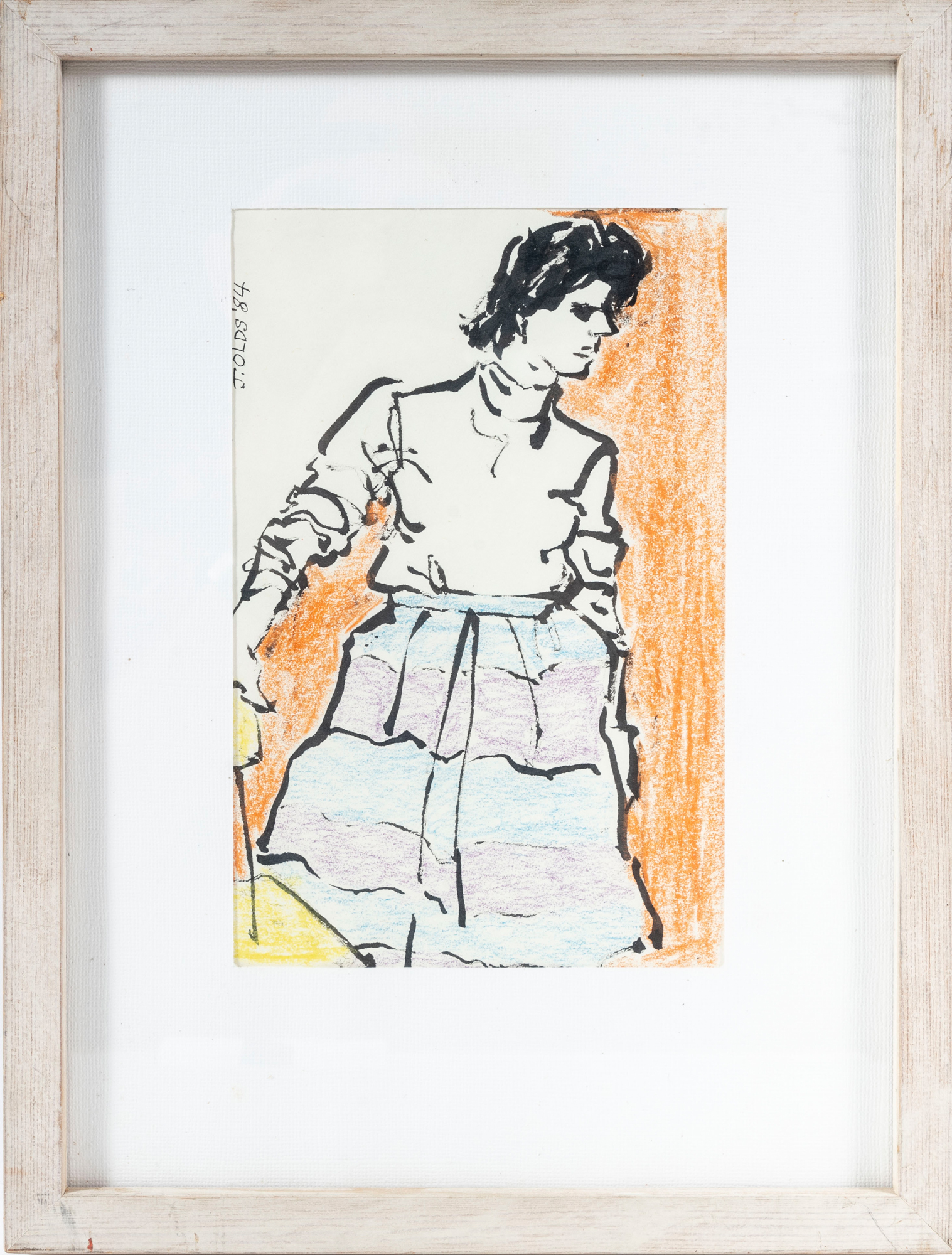 Painted in 1984 by Jean Olds Keating (American, B. 1917), this artwork aptly titled, "The Multicolored Skirt" displays a figural scene of a woman sporting a striped shirt rubbed in colors of blue in purple. The artworks is presented in a light wood frame faced with glass and accented with a white mat-border. This piece was procured from her estate.