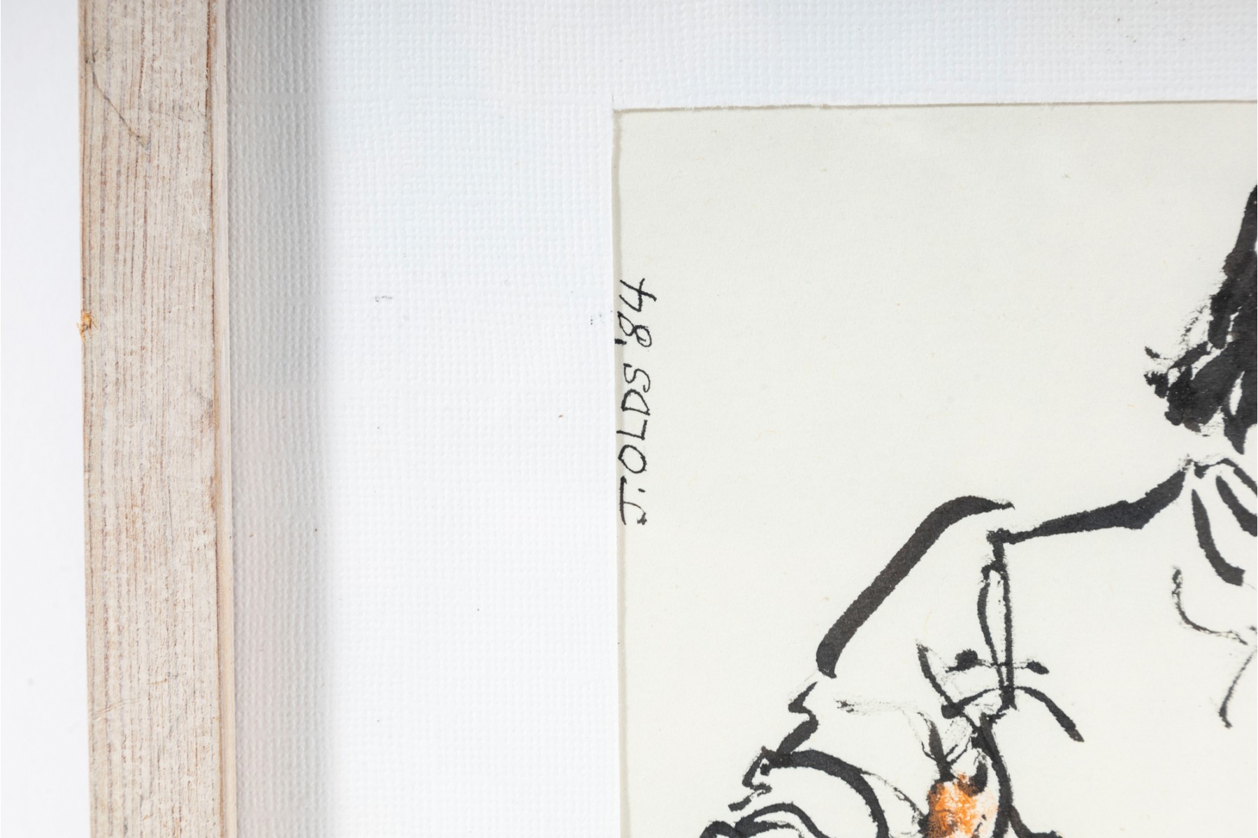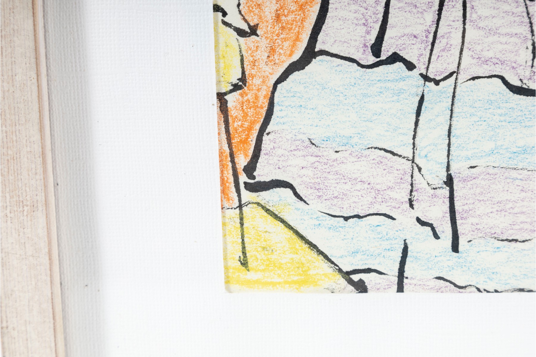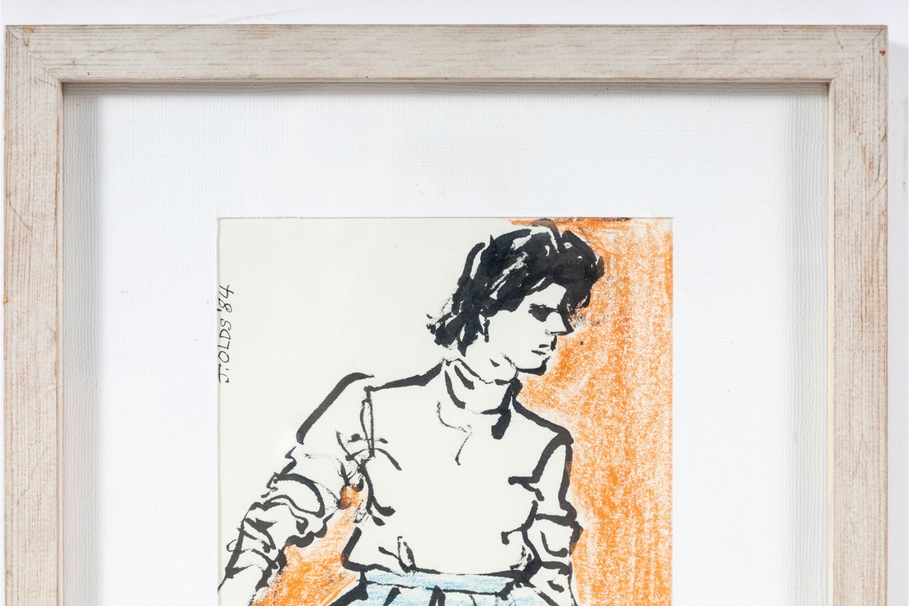 Painted in 1984 by Jean Olds Keating (American, B. 1917), this artwork aptly titled, "The Multicolored Skirt" displays a figural scene of a woman sporting a striped shirt rubbed in colors of blue in purple. The artworks is presented in a light wood frame faced with glass and accented with a white mat-border. This piece was procured from her estate.
