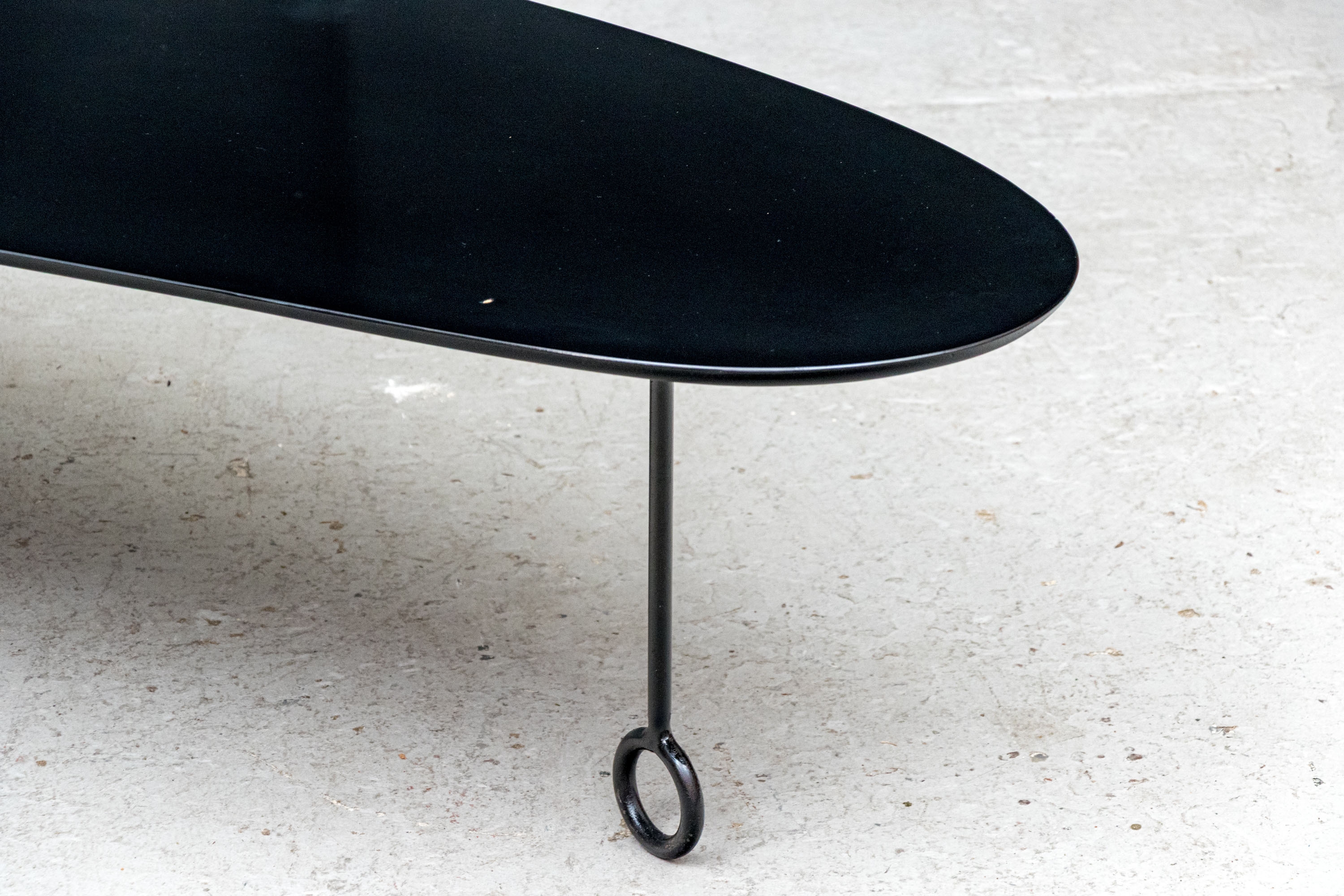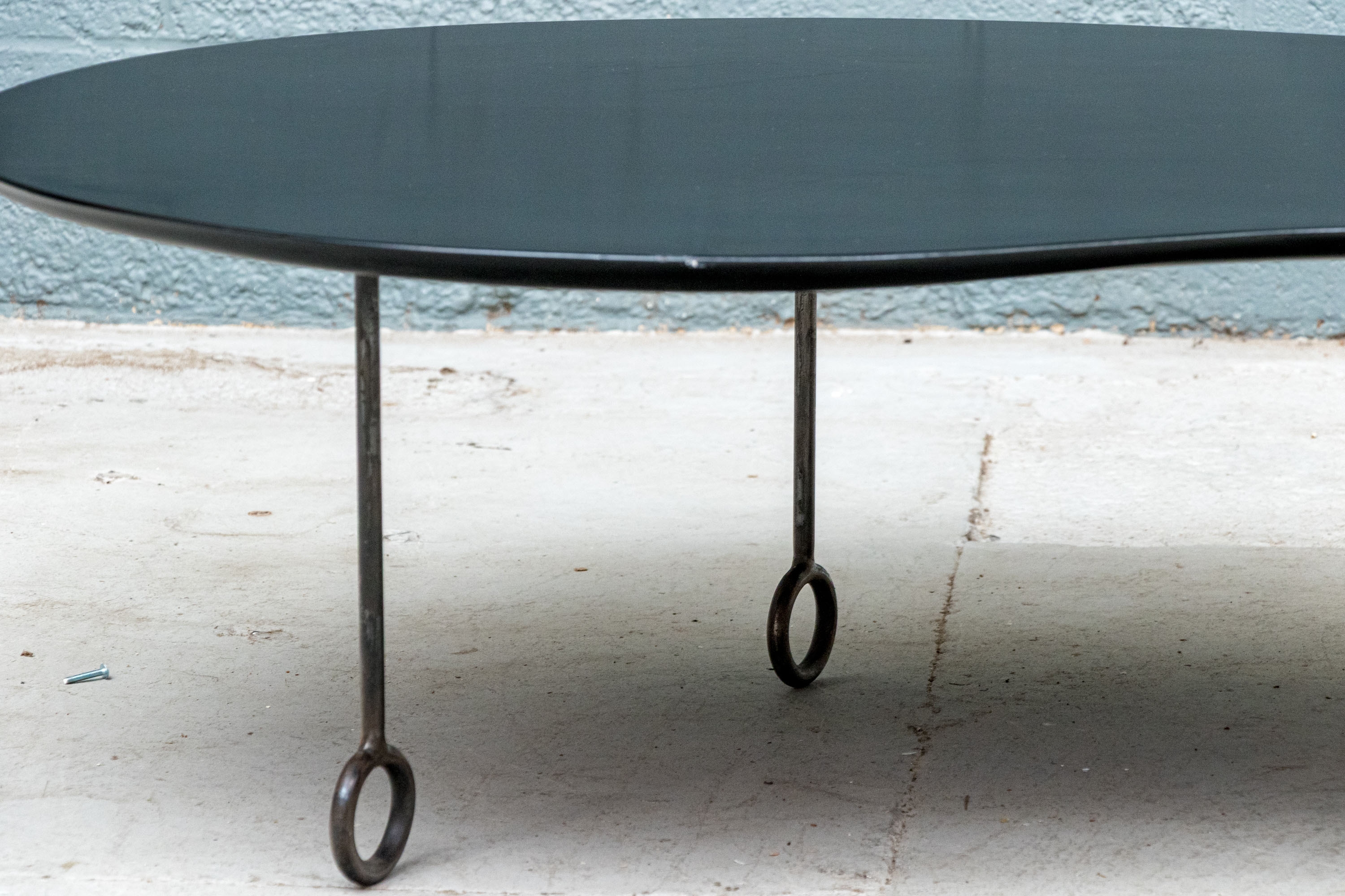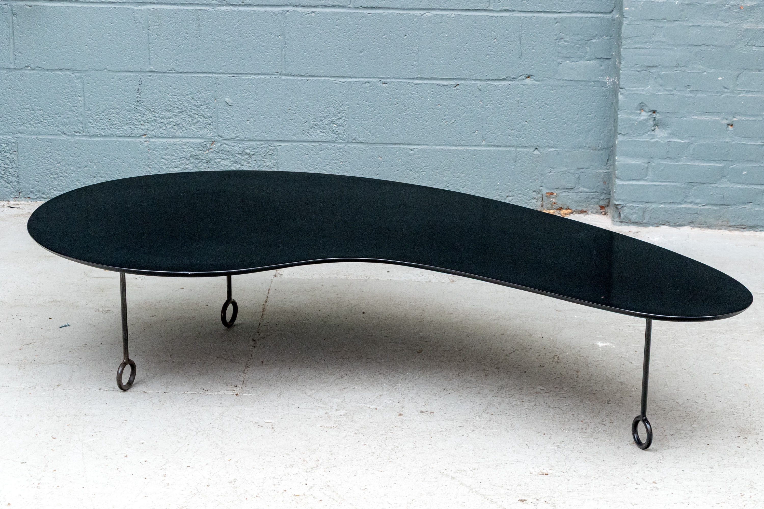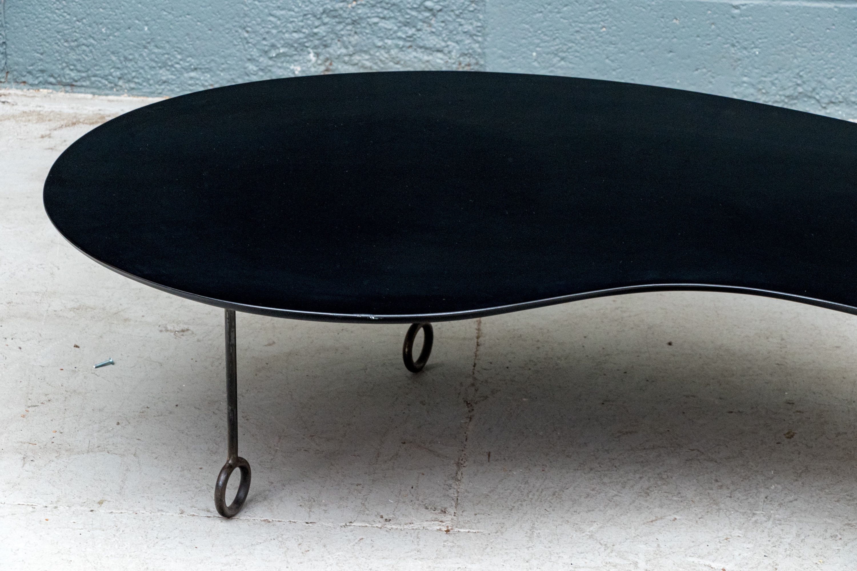 The finely crafted table is in the original design dating to ca. 1957. It is made in black laminated wood boomerang form and raised on three of the designer's classic Yo-Yo spindle black metal legs with open circle feet. This distinctive mid century Jean Royere table design is published in a 1999 catalog of the Musee Des Arts Decoratifs, Paris and elsewhere.