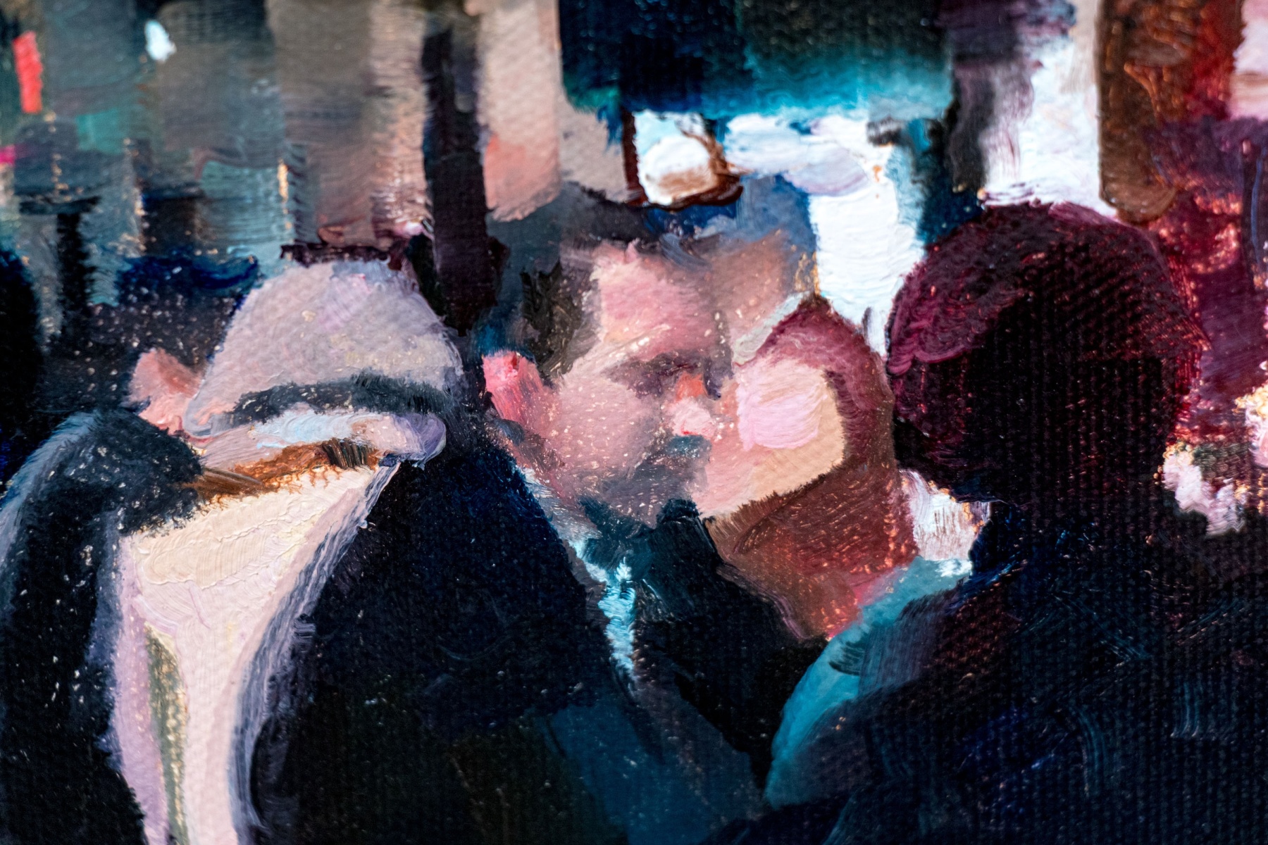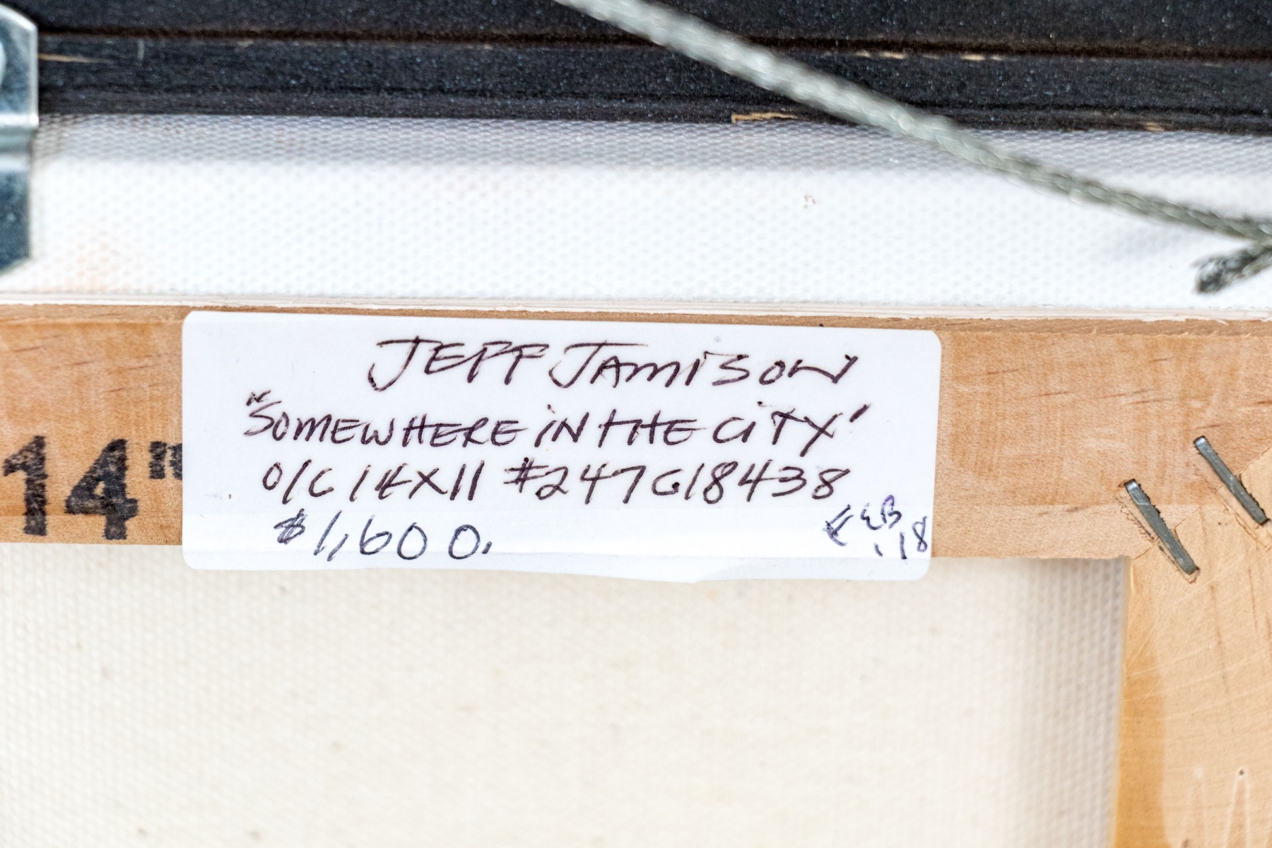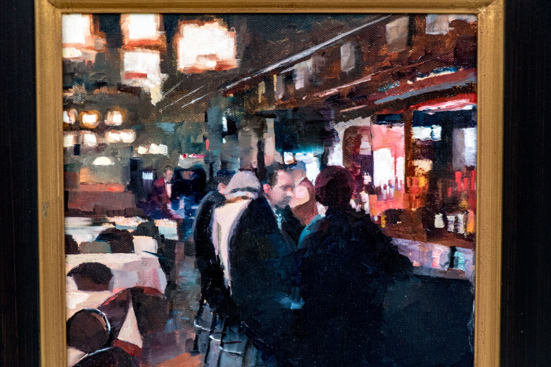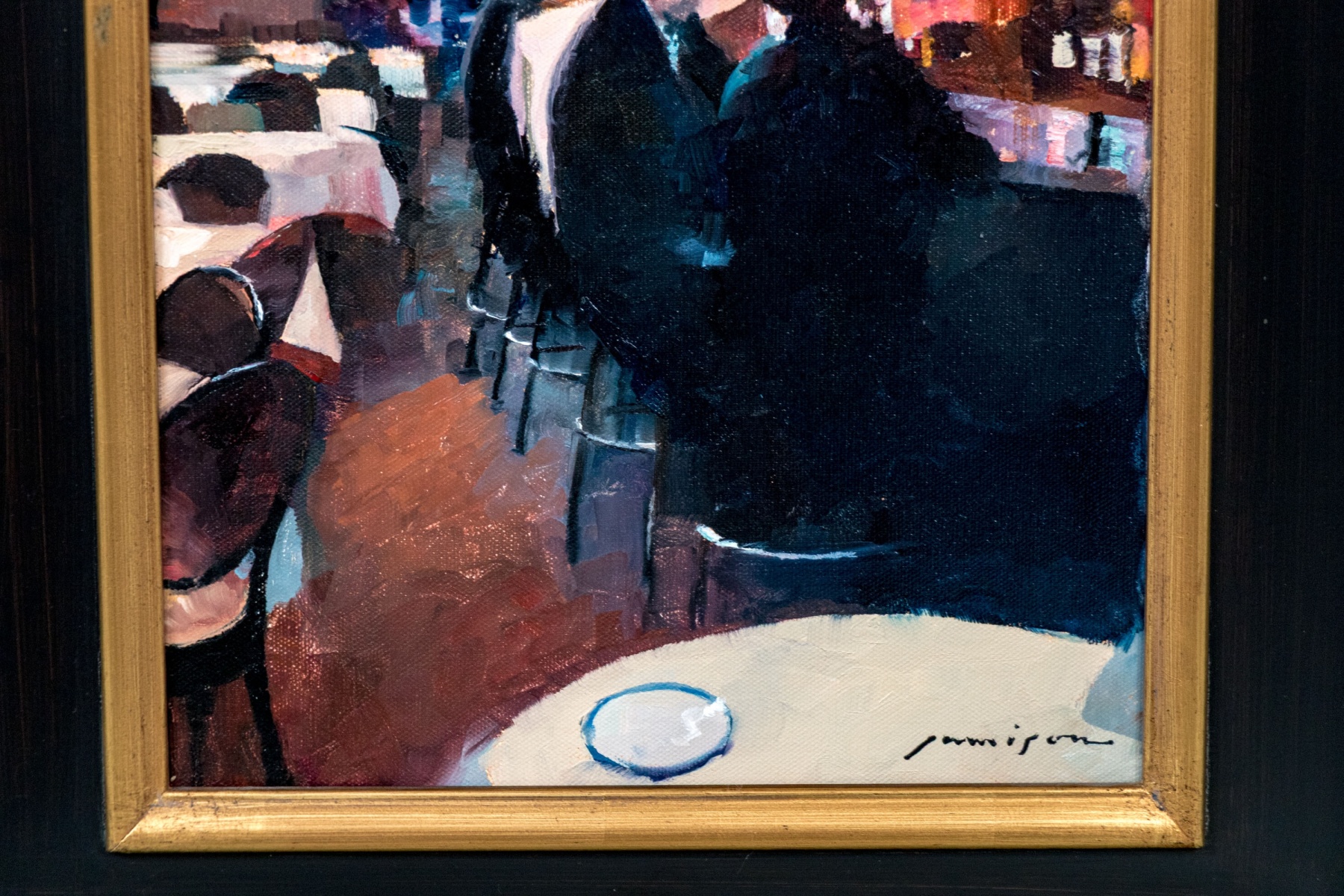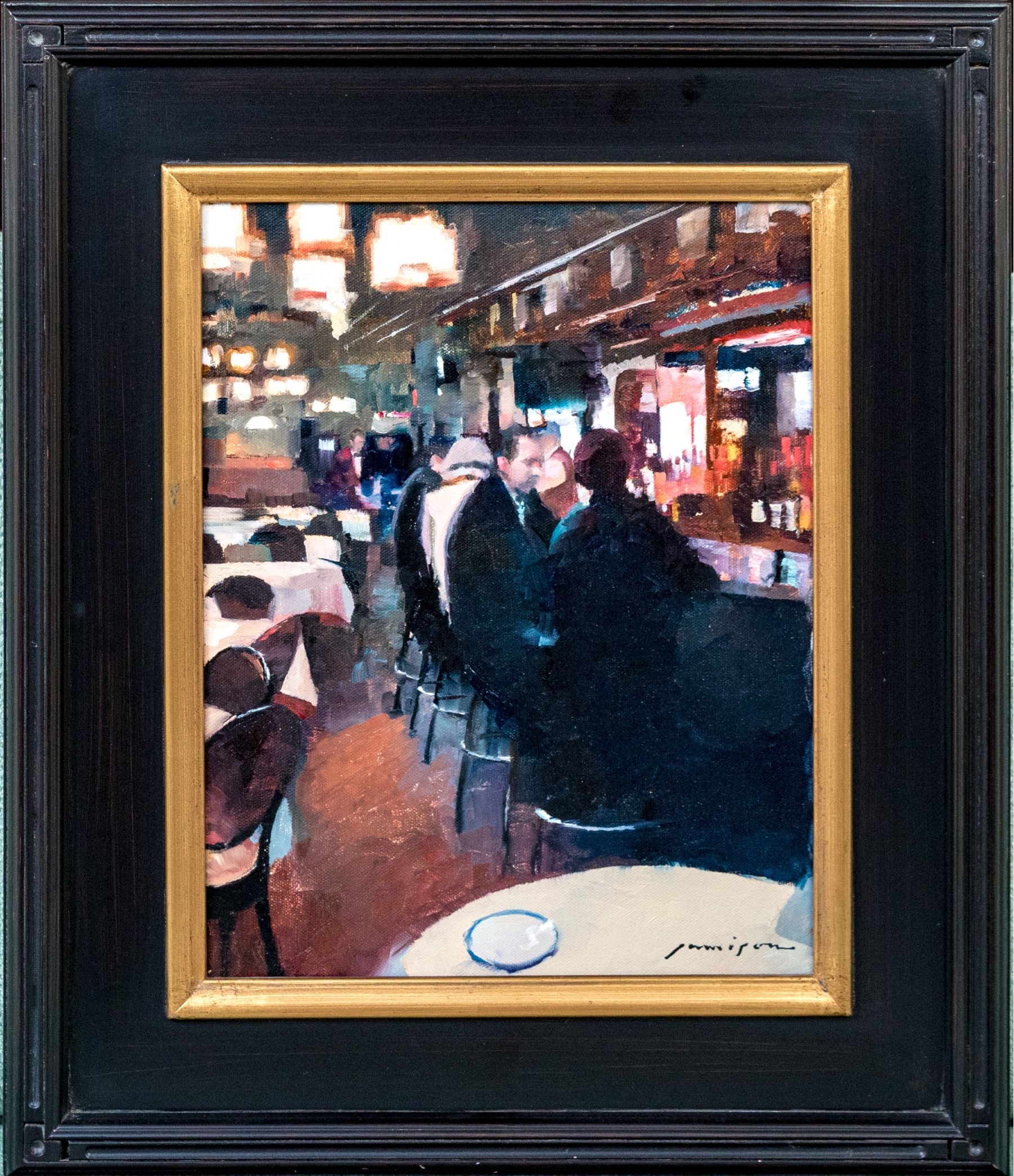 Jeff Jamison (American [SC], b. 1958) “Somewhere In The City” oil painting on canvas depicting an impressionist interior scene of figures seated at a bar counter in a fine restaurant beside circular tables with white tablecloths to the left beneath a dark ceiling dappled with lights. Signed and titled on verso and to lower right.