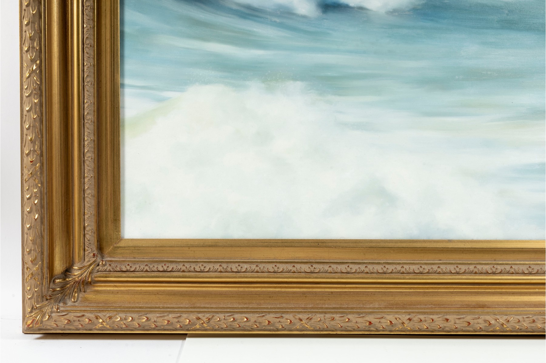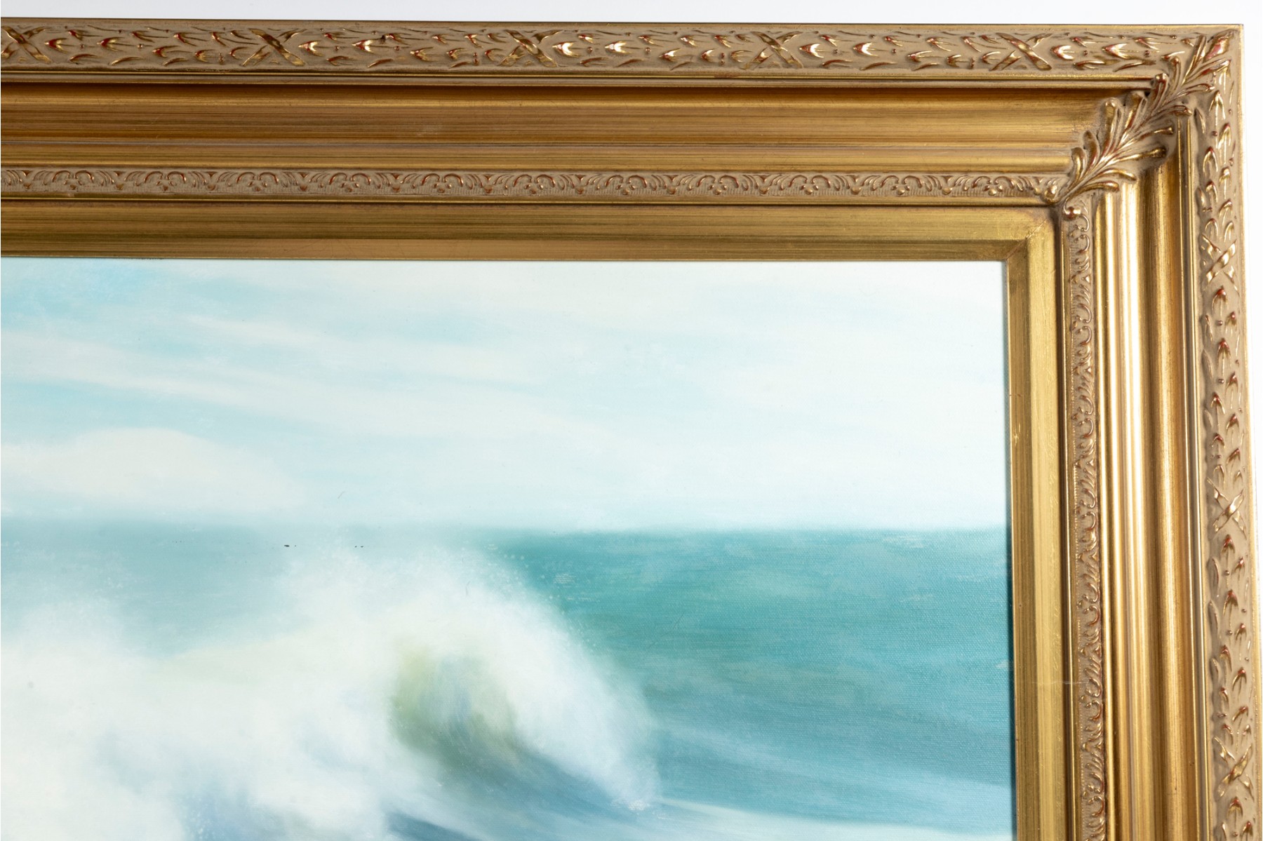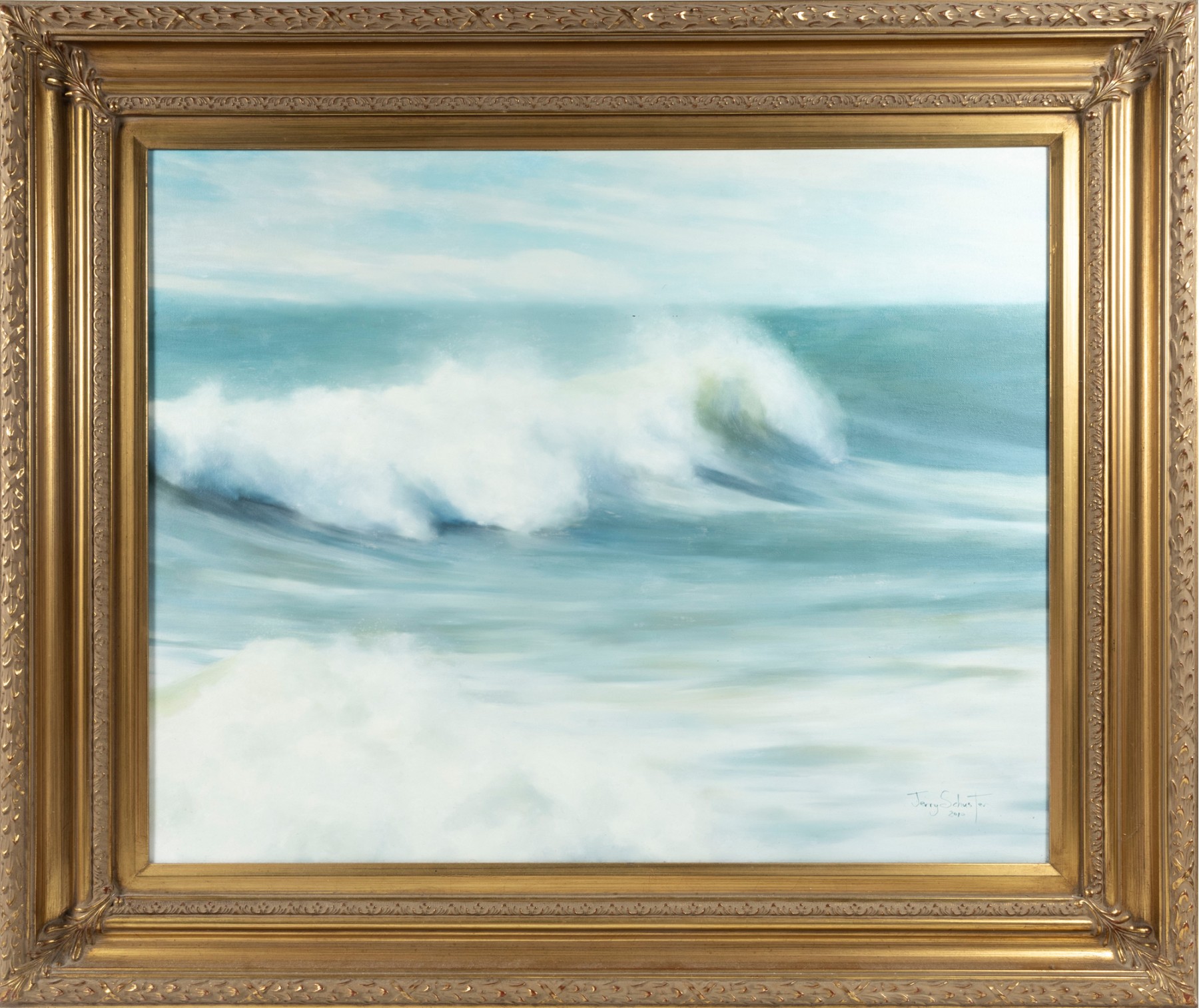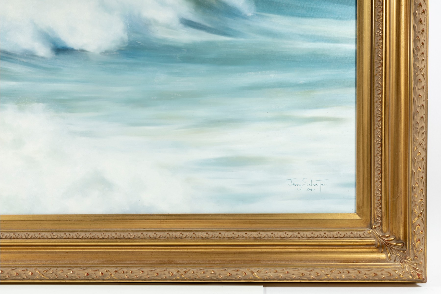 Jerry Schuster -- signed, untitled. Depicts a lovely, softly painted and blended oil landscape of a crashing tidal wave set below a bright blue sky. The artwork is presented openly within a grand, gold-tone frame with subtle carved trim. Dated 2010.