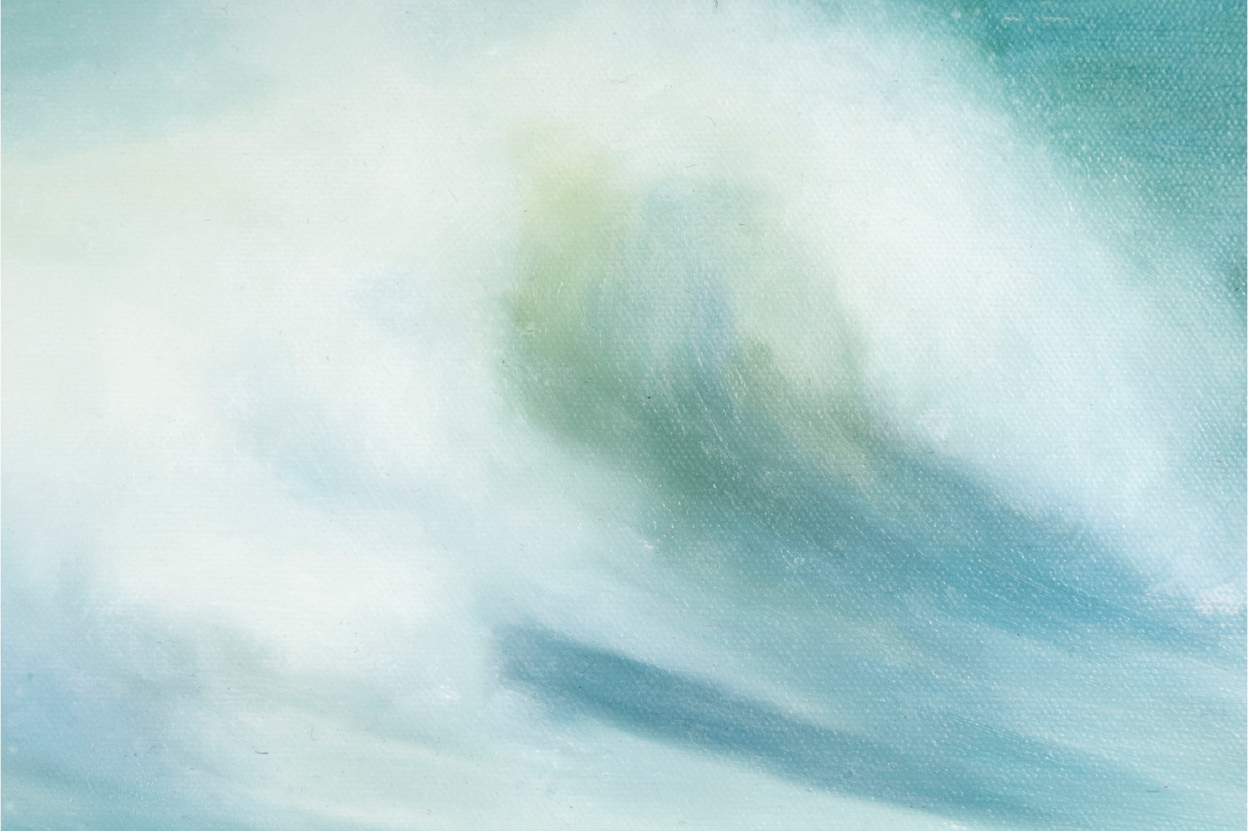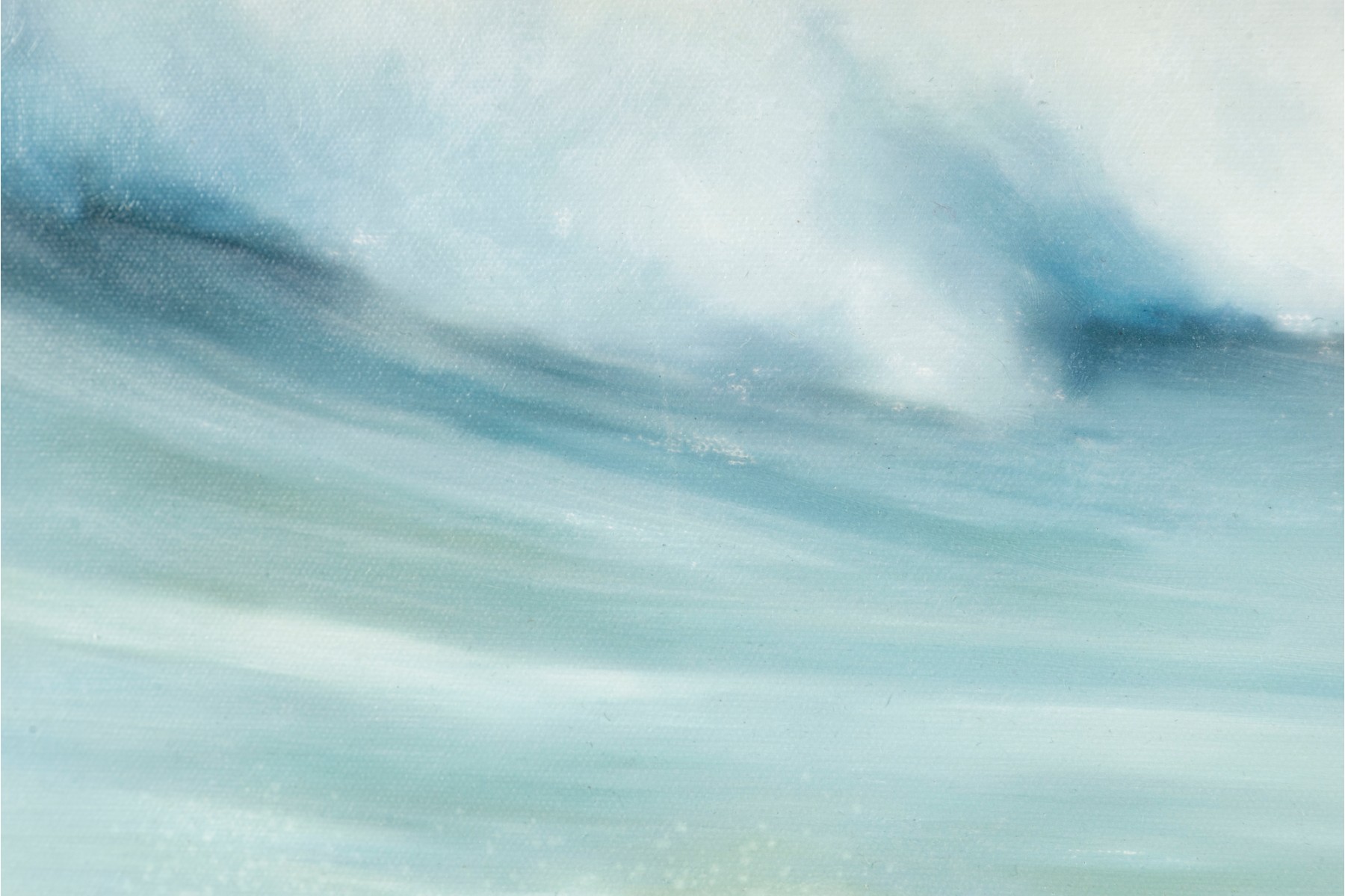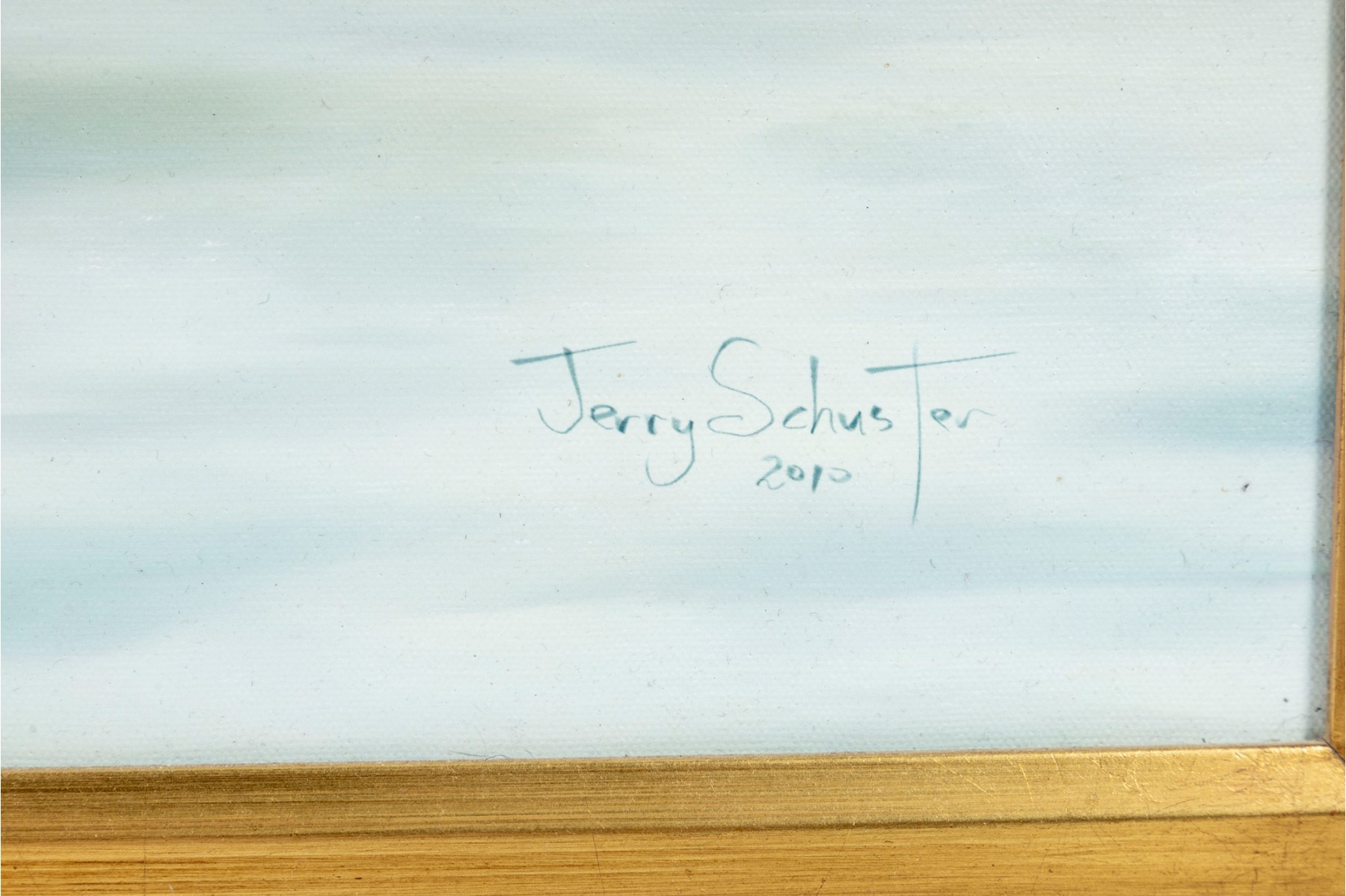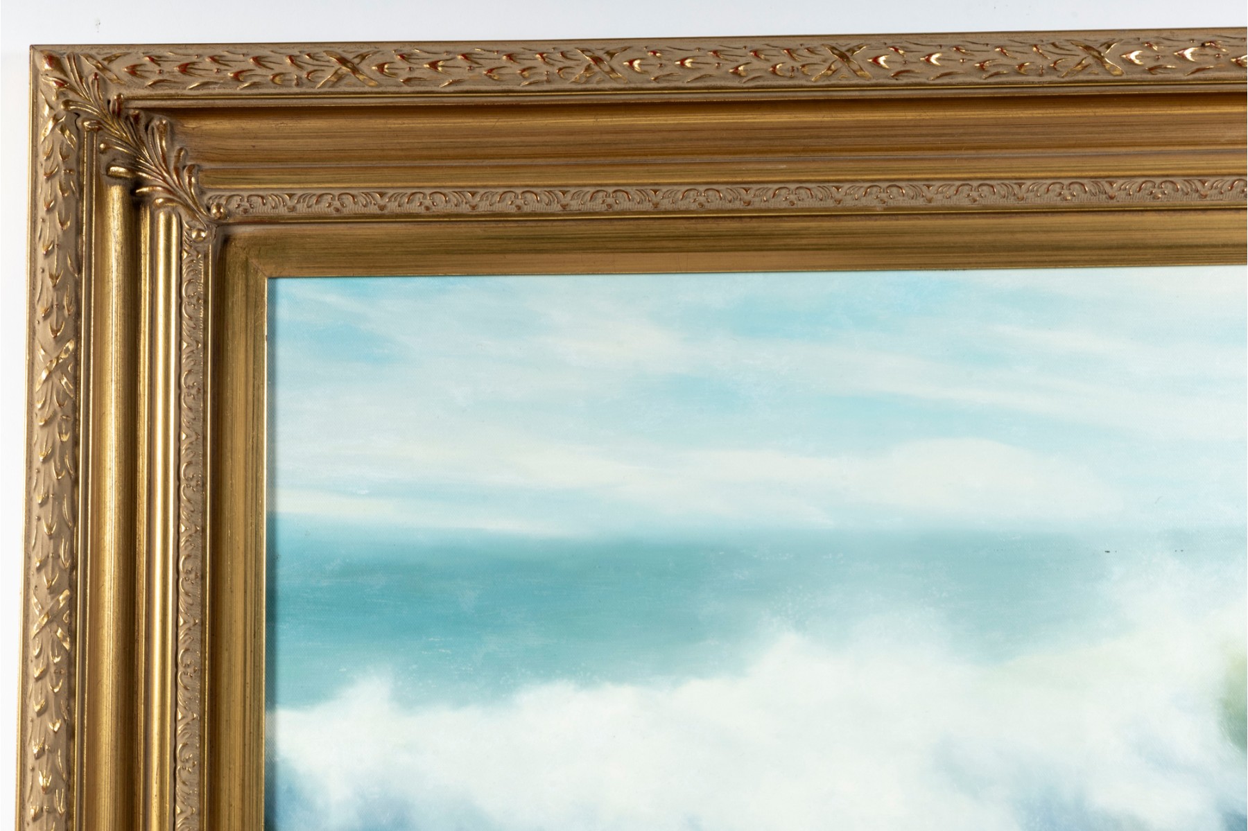 Jerry Schuster -- signed, untitled. Depicts a lovely, softly painted and blended oil landscape of a crashing tidal wave set below a bright blue sky. The artwork is presented openly within a grand, gold-tone frame with subtle carved trim. Dated 2010.