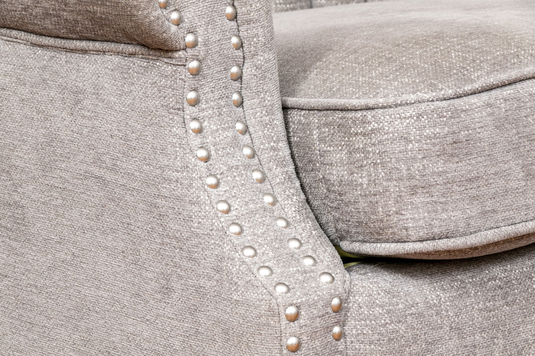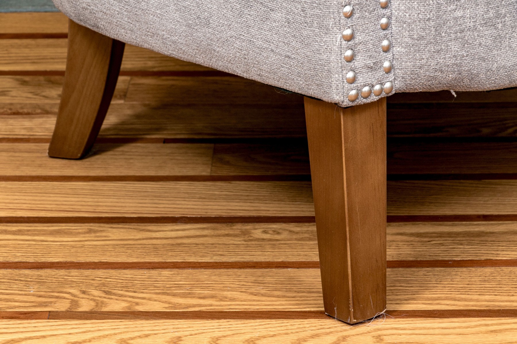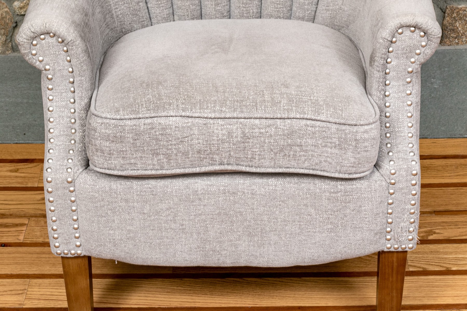 With a shell formed curved back and rolled arms with a nail head trim raised on wooden legs.