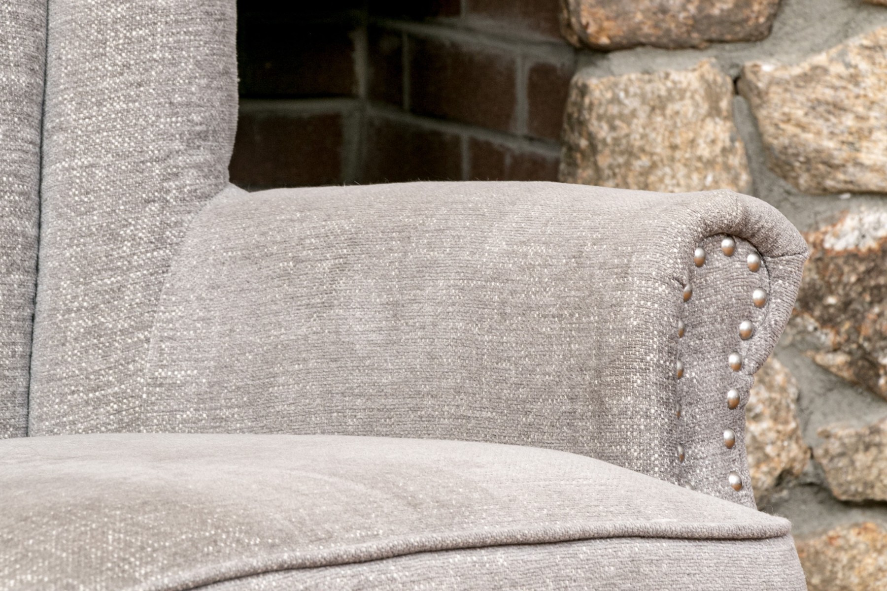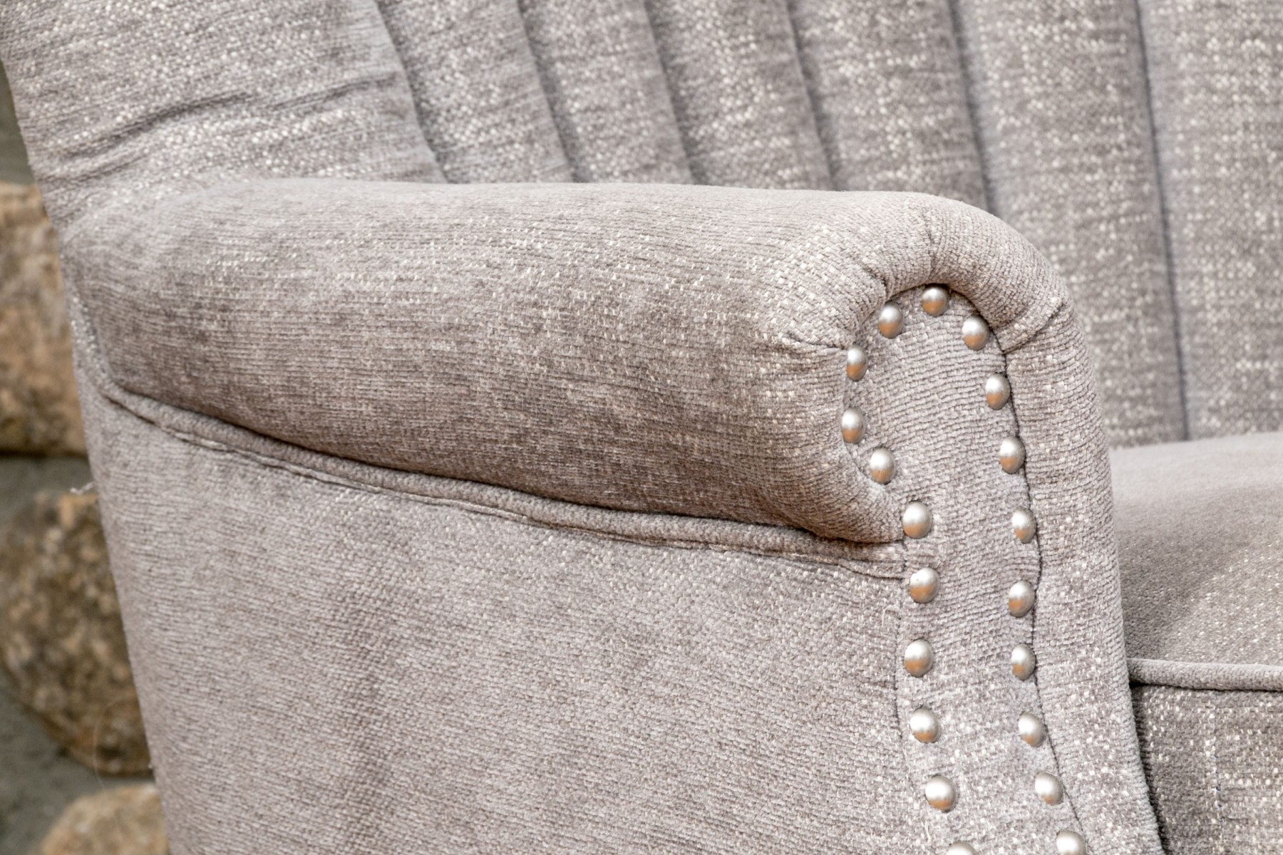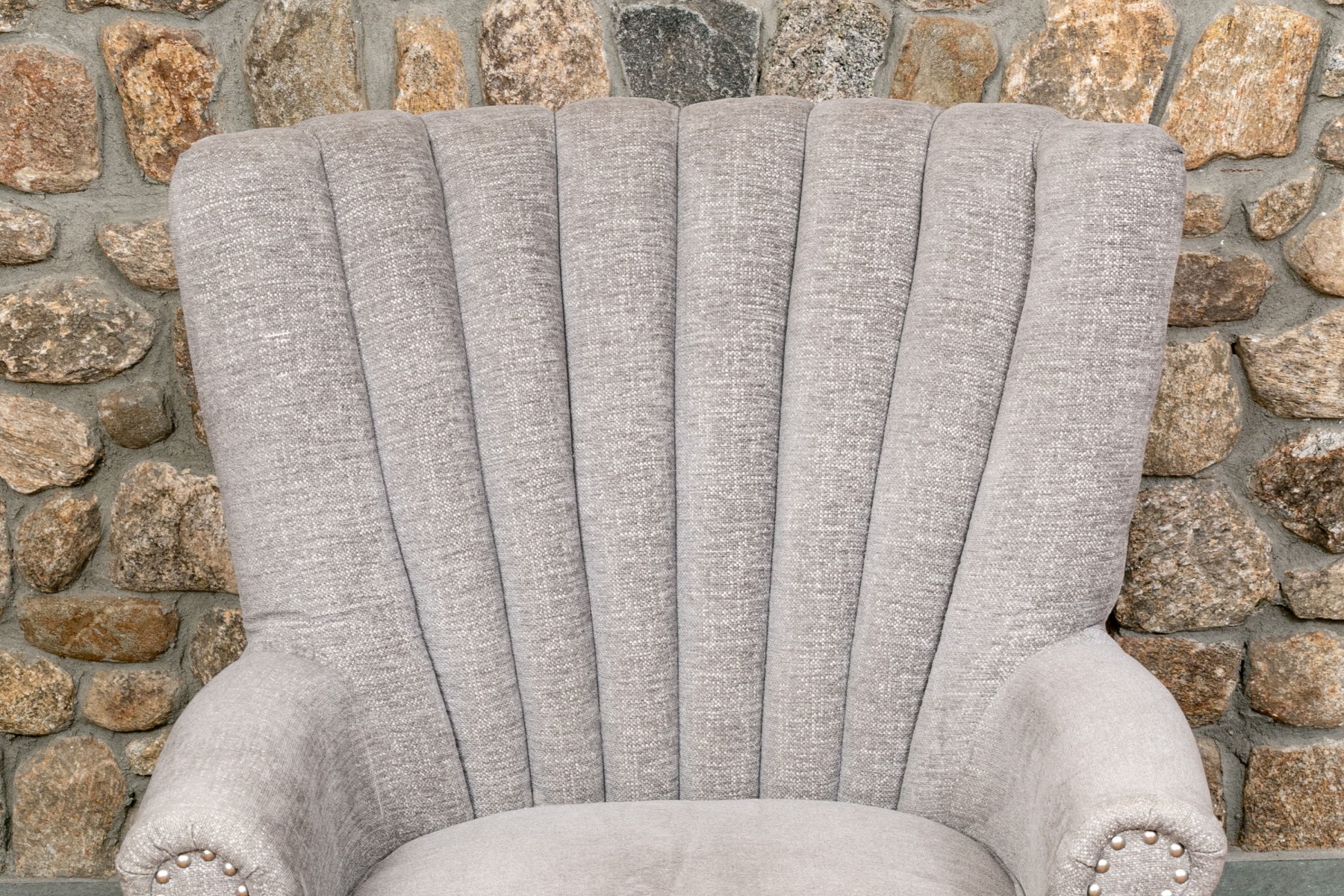 With a shell formed curved back and rolled arms with a nail head trim raised on wooden legs.