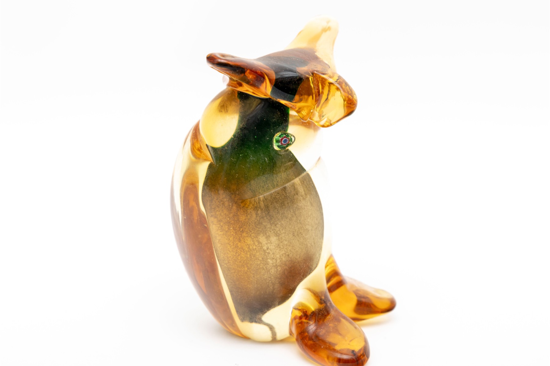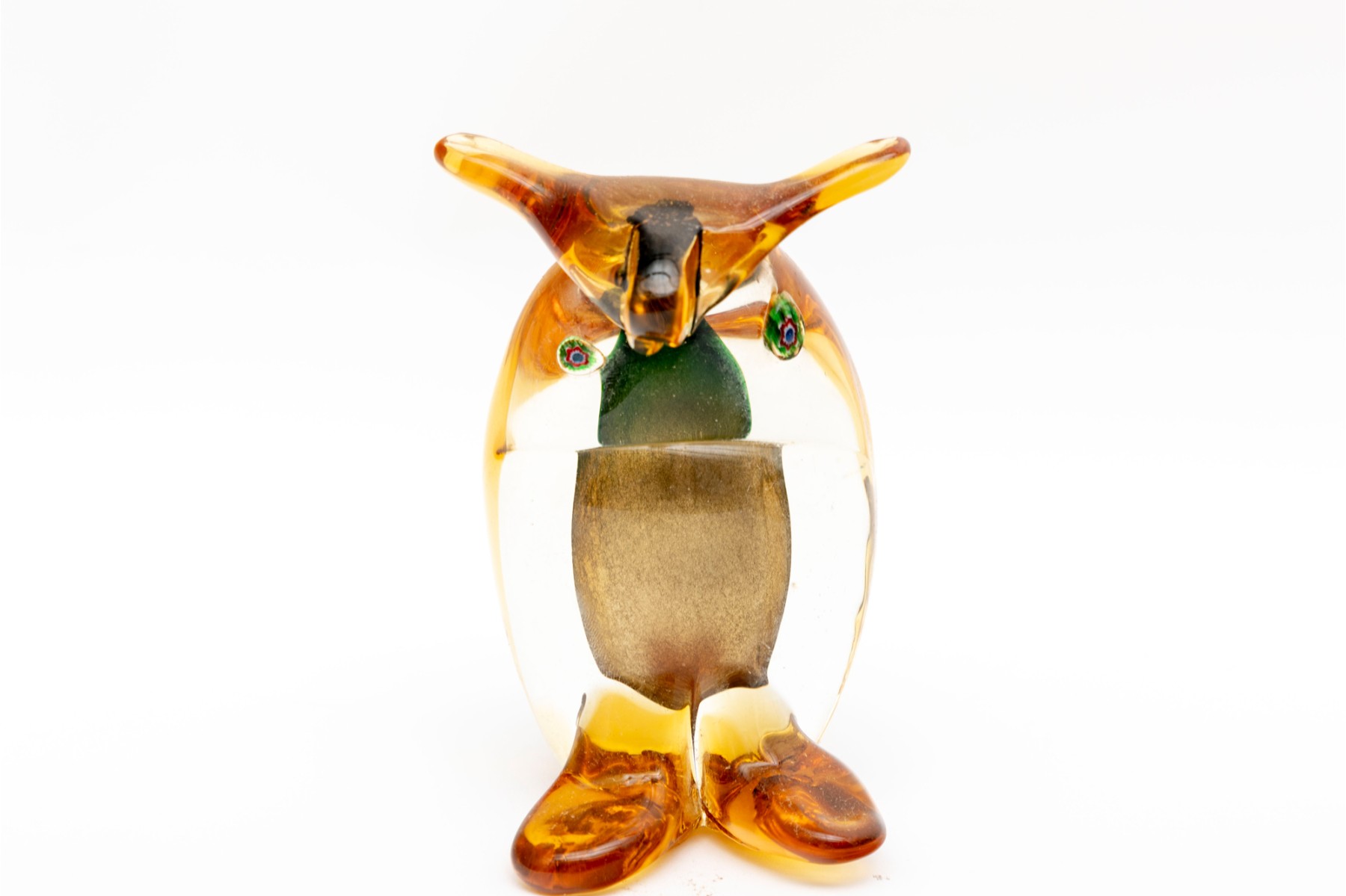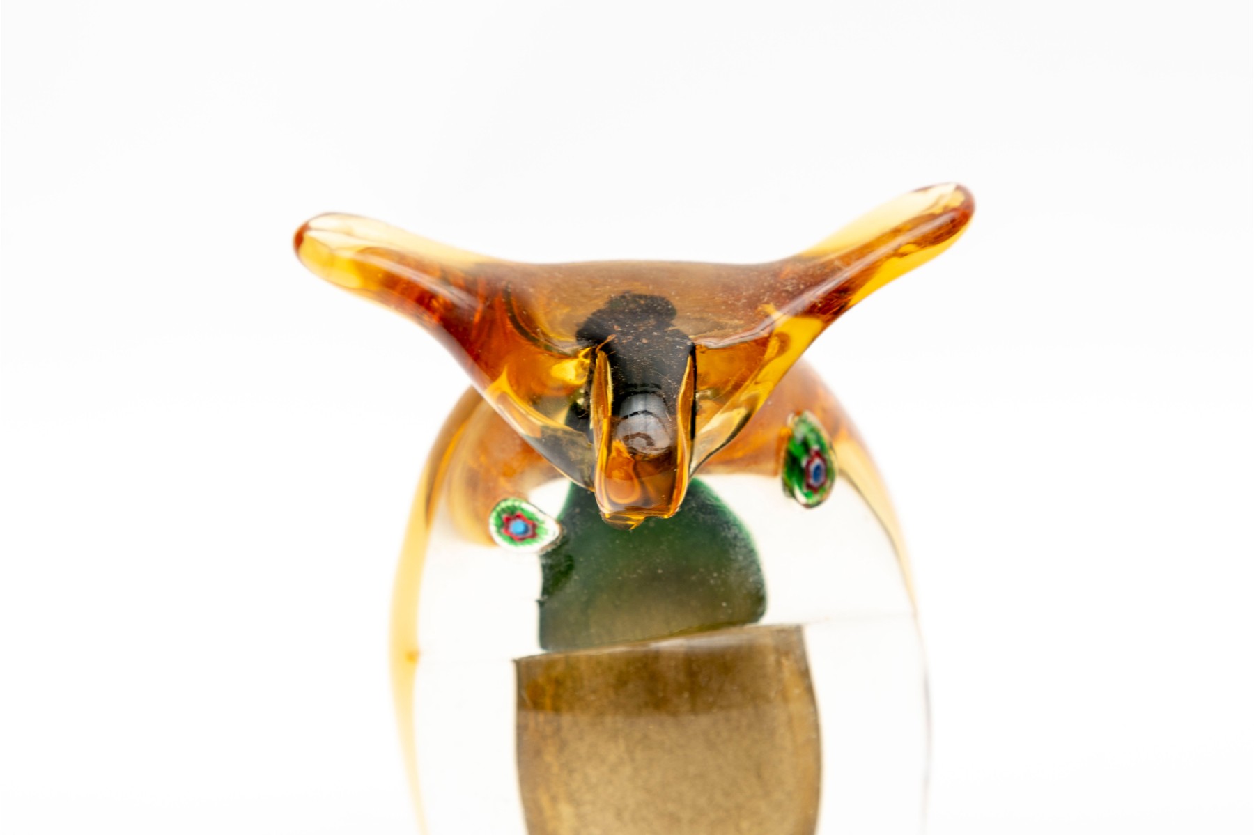 A vintage, hand-crafted Murano amber art glass owl produced by JI & Co. The sculpture features distinctive Millefiori eyes and an interior body dusted with gold.