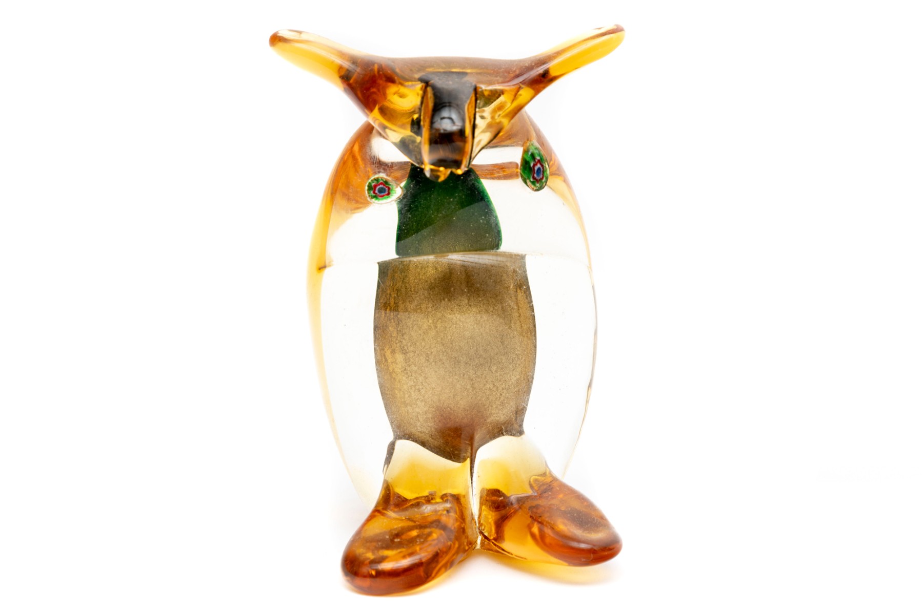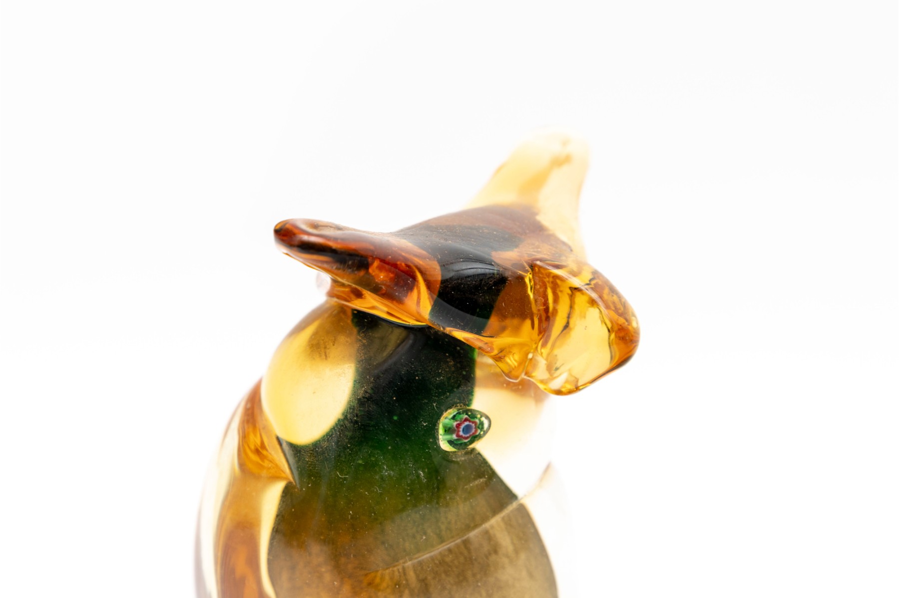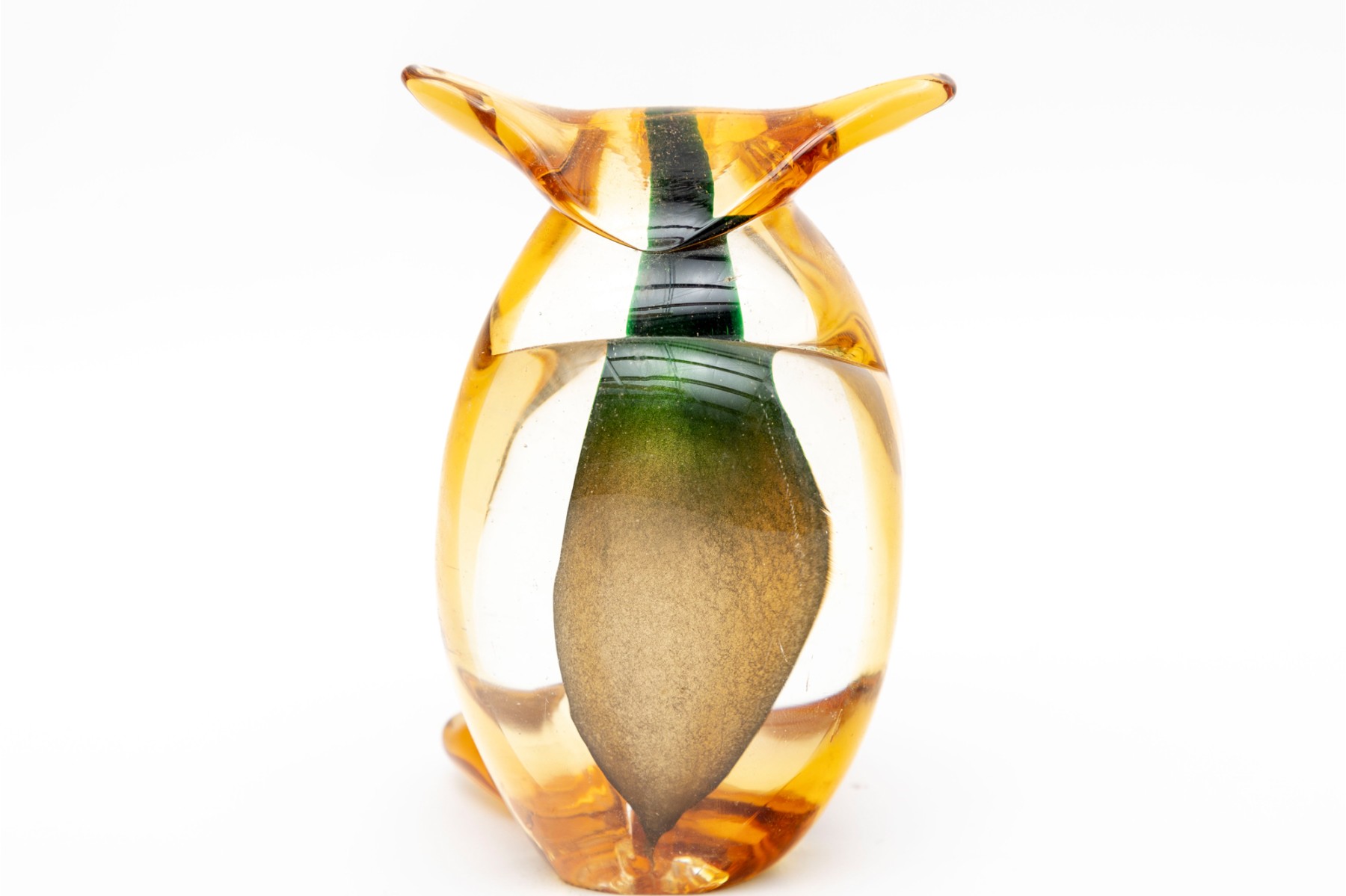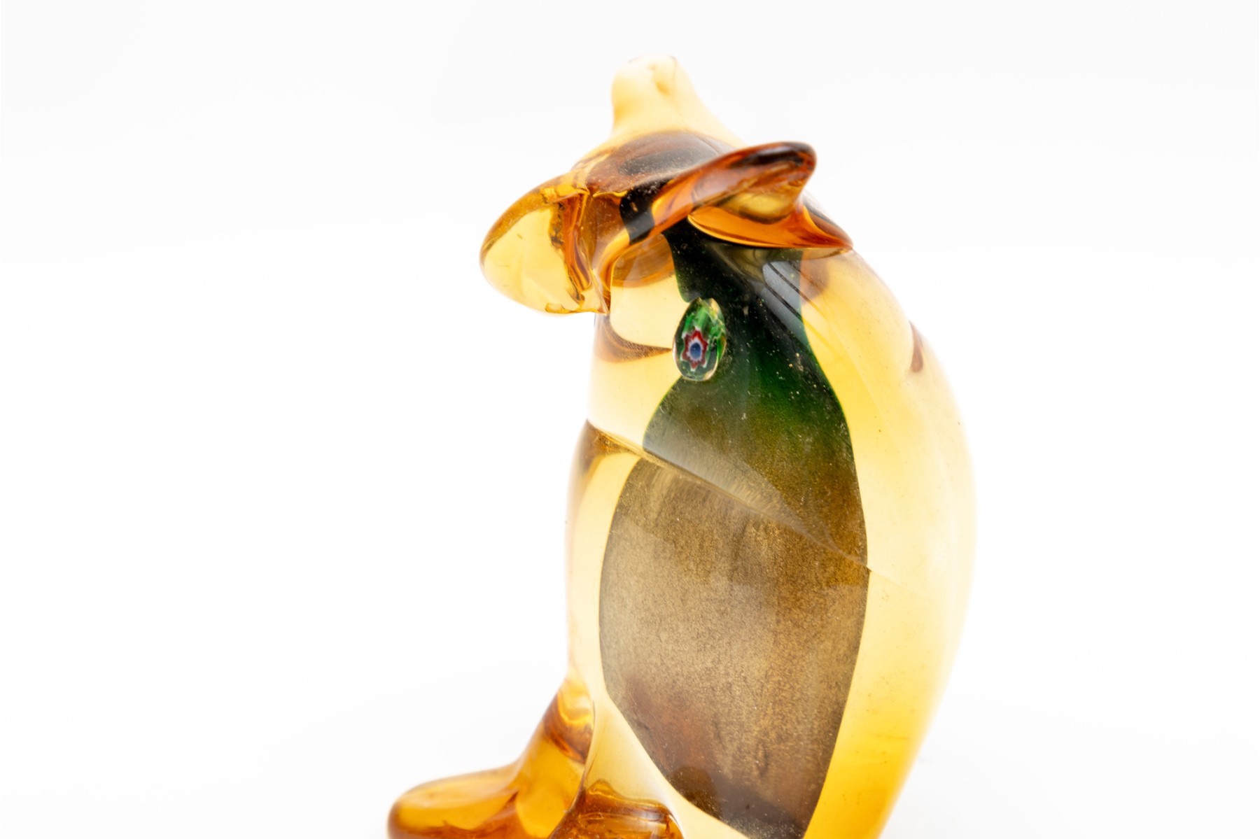 A vintage, hand-crafted Murano amber art glass owl produced by JI & Co. The sculpture features distinctive Millefiori eyes and an interior body dusted with gold.