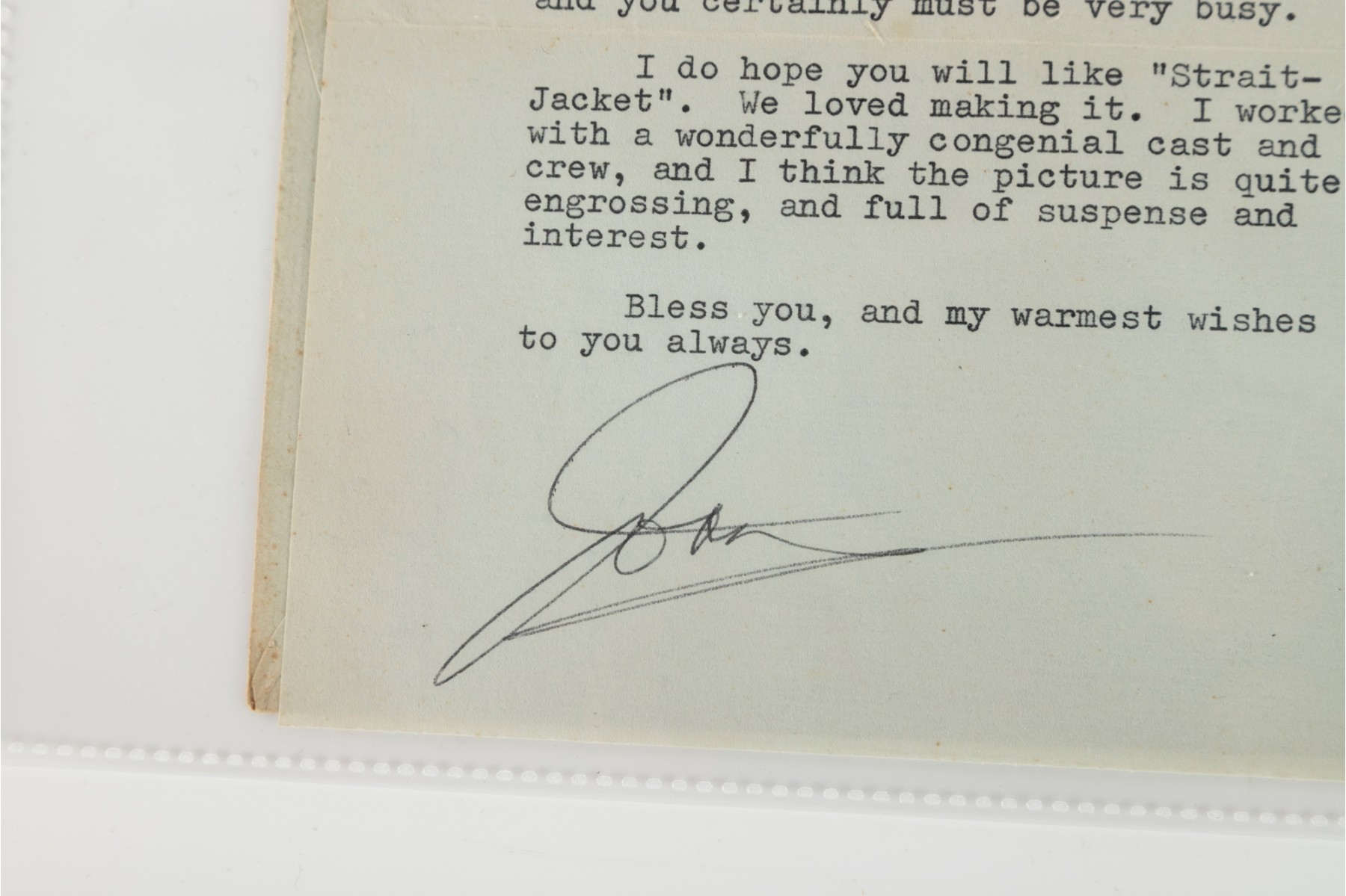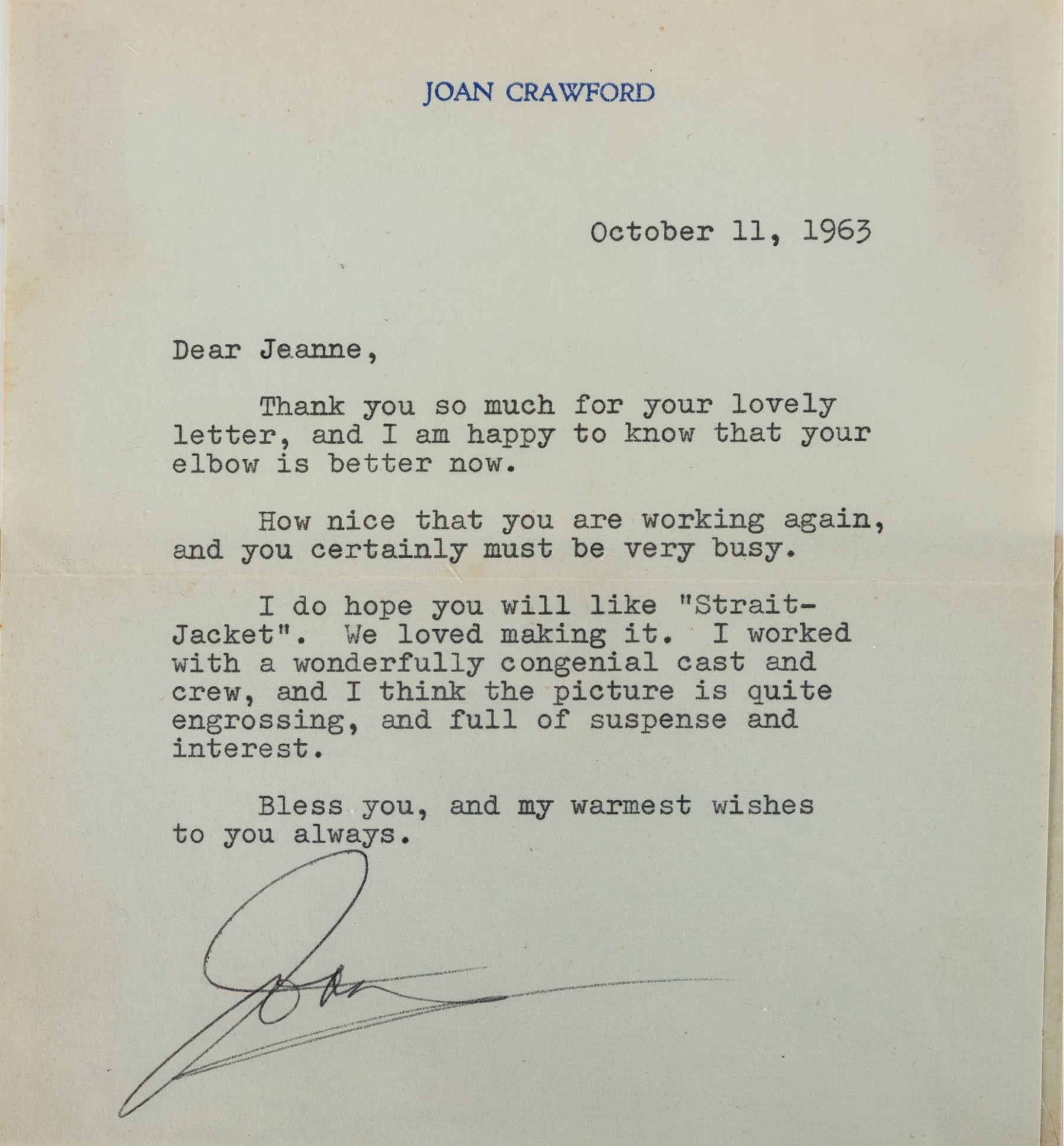 I do hope you will like "Straight-Jacket". We loved making it. I worked with a wonderfully congenial cast and crew, and I think the picture is quite engrossing, and full of suspense and interest.
