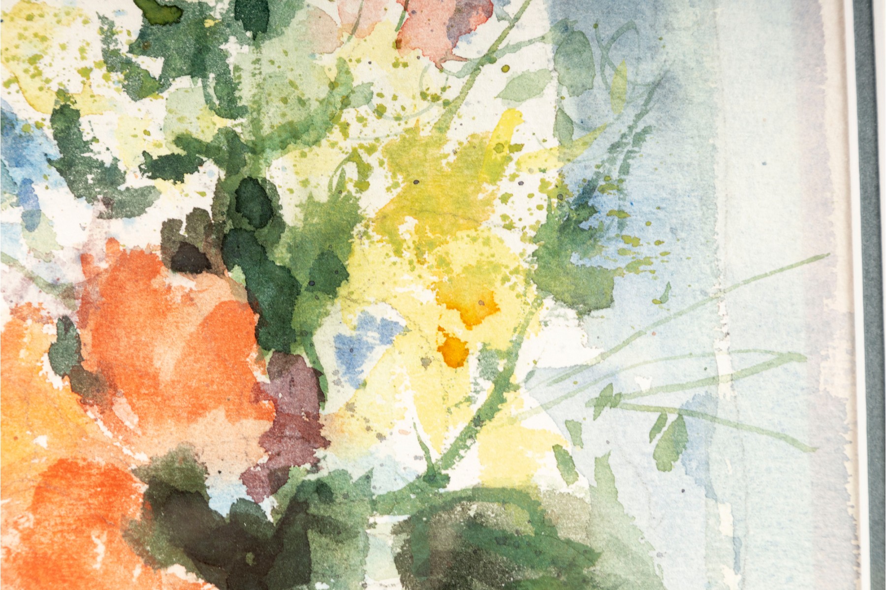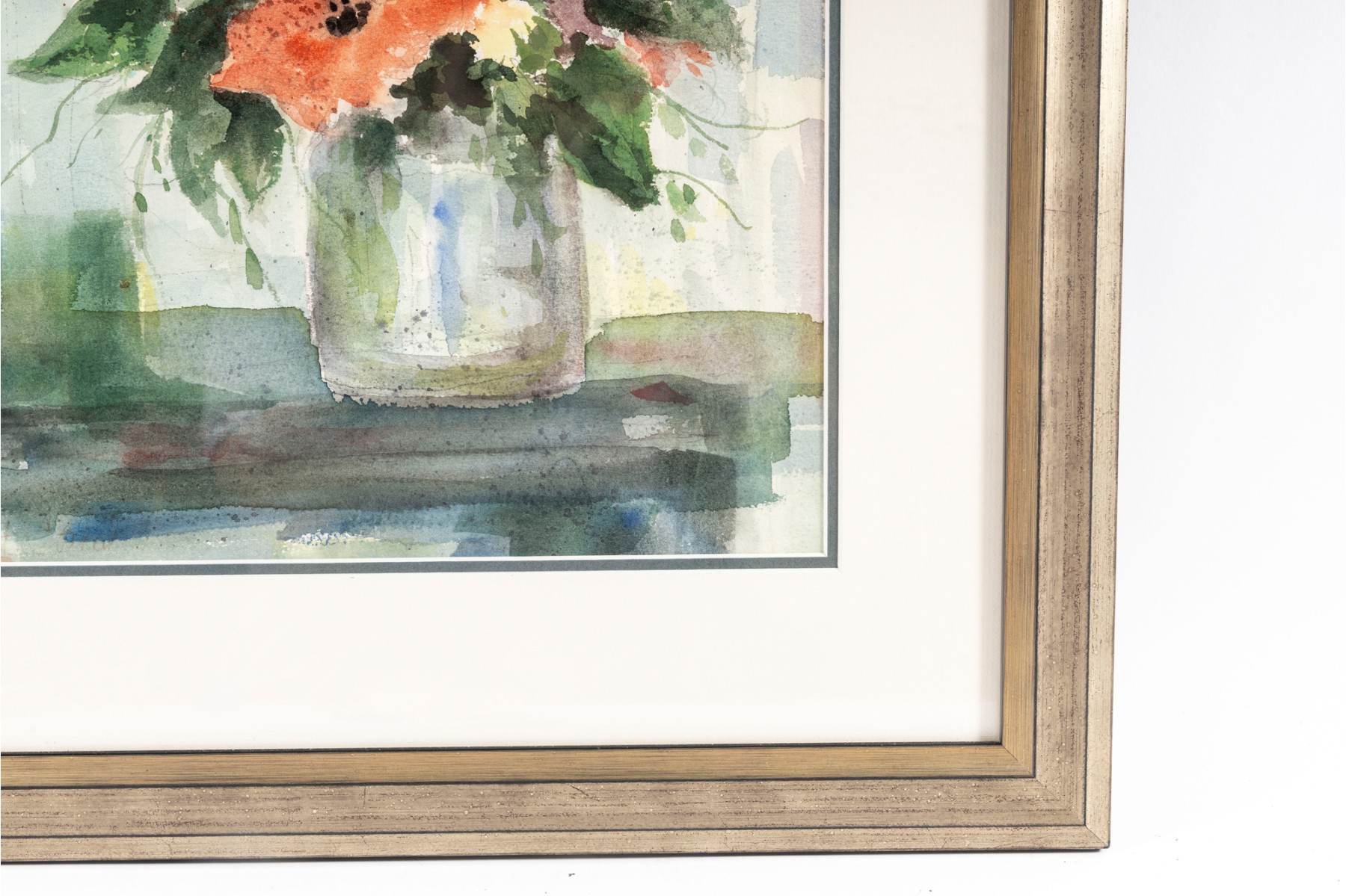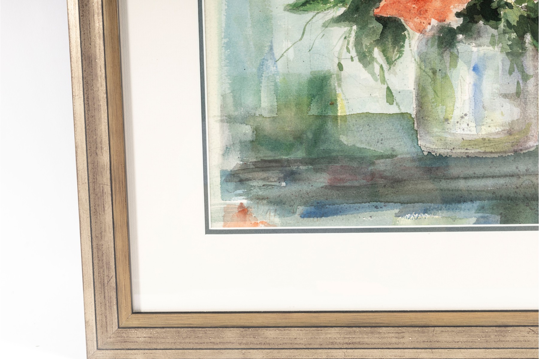 An original watercolor still life painting, untitled by Joan DerryBerry (B. 1901) of Cookeville Tennessee. Joan has had several solo exhibitions of her works, the most recent being from Tennessee Tech University, 2021. This particular painting is presented within a painted wood frame accented with white/navy mat borders, and faced with glass.