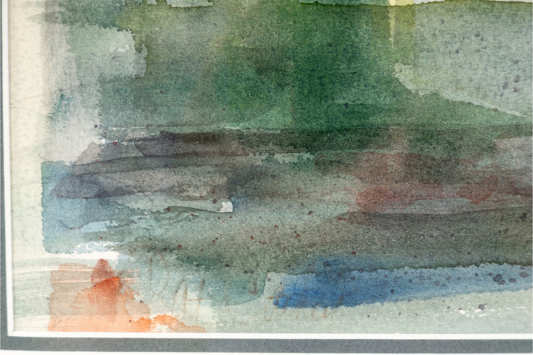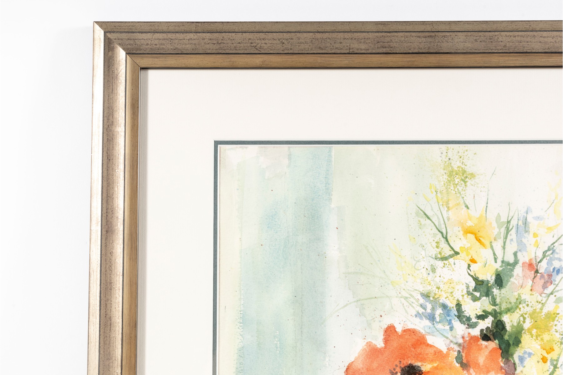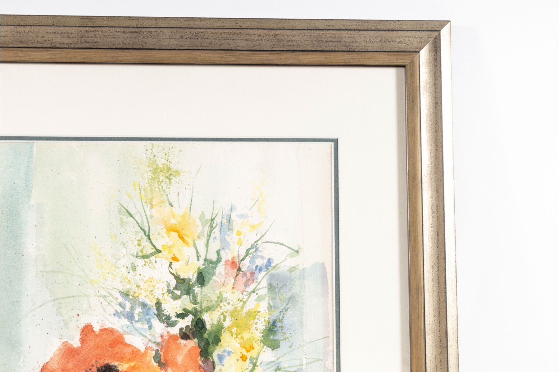An original watercolor still life painting, untitled by Joan DerryBerry (B. 1901) of Cookeville Tennessee. Joan has had several solo exhibitions of her works, the most recent being from Tennessee Tech University, 2021. This particular painting is presented within a painted wood frame accented with white/navy mat borders, and faced with glass.