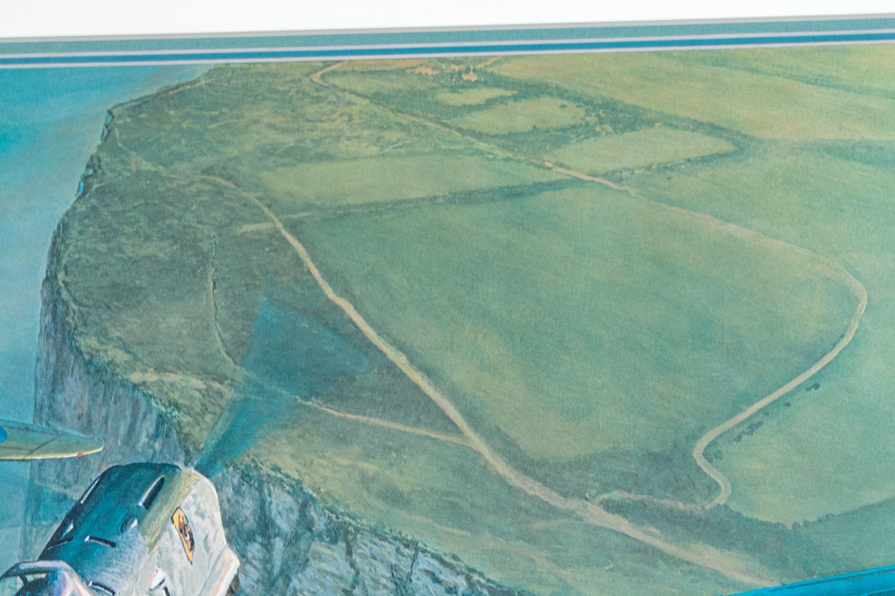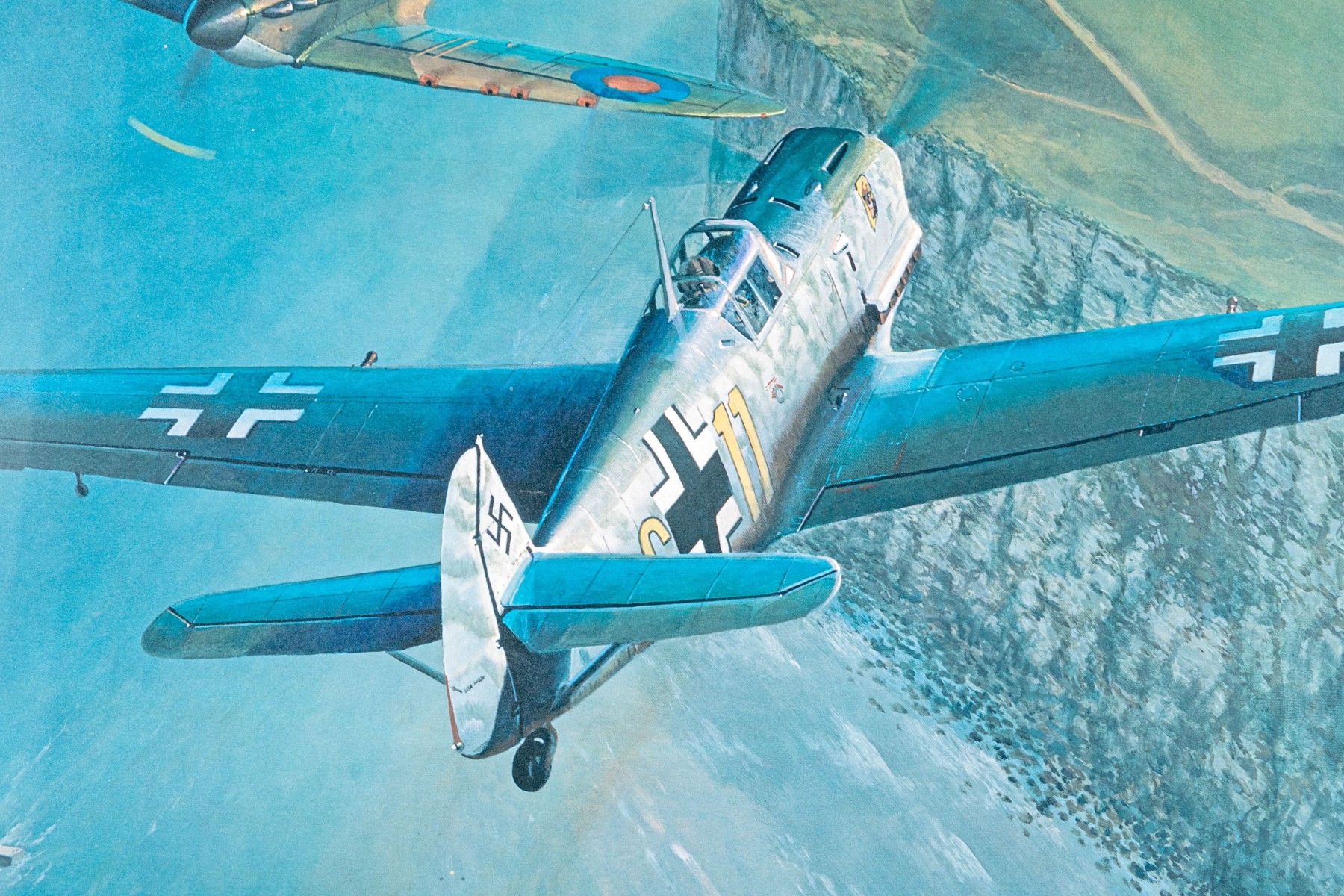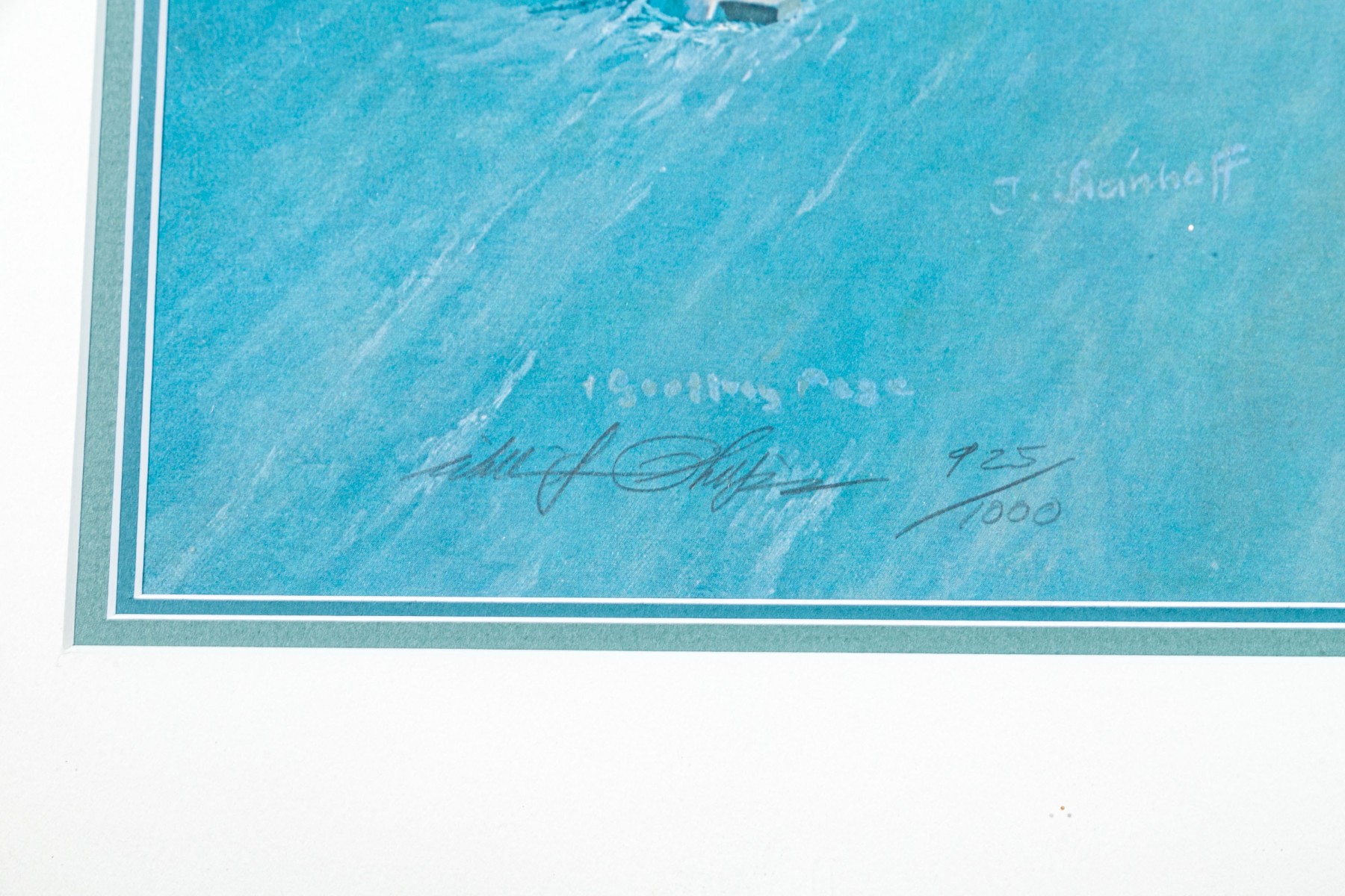 Pencil signed and numbered 995/1000 lower left. Also labeled Geoffrey Page in plate lower left. The two planes off the coast of England. Both names refer to famous WWII fighter pilots. Presented in a silver gilt frame with glass.