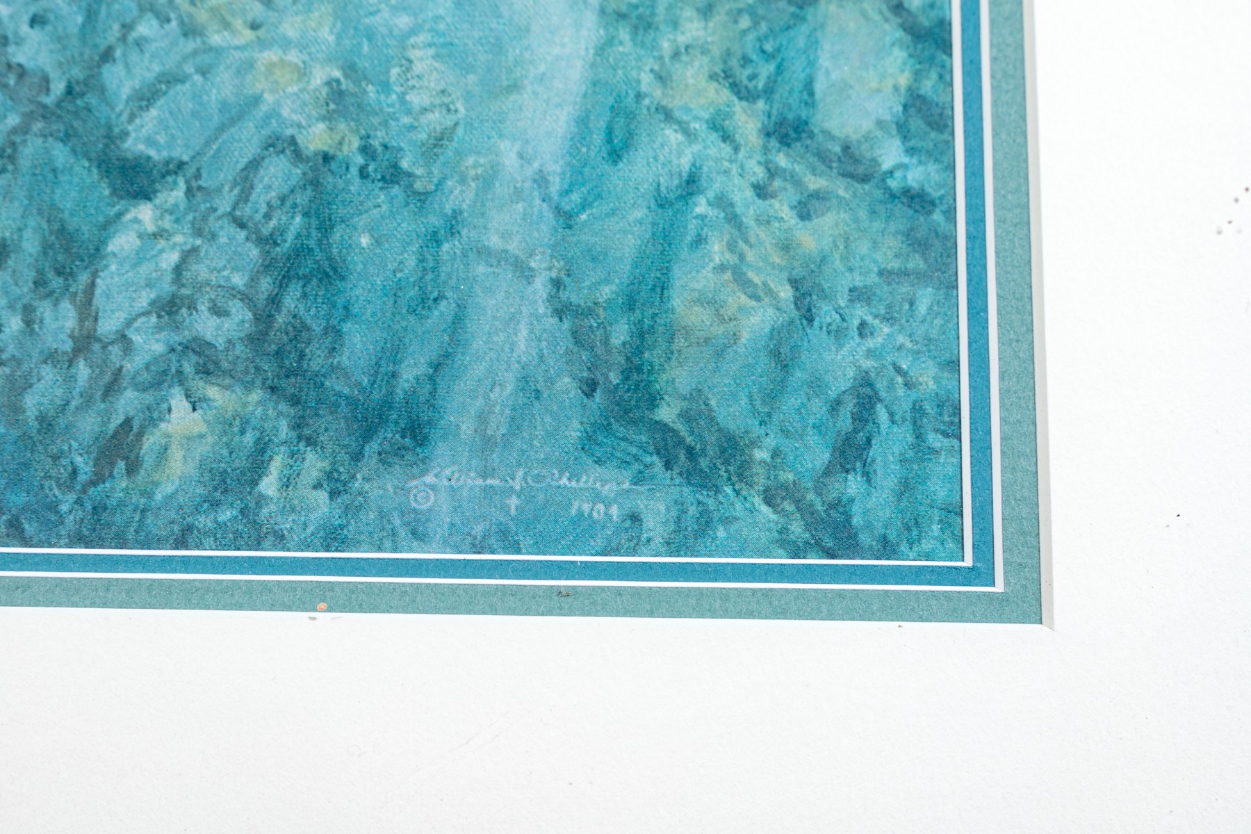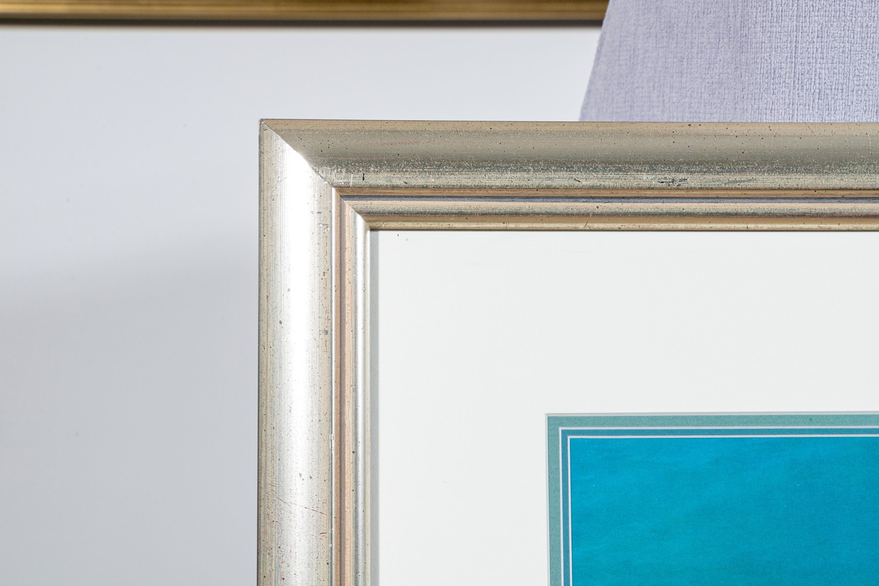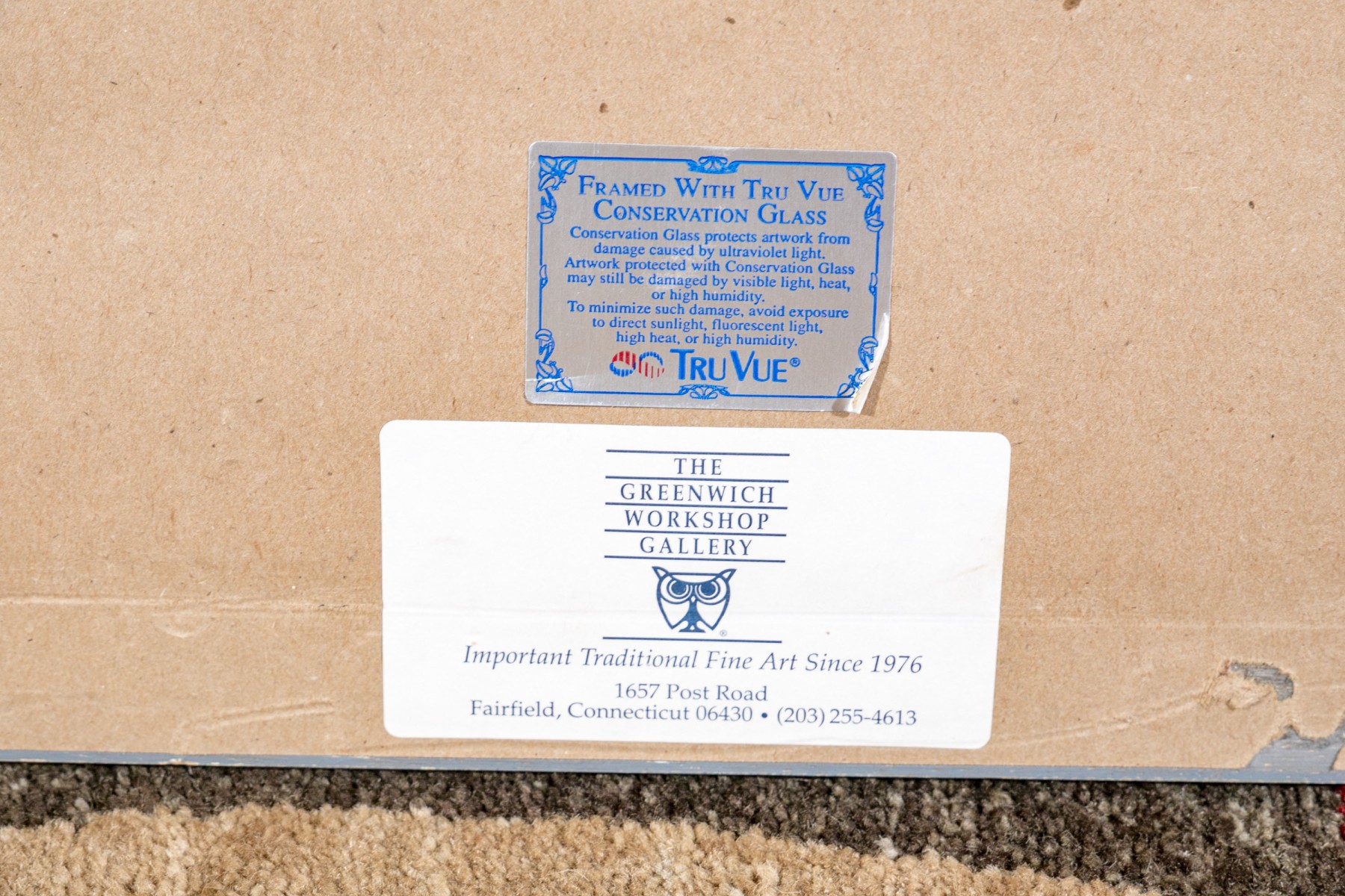 Pencil signed and numbered 995/1000 lower left. Also labeled Geoffrey Page in plate lower left. The two planes off the coast of England. Both names refer to famous WWII fighter pilots. Presented in a silver gilt frame with glass.