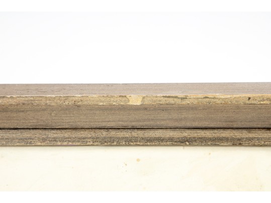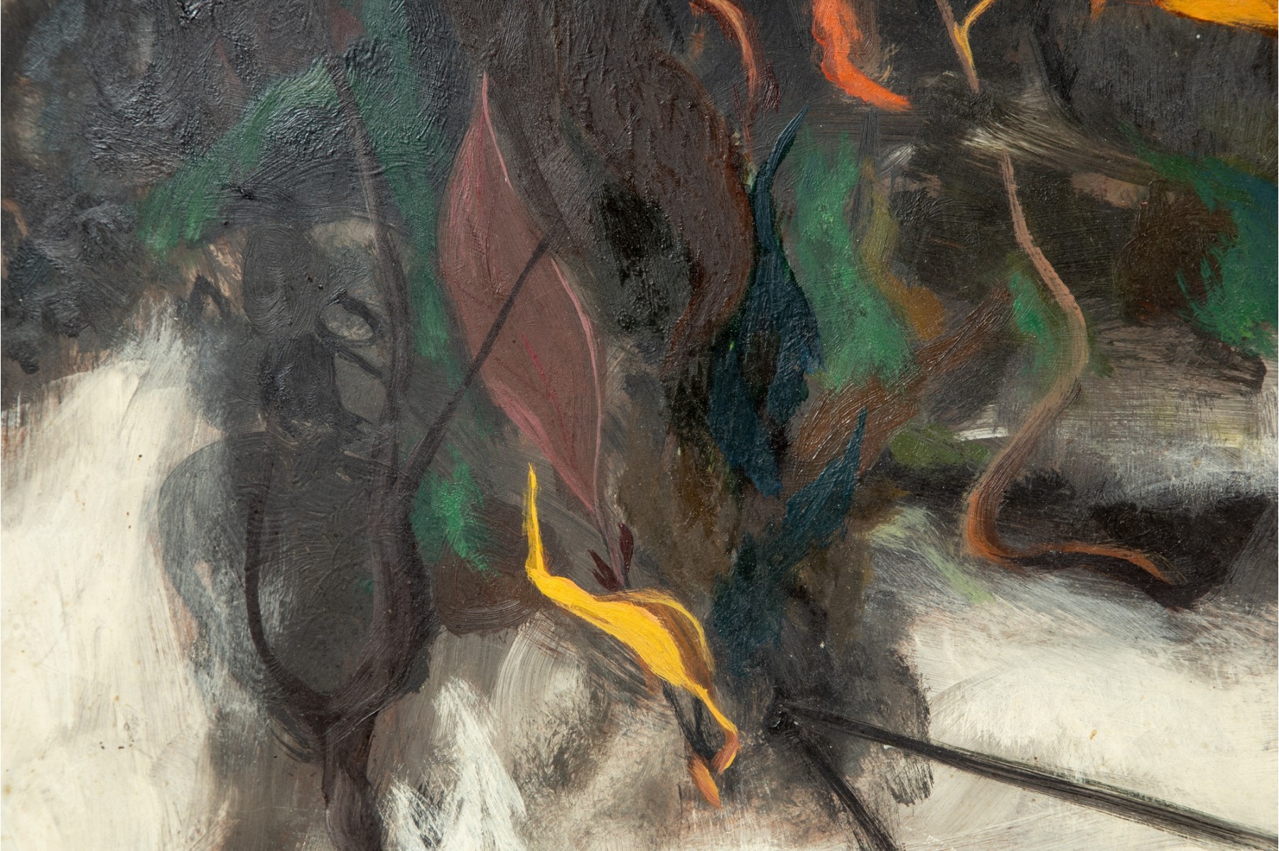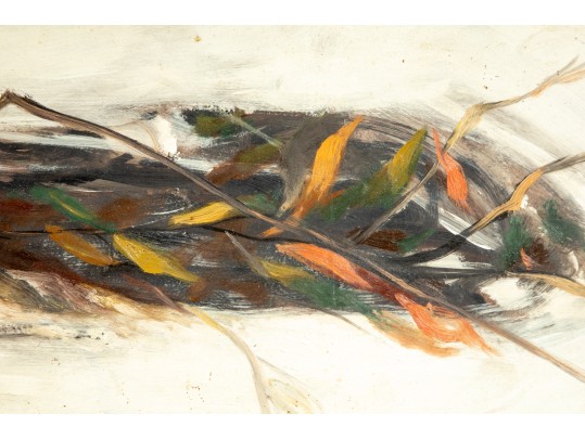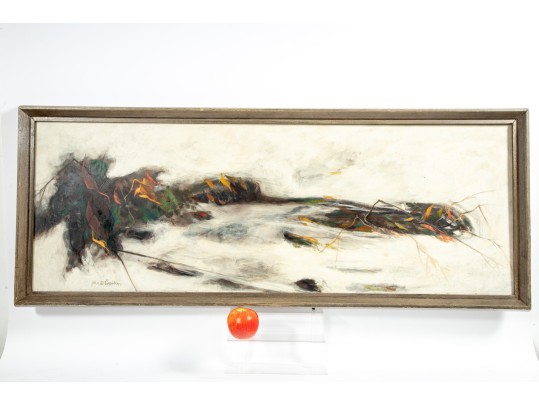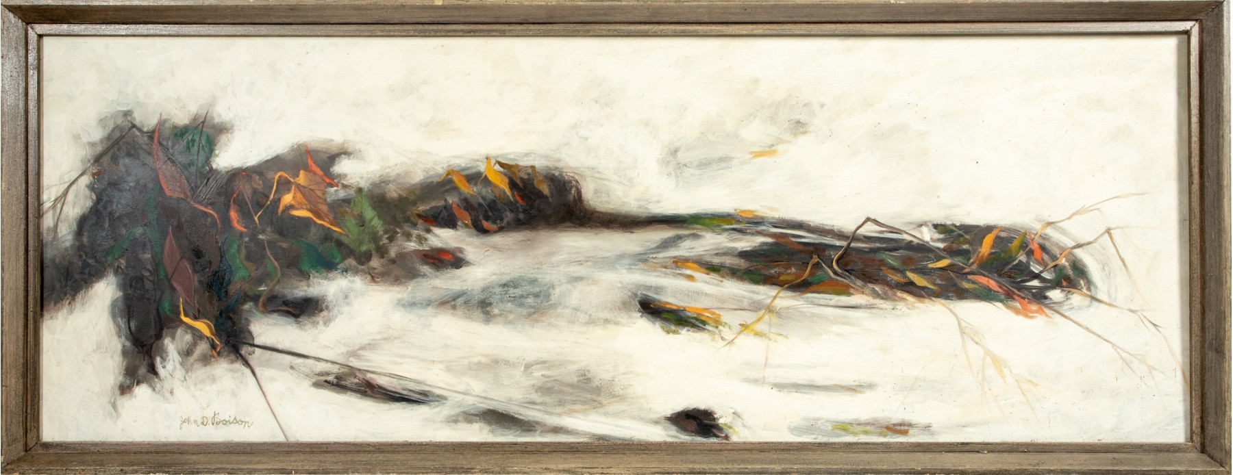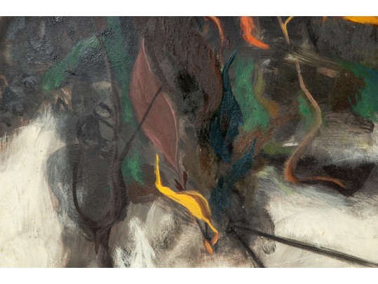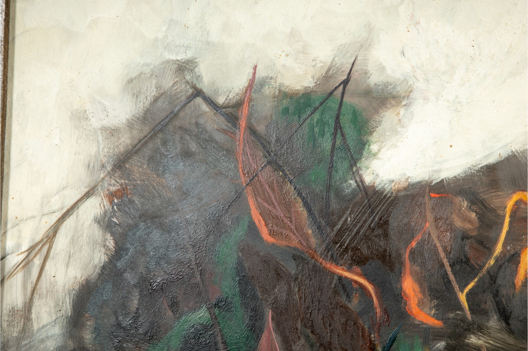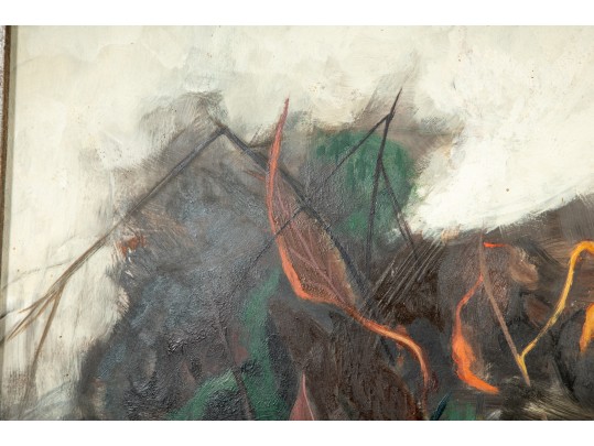 This intriguing abstract painting by John D. Boison, created in oil on Masonite board, features vague tree branch forms that evoke a sense of organic movement and natural beauty. The artwork is presented openly within a a rustic and distressed wood frame.