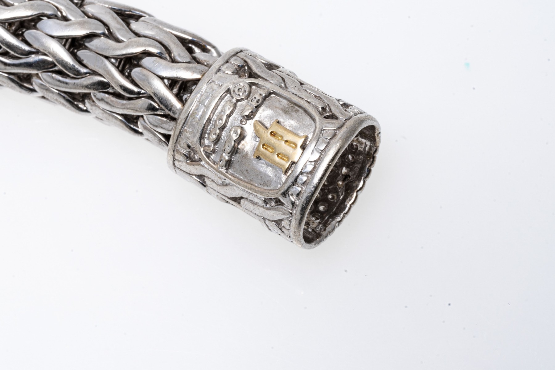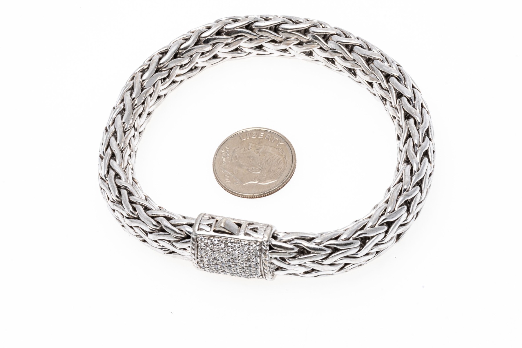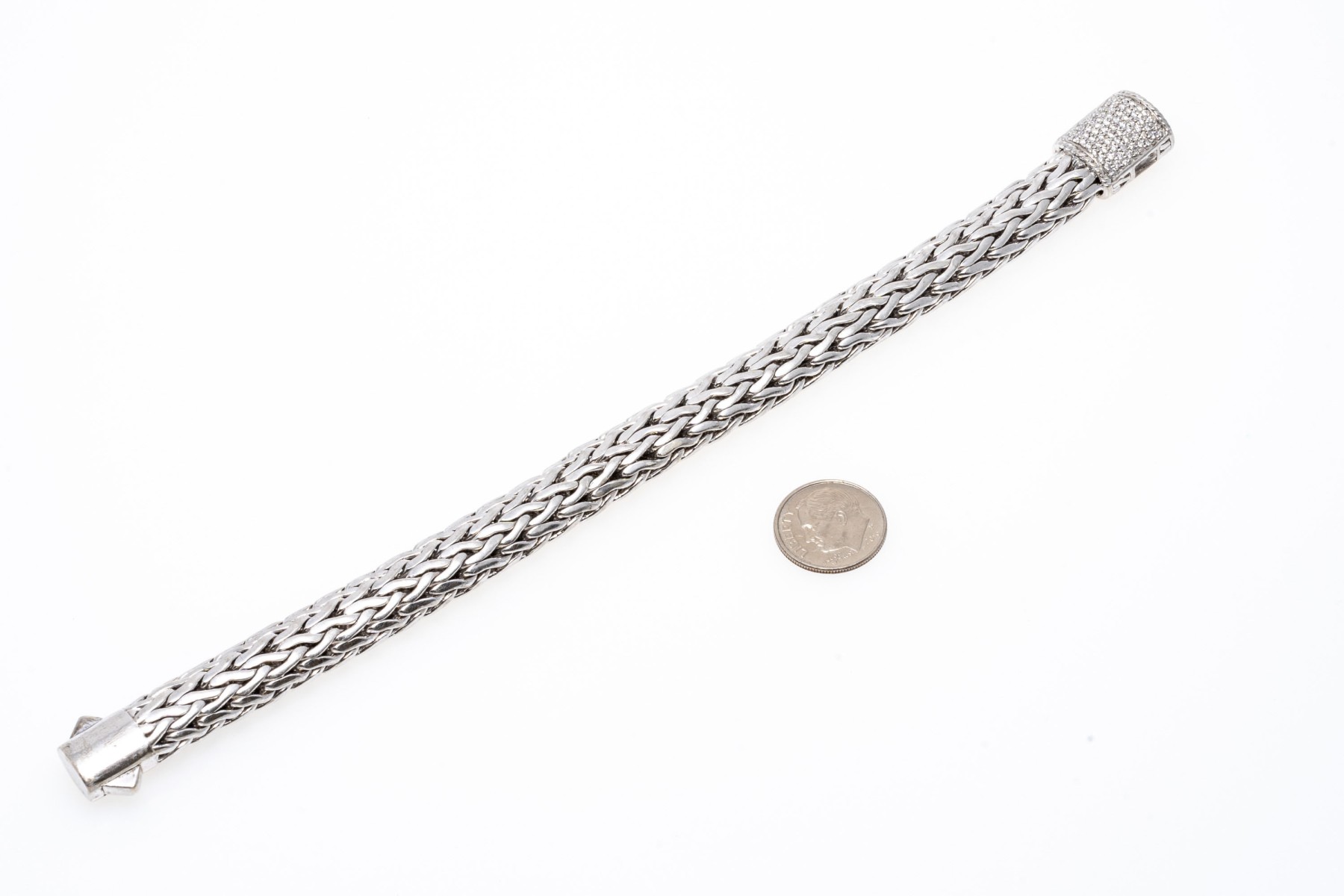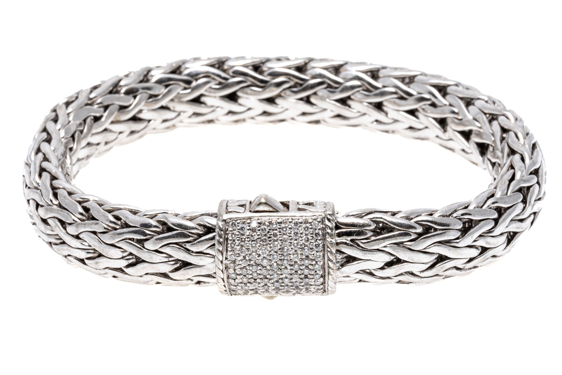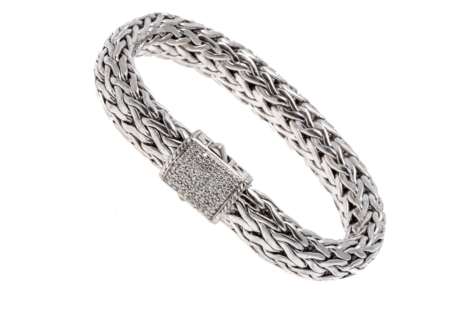 A handsome John Hardy sterling silver and white gold bracelet with a bright polished finish, featuring a large wheat chain leading to a box clasp pave set in accent diamonds, approximately 0.53 TCW.