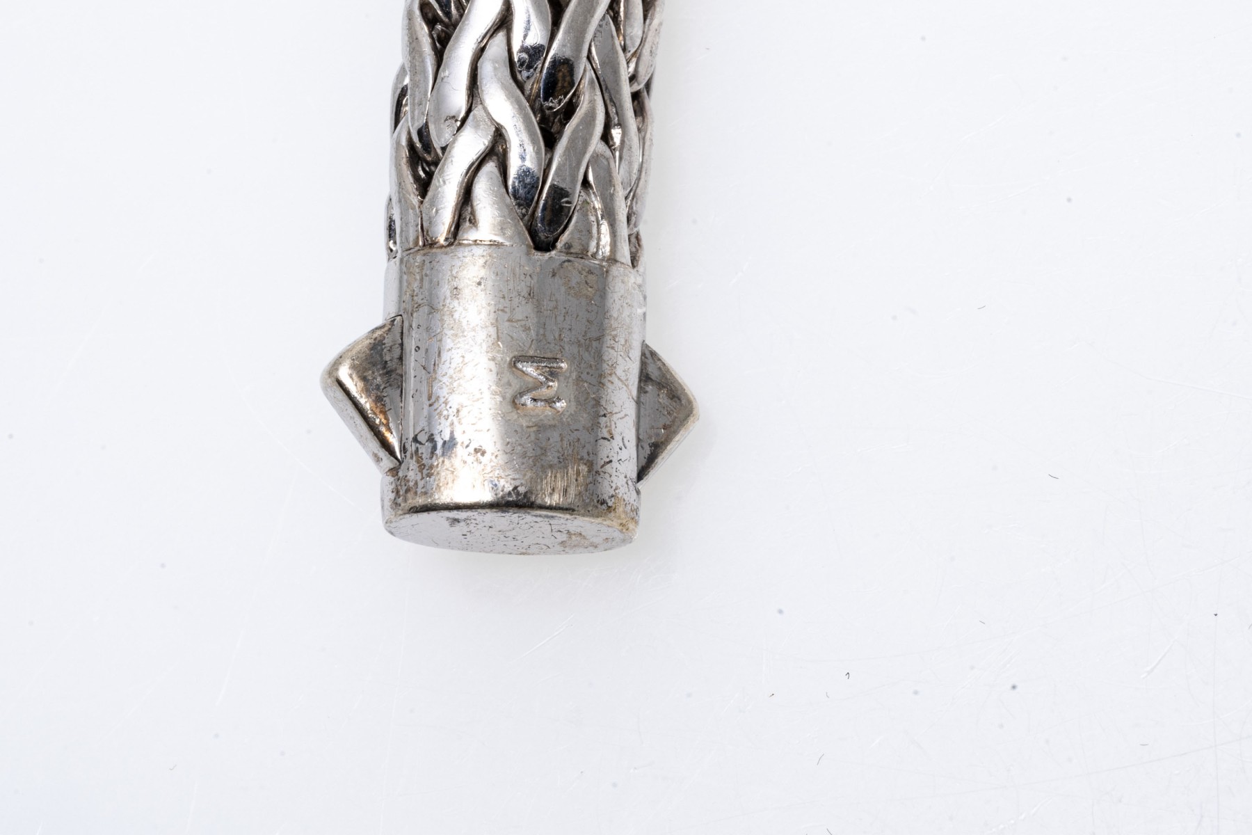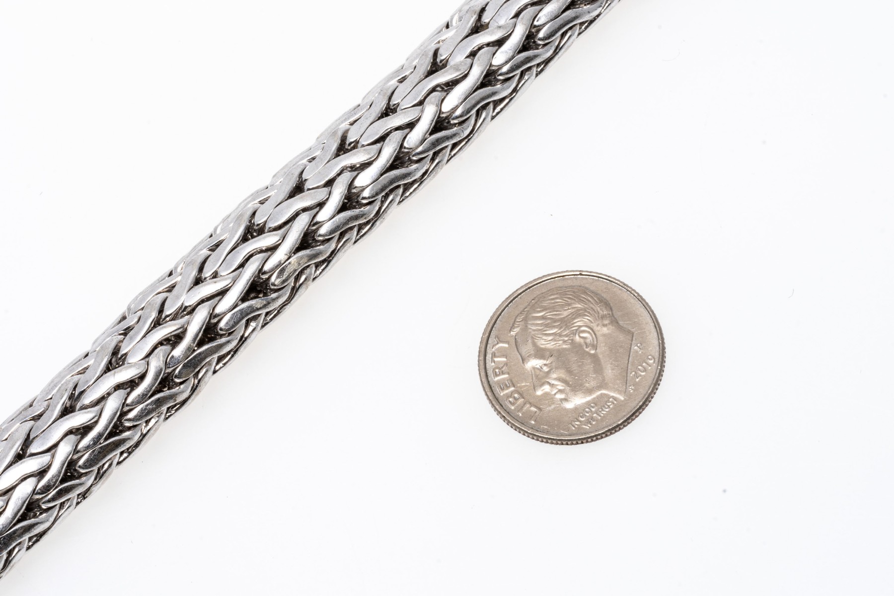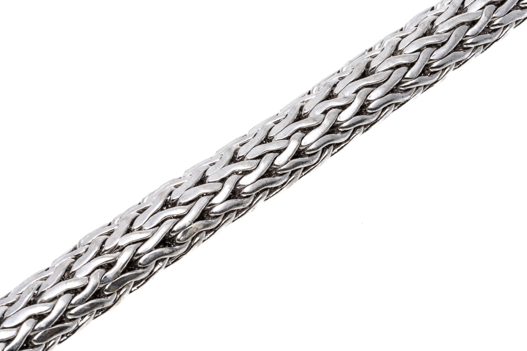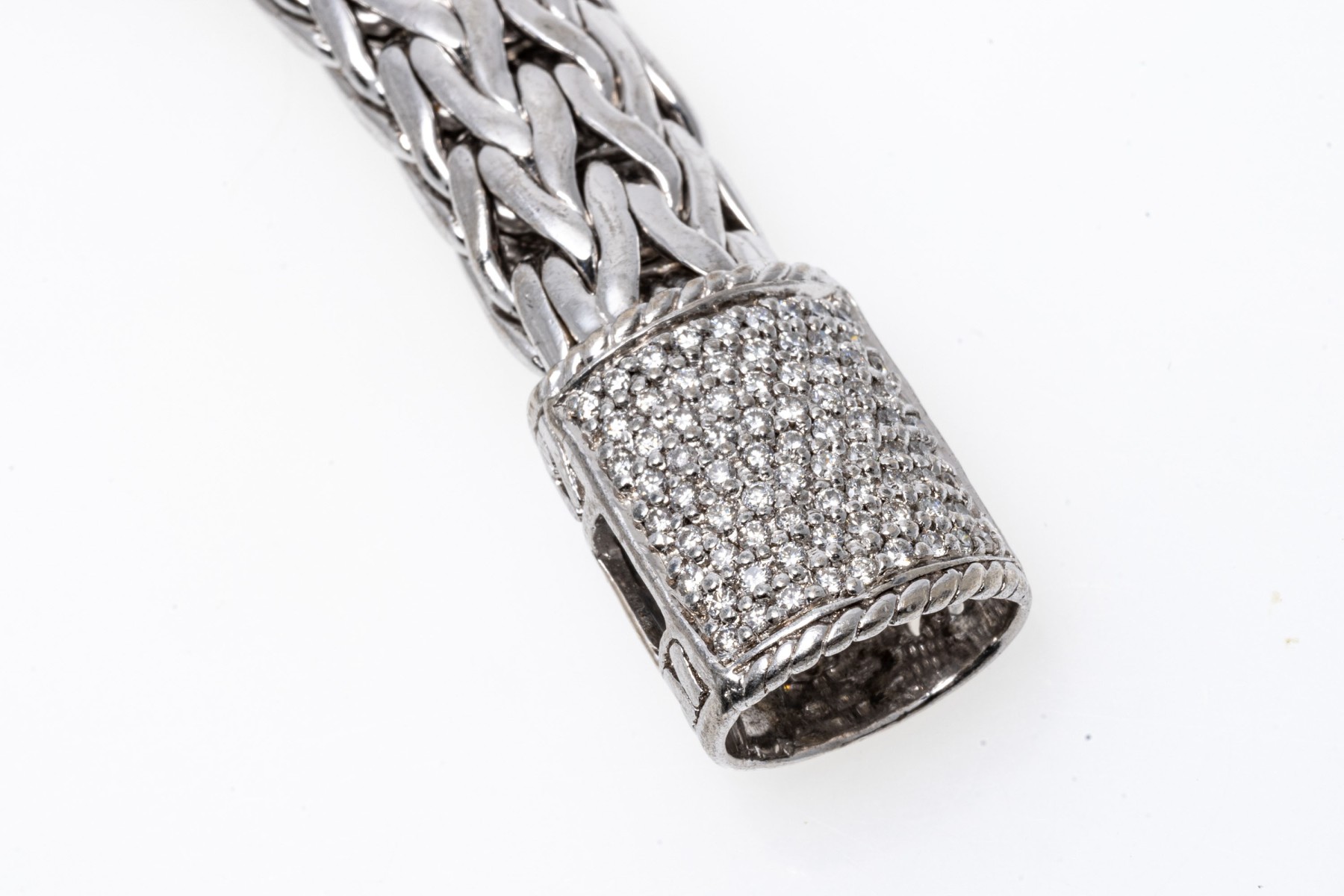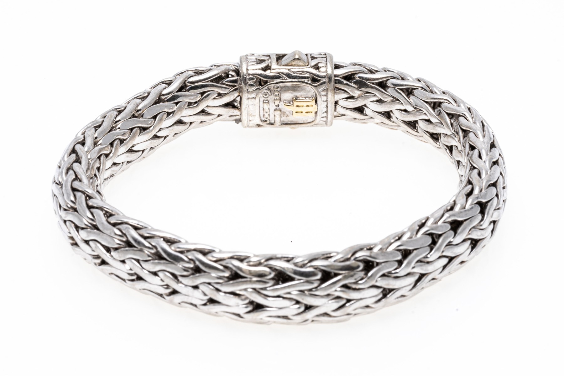 A handsome John Hardy sterling silver and white gold bracelet with a bright polished finish, featuring a large wheat chain leading to a box clasp pave set in accent diamonds, approximately 0.53 TCW.