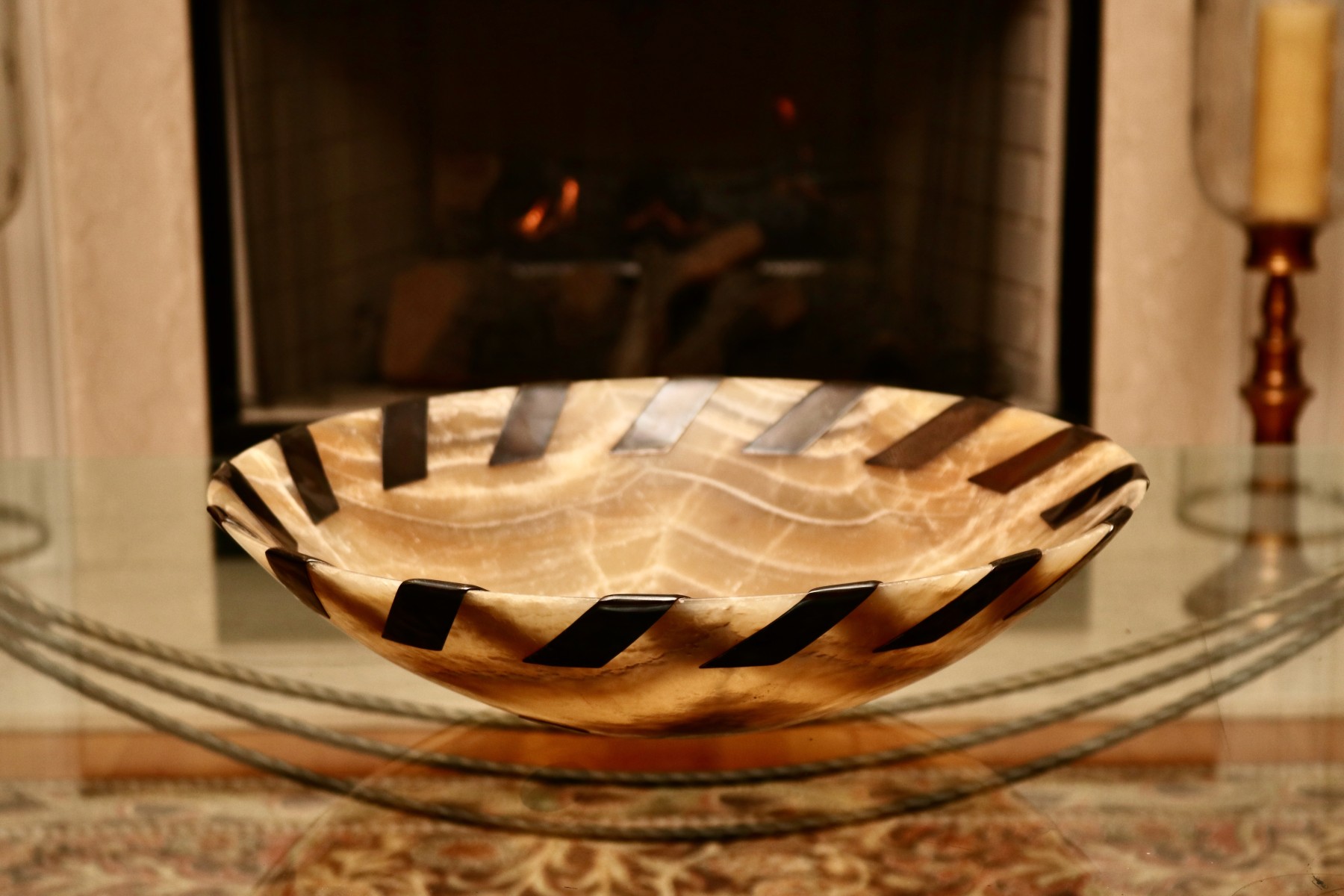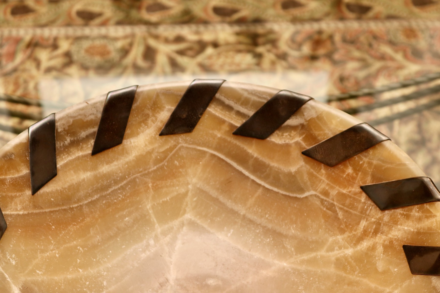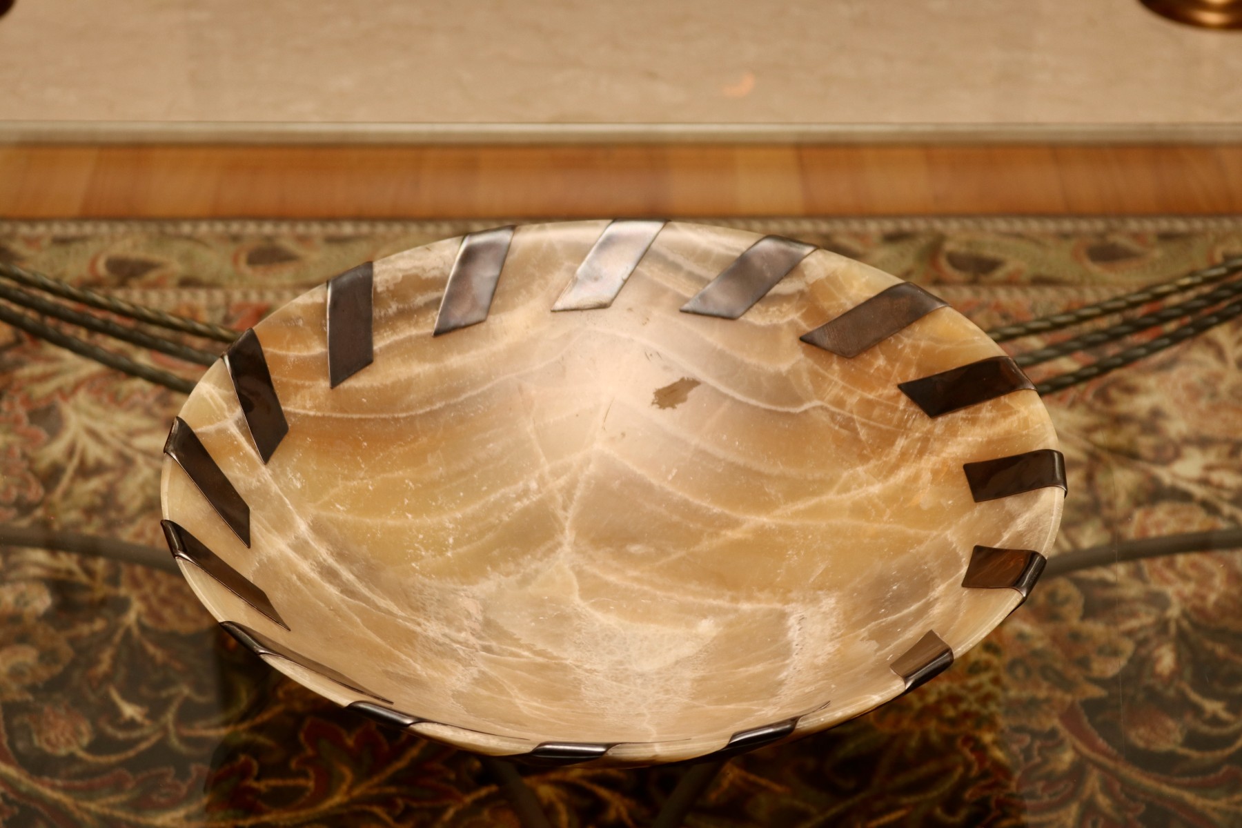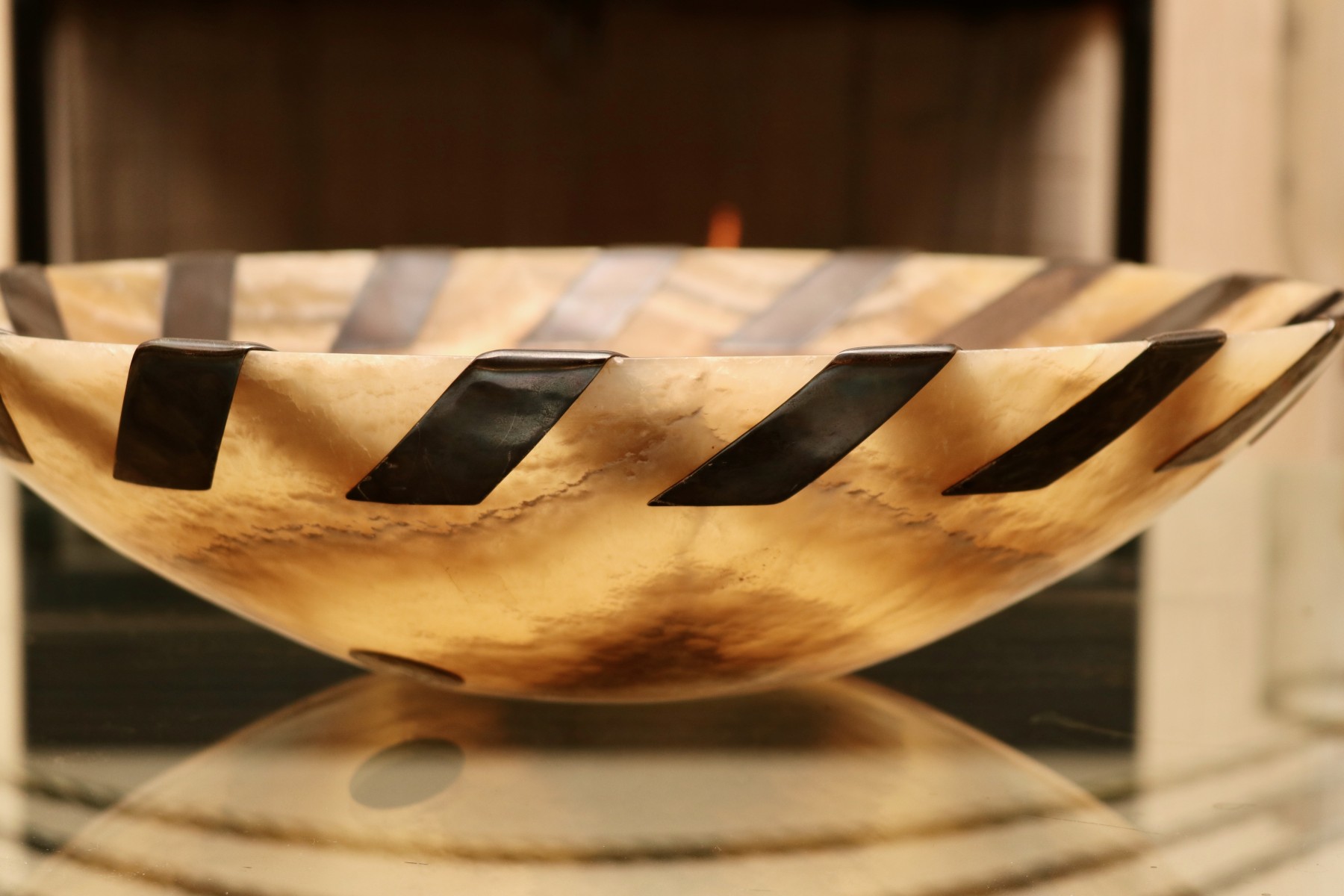 A sophisticated fusion of organic and contemporary detail, this wide, shallow bowl from John-Richard is carved from alabaster, showcasing rich veining and a warm, translucent glow. Around the rim, hand-inlaid antiqued silver-tone metal whipstitch accents add a bold, sculptural rhythm that enhances the natural stone’s softness. Designed by J. Hurley (Model BL 476-10).