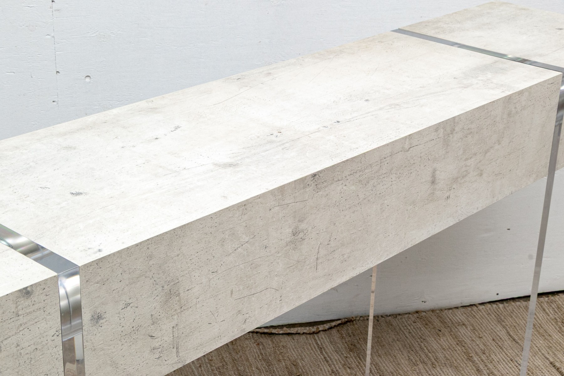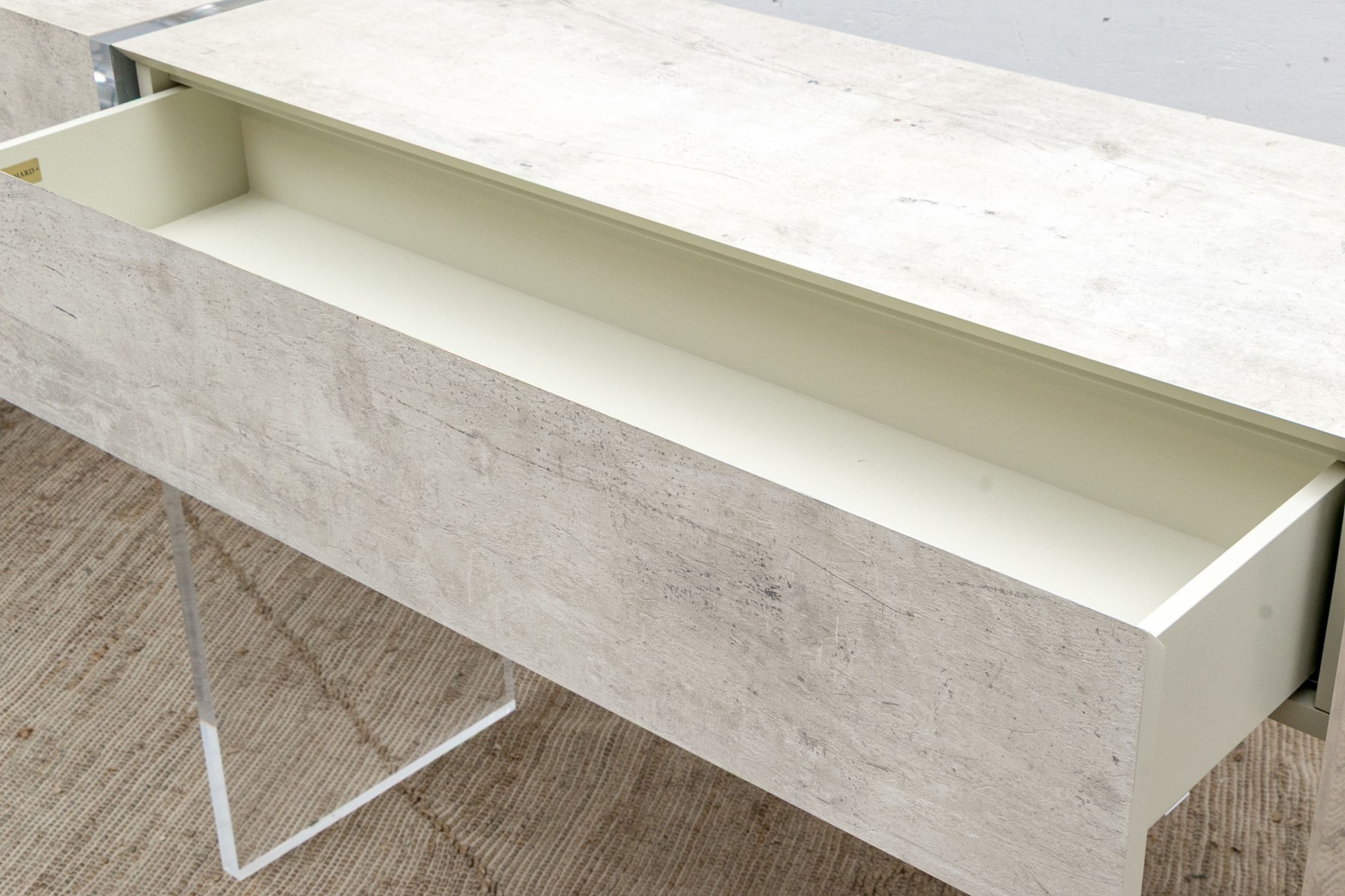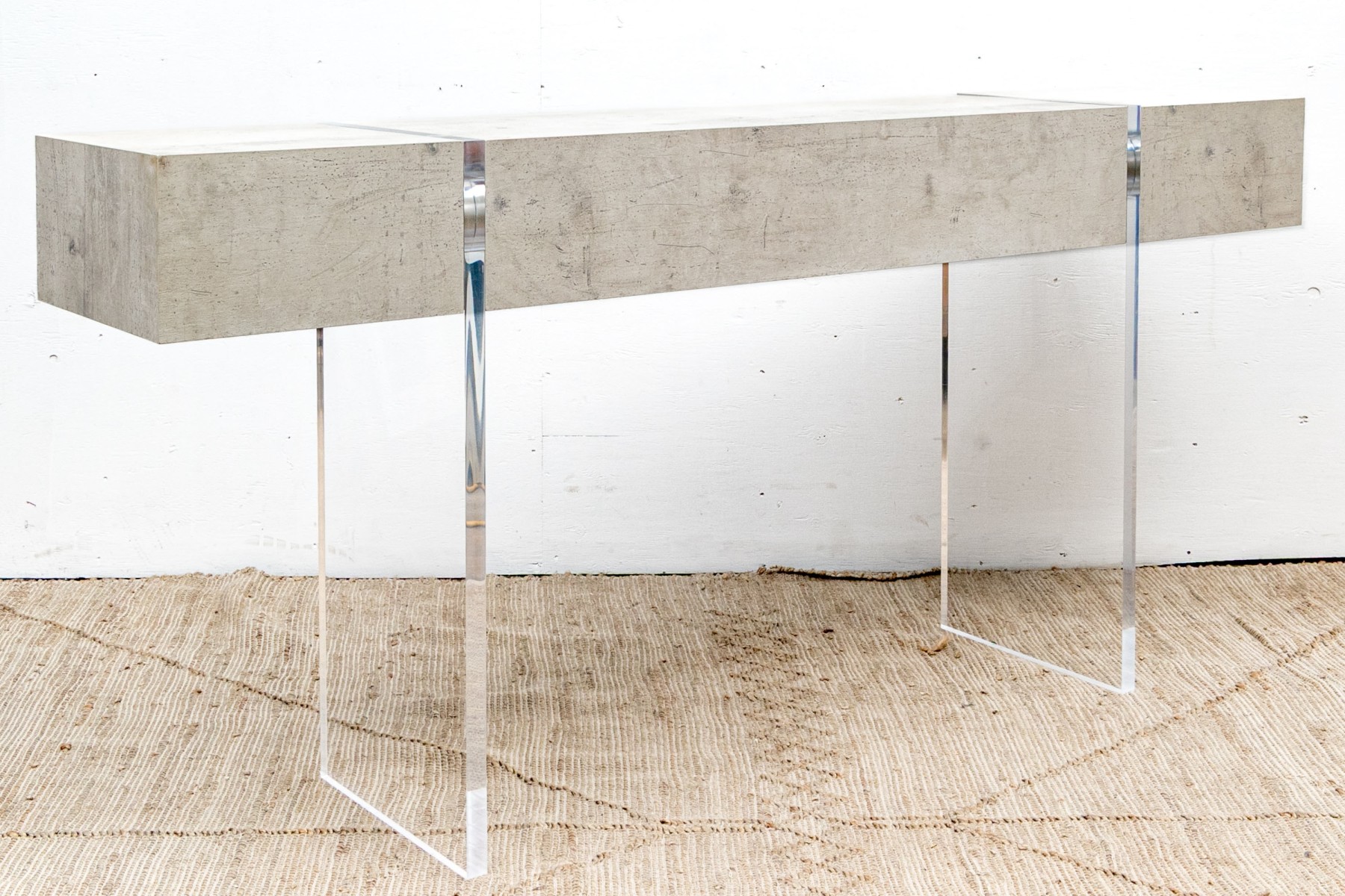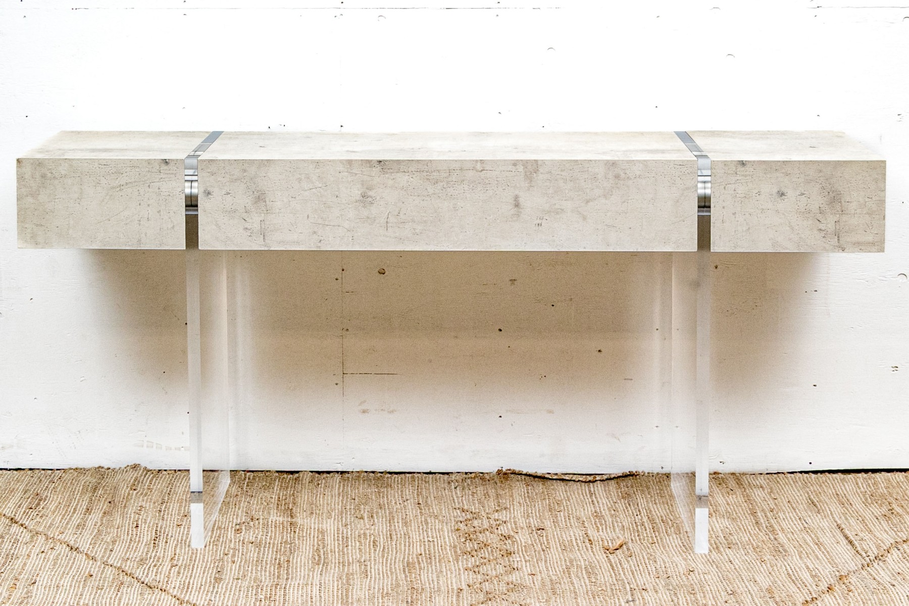 The console stands on two lucite supports with a wonderfully finished faux stone table top which extends beyond the lucite supports. The console has a single drawer with fantastic soft close mechanism.