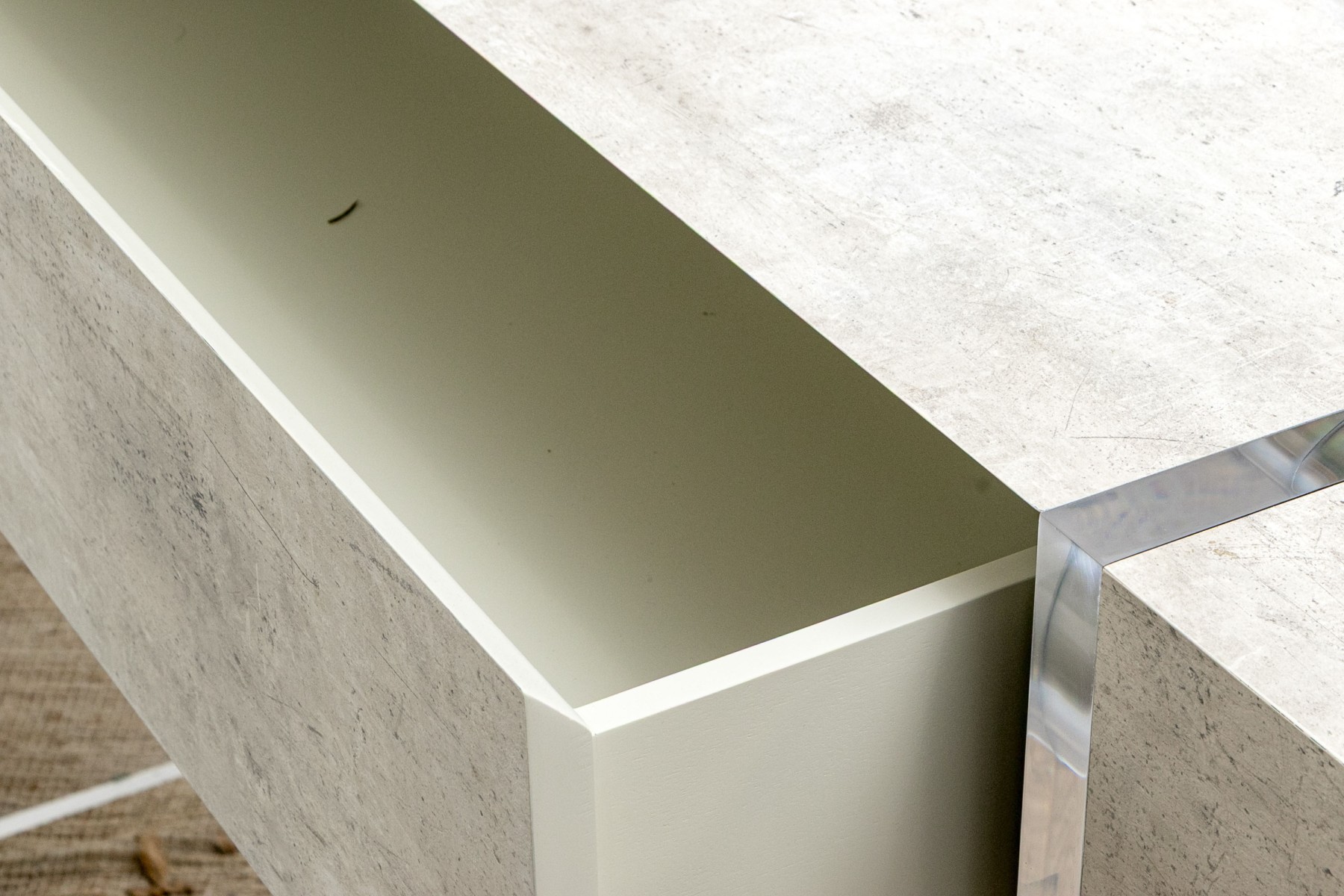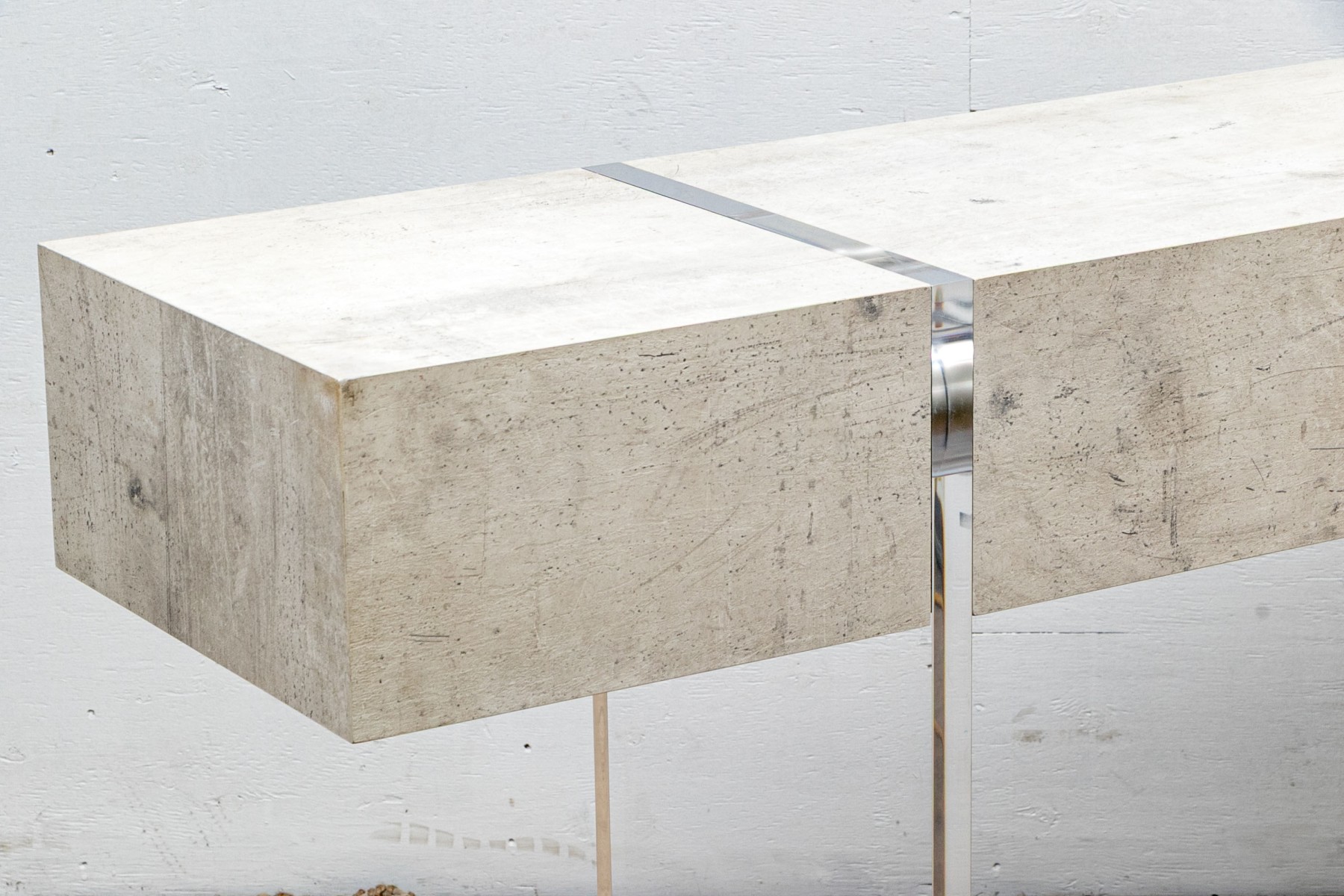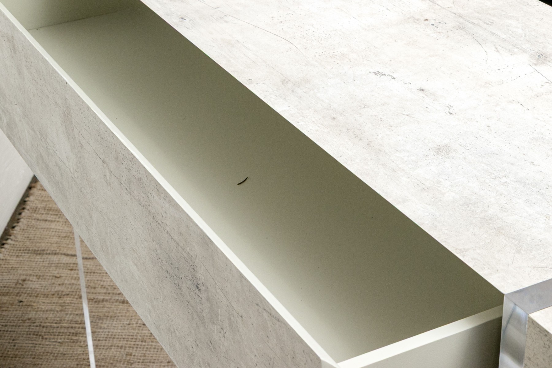 The console stands on two lucite supports with a wonderfully finished faux stone table top which extends beyond the lucite supports. The console has a single drawer with fantastic soft close mechanism.