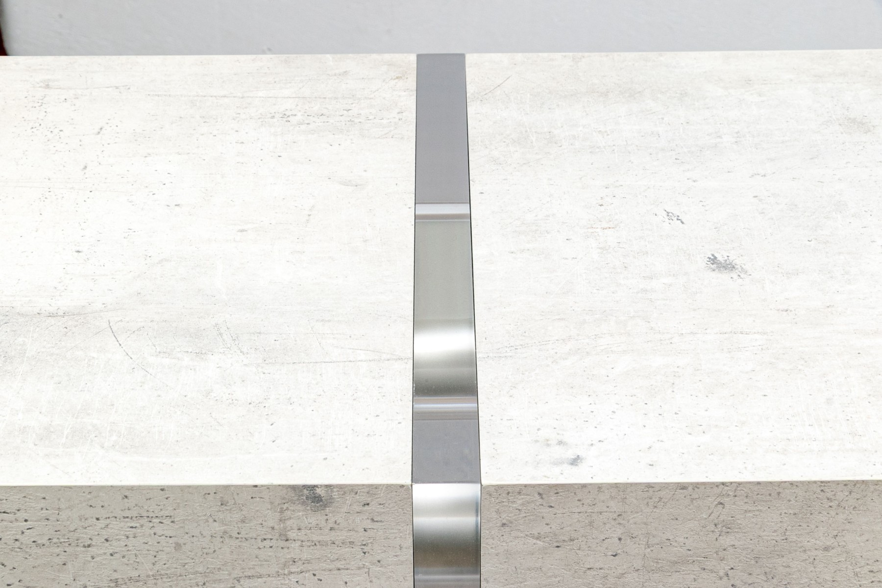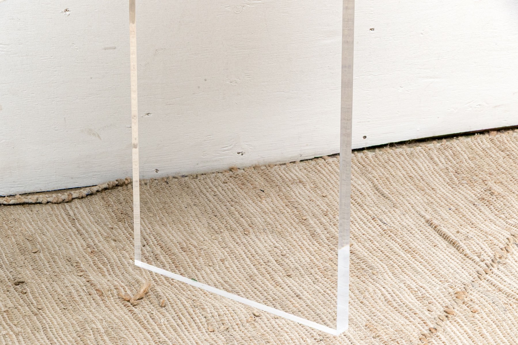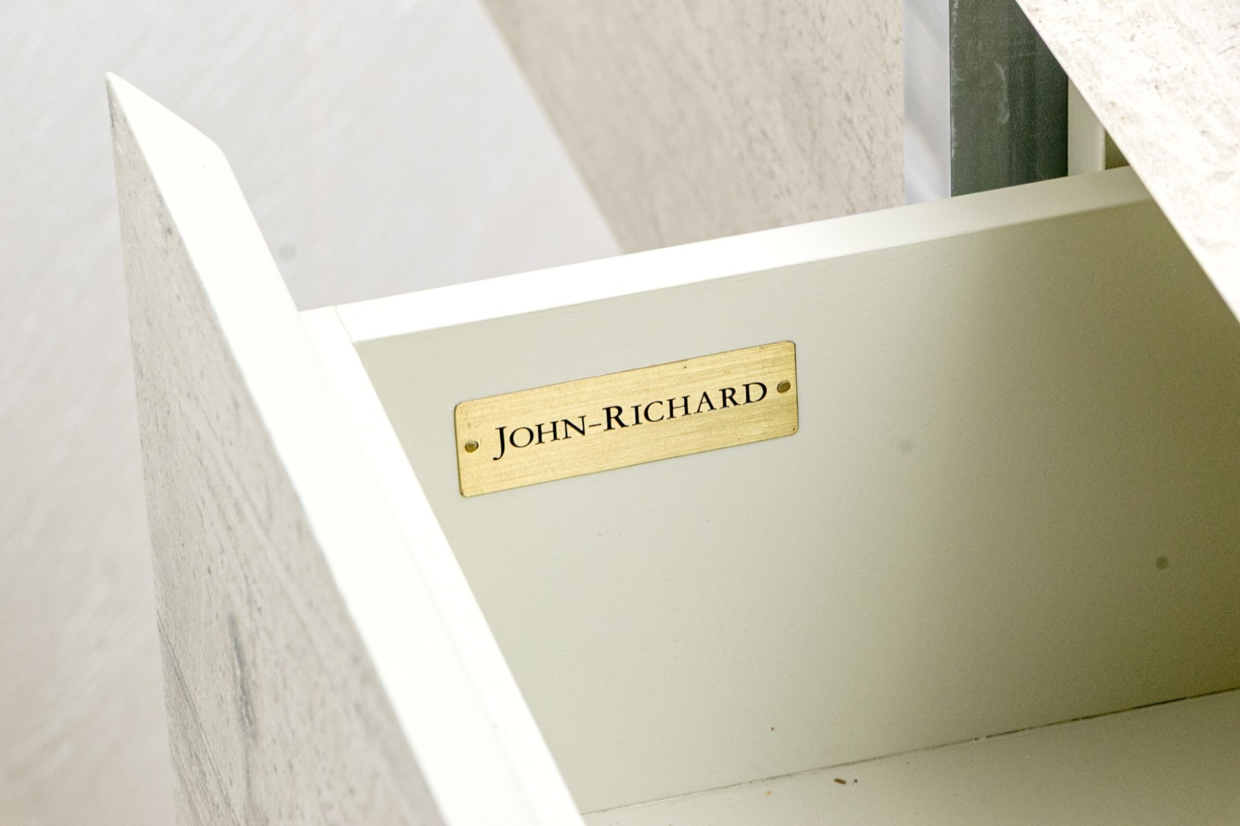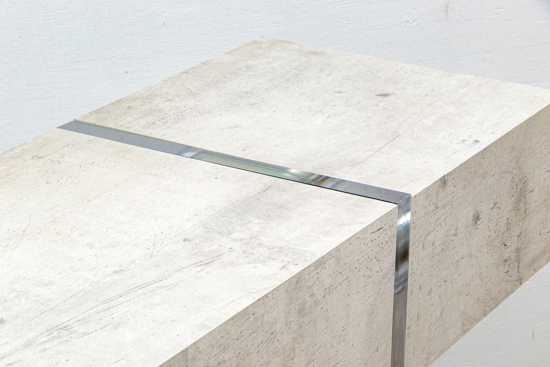 The console stands on two lucite supports with a wonderfully finished faux stone table top which extends beyond the lucite supports. The console has a single drawer with fantastic soft close mechanism.