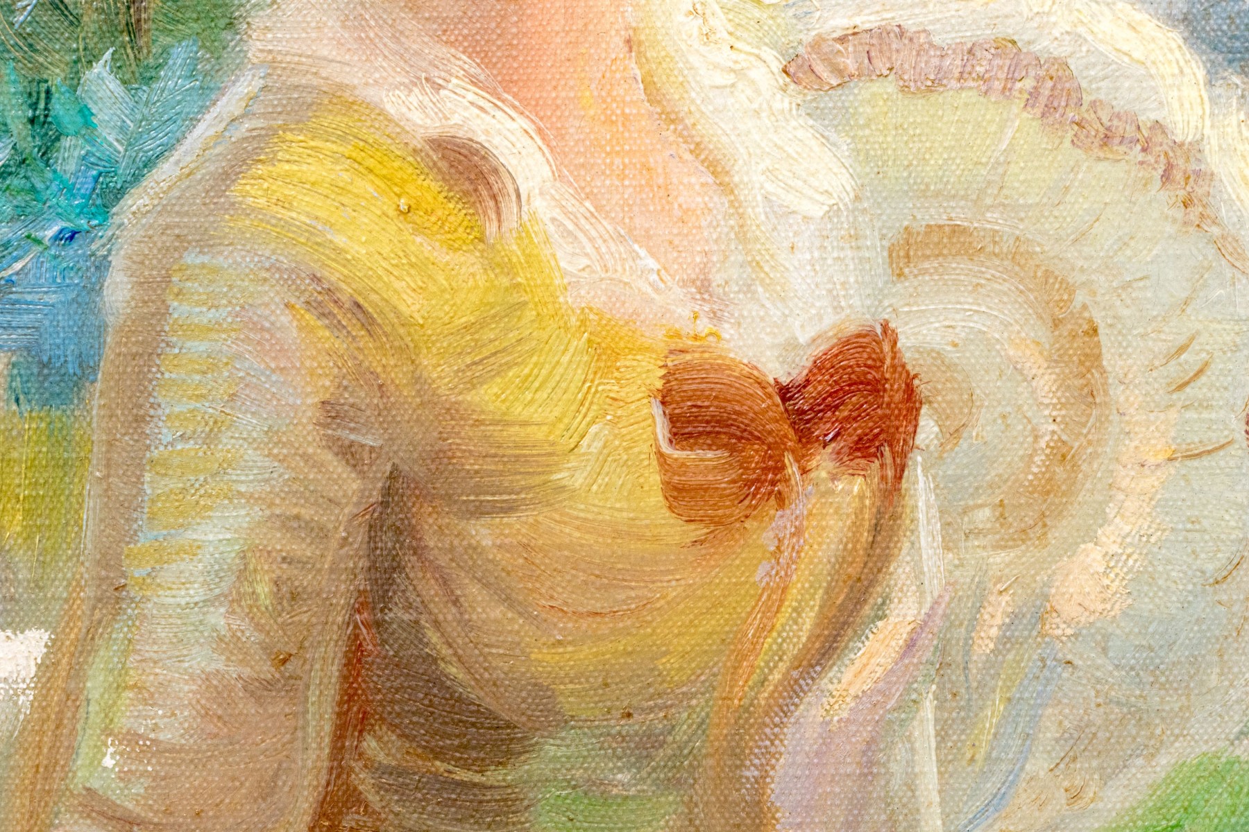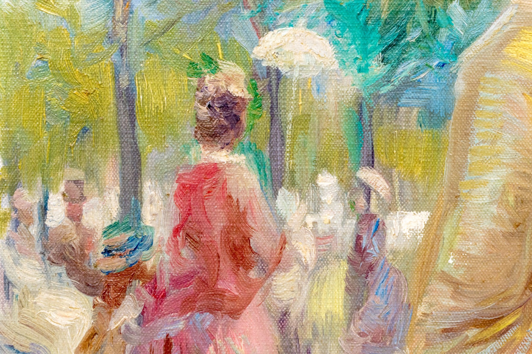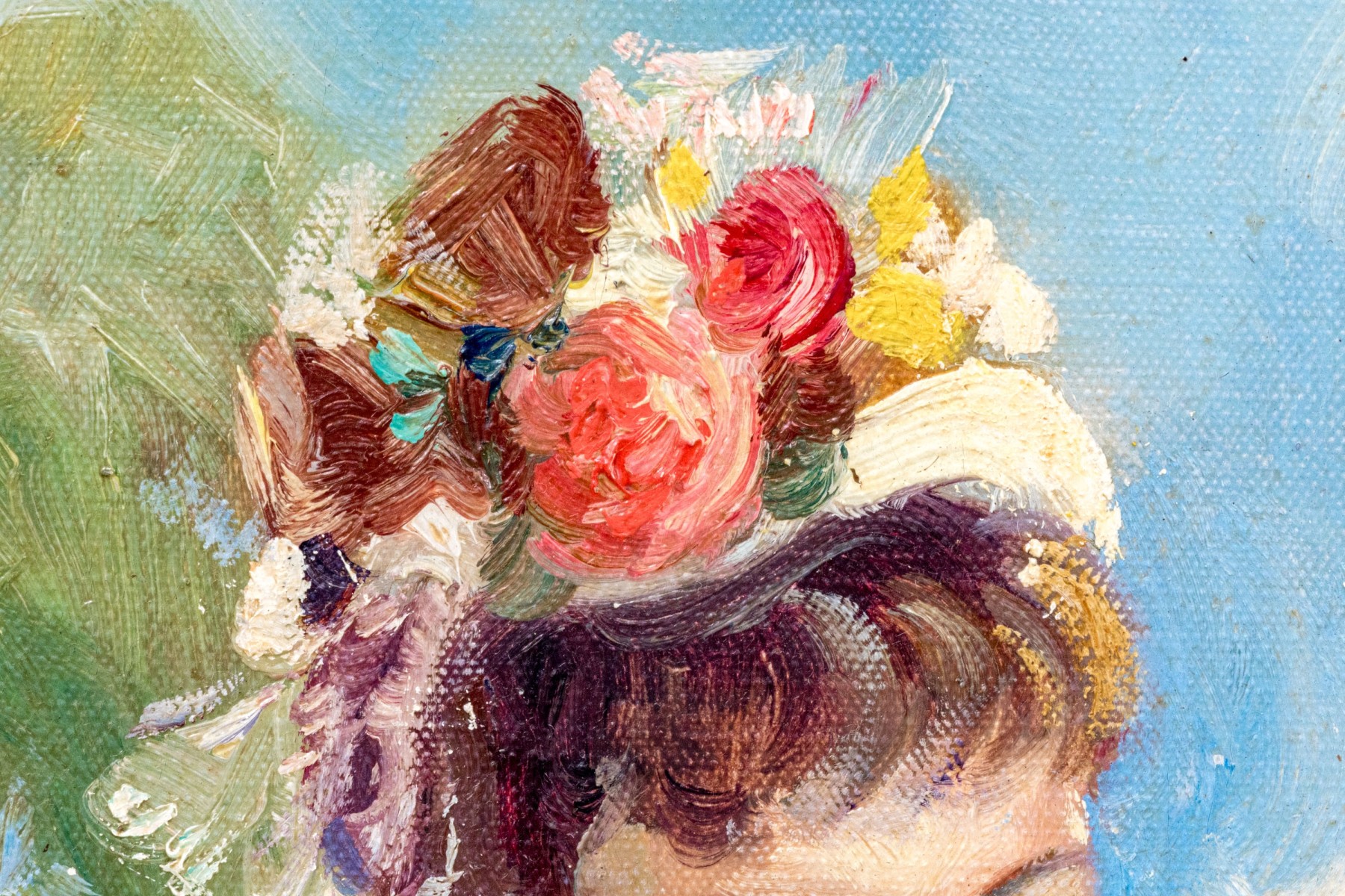 Displayed with a canvas liner and while fillet in an elegant parcel gilt frame with carved foliate vines.