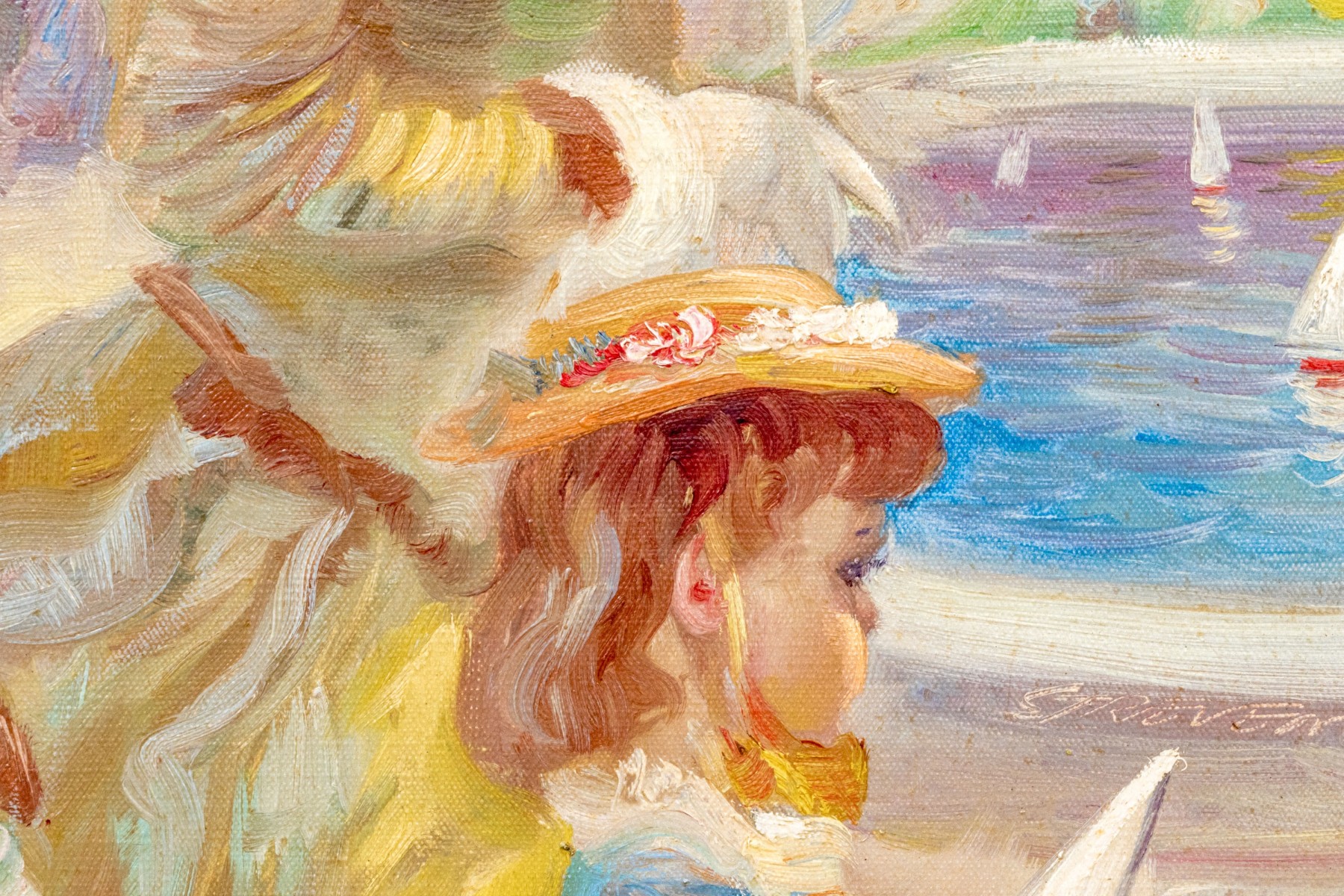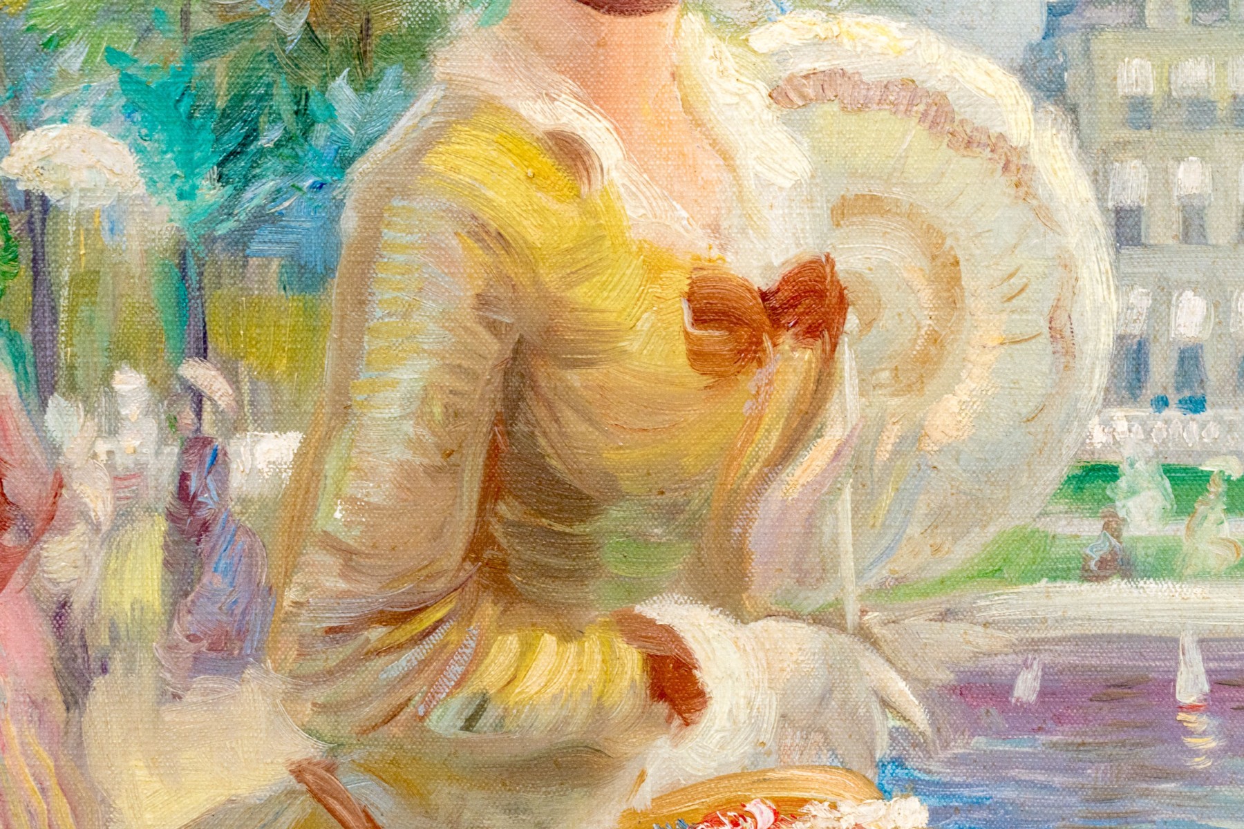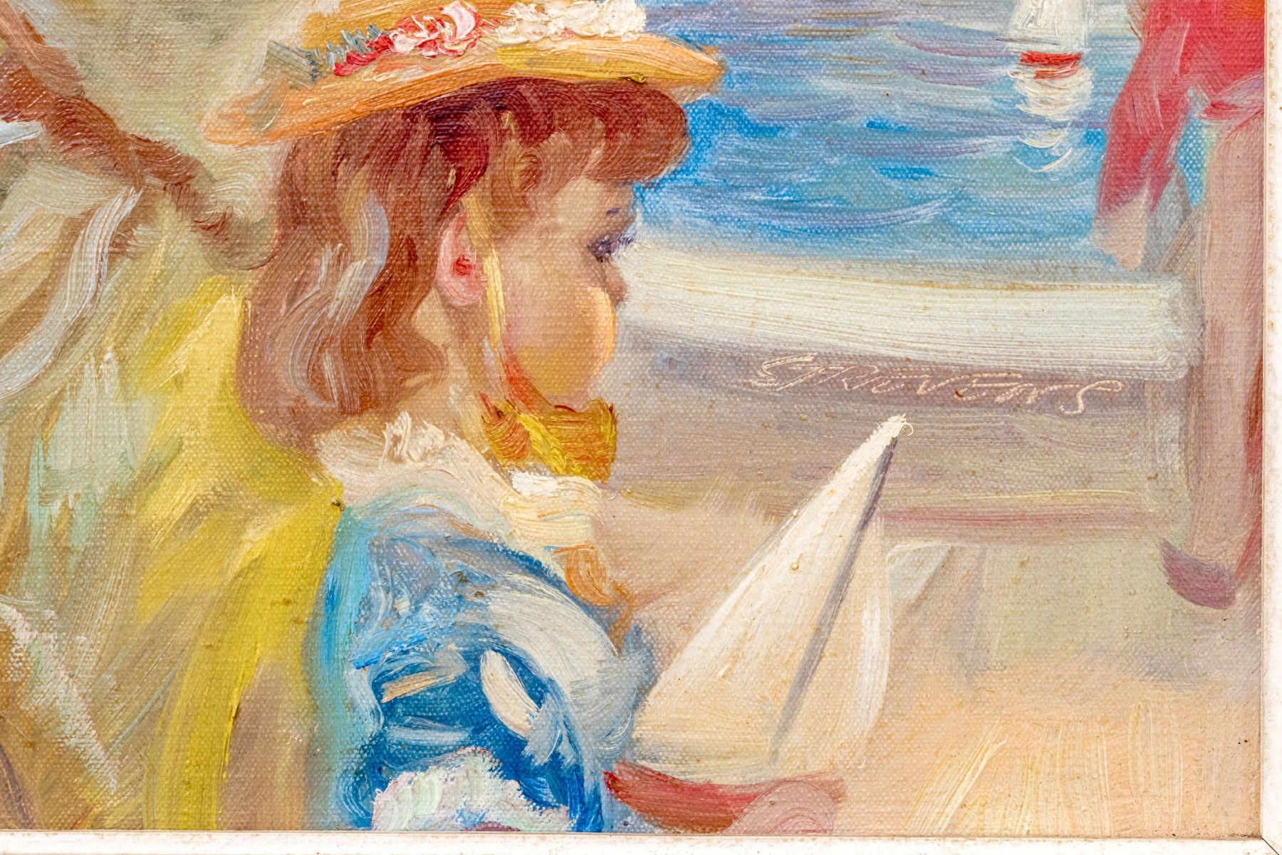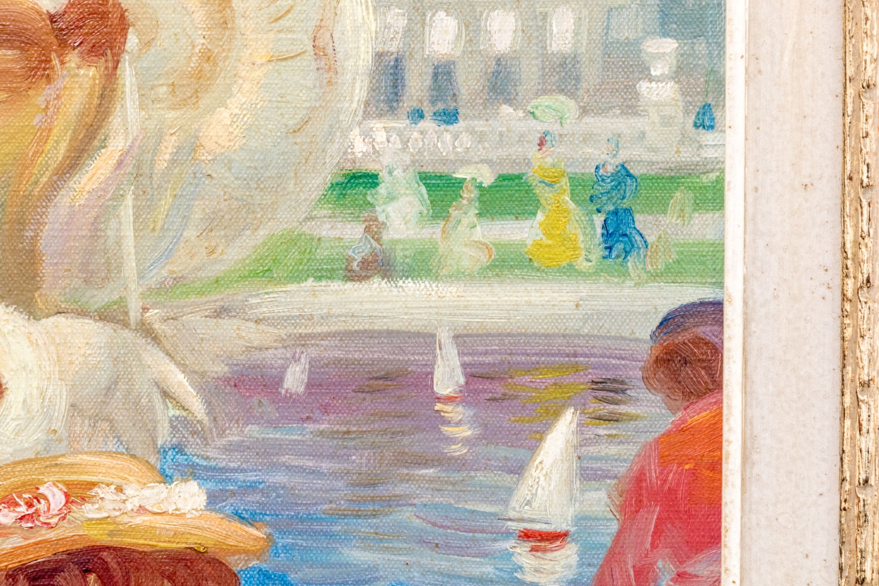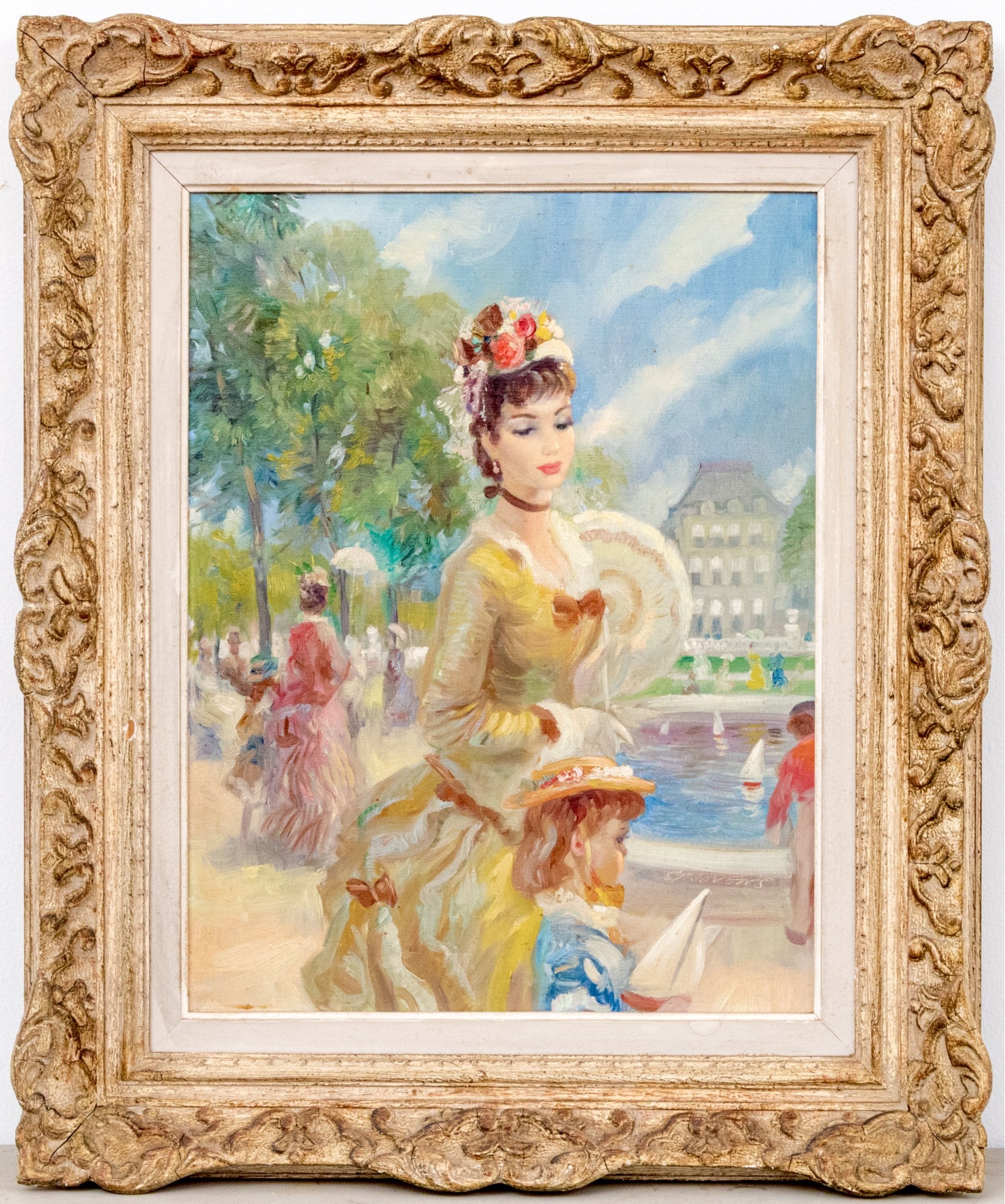 John Strevens (British, 1902-1990) oil painting on canvas depicting a woman with young girl at a park with water with toy sailboats. Signed lower right and signed and dated on verso.