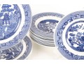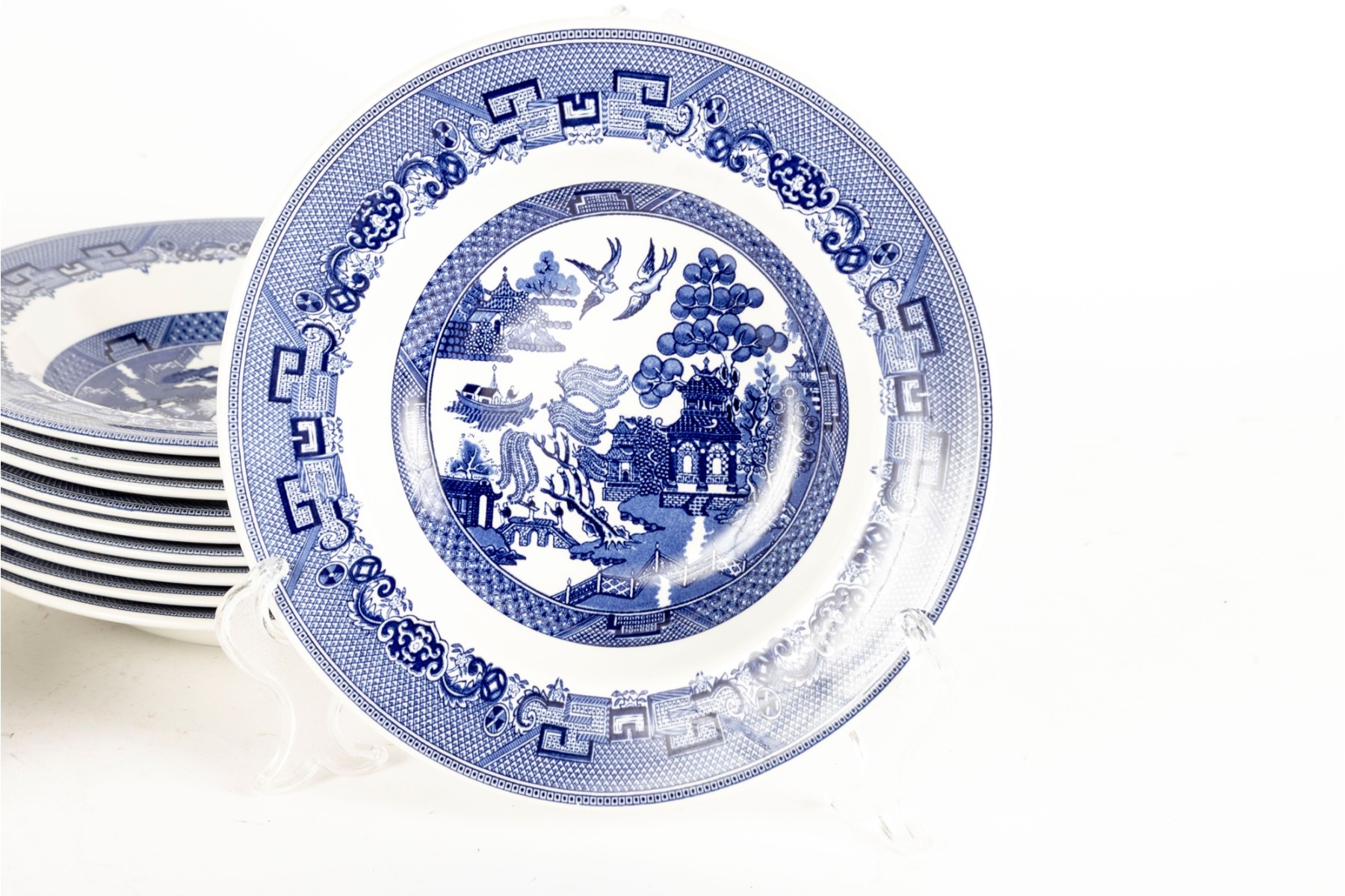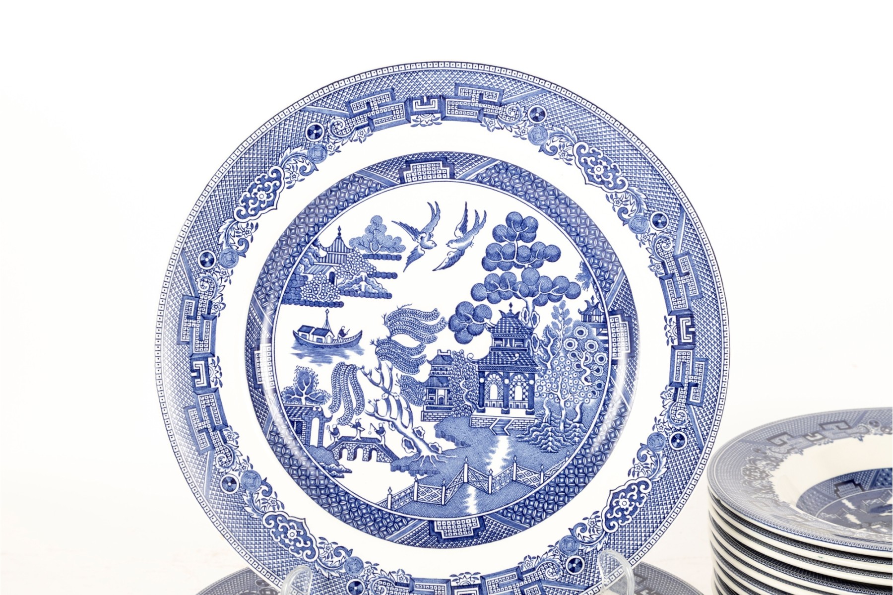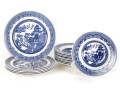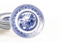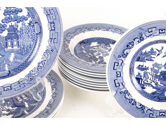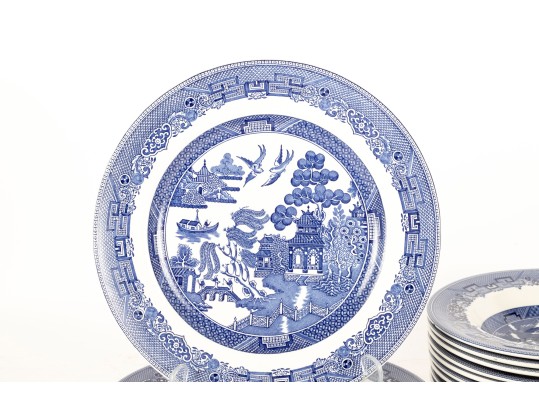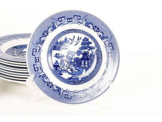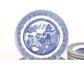 A collection of Johnson Brothers oriental willow-ware plates crafted from fine porcelain.