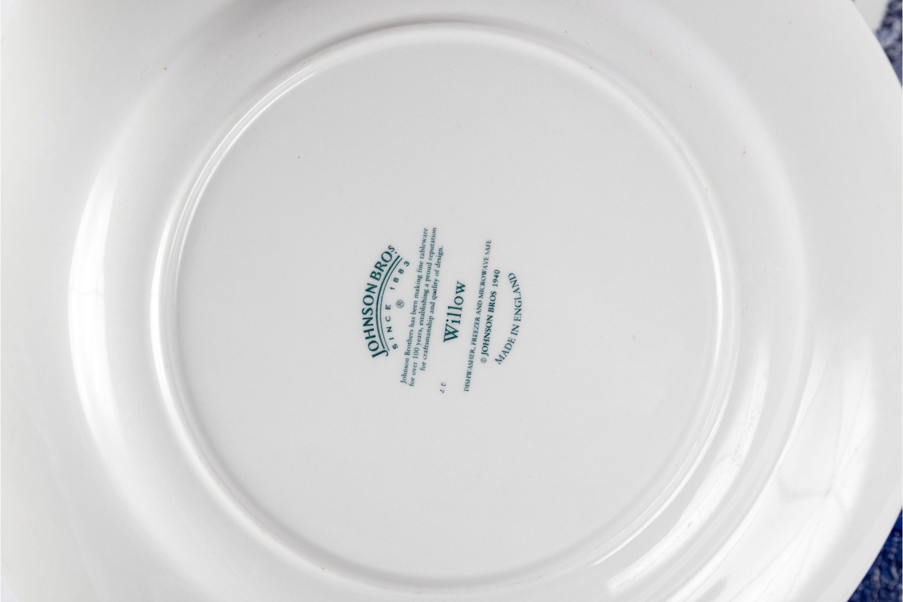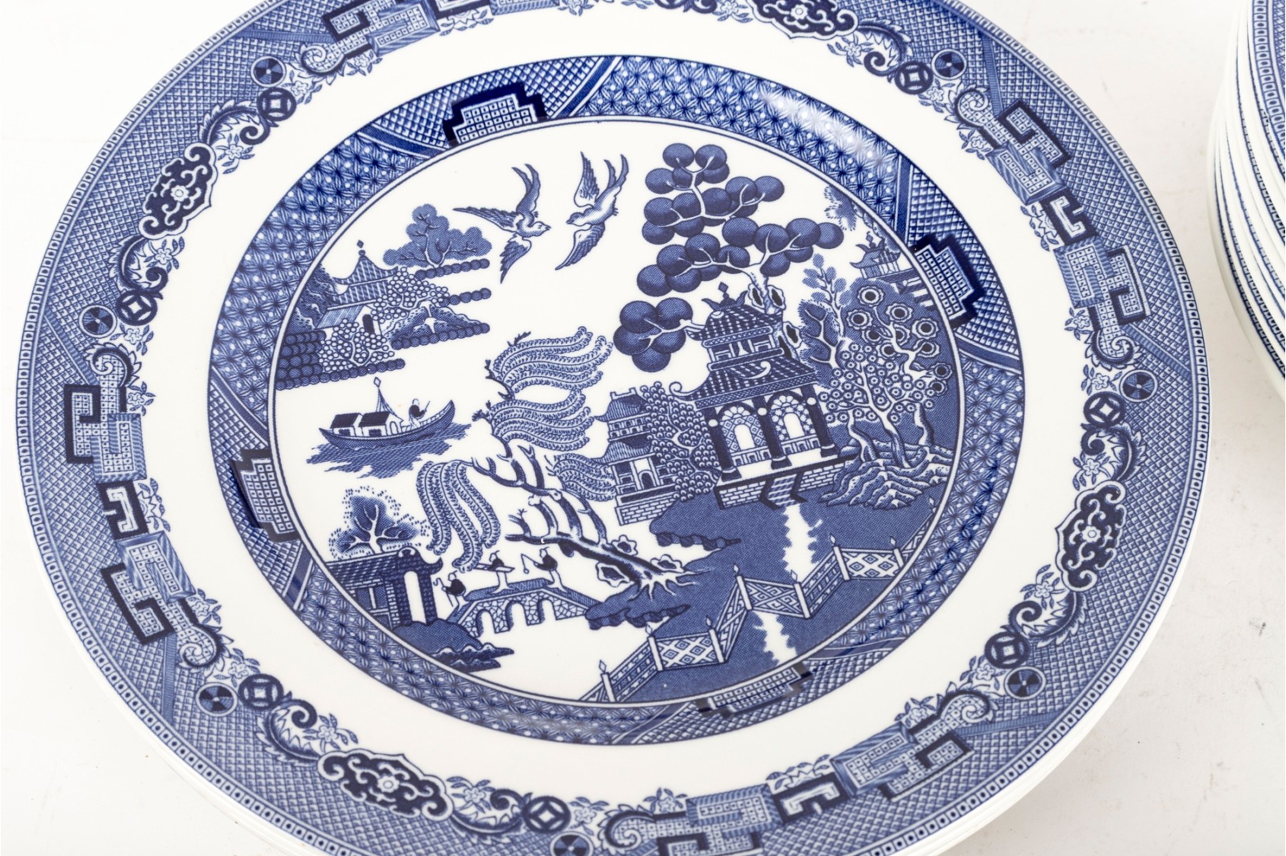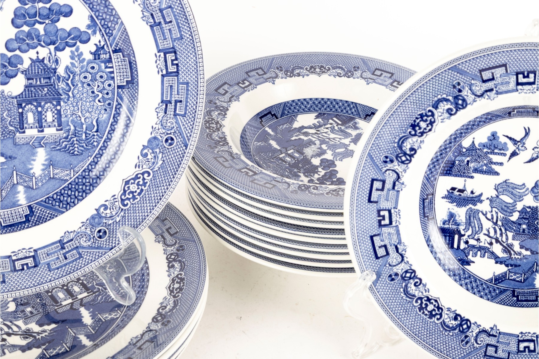 A collection of Johnson Brothers oriental willow-ware plates crafted from fine porcelain.