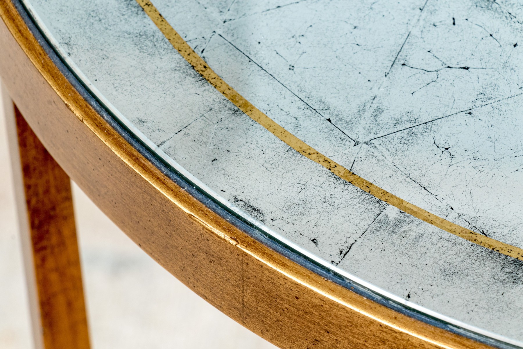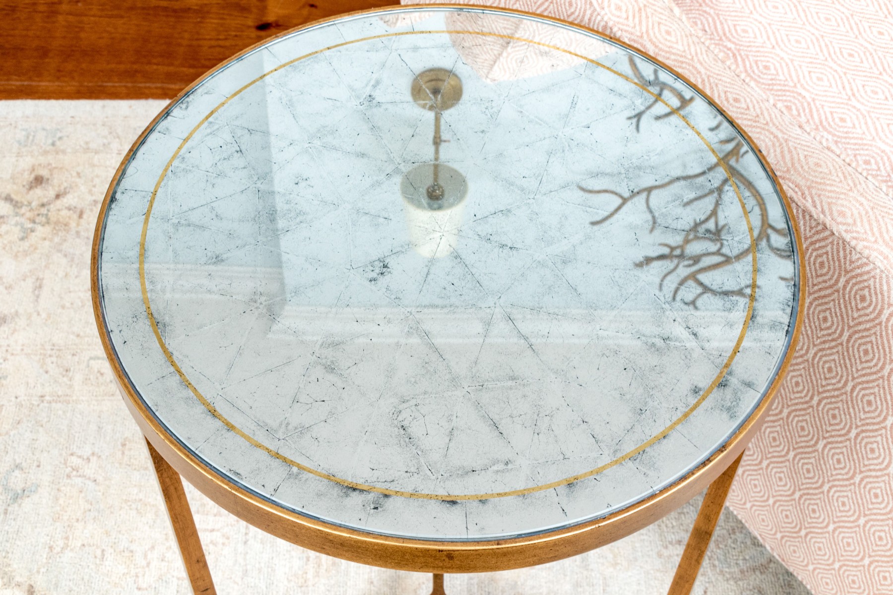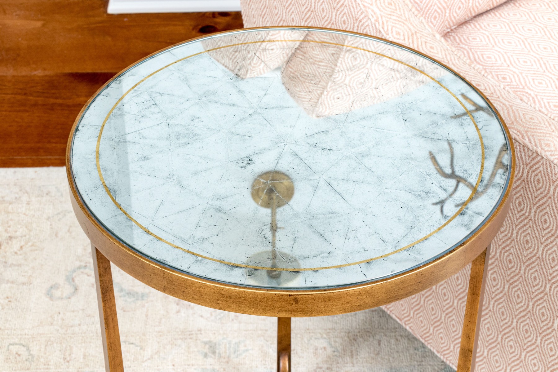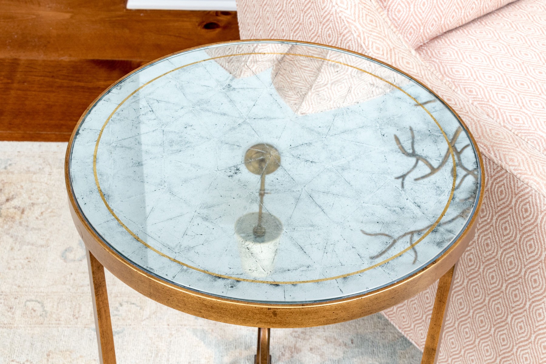A gorgeous Jonathan Charles "494042-G" gueridon table featuring a round eglomise mirror top with a decorative triangular lattice pattern to the silver leafing. Raised on a tripod of antiqued gilded metal legs around a Y-stretcher. Beautifully and simply detailed throughout for a marvelous accent table with an elegant design made versatile for a variety of aesthetics.