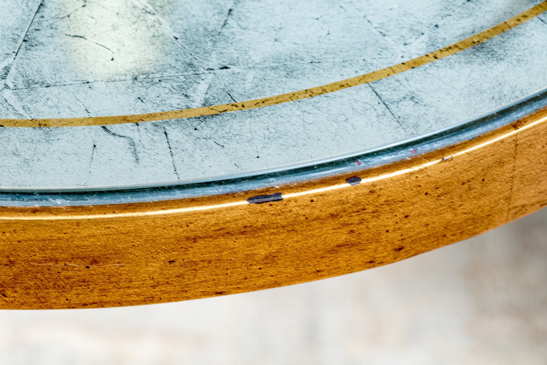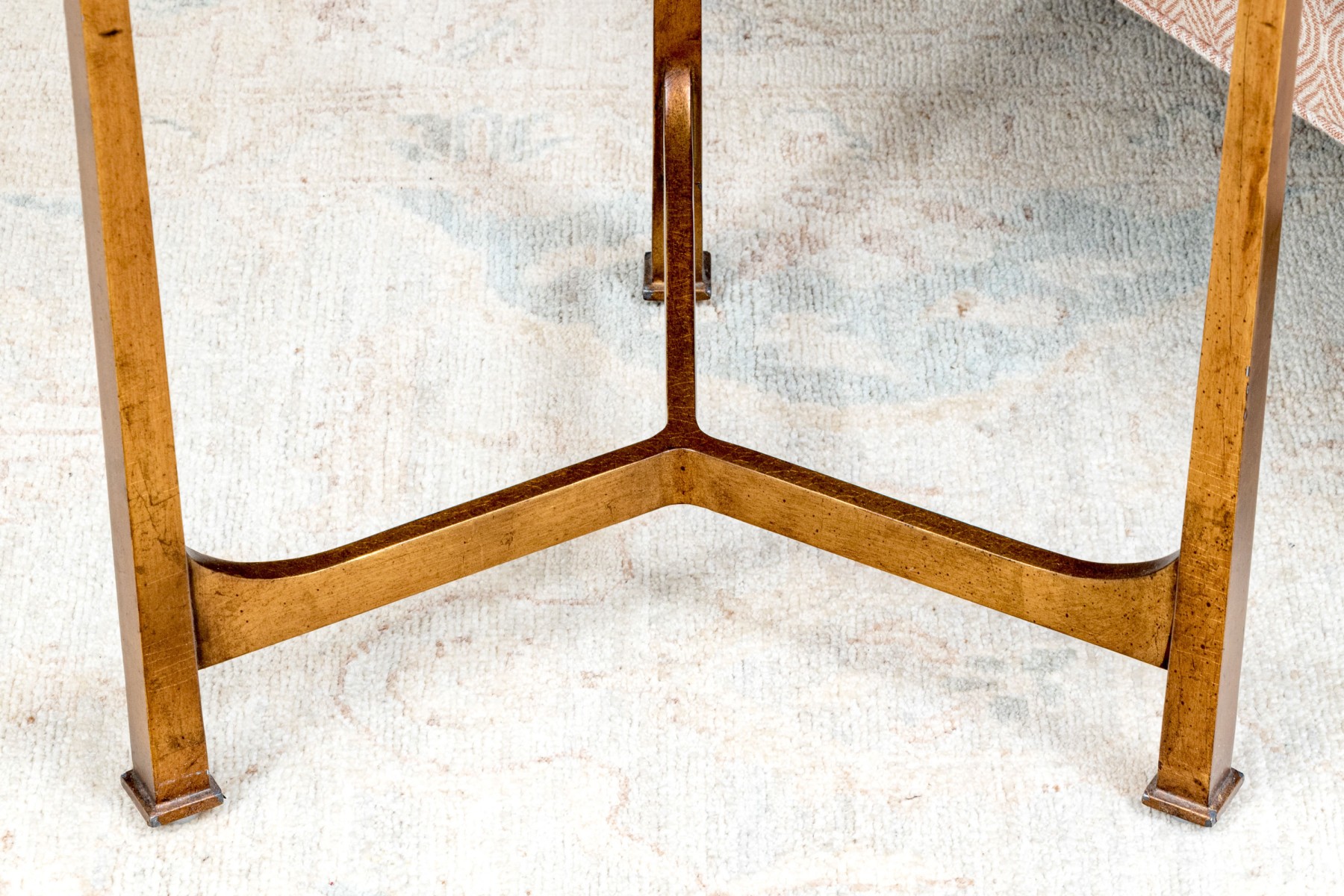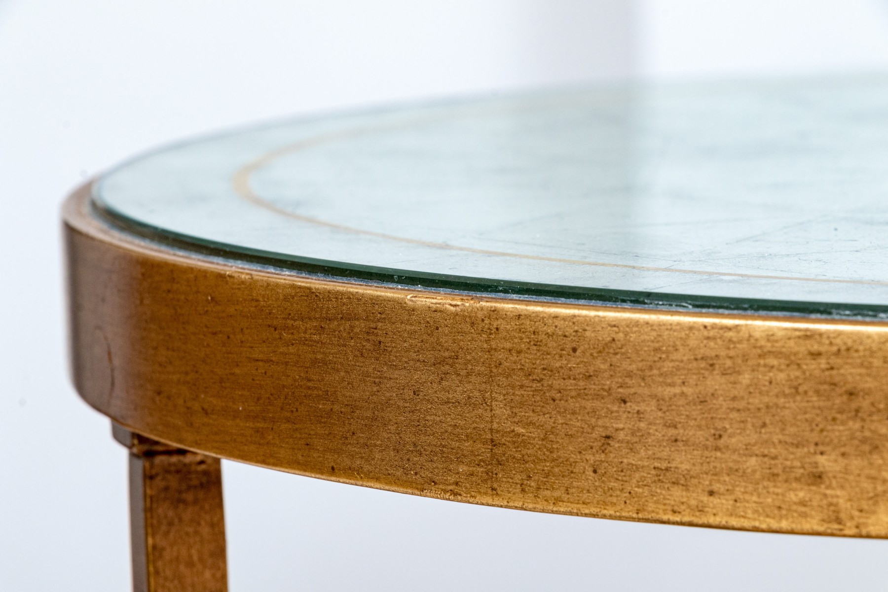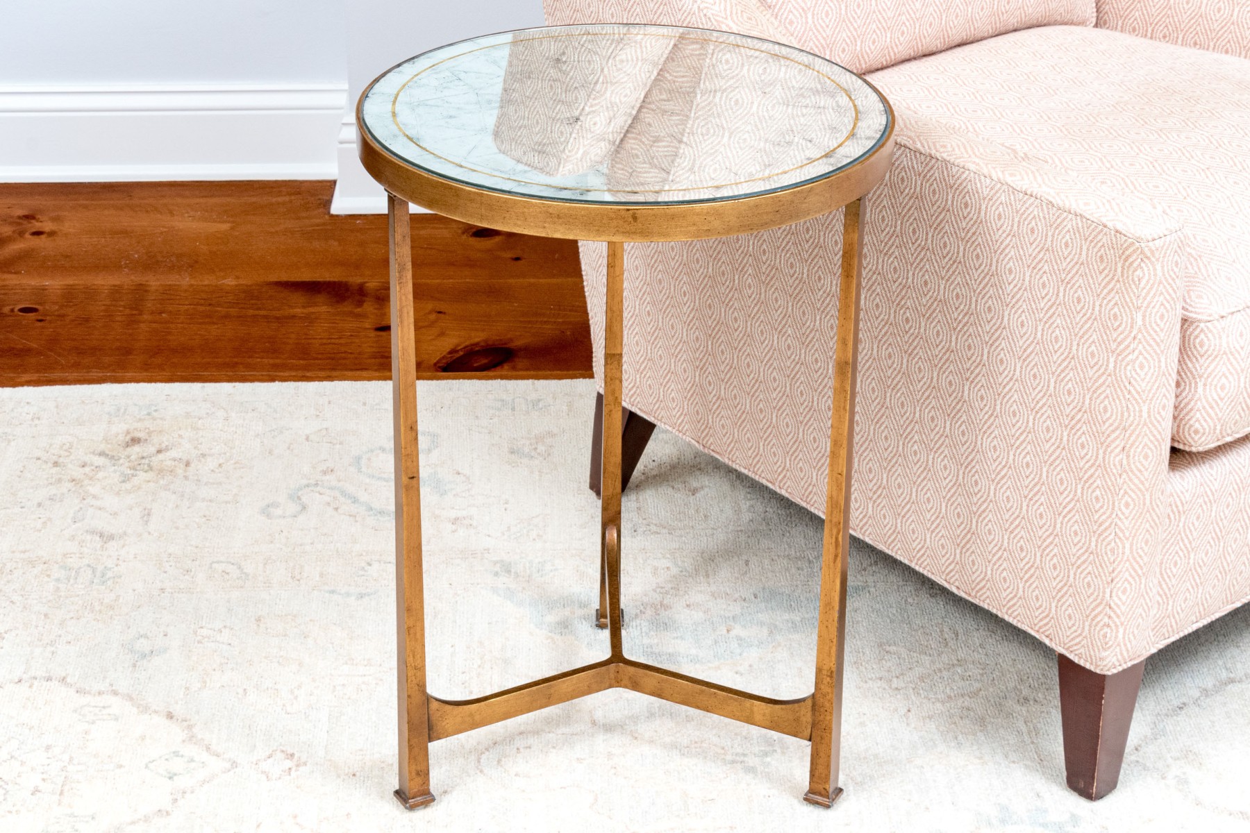 A gorgeous Jonathan Charles "494042-G" gueridon table featuring a round eglomise mirror top with a decorative triangular lattice pattern to the silver leafing. Raised on a tripod of antiqued gilded metal legs around a Y-stretcher. Beautifully and simply detailed throughout for a marvelous accent table with an elegant design made versatile for a variety of aesthetics.