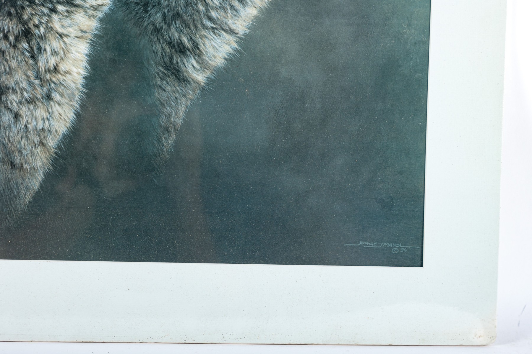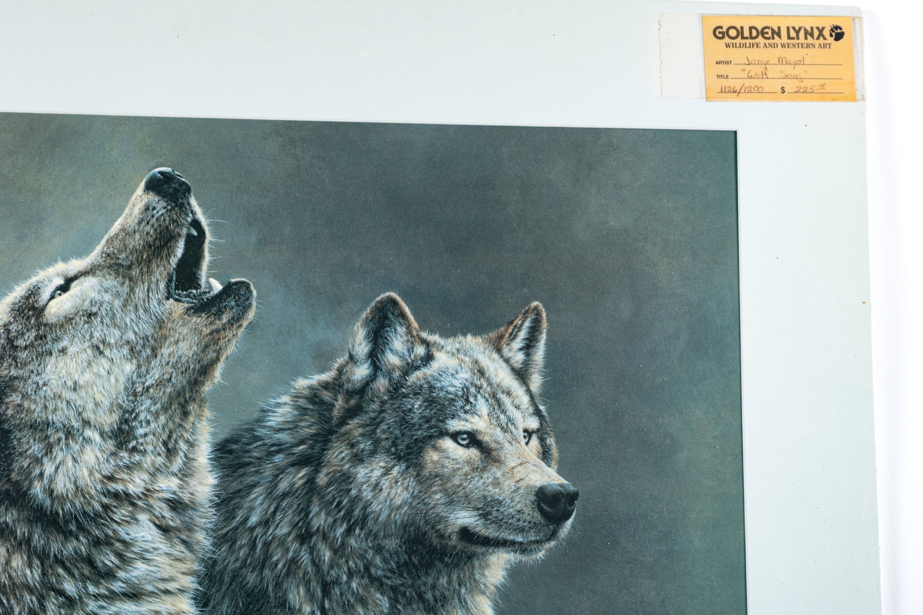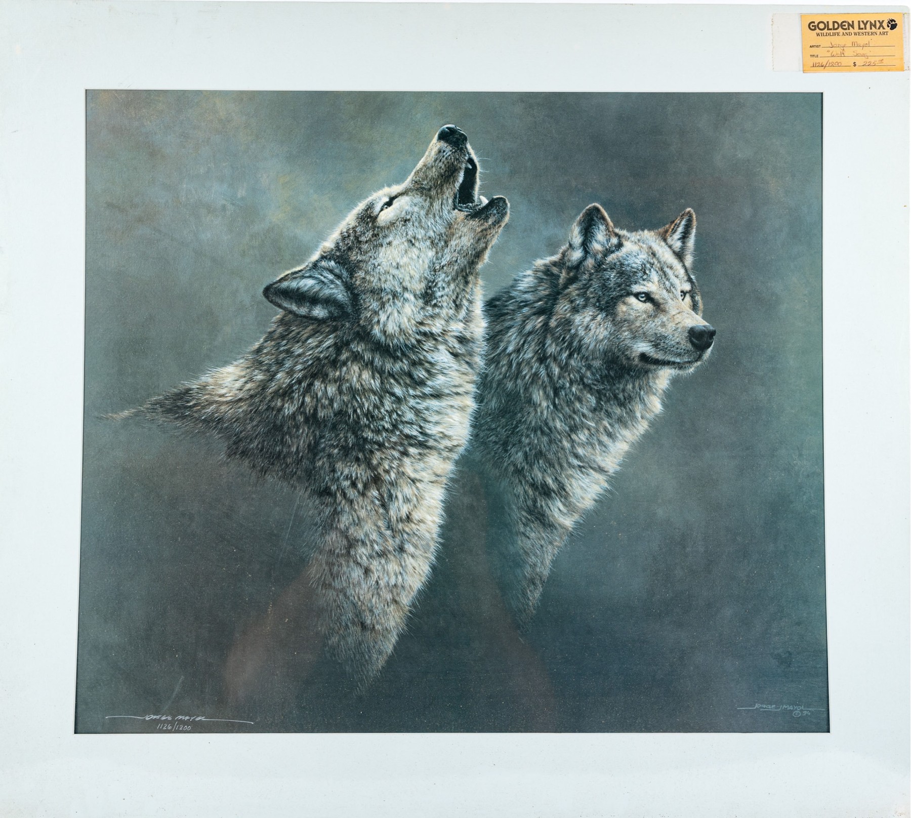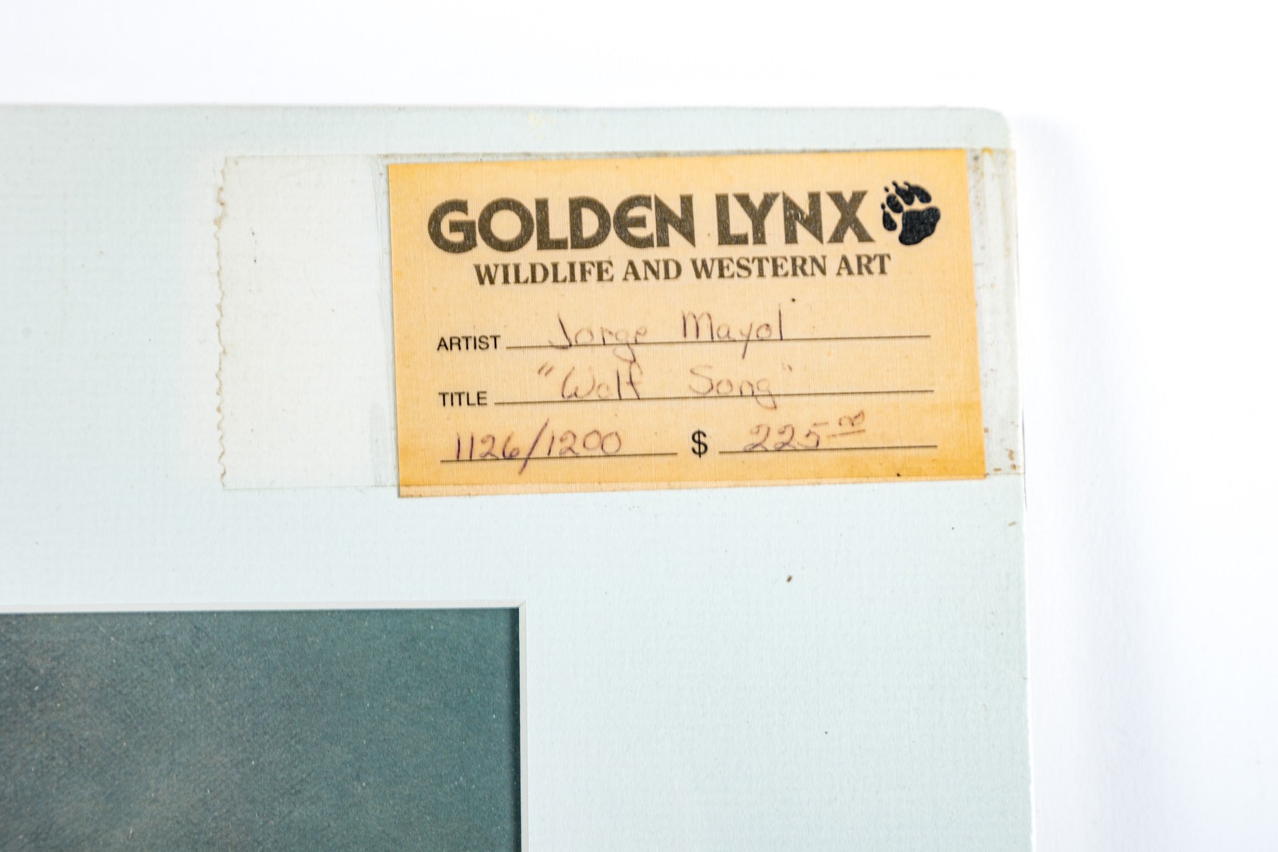 Jorge Mayol ((United States/Argentina, born 1948) "Wolf Song" lithograph depicting two detailed wolves against a moody background. Signed and numbered 1126/1200 lower center. Unframed, with a light blue mat, contained within a protective plastic film.