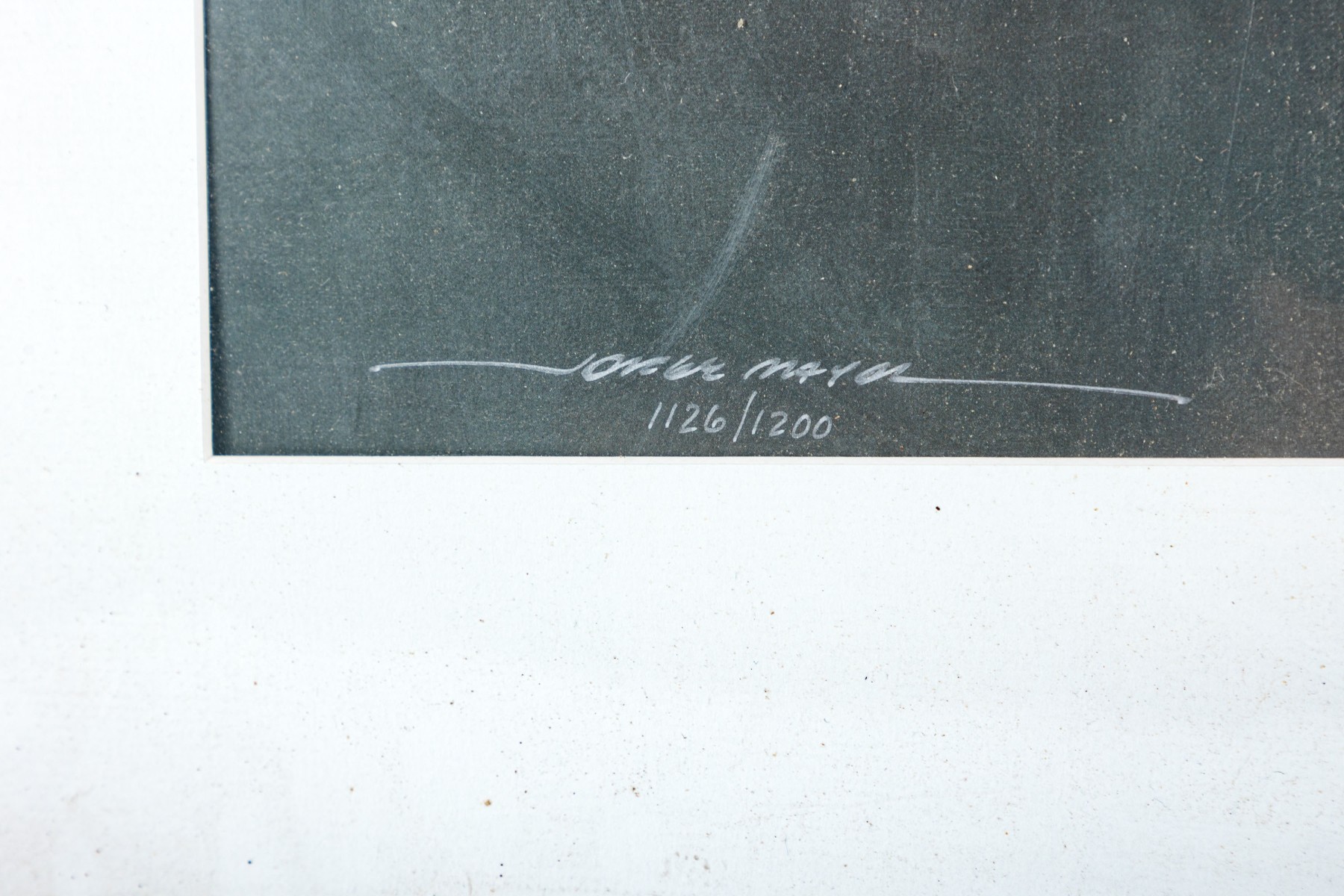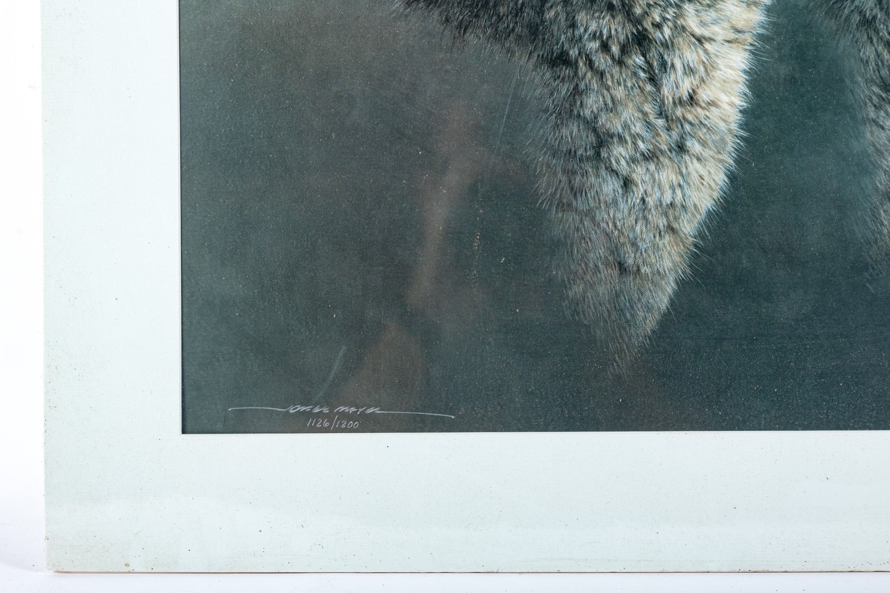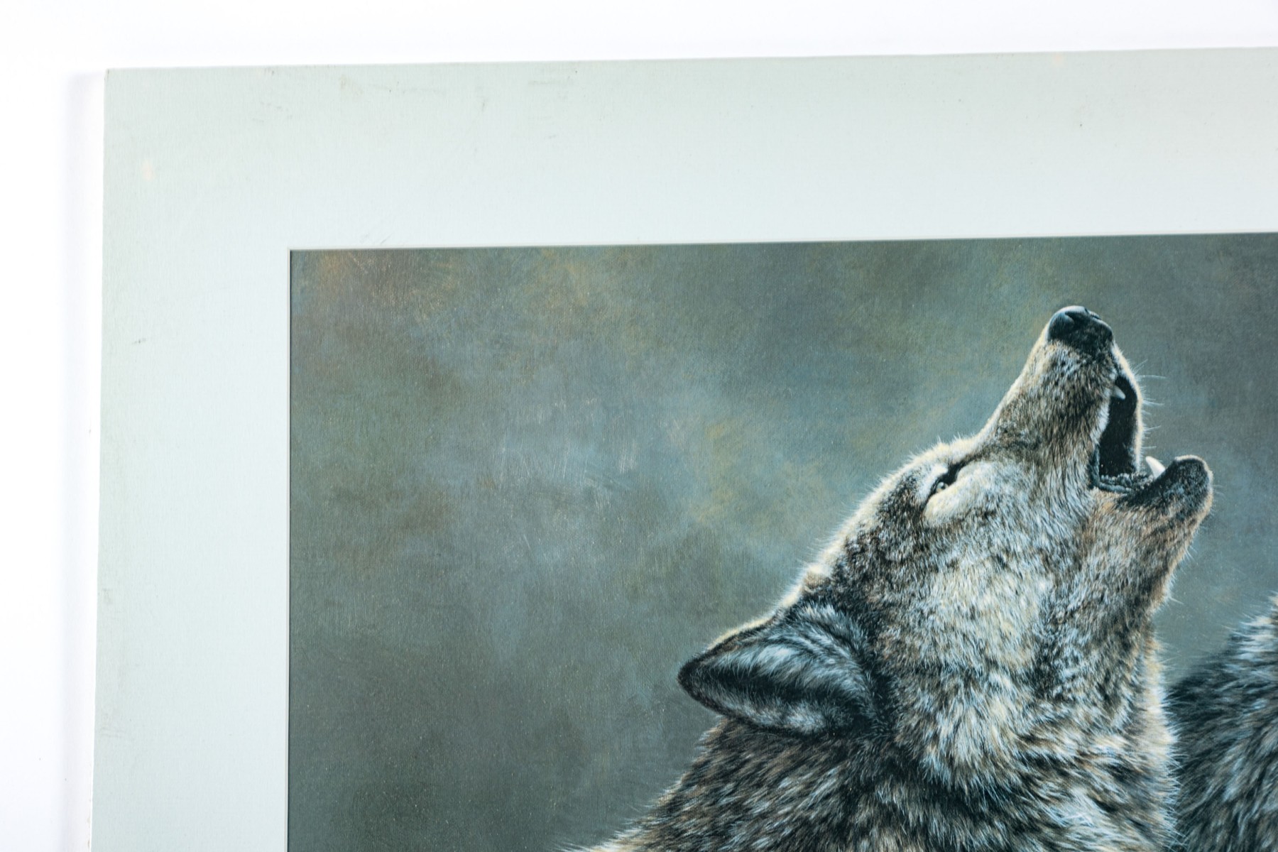 Jorge Mayol ((United States/Argentina, born 1948) "Wolf Song" lithograph depicting two detailed wolves against a moody background. Signed and numbered 1126/1200 lower center. Unframed, with a light blue mat, contained within a protective plastic film.