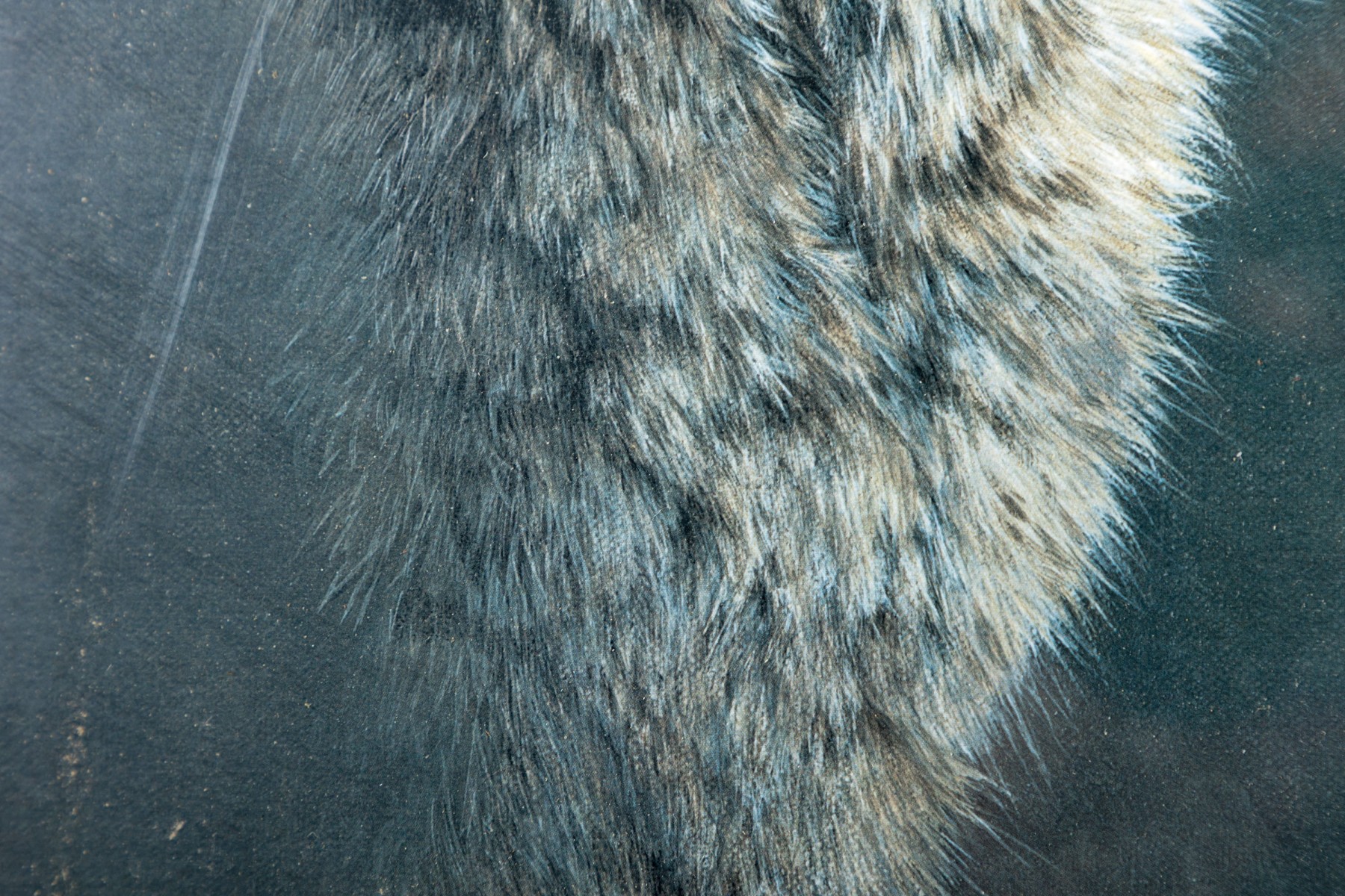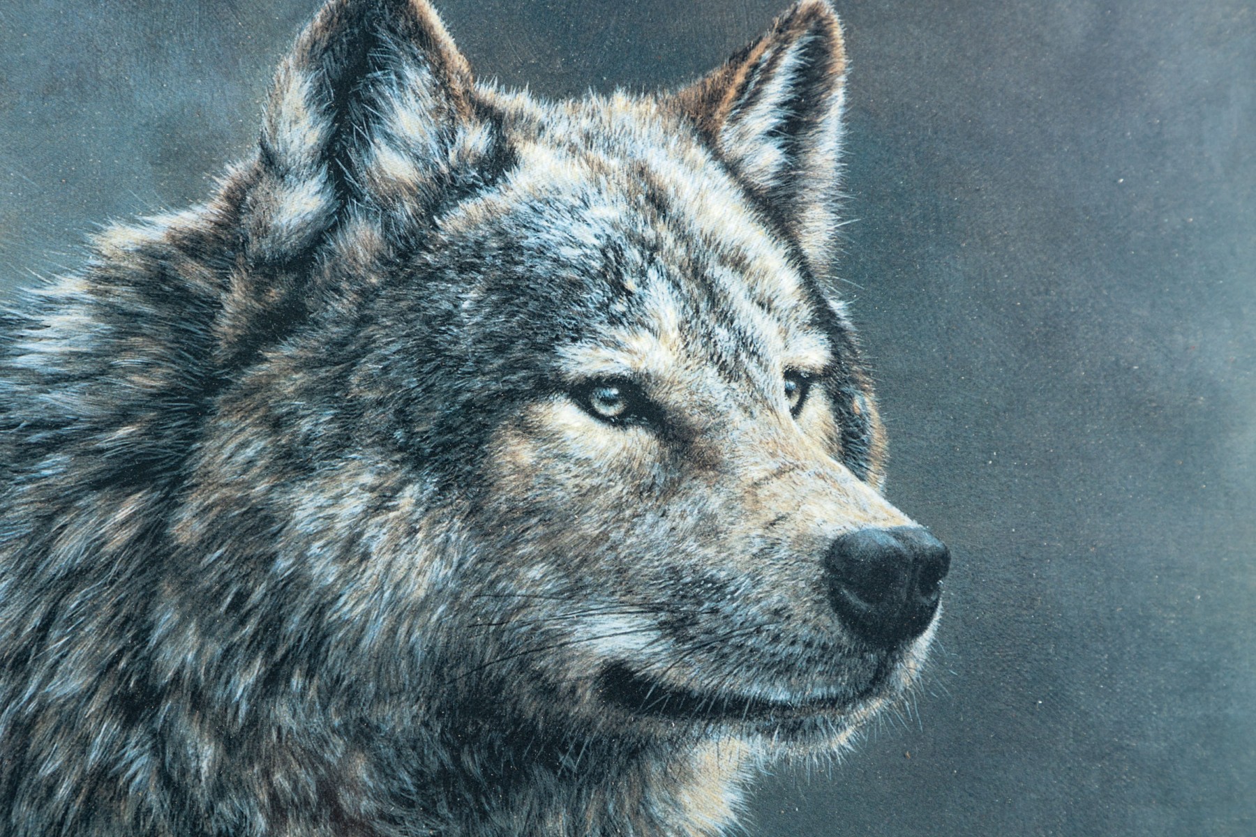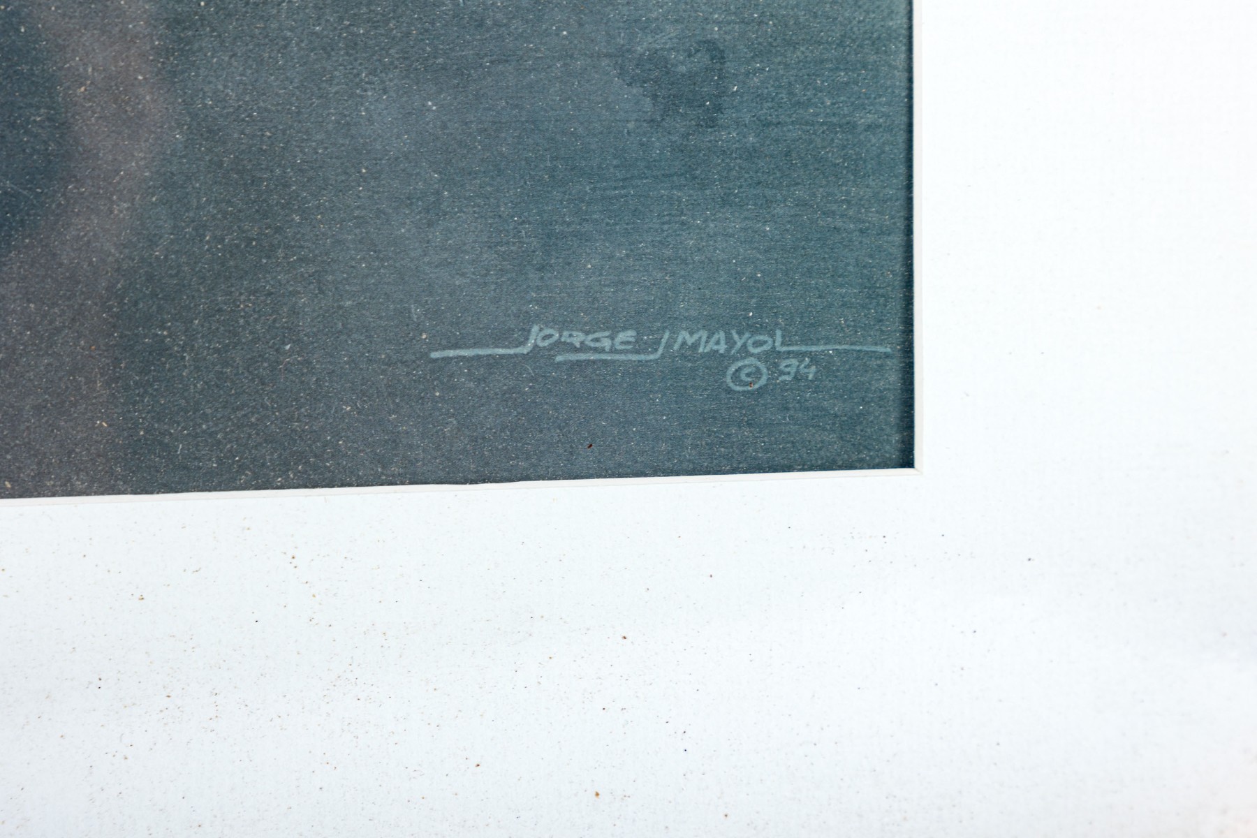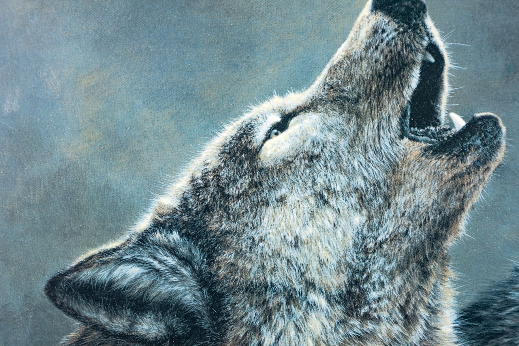 Jorge Mayol ((United States/Argentina, born 1948) "Wolf Song" lithograph depicting two detailed wolves against a moody background. Signed and numbered 1126/1200 lower center. Unframed, with a light blue mat, contained within a protective plastic film.