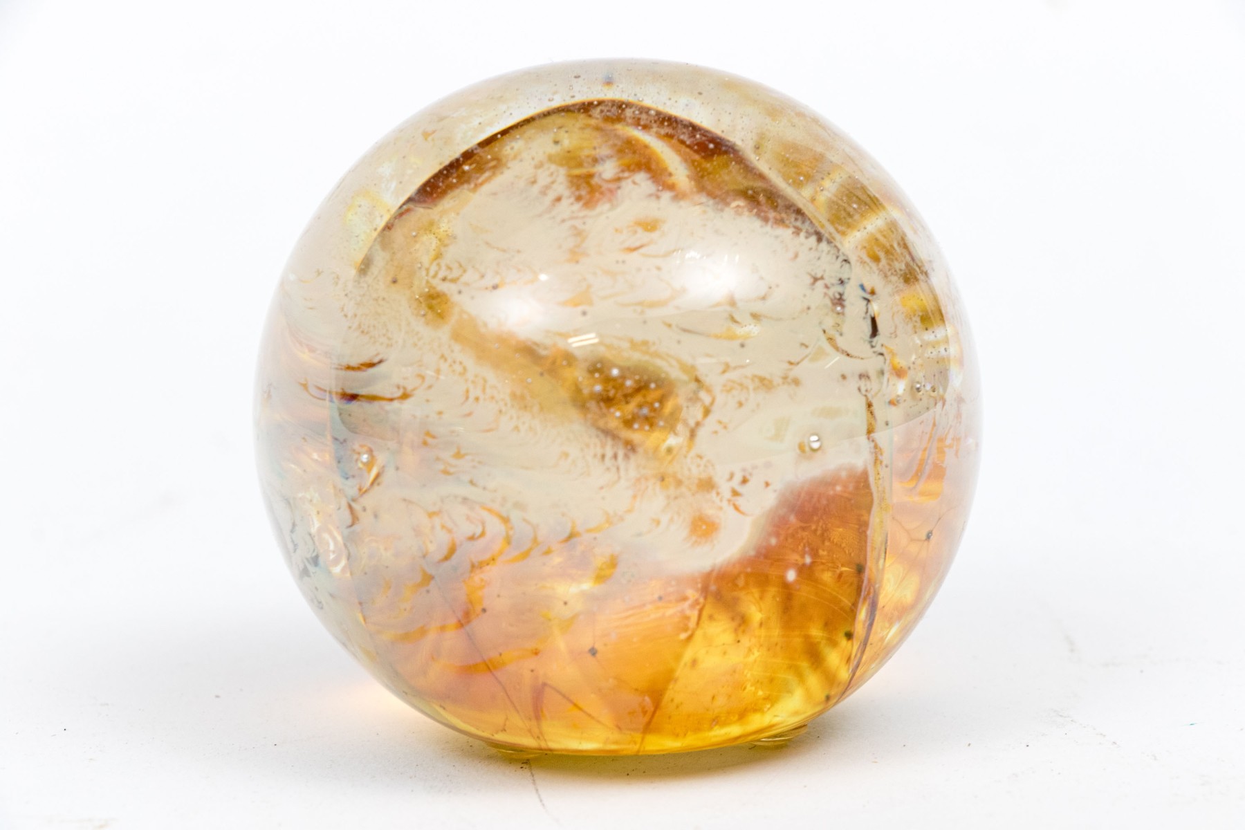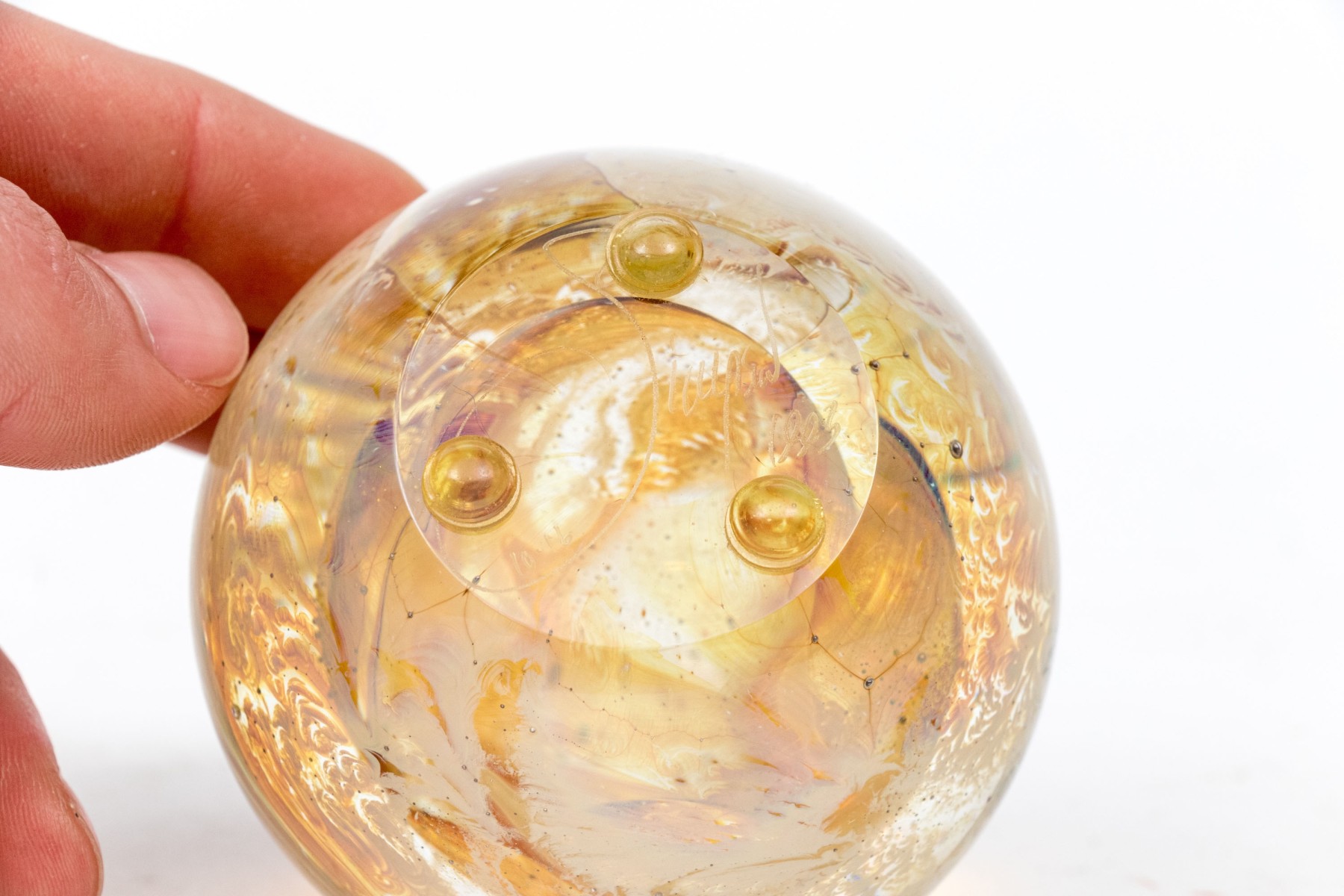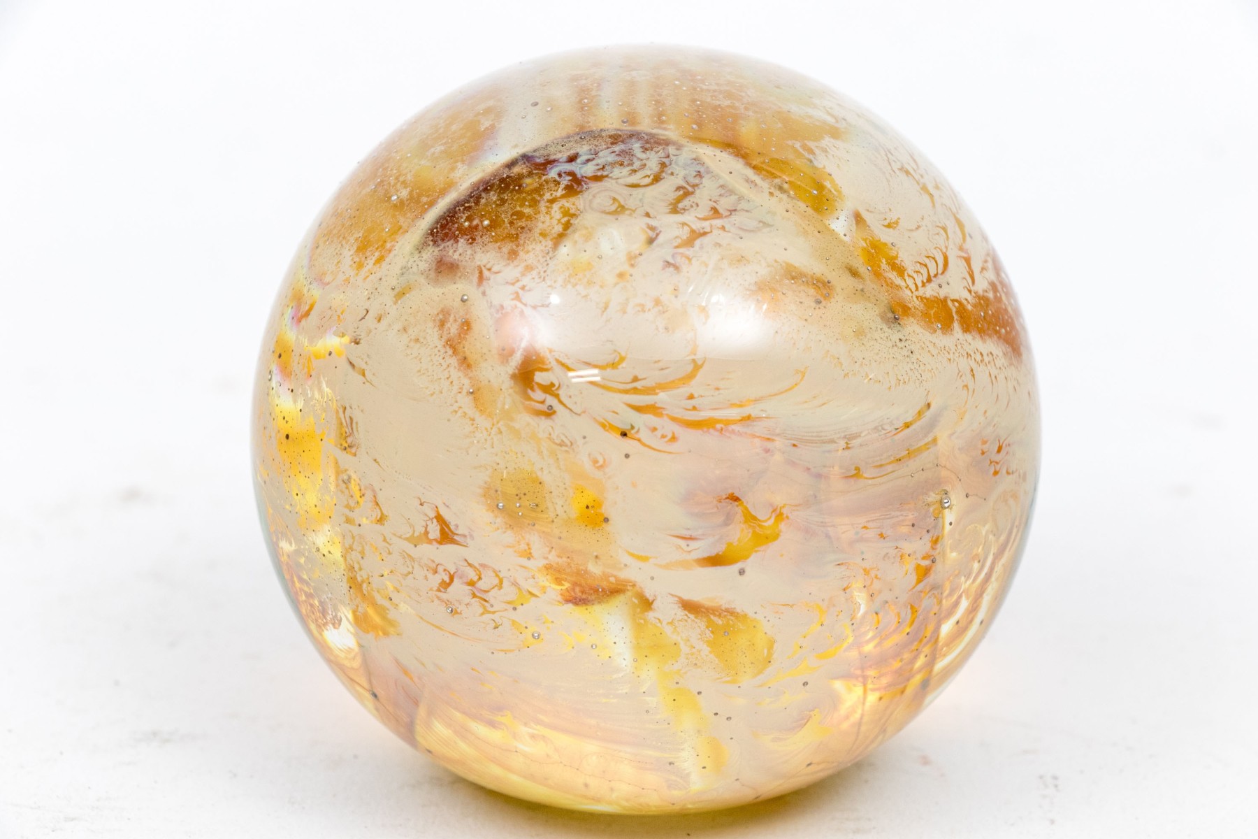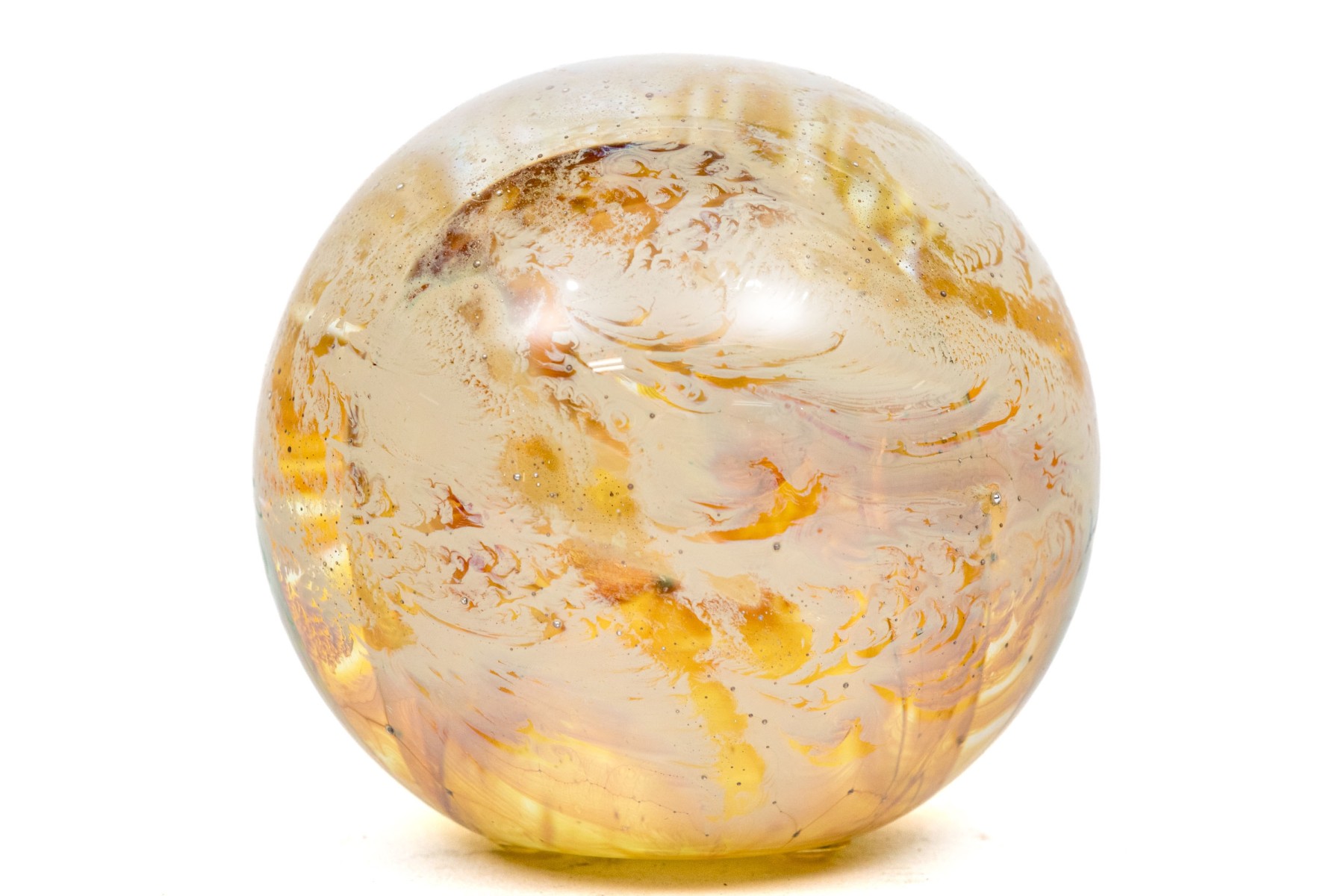 Josh Simpson (American [CT], B. 1949) spherical art glass paperweight with a charming planetary design. The paperweight features an amber hued cased center overlaid by swirling cream white for a captivating display with a great sense of depth. Signed underfoot and dated 10-16-1993.