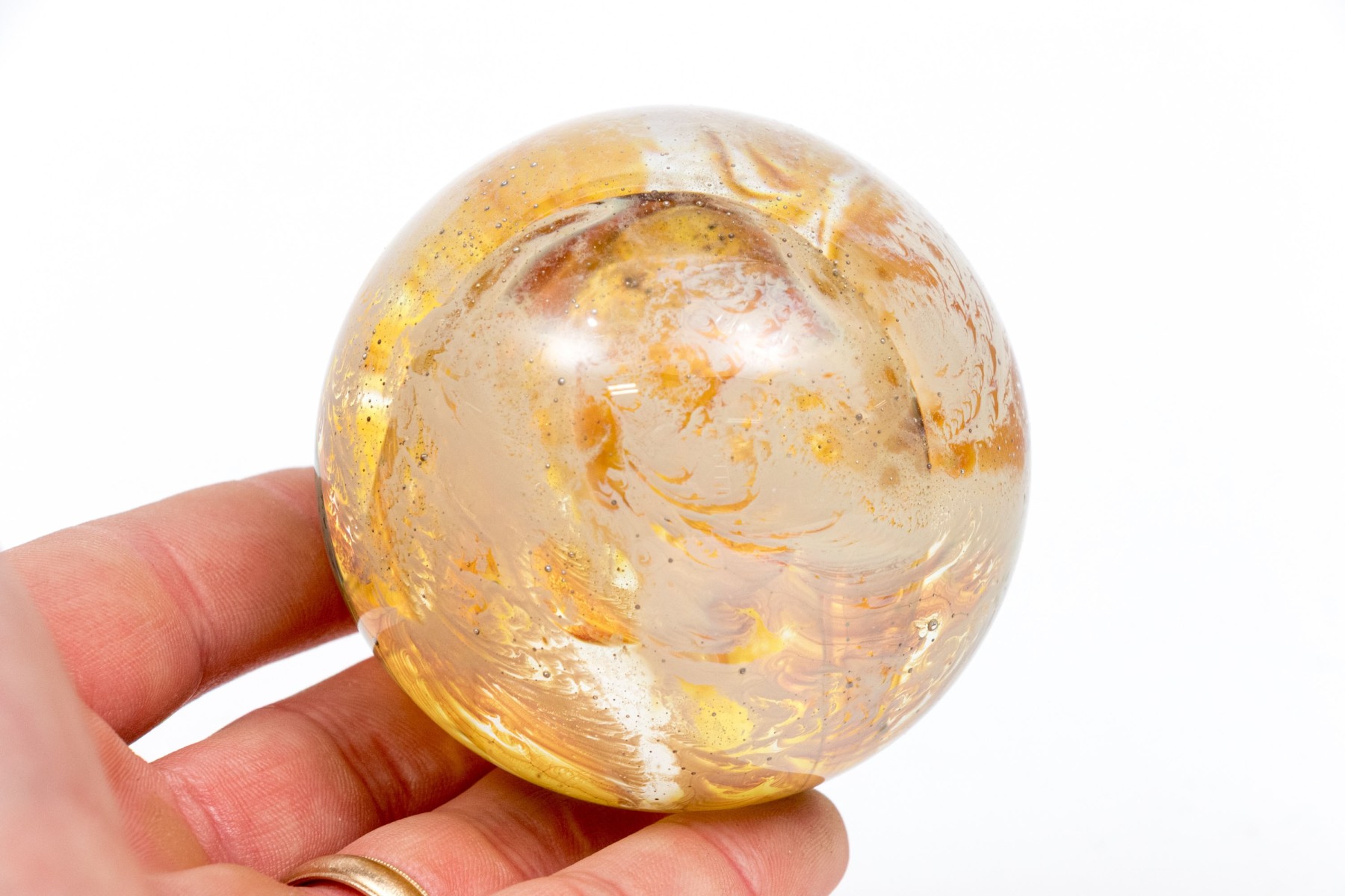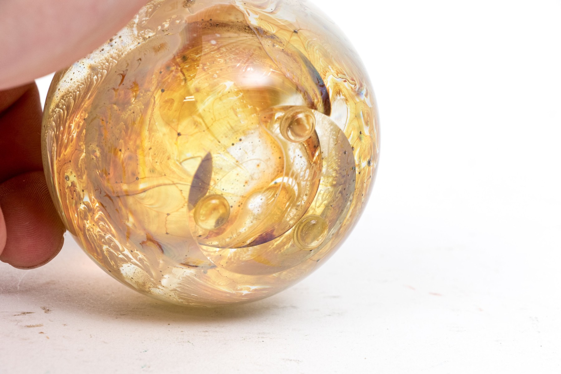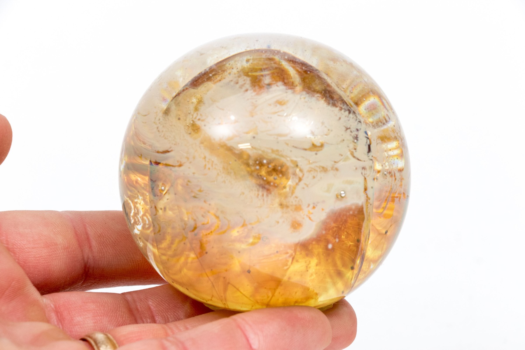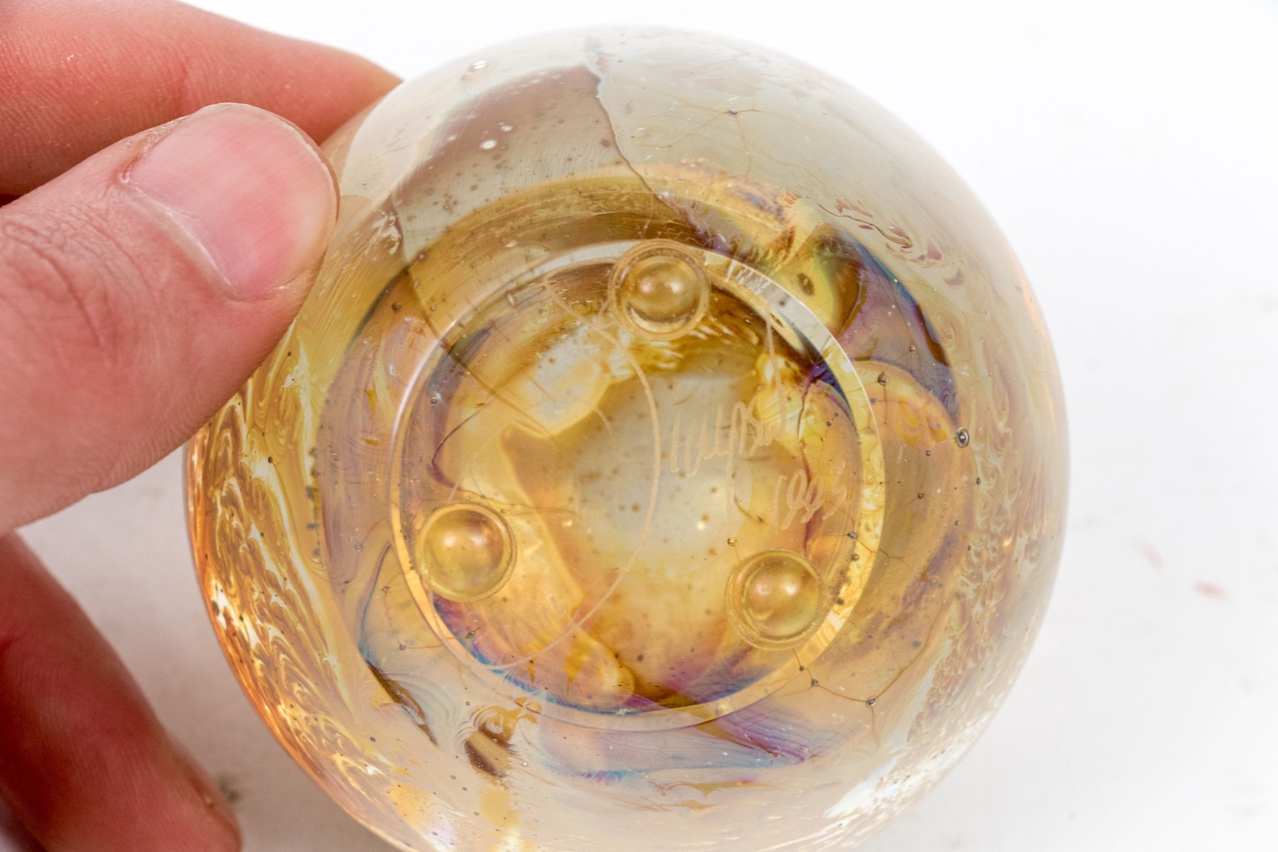 Josh Simpson (American [CT], B. 1949) spherical art glass paperweight with a charming planetary design. The paperweight features an amber hued cased center overlaid by swirling cream white for a captivating display with a great sense of depth. Signed underfoot and dated 10-16-1993.