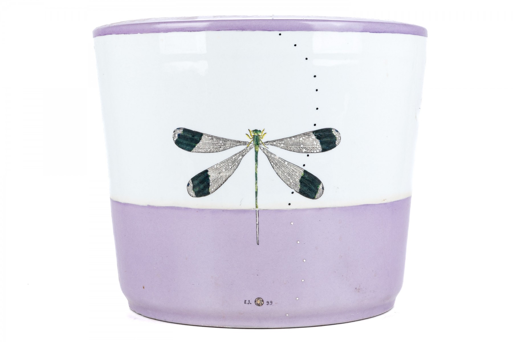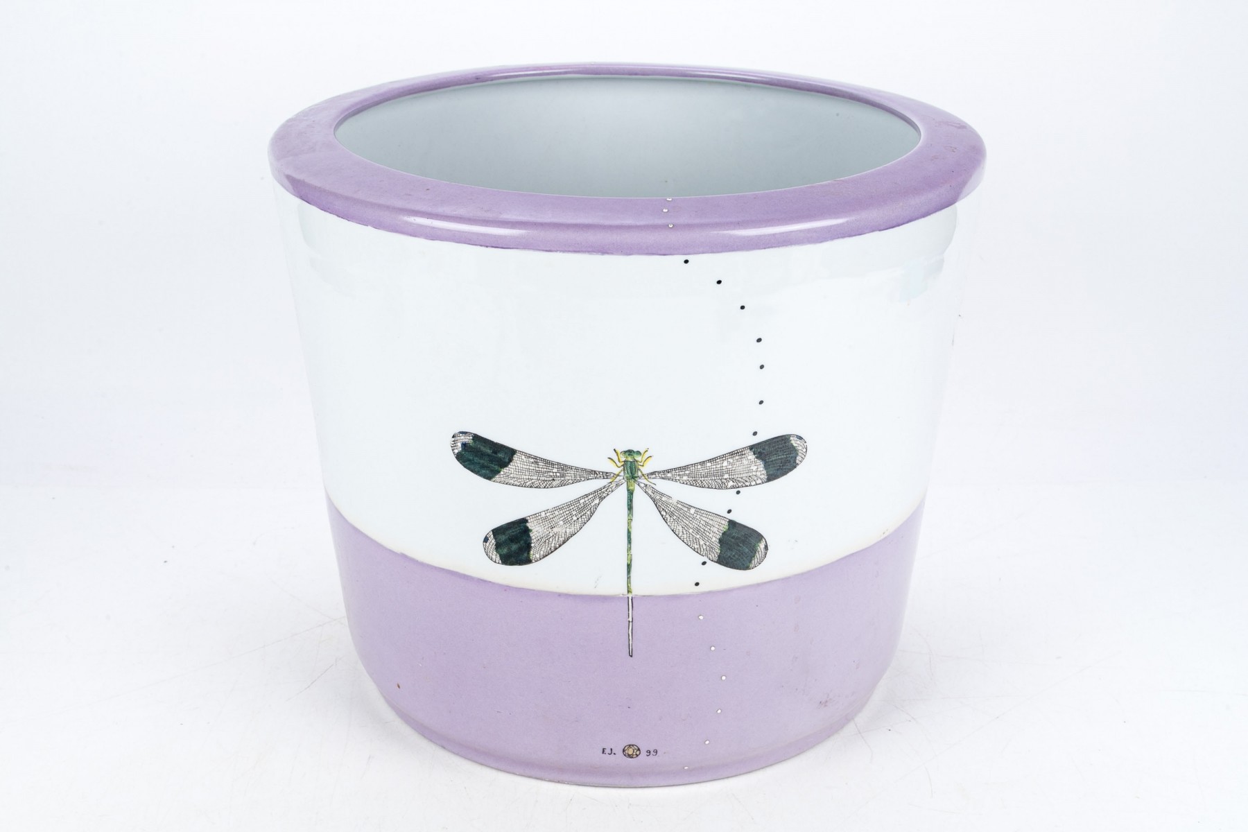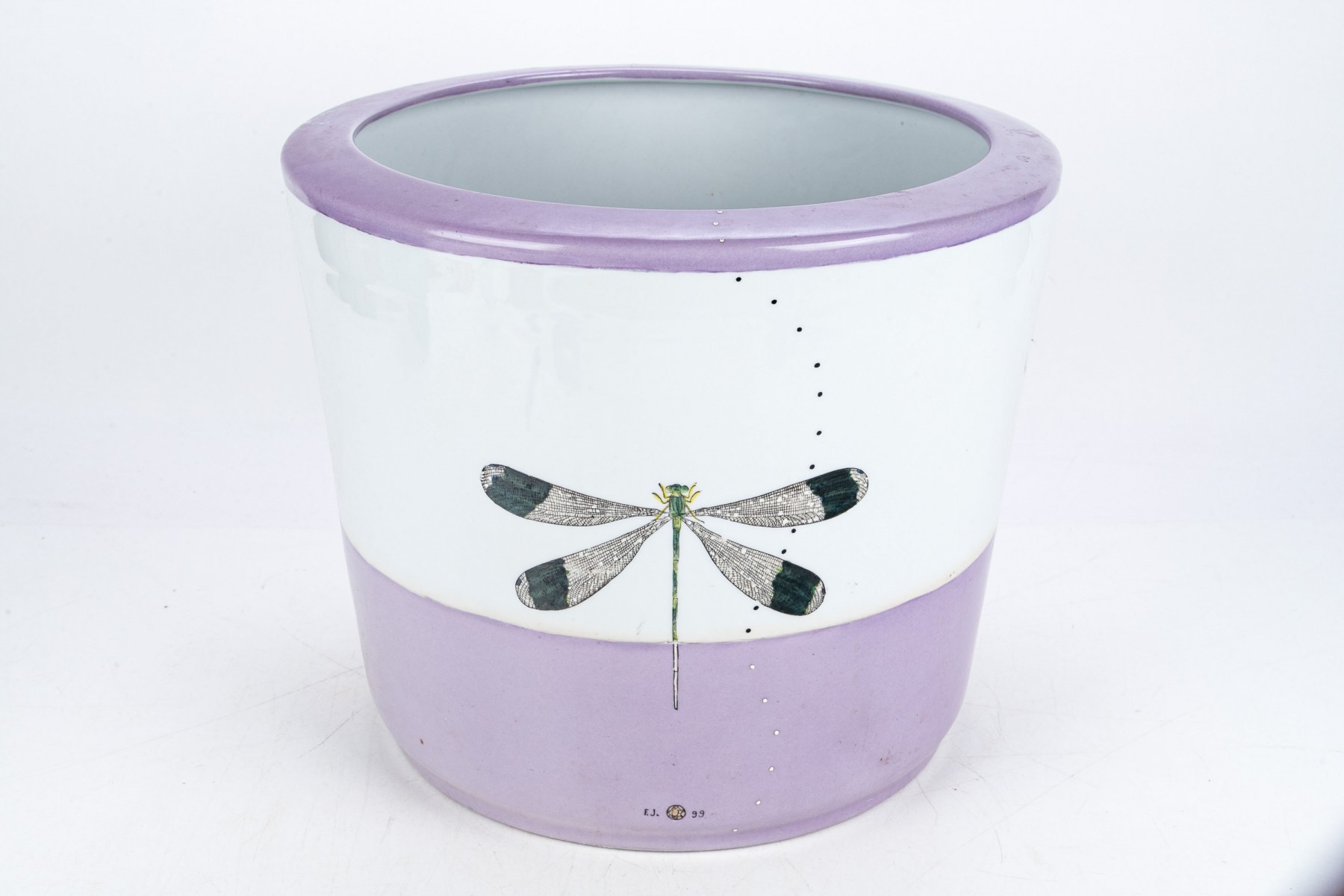 A large and substantial porcelain jardiniere by Jouvin Fabienne Paris with dragonflies in lilac and white with lilac trim. Made for Tozoi Home. The dragonflies are handprinted in relief with a trail of enamel dots from the rim to the bottom of the jardiniere. Signed lower FJ and dated 1999.