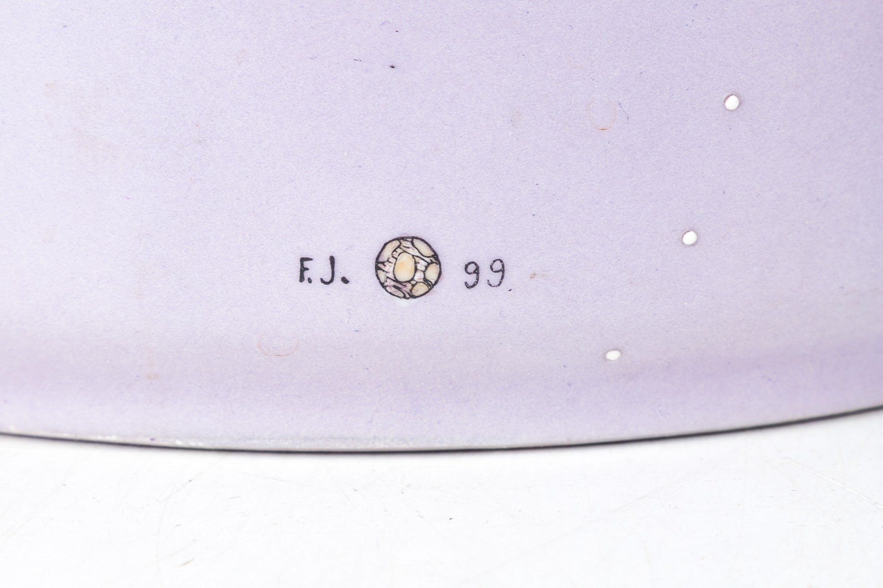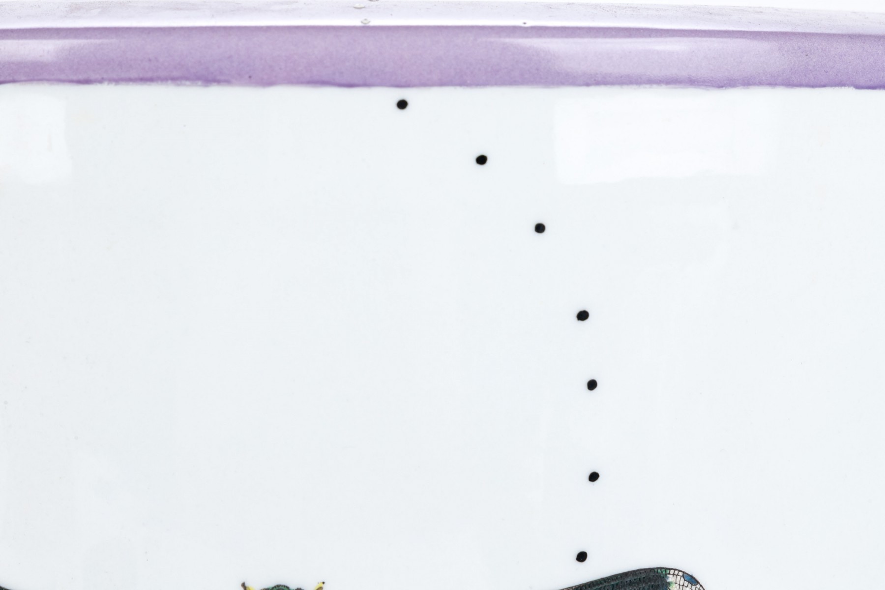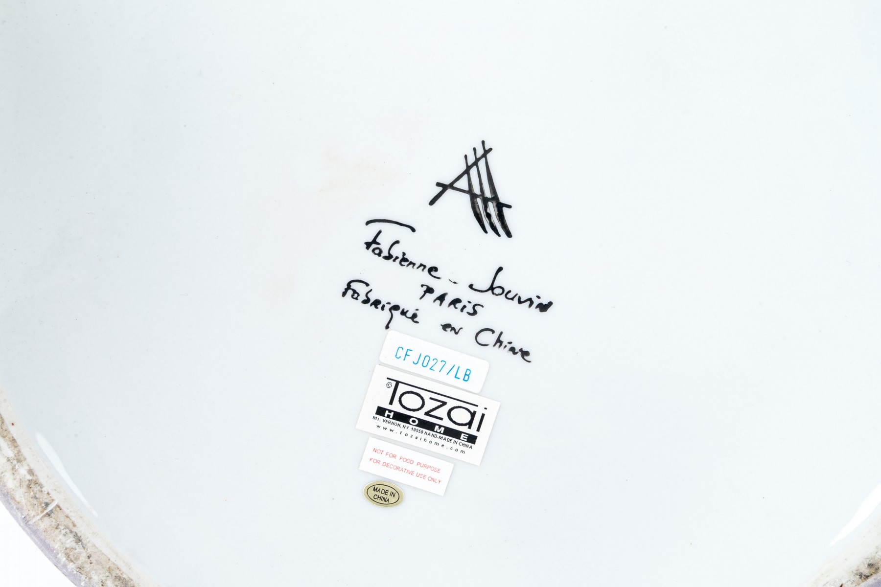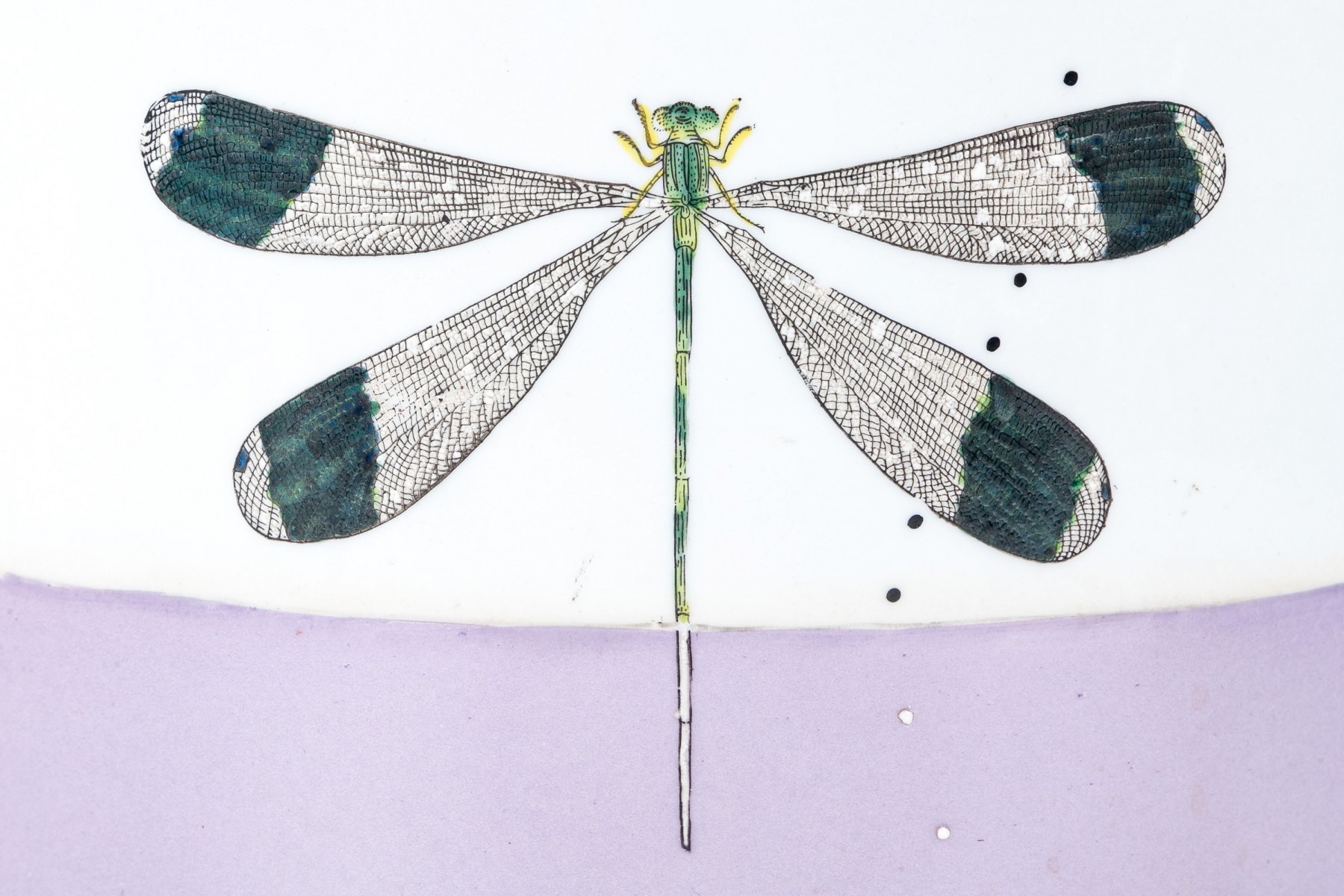 A large and substantial porcelain jardiniere by Jouvin Fabienne Paris with dragonflies in lilac and white with lilac trim. Made for Tozoi Home. The dragonflies are handprinted in relief with a trail of enamel dots from the rim to the bottom of the jardiniere. Signed lower FJ and dated 1999.