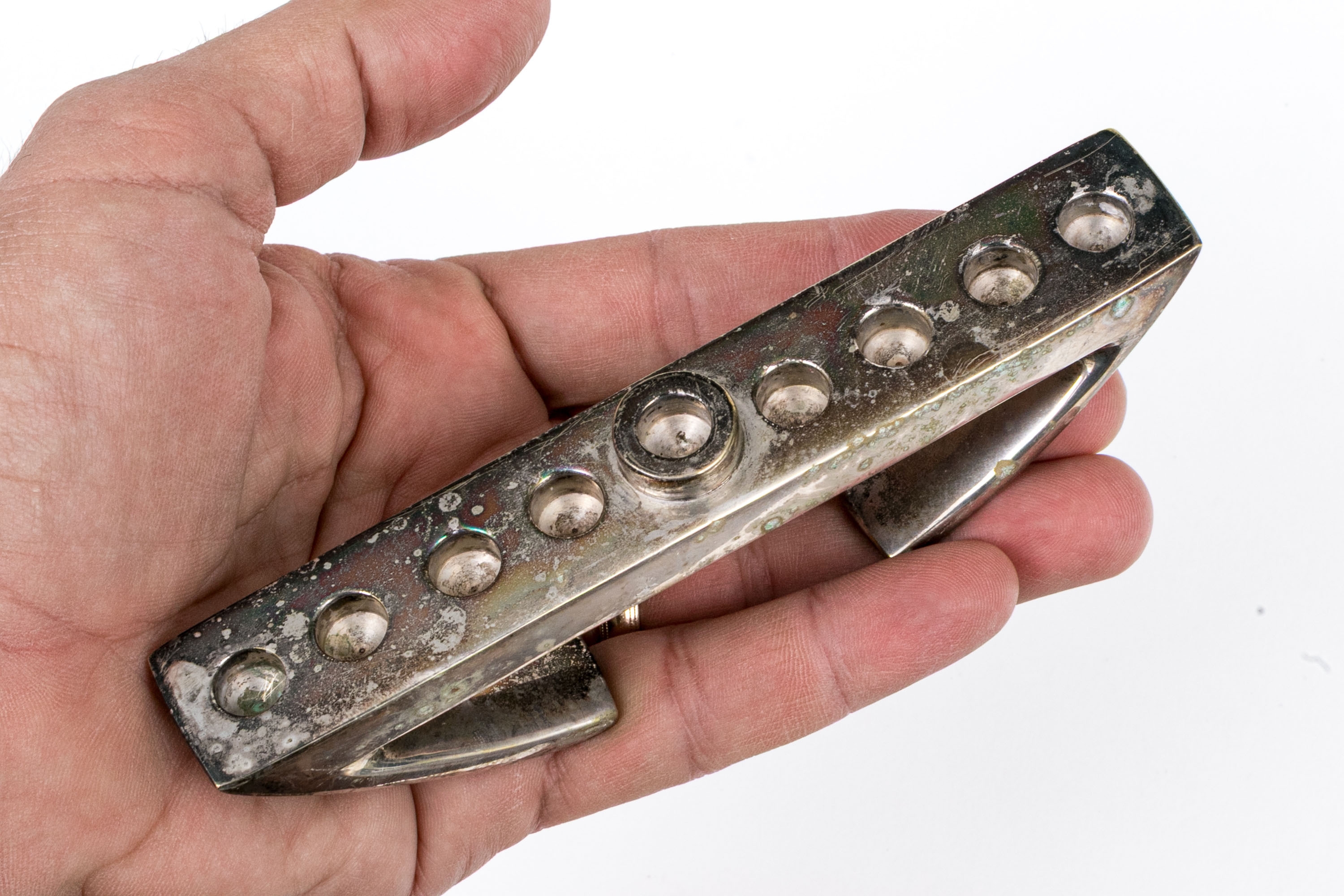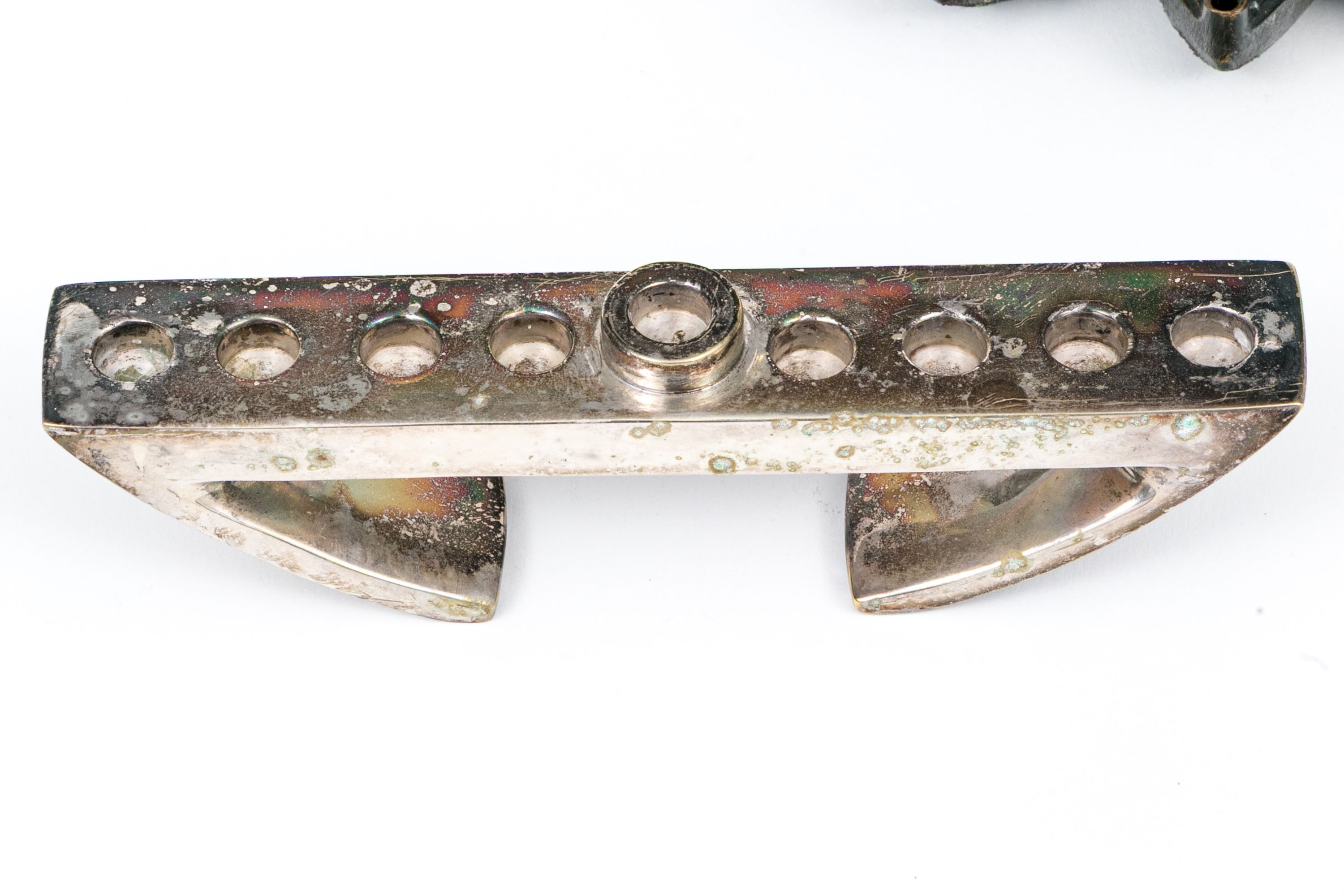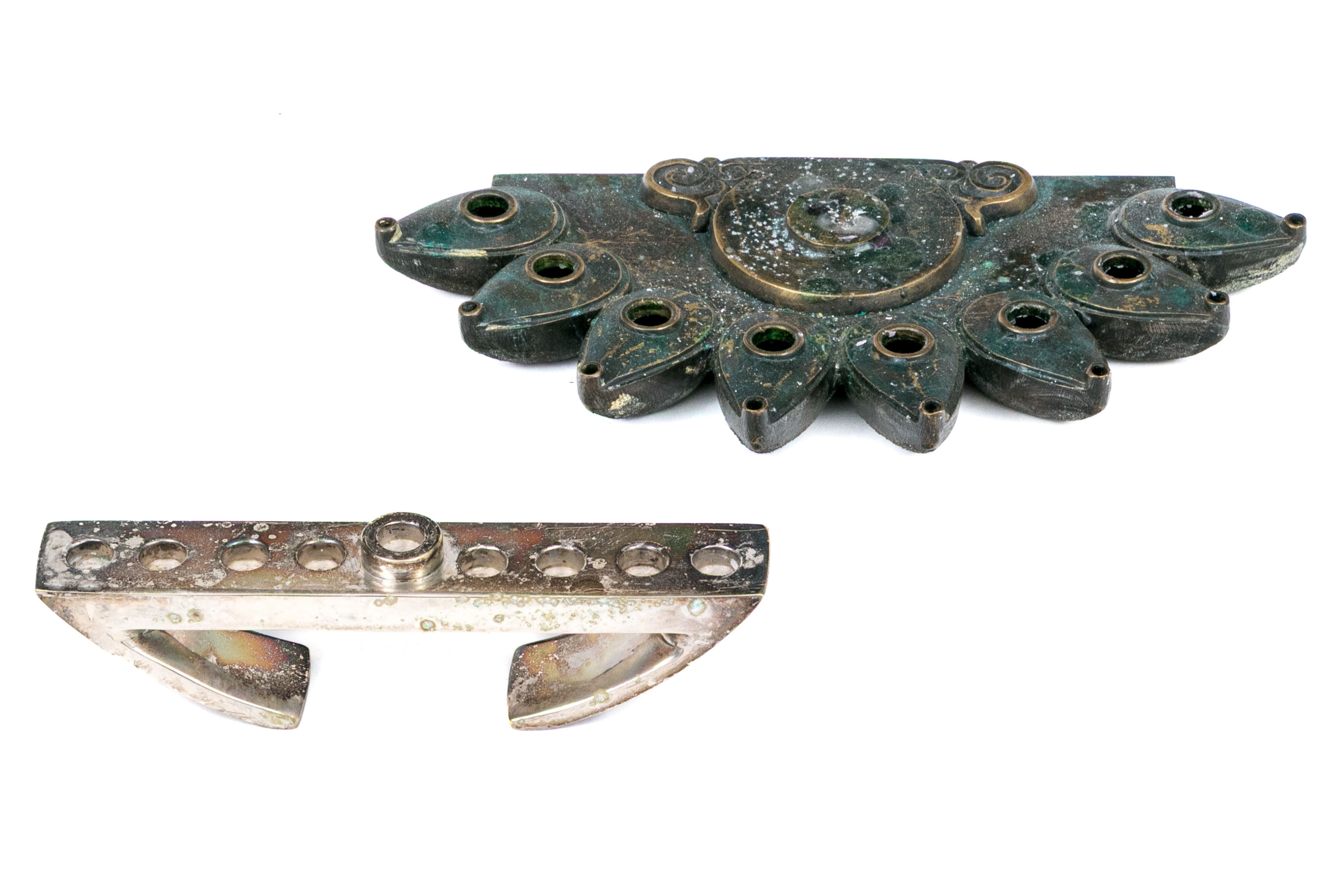 Including a Steve Klein marked silver plated modern menorah, together with a brass menorah with eight oil lamp form candlesticks on a demilune formed base.