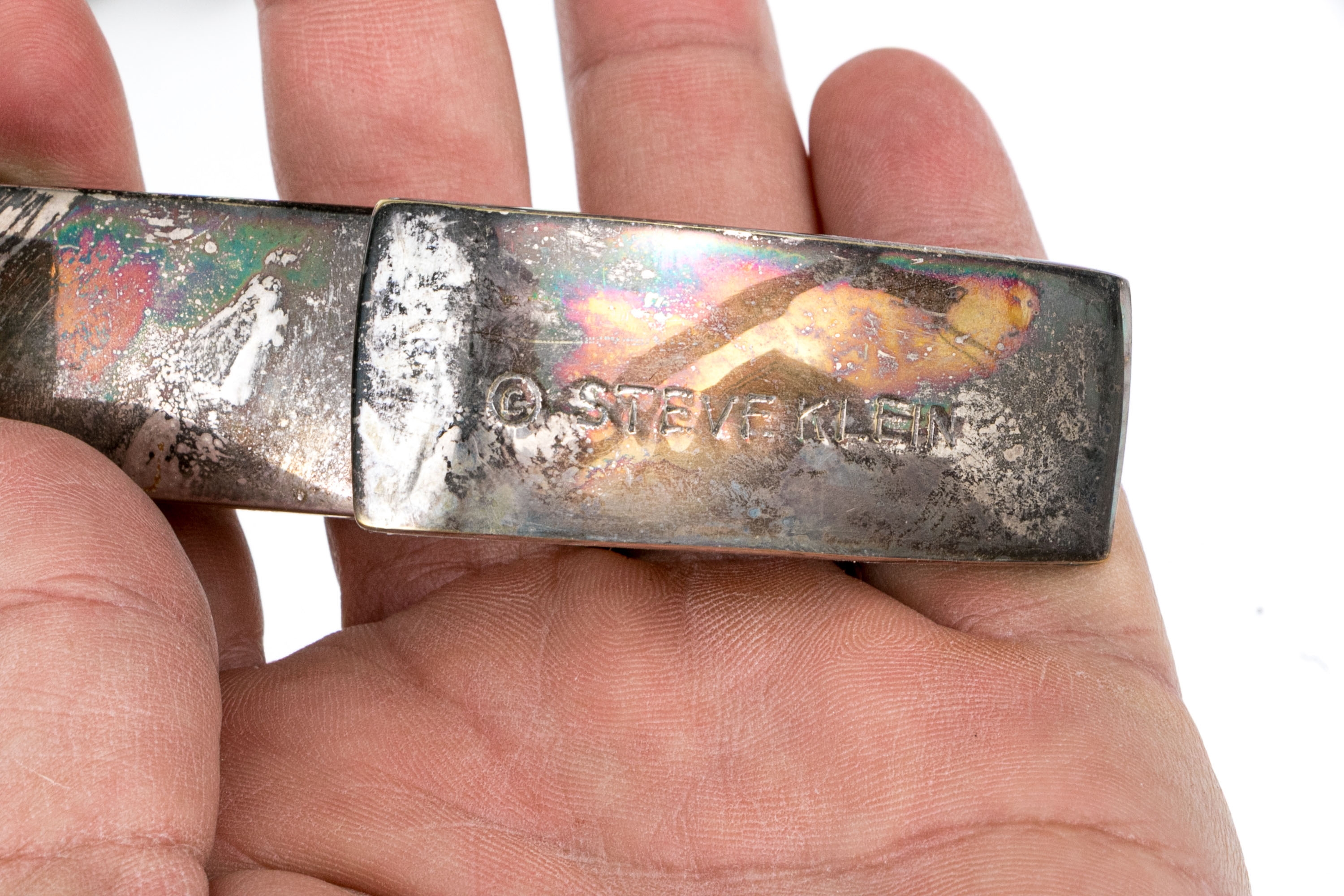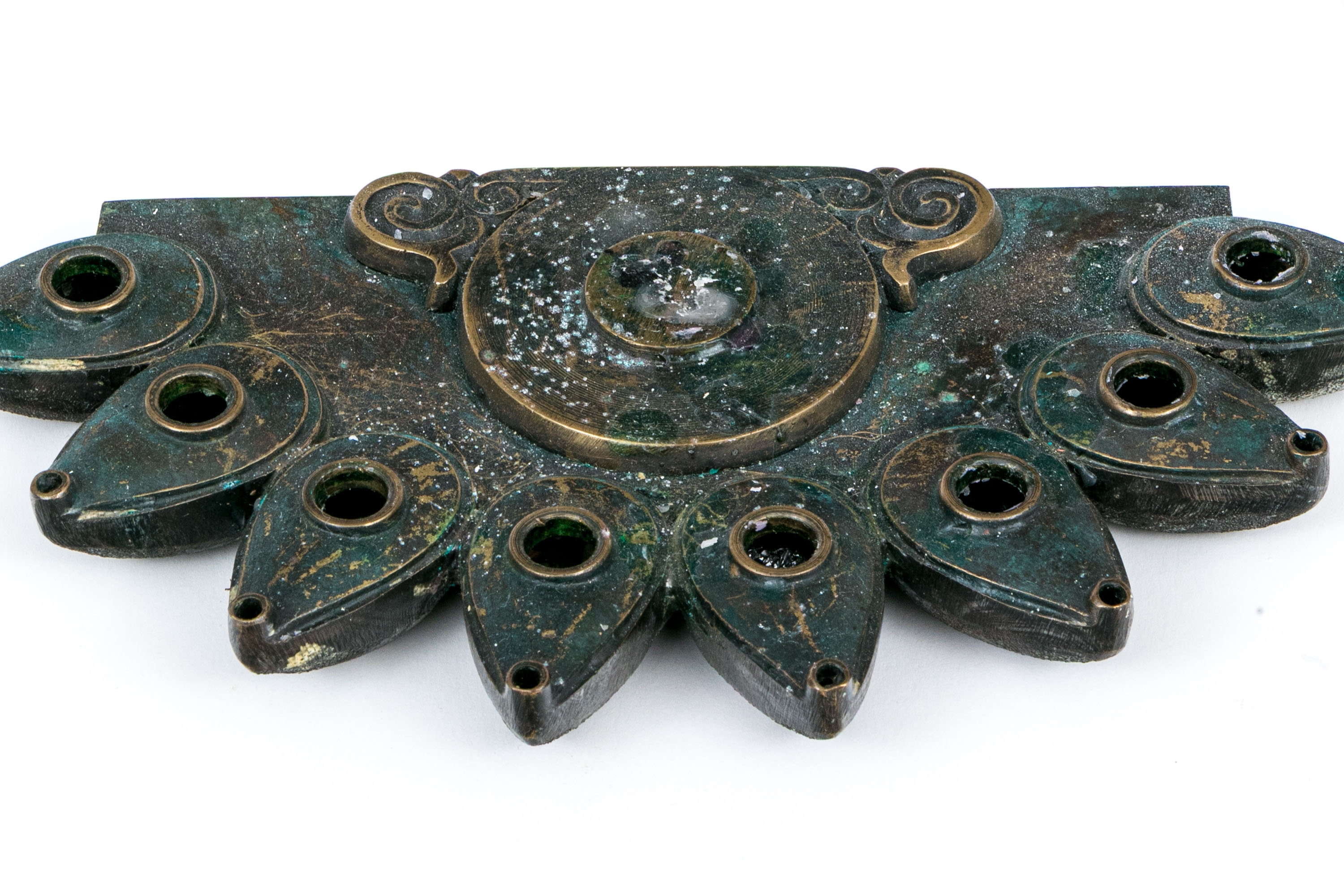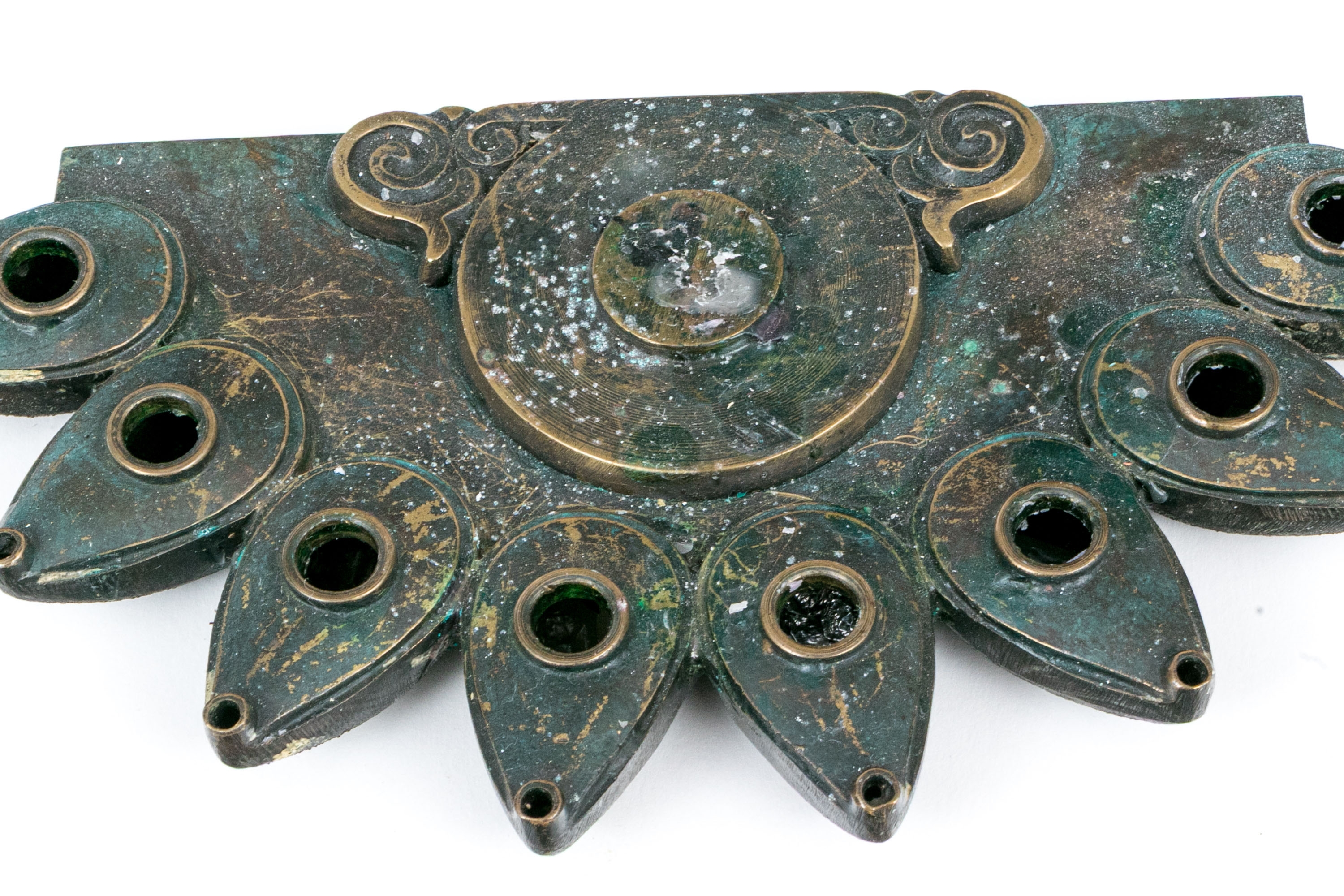 Including a Steve Klein marked silver plated modern menorah, together with a brass menorah with eight oil lamp form candlesticks on a demilune formed base.