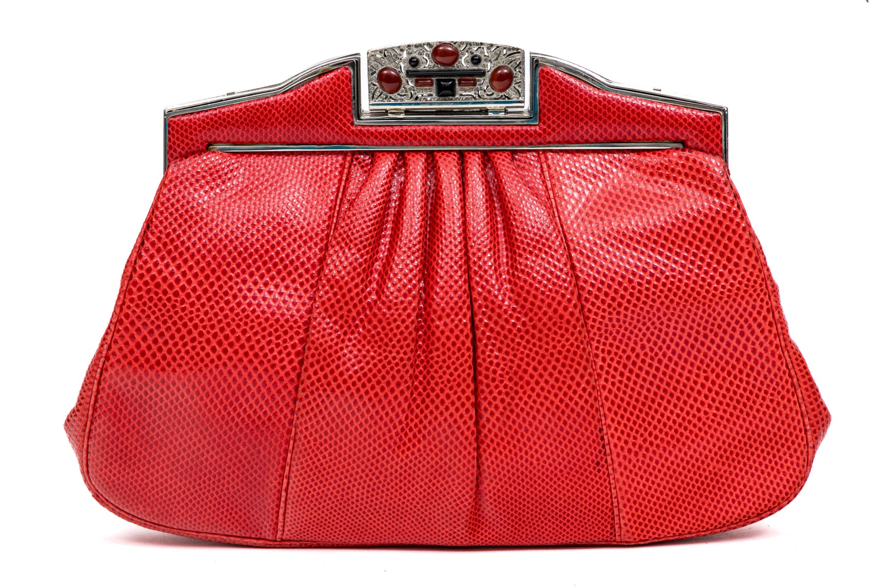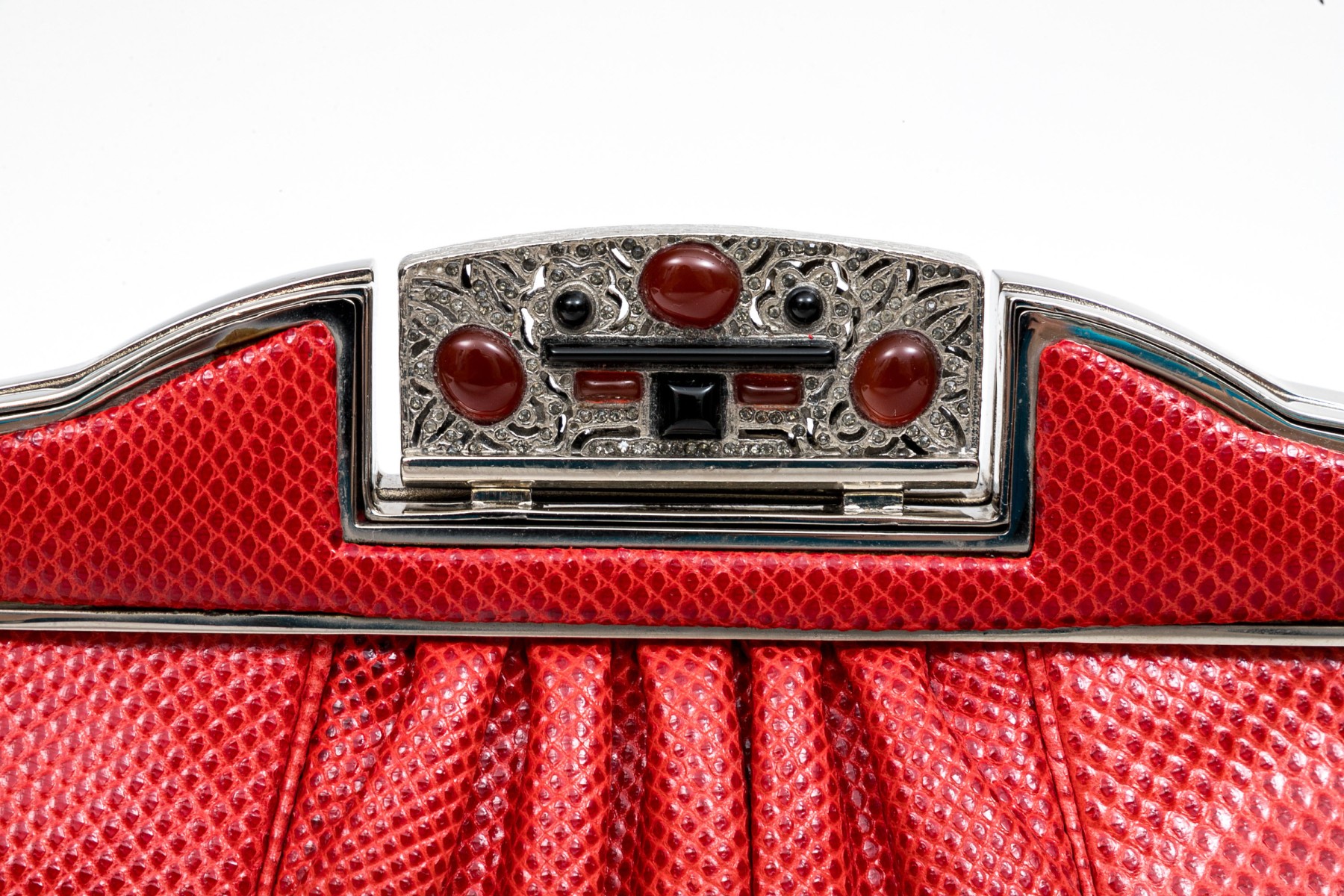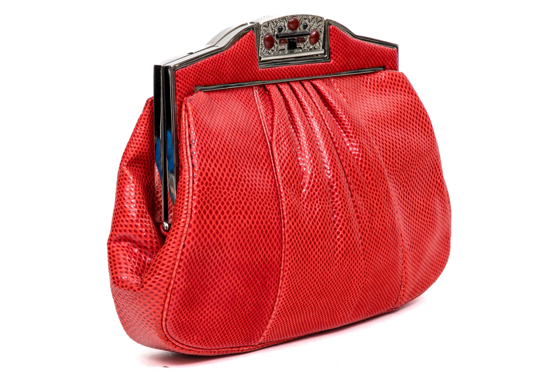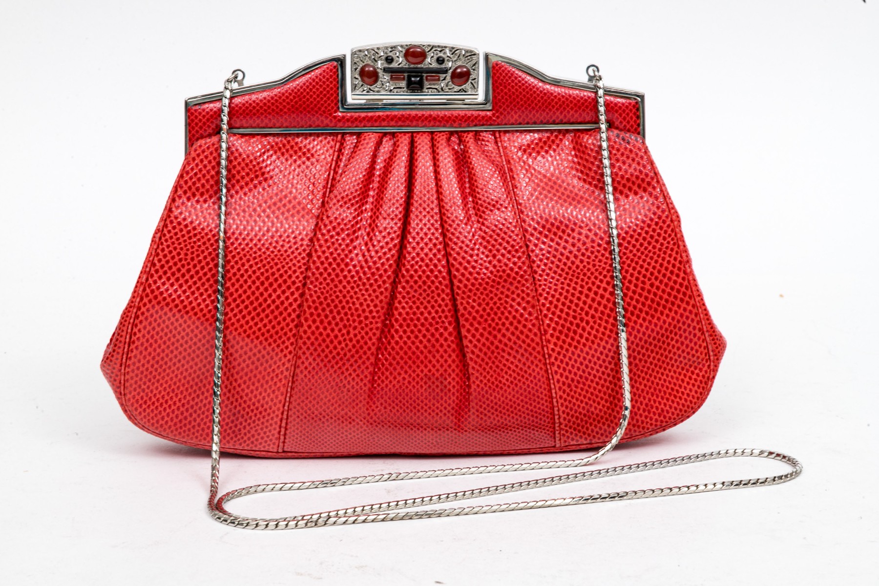 Judith Leiber stunning red pleated lizard bejeweled clutch/shoulder bag