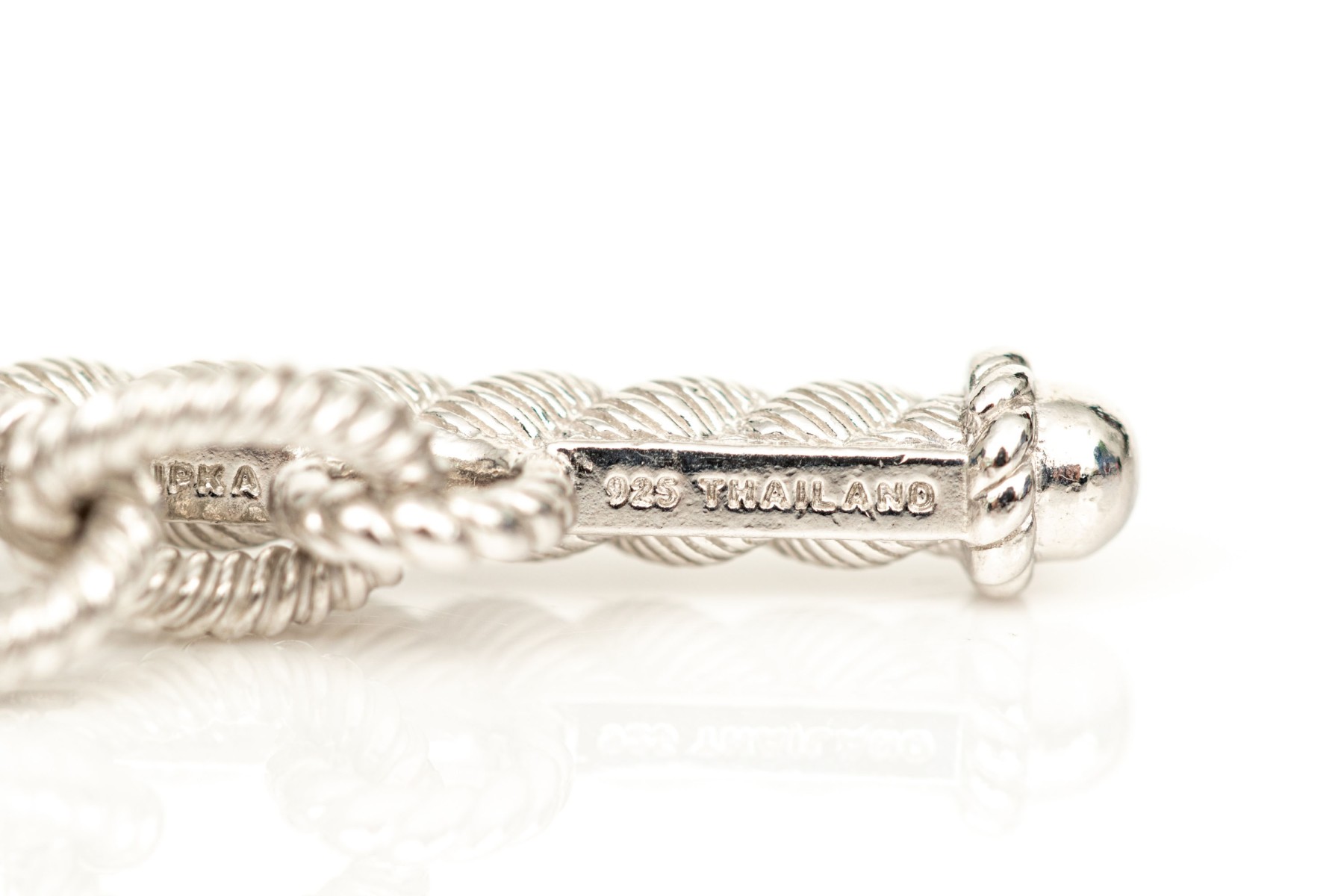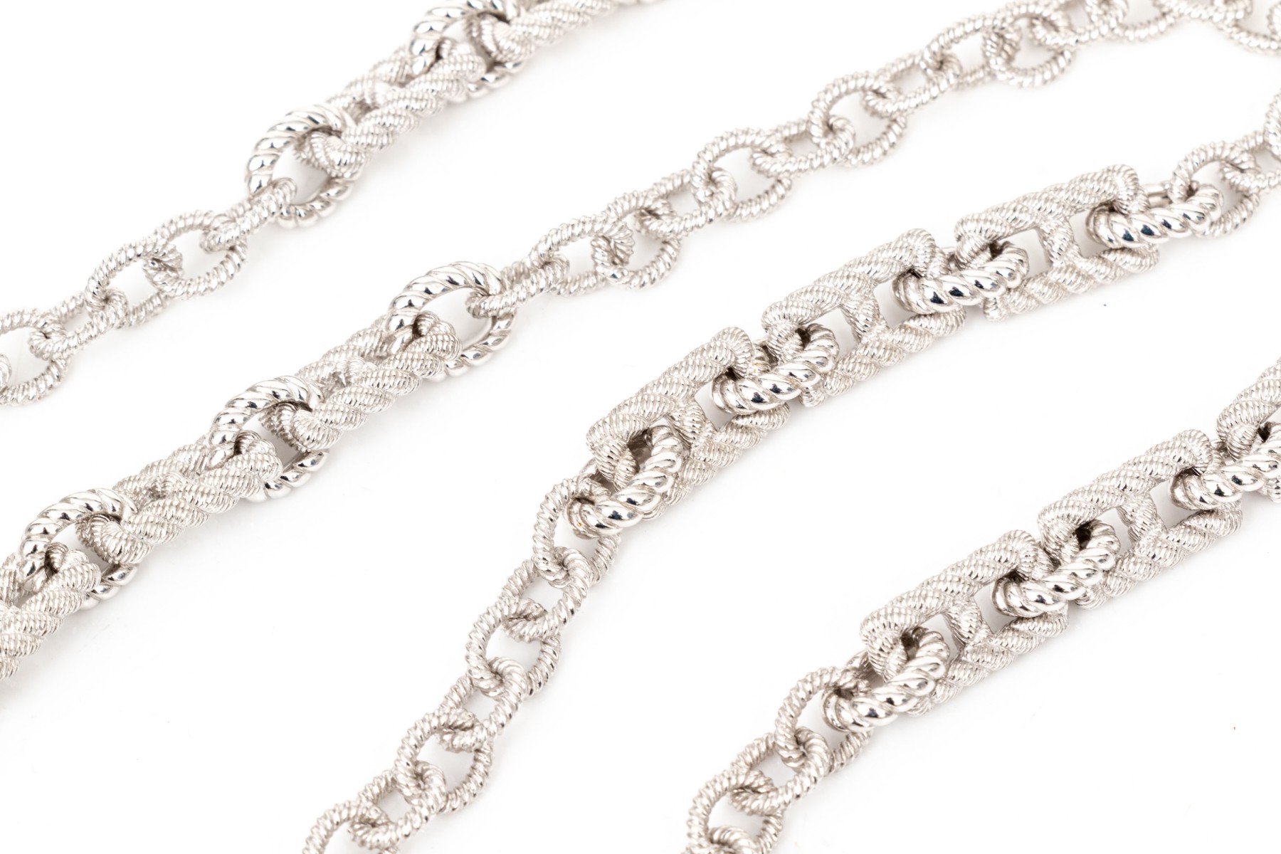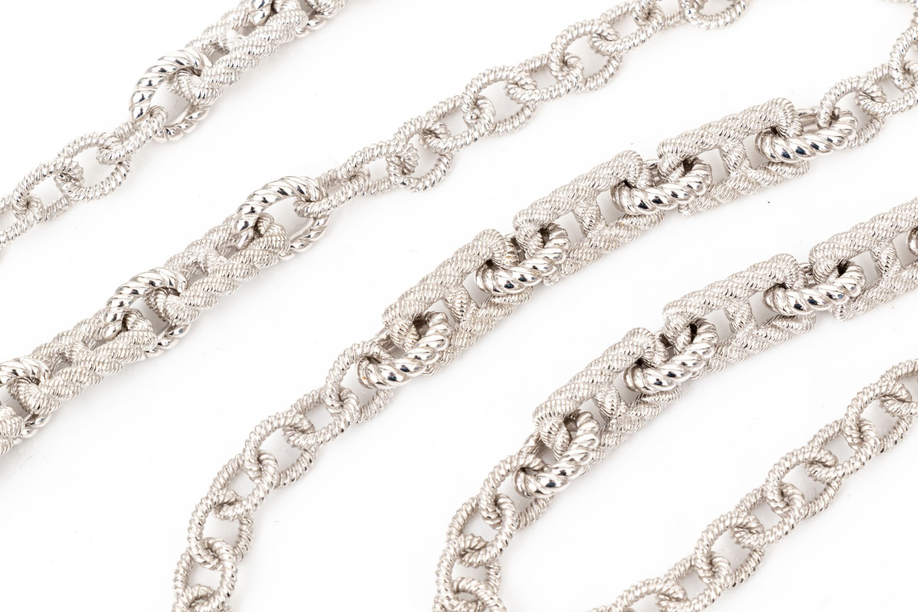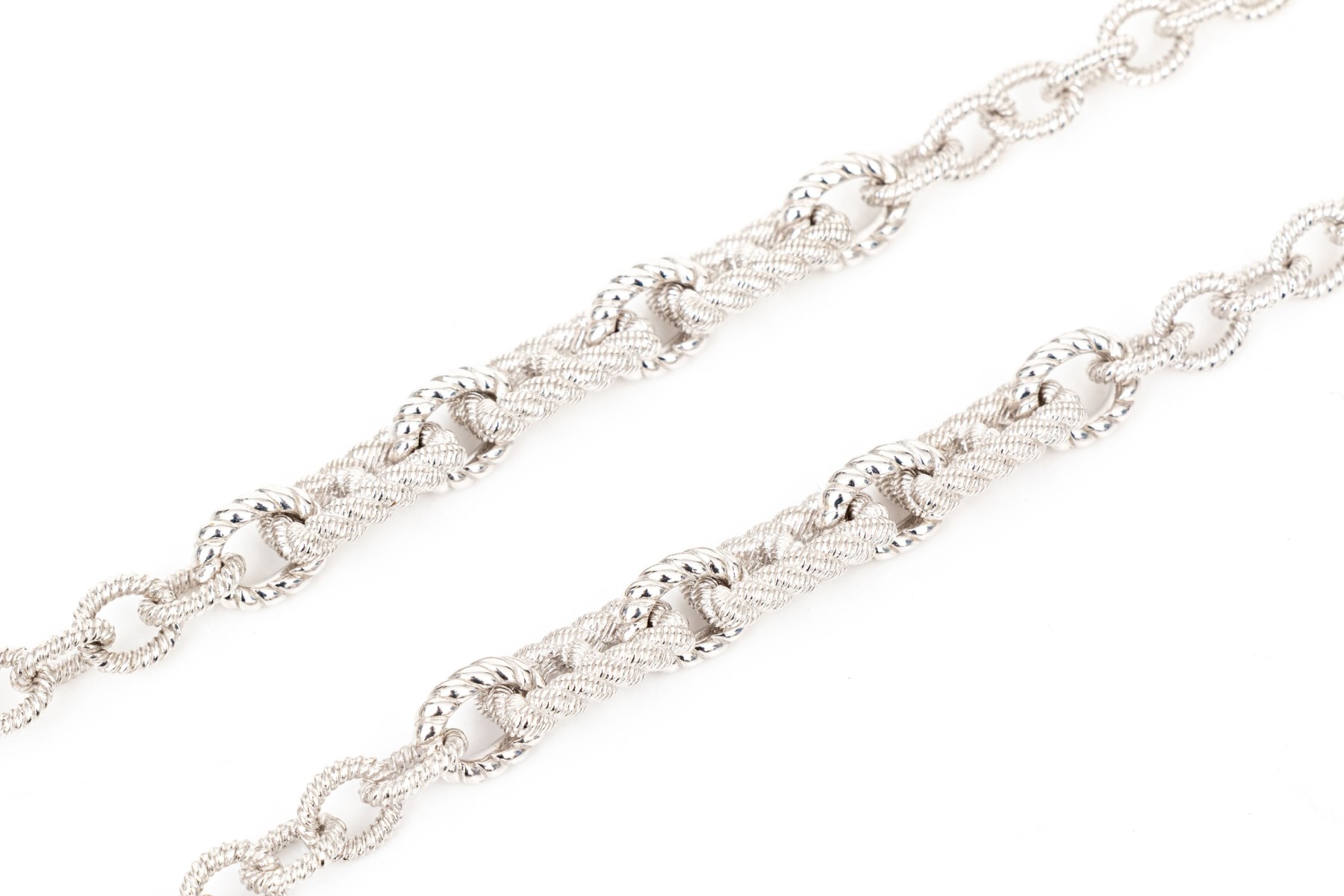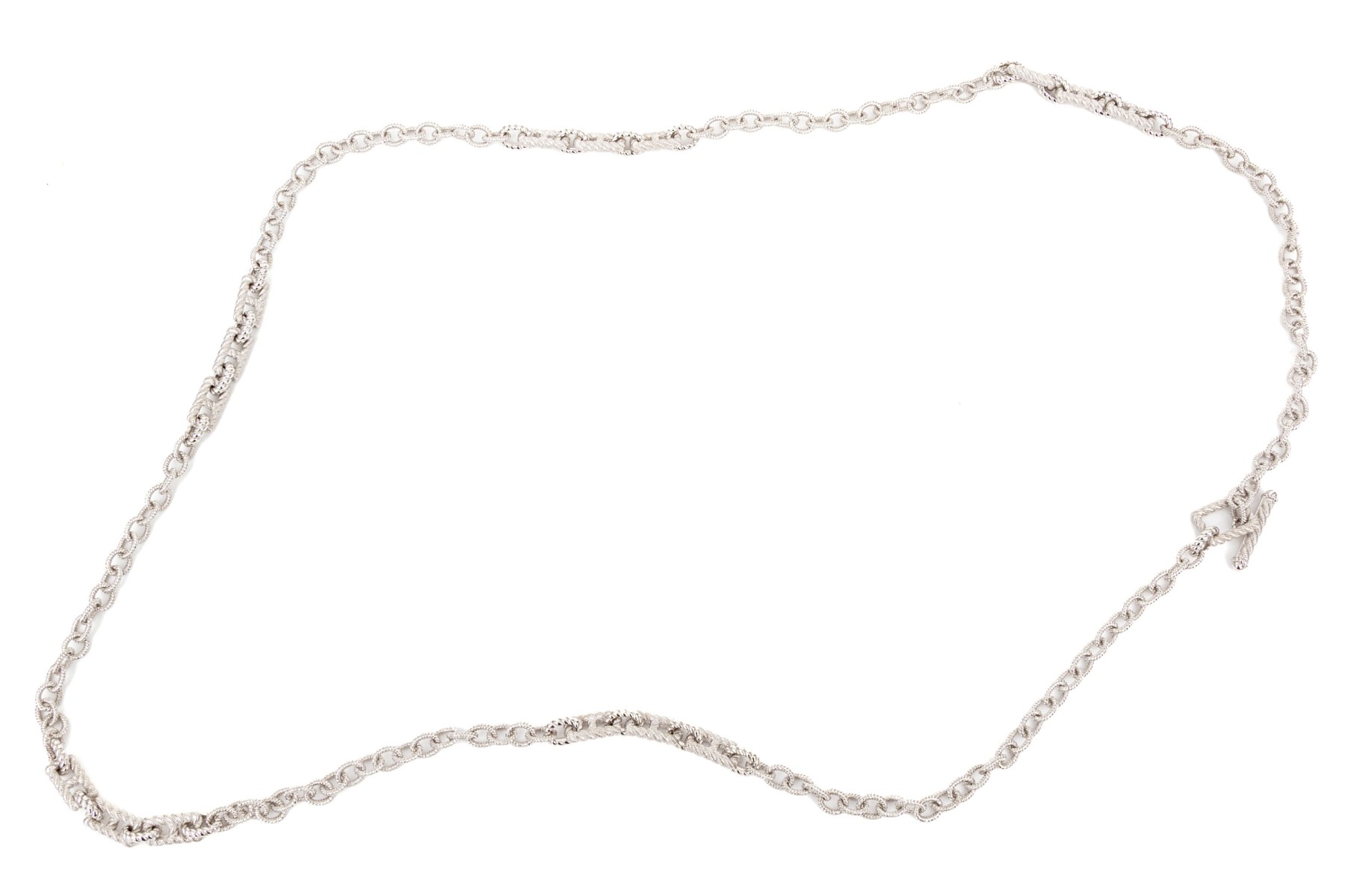 Judith Ripka fabulous sterling silver patterned opera length chunky link necklace, featuring rectangular and oval ribbed links, and finished with a toggle style clasp