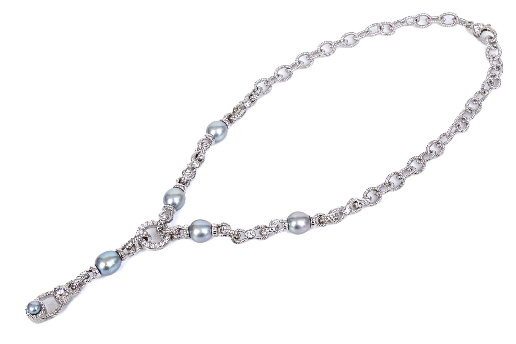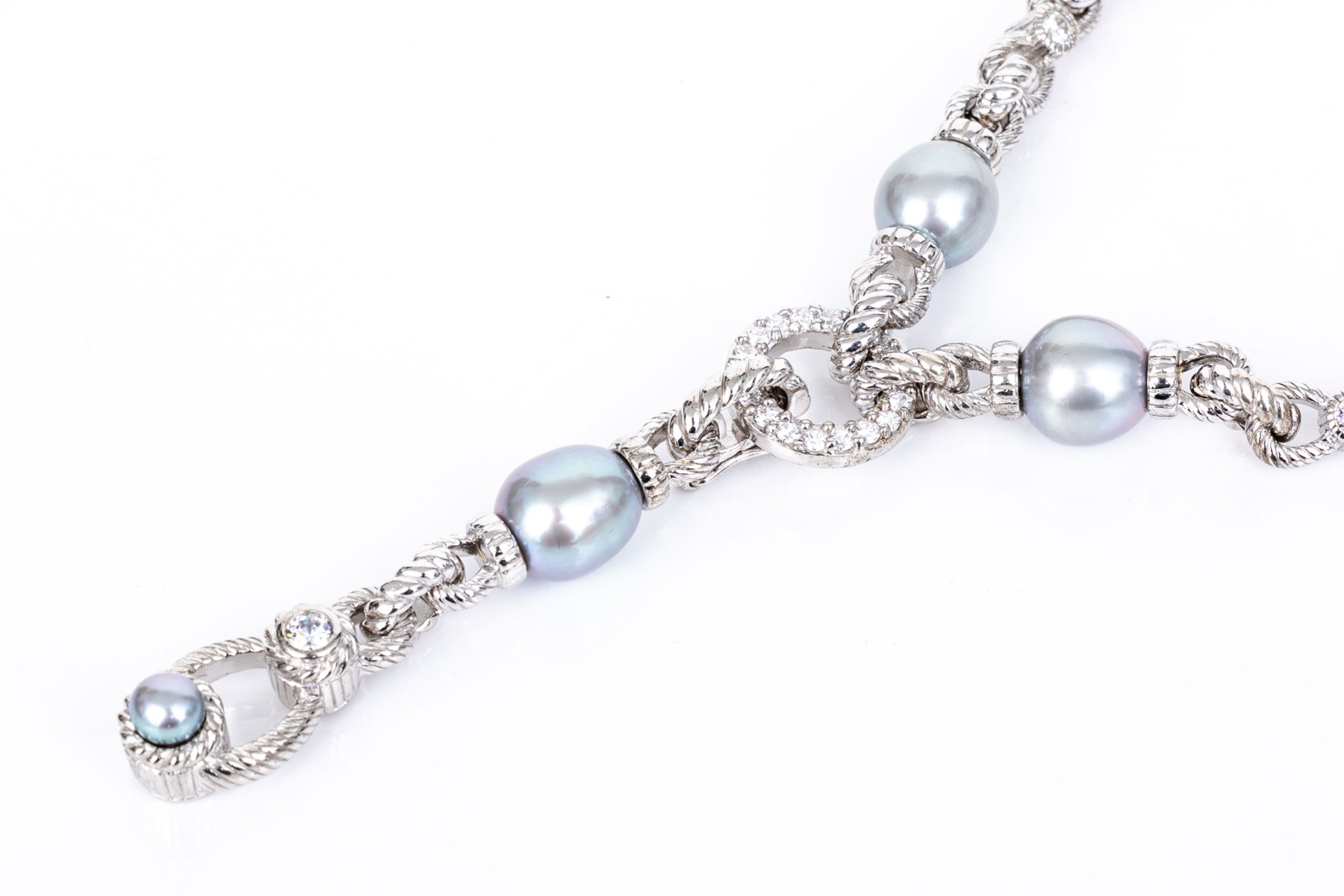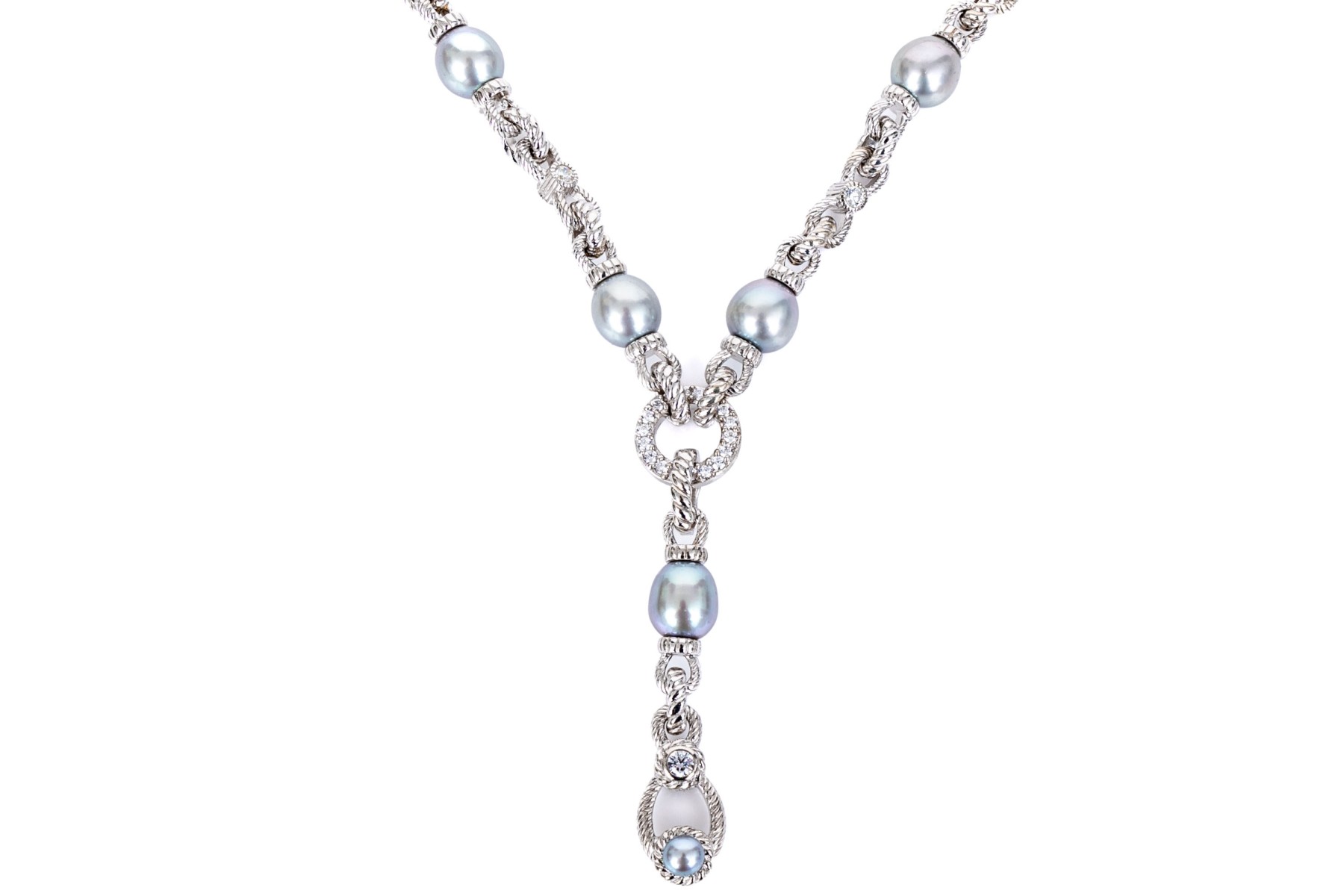 Judith Ripka sterling silver beautiful ribbed link and faux pearl "y"necklace, decorated with cz stones and finished with a decorative lobster claw style clasp. Please note, the center drop is removable.