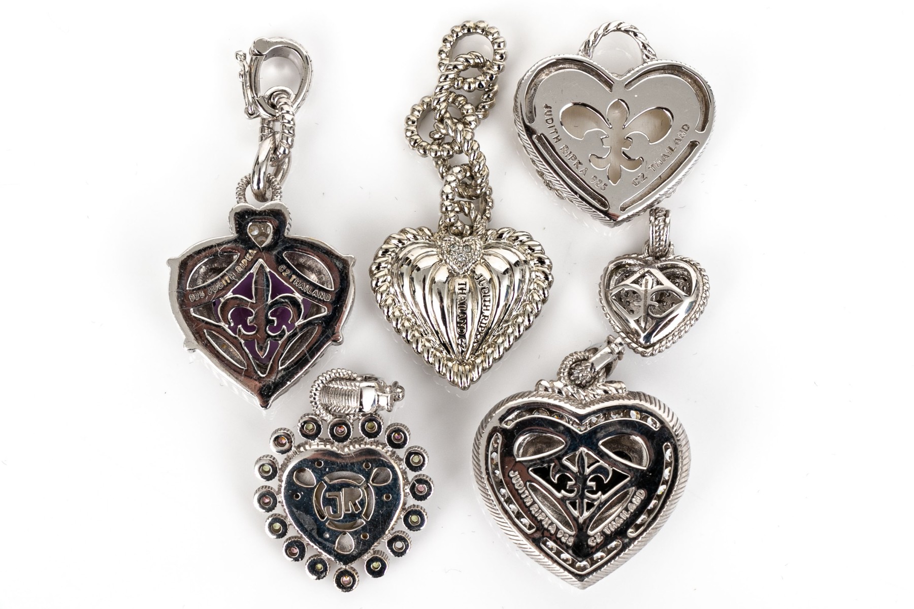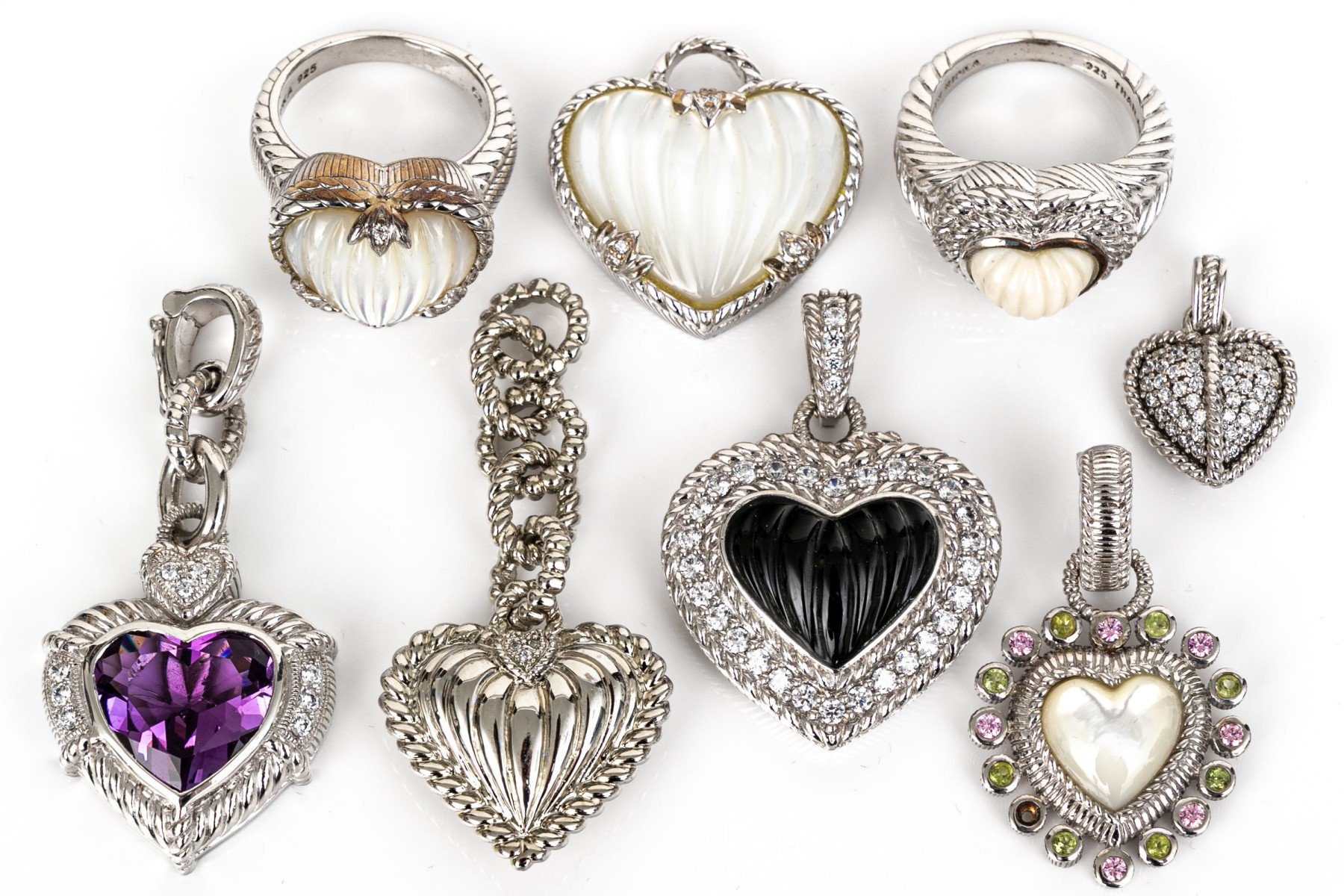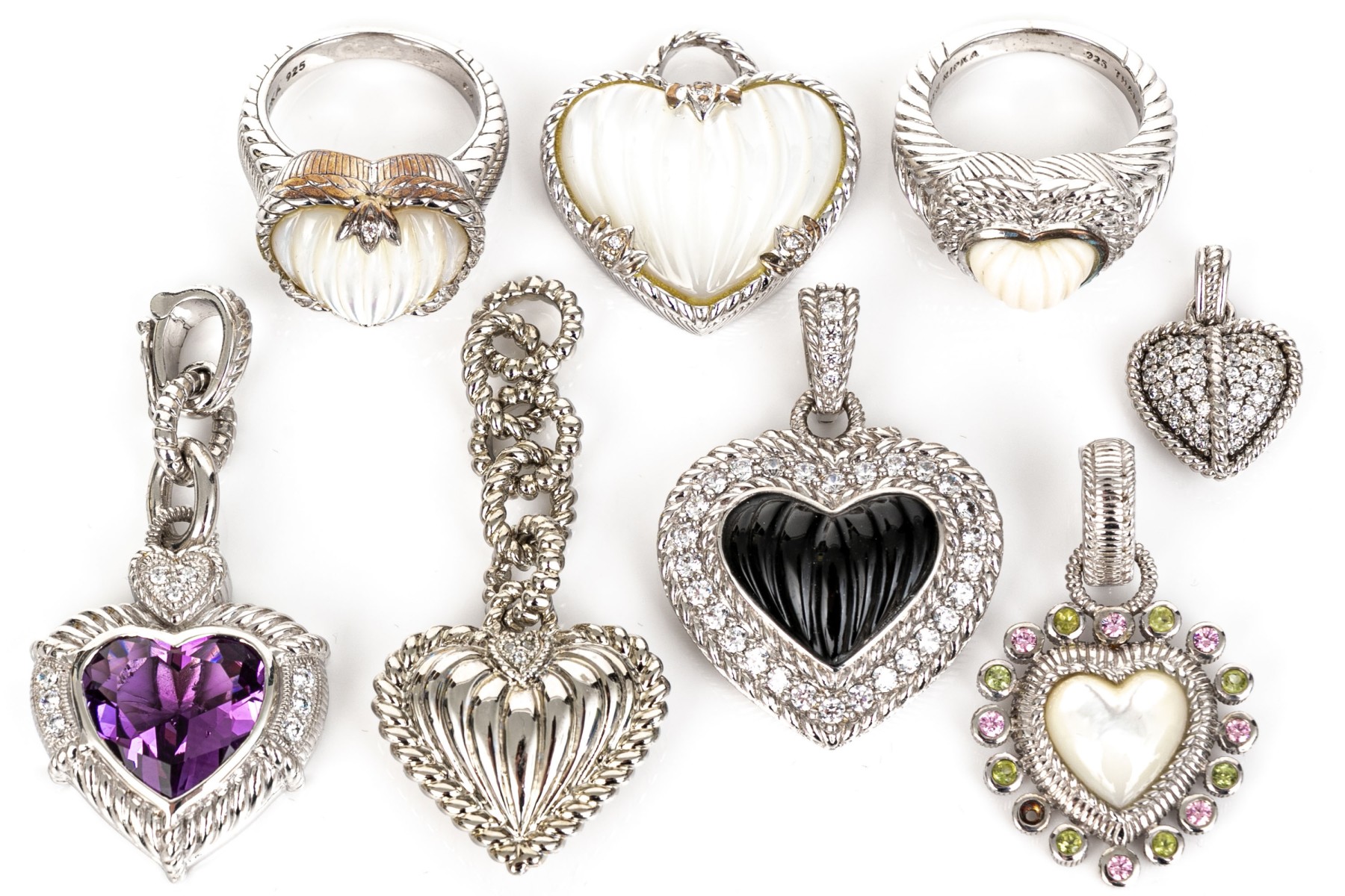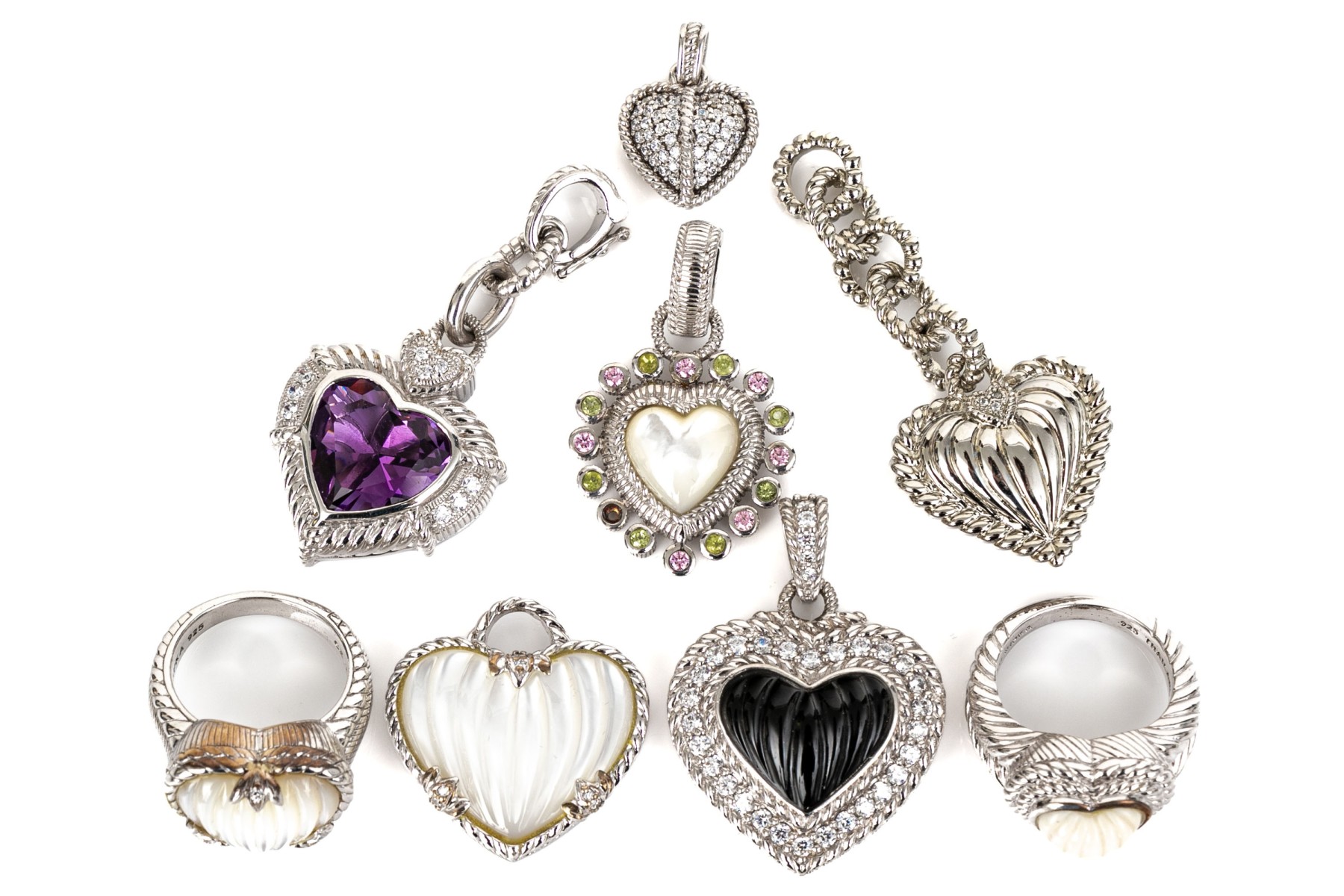 Judith Ripka sterling silver collection of heart motif jewelry pieces, including two rings, three pendants, and three enhancer pendants