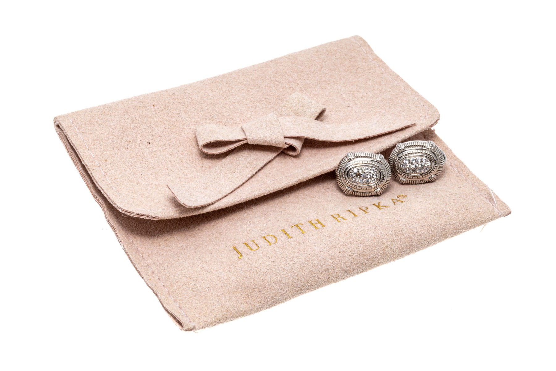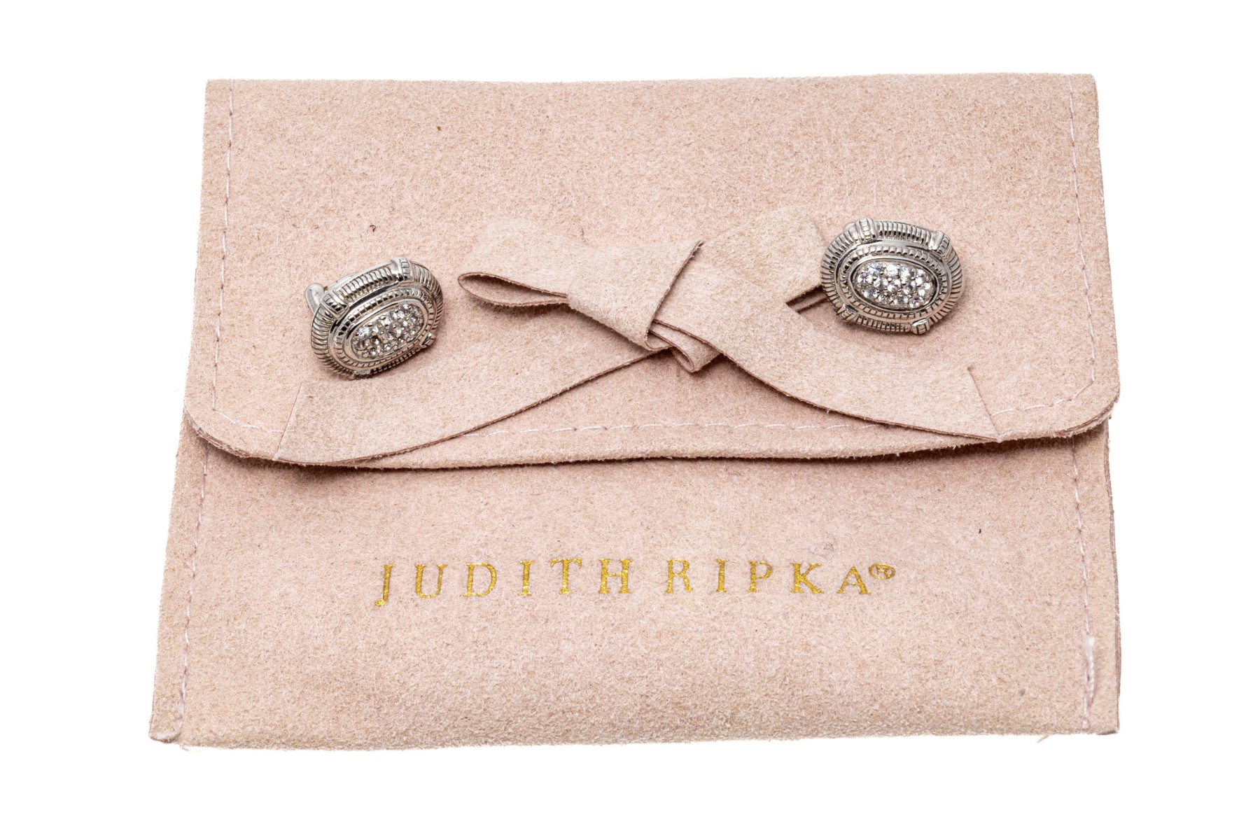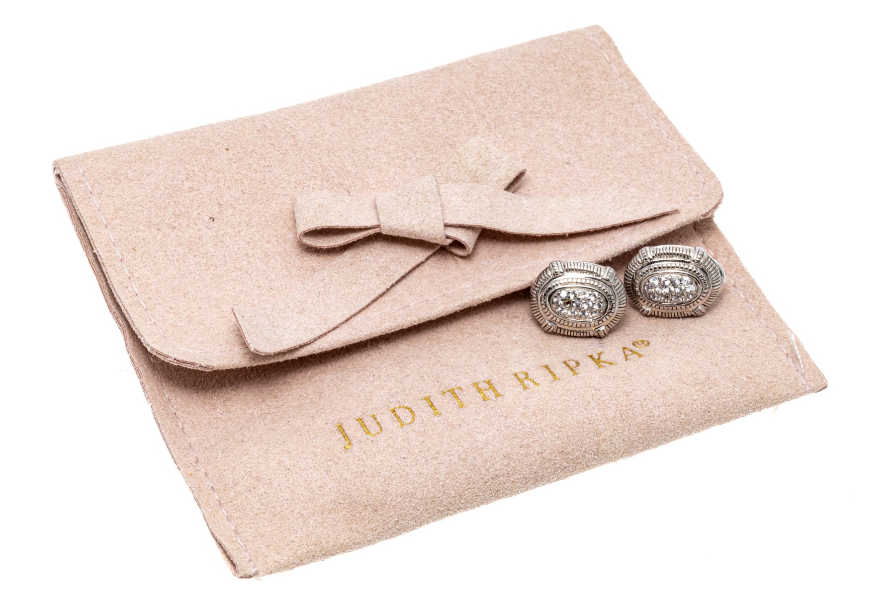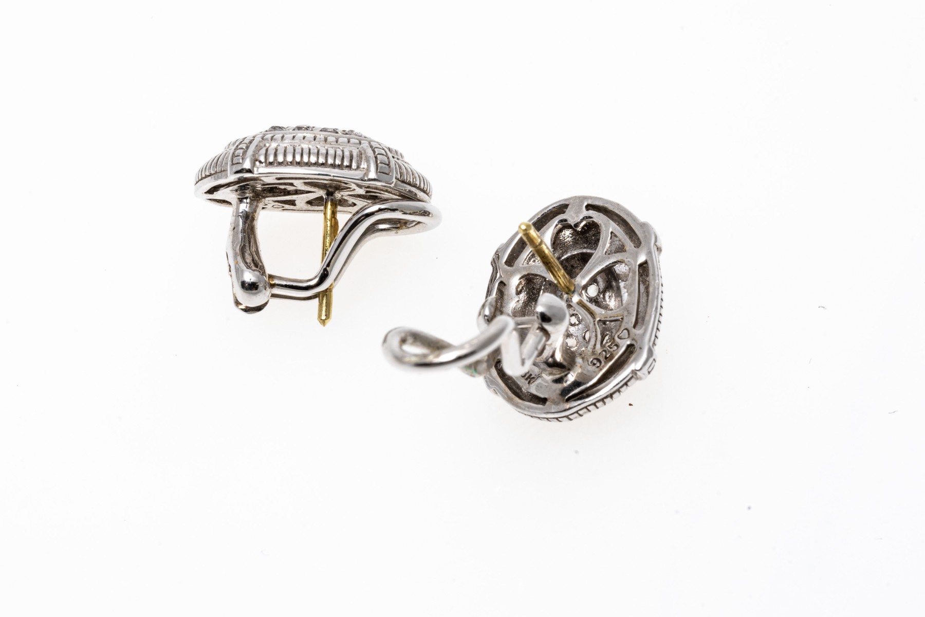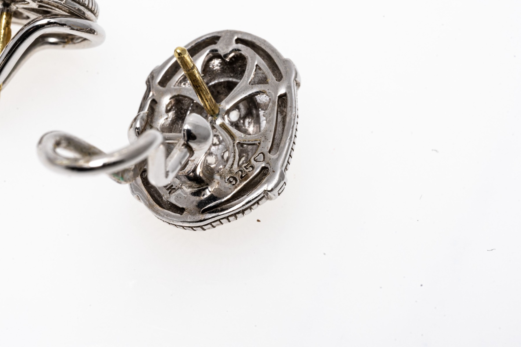 A pair of Judith Ripka earrings. These sterling silver earrings are set with round brilliant cut white synthetic sapphires accented with 18K yellow gold. Post and omega backings.