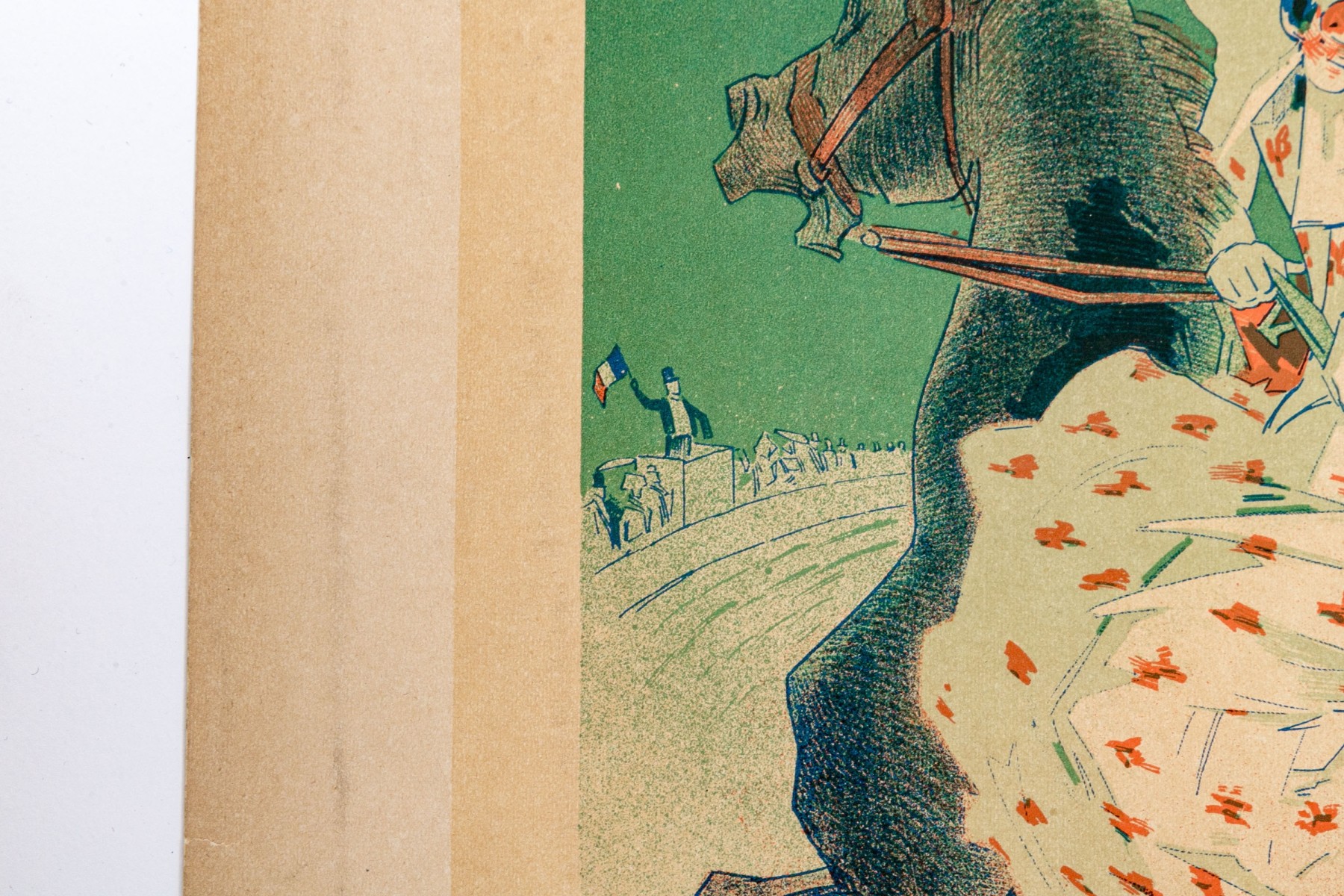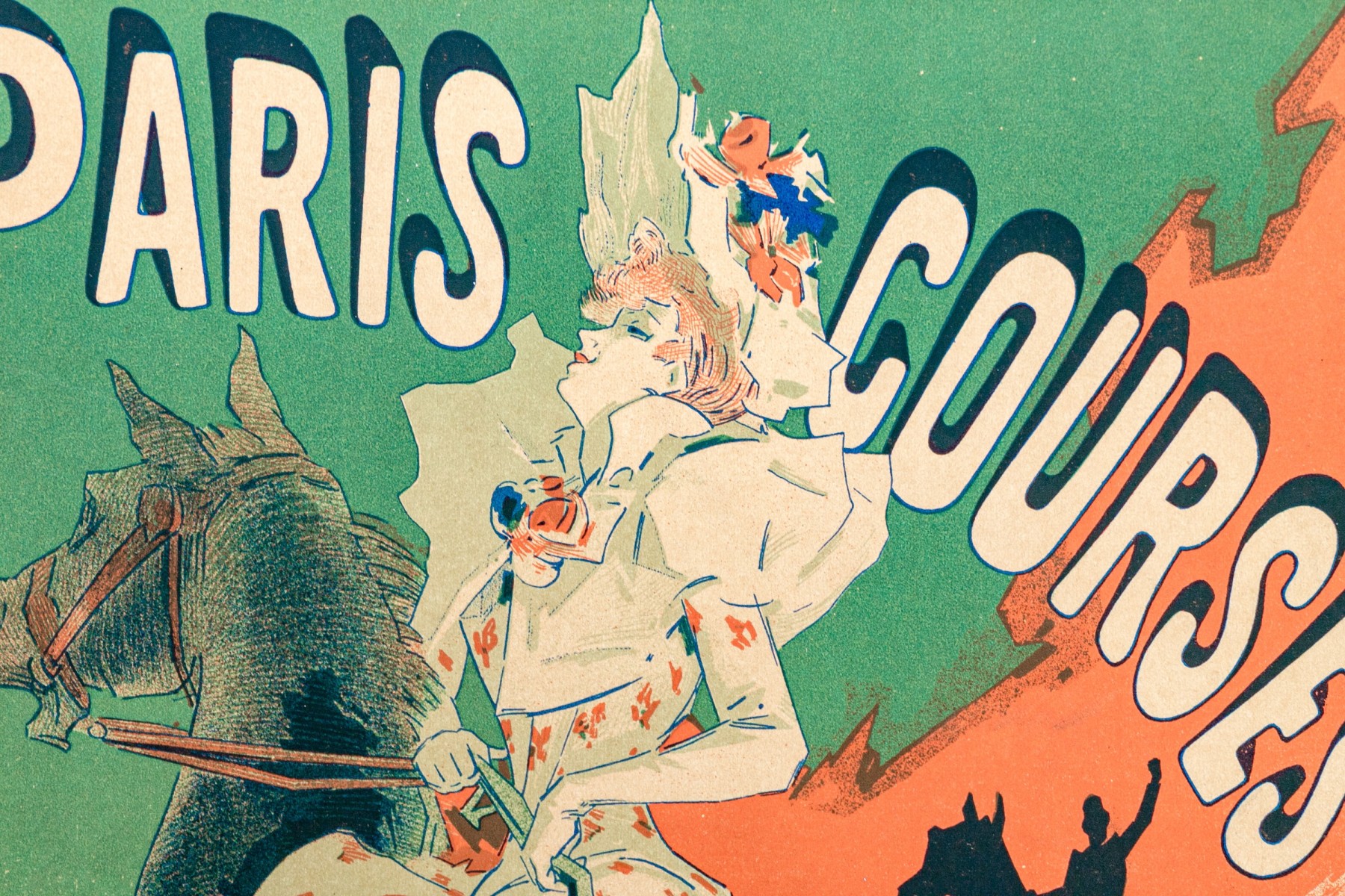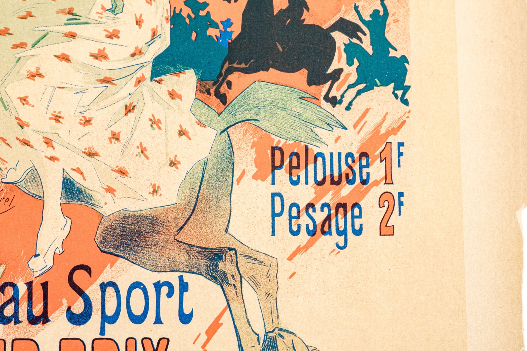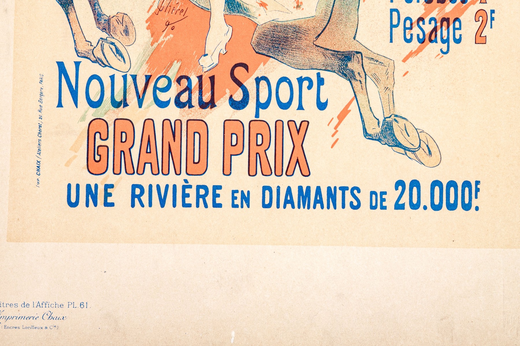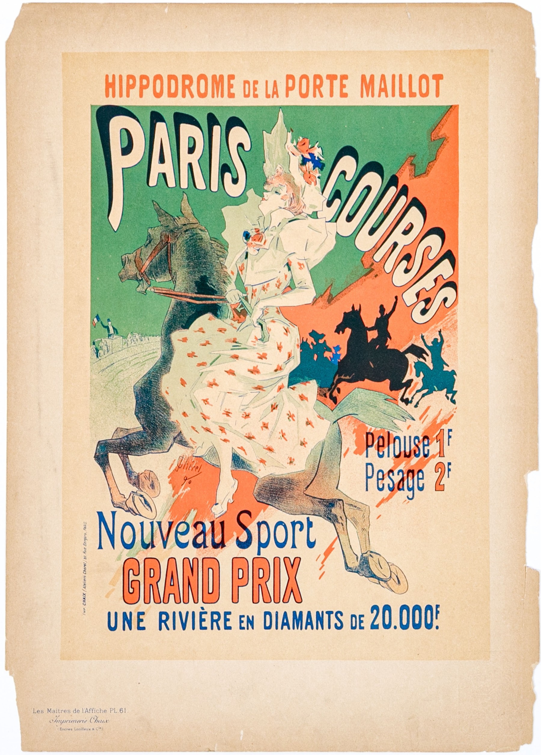 Imprimerie Chaix with blind stamp lower right. Paris Courses Nouveau Sport Grand Prix small format advertisement lithograph poster, plate 61, from the series reproduced from original works by 97 artists in this small format published for subscribers. An elegant lady rides a horse as if on a race course. Unframed.