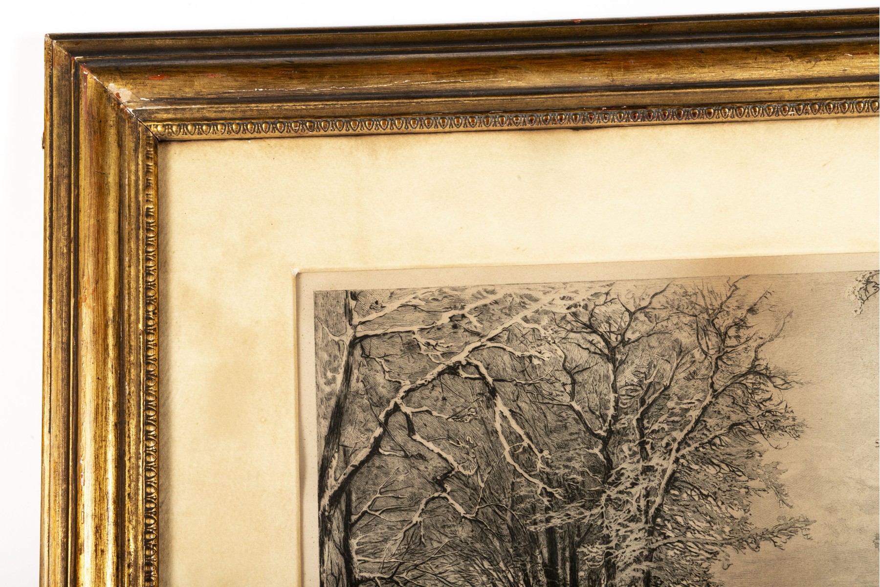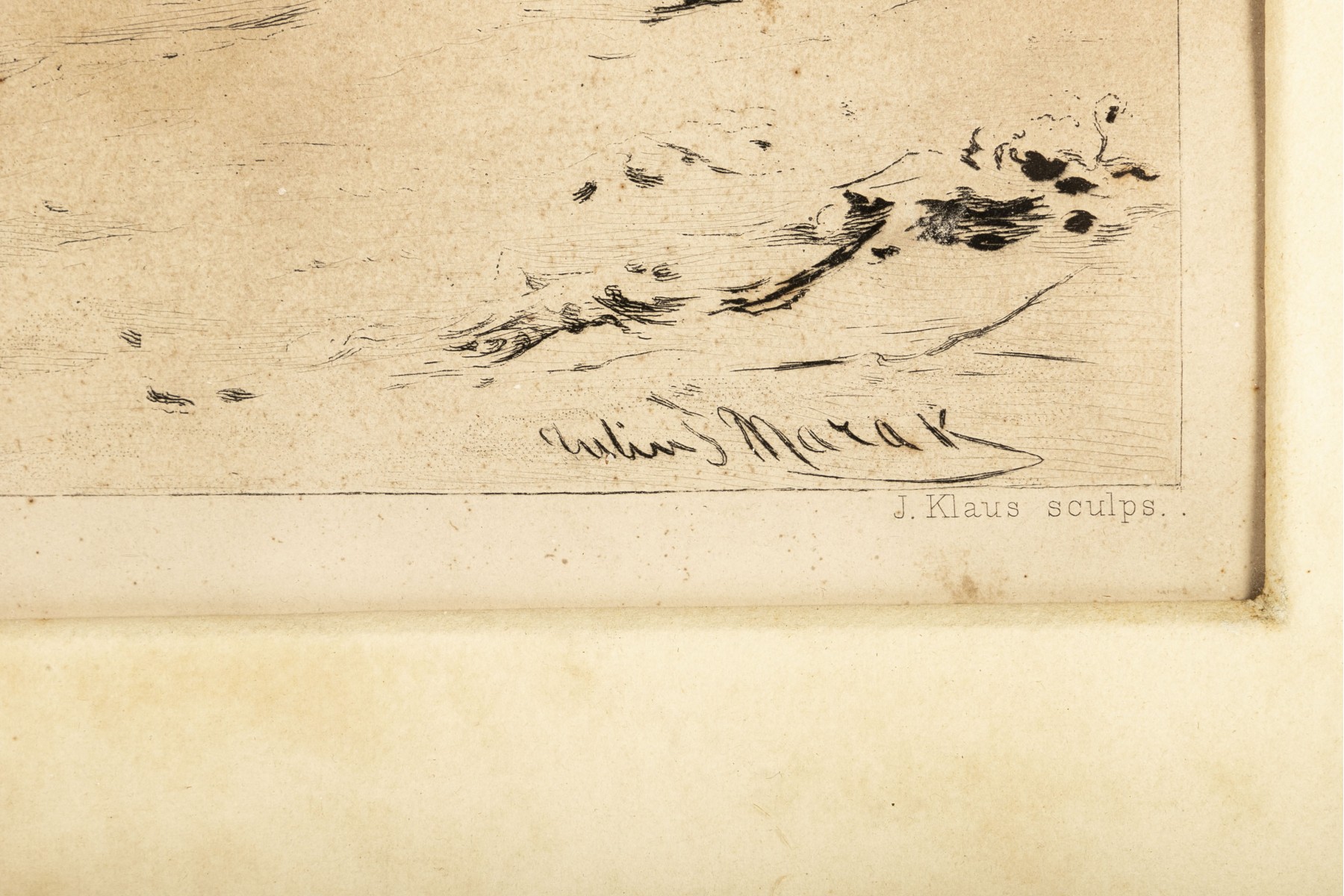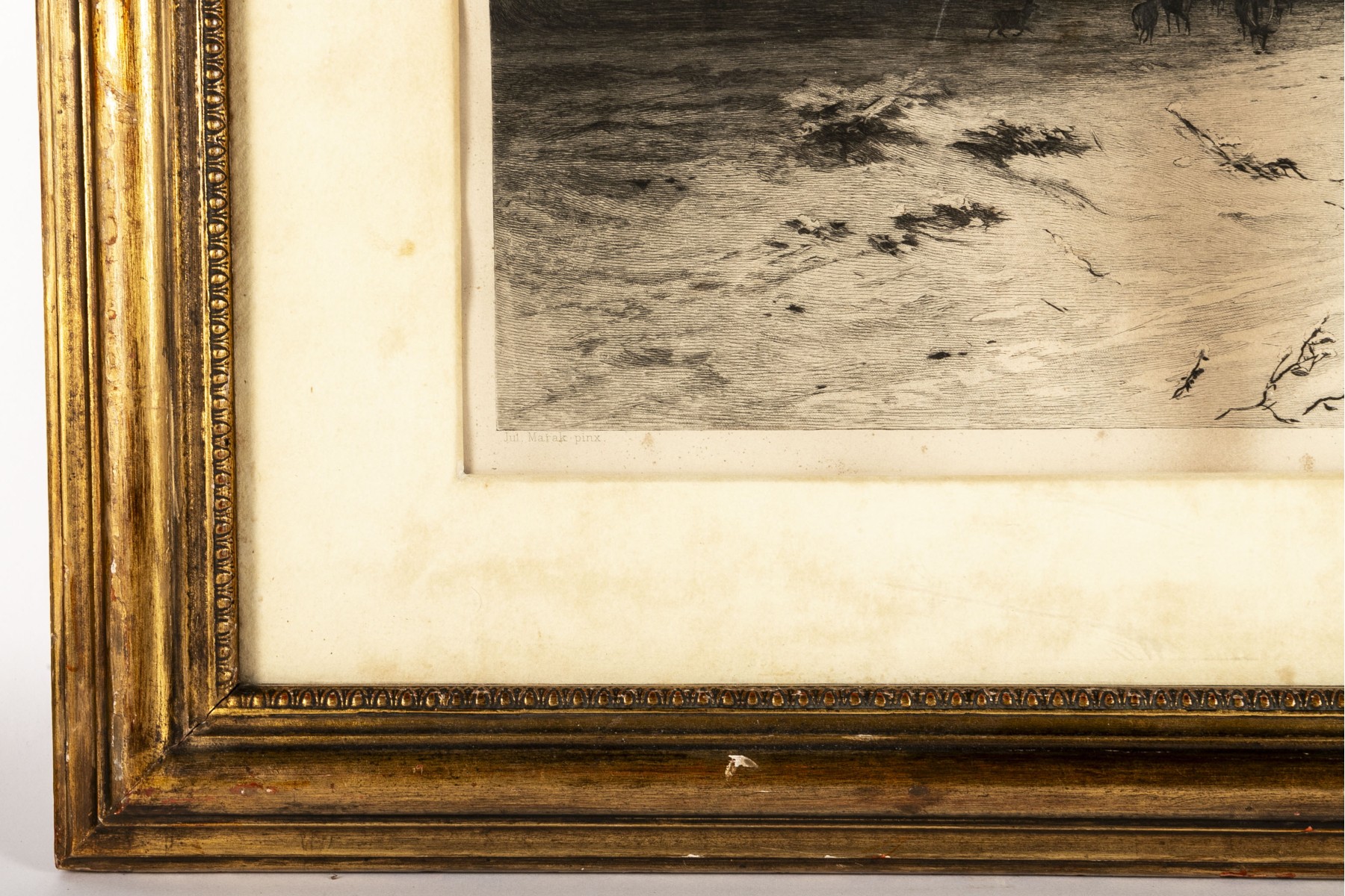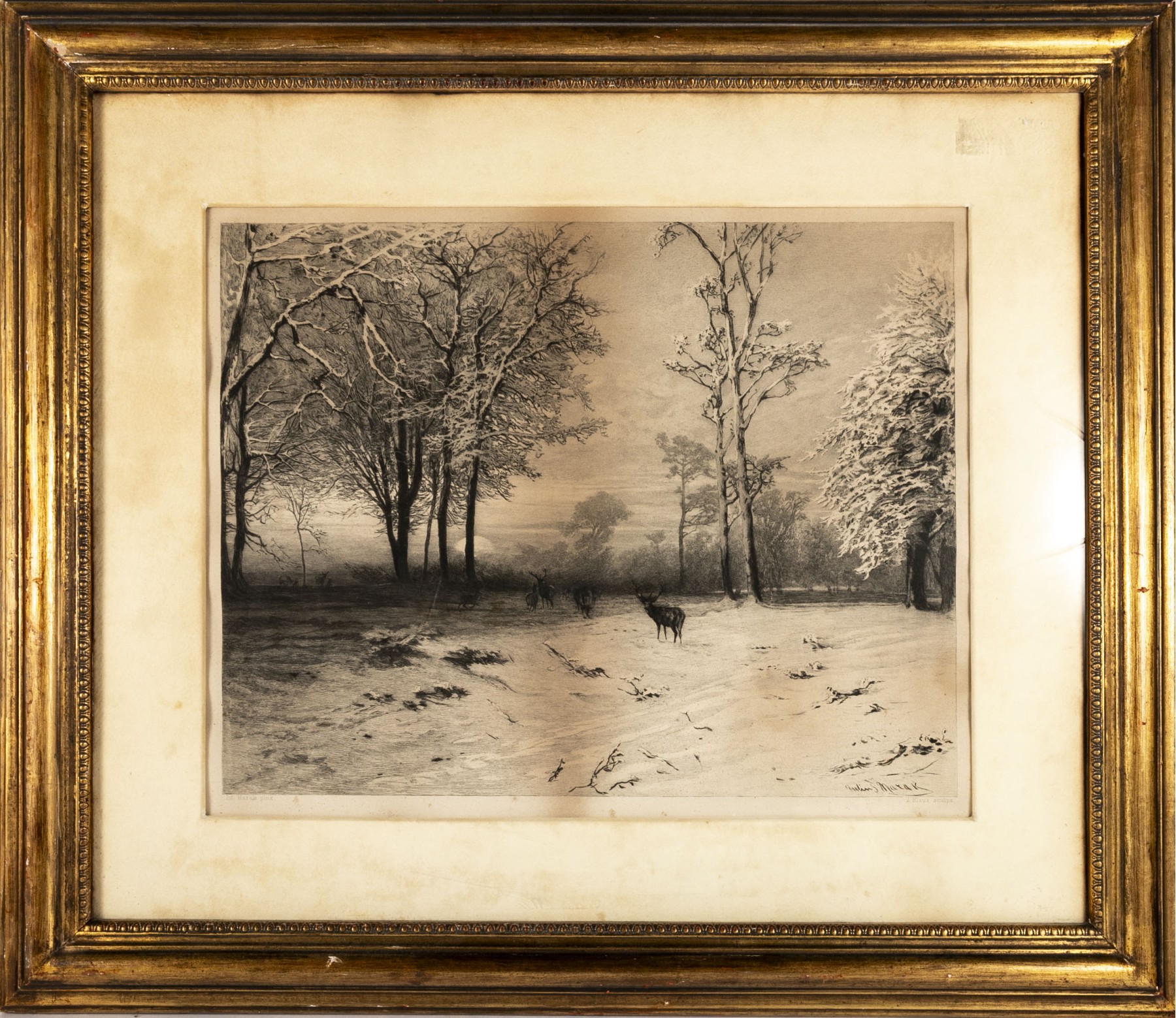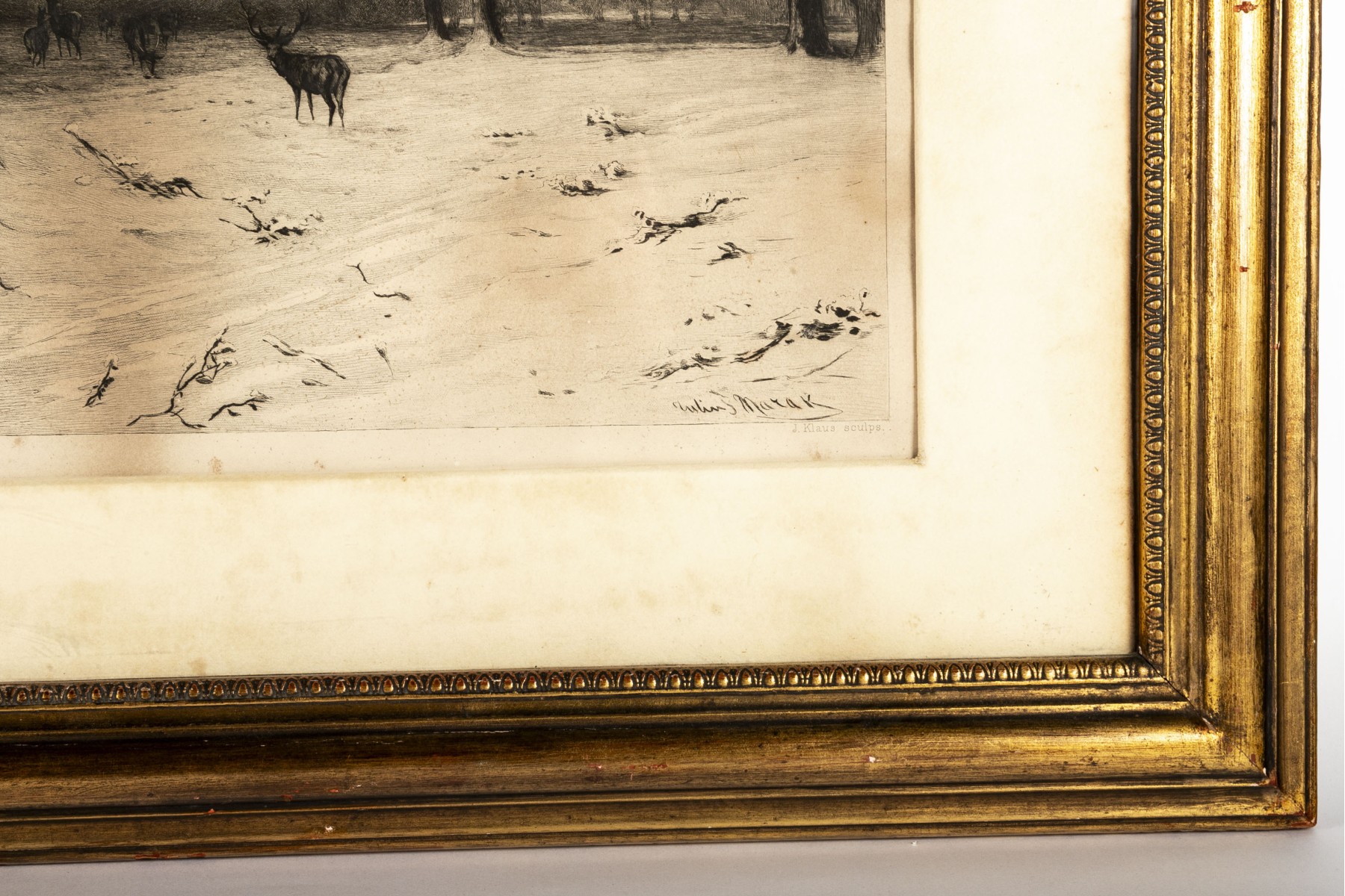 Julius MarĂ¡k (Czech, 1832-1899) engraving produced by Johannes Klaus (German, 1847-1894) depicting a herd of deer or elk crossing a snowy field along a forest. Plate signature lower right. Text printed below the scene reads "Jul Marak pinx. and J. Klaus sculps." lower left and right. Displayed behind glass with a white mat in a gilt frame.