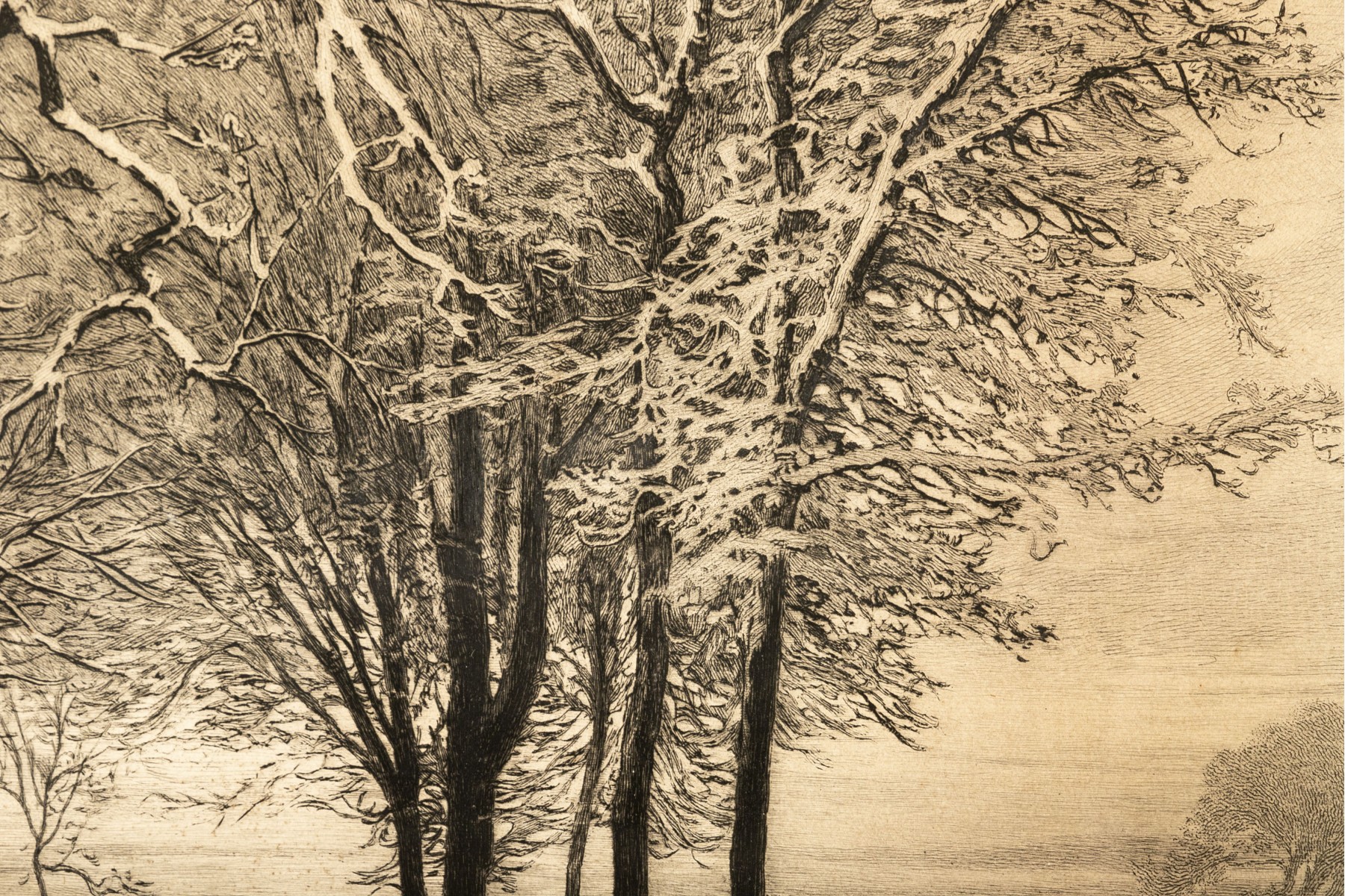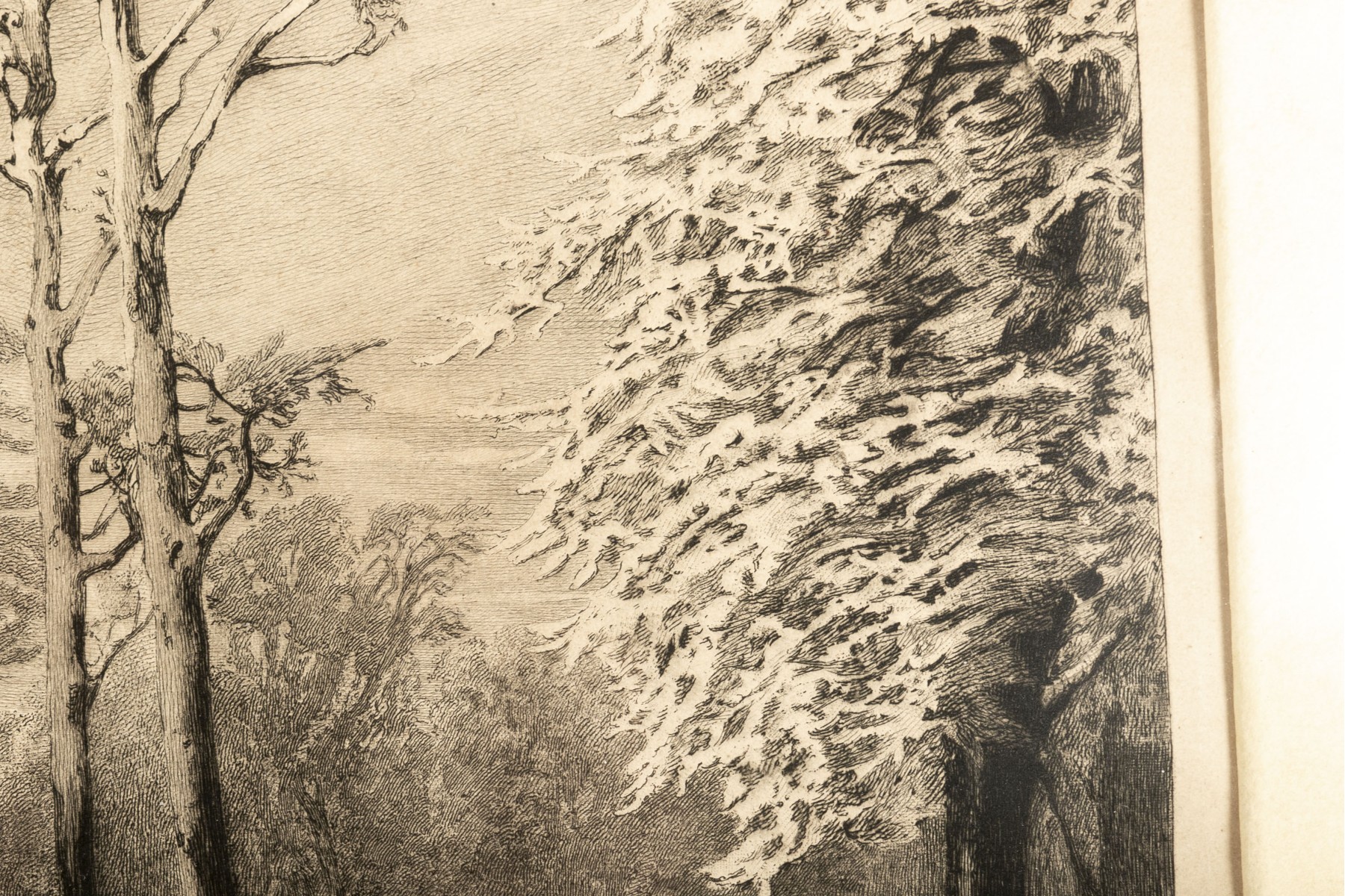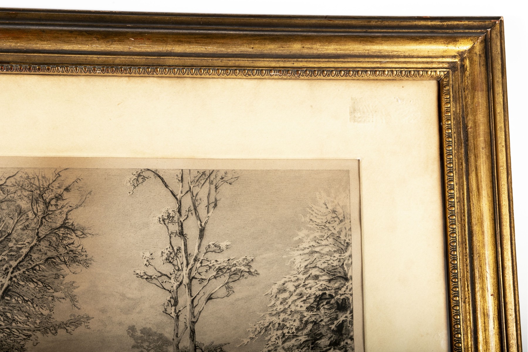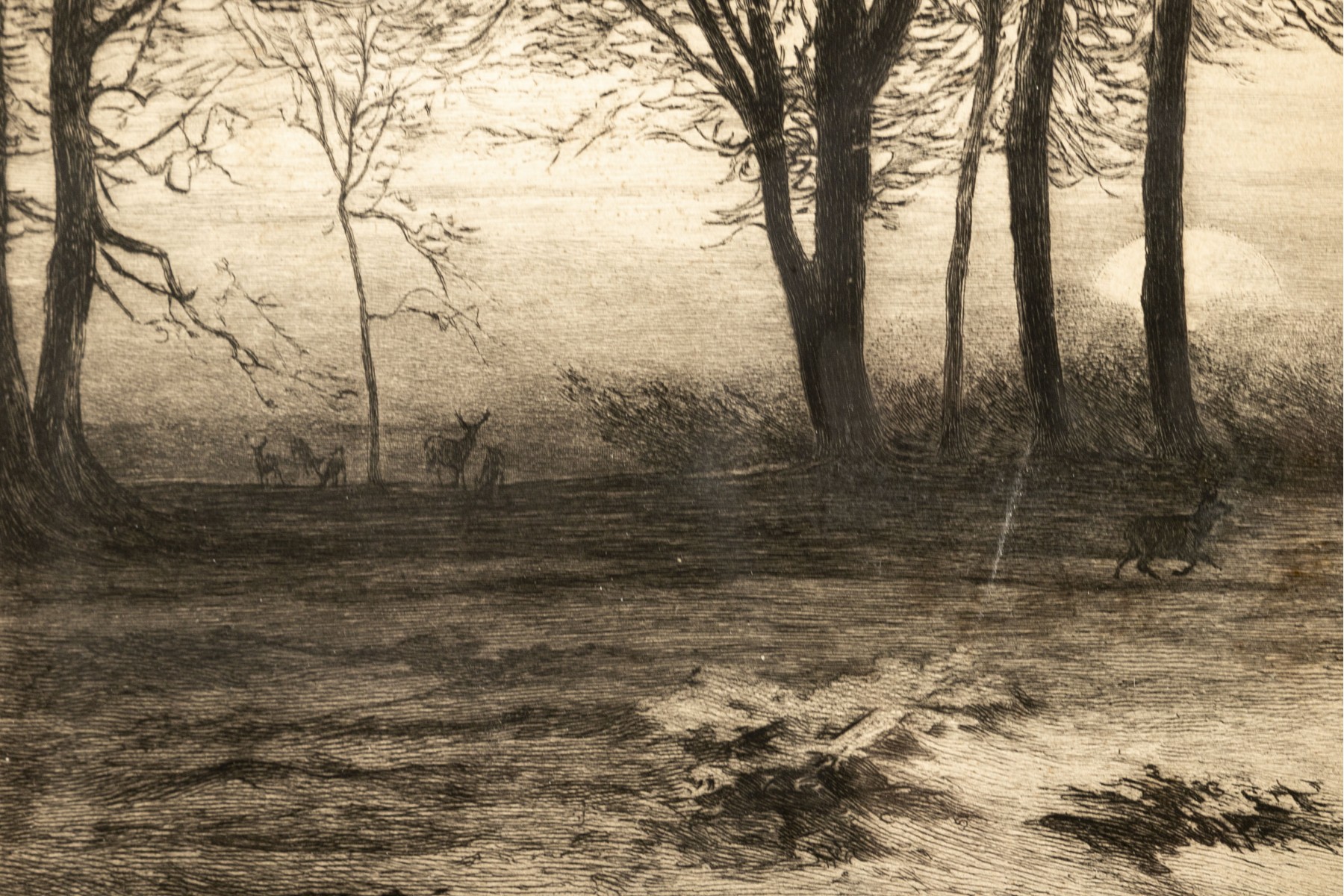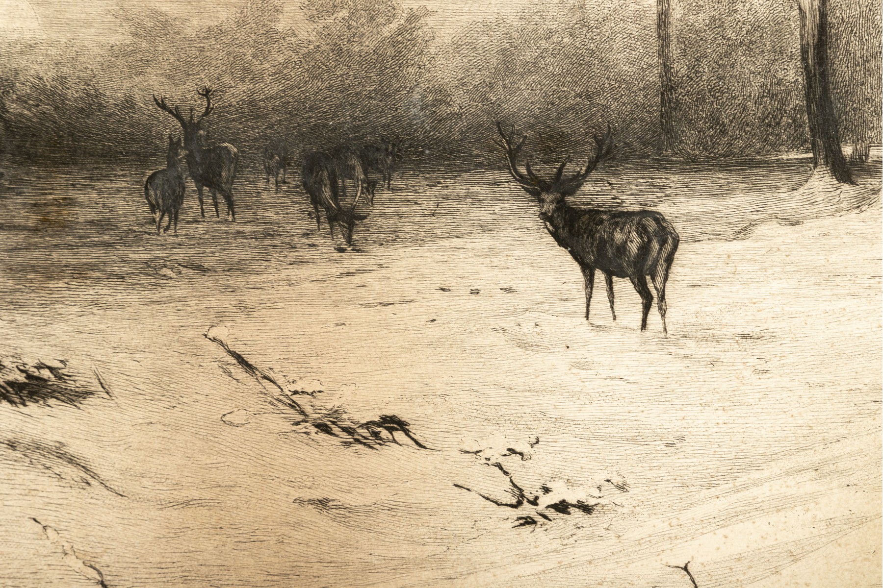 Julius MarĂ¡k (Czech, 1832-1899) engraving produced by Johannes Klaus (German, 1847-1894) depicting a herd of deer or elk crossing a snowy field along a forest. Plate signature lower right. Text printed below the scene reads "Jul Marak pinx. and J. Klaus sculps." lower left and right. Displayed behind glass with a white mat in a gilt frame.