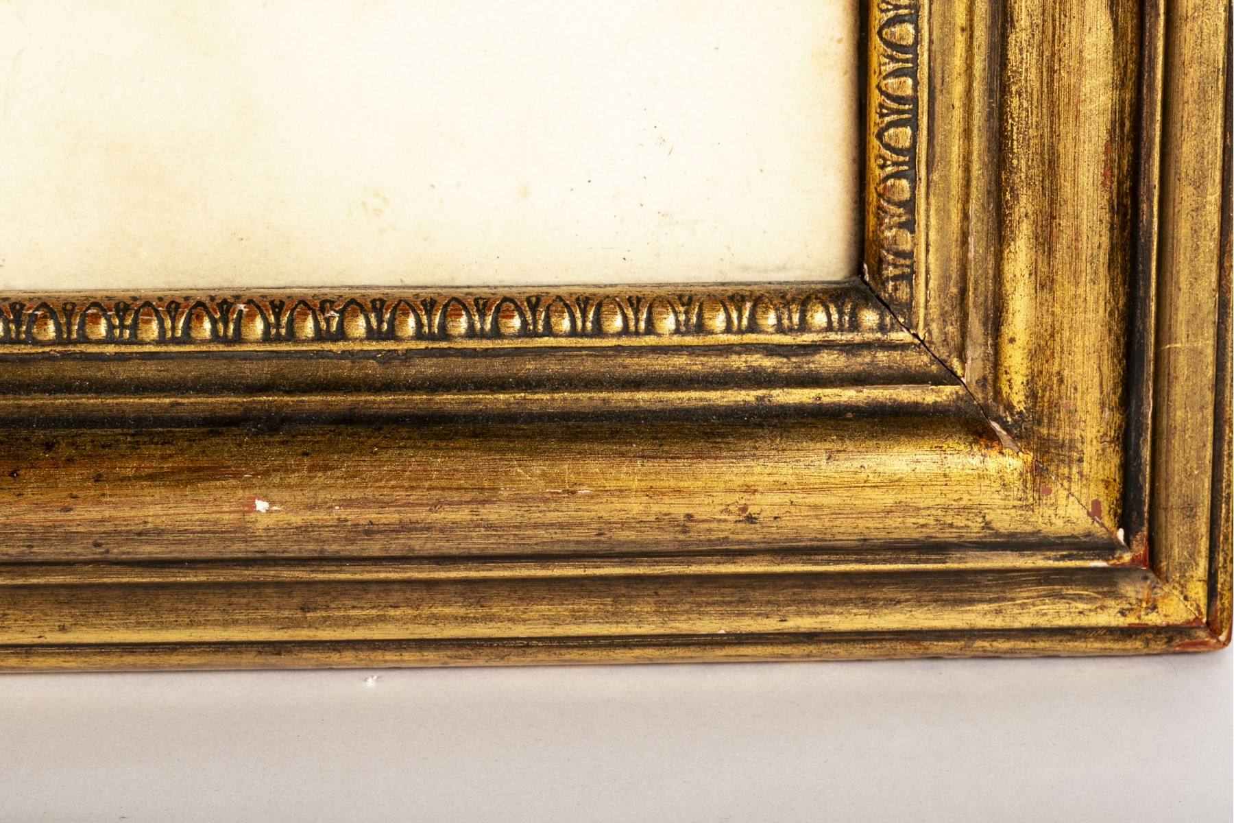 Displays well with light paper waving, minor acid burning, minor paper toning. Some scattered nicks, scuffs, and finish wear to the frame.