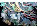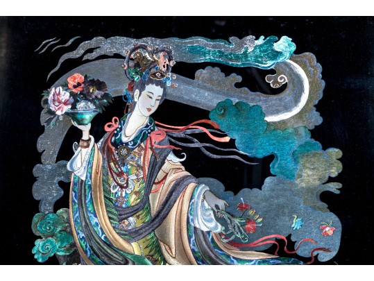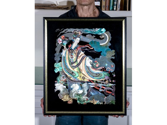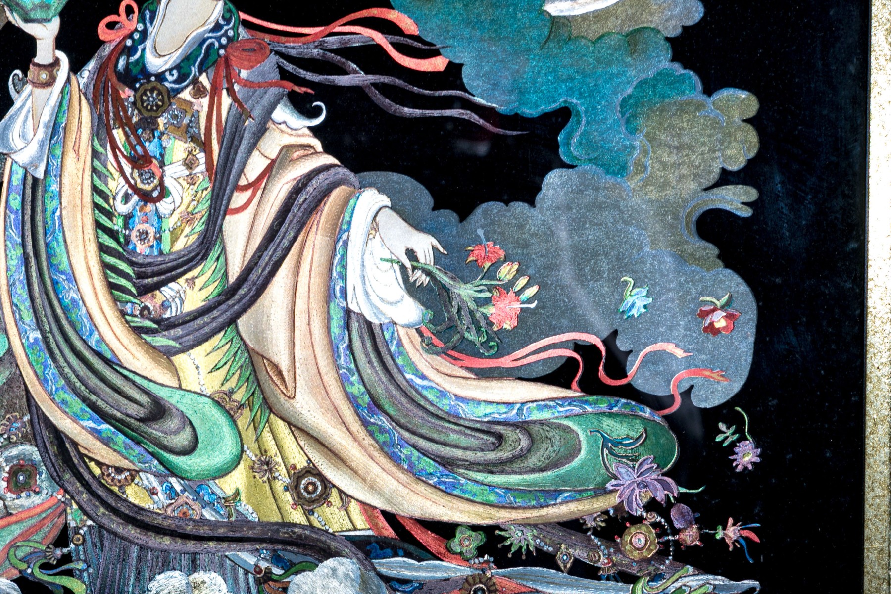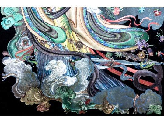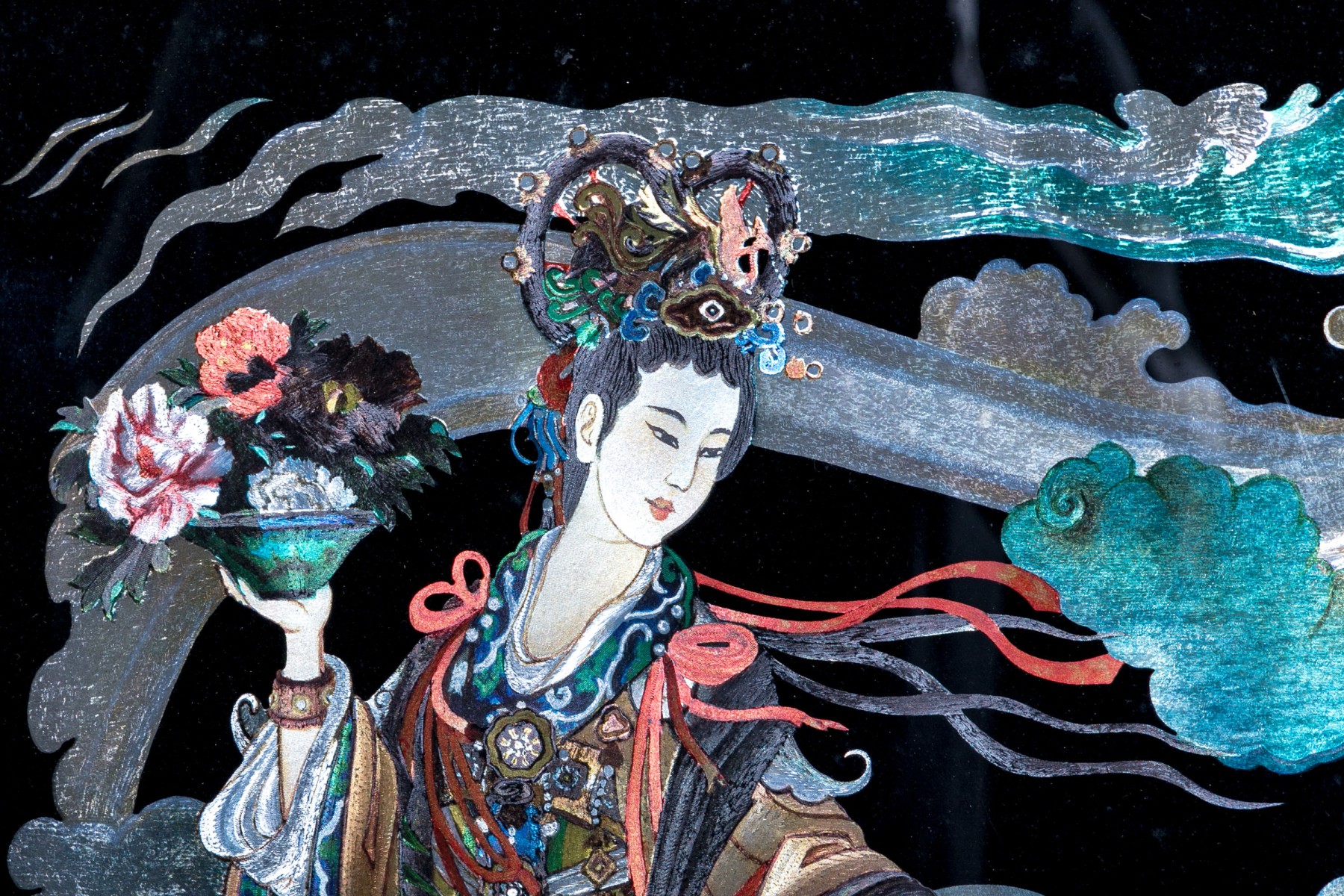 Kafka screened metal etching depicting a Chinese beauty holding flowers against a background of swirling clouds. Beautifully detailed with vibrant and ornately patterned foil. Presented in a black frame with a gilt inner bevel.
